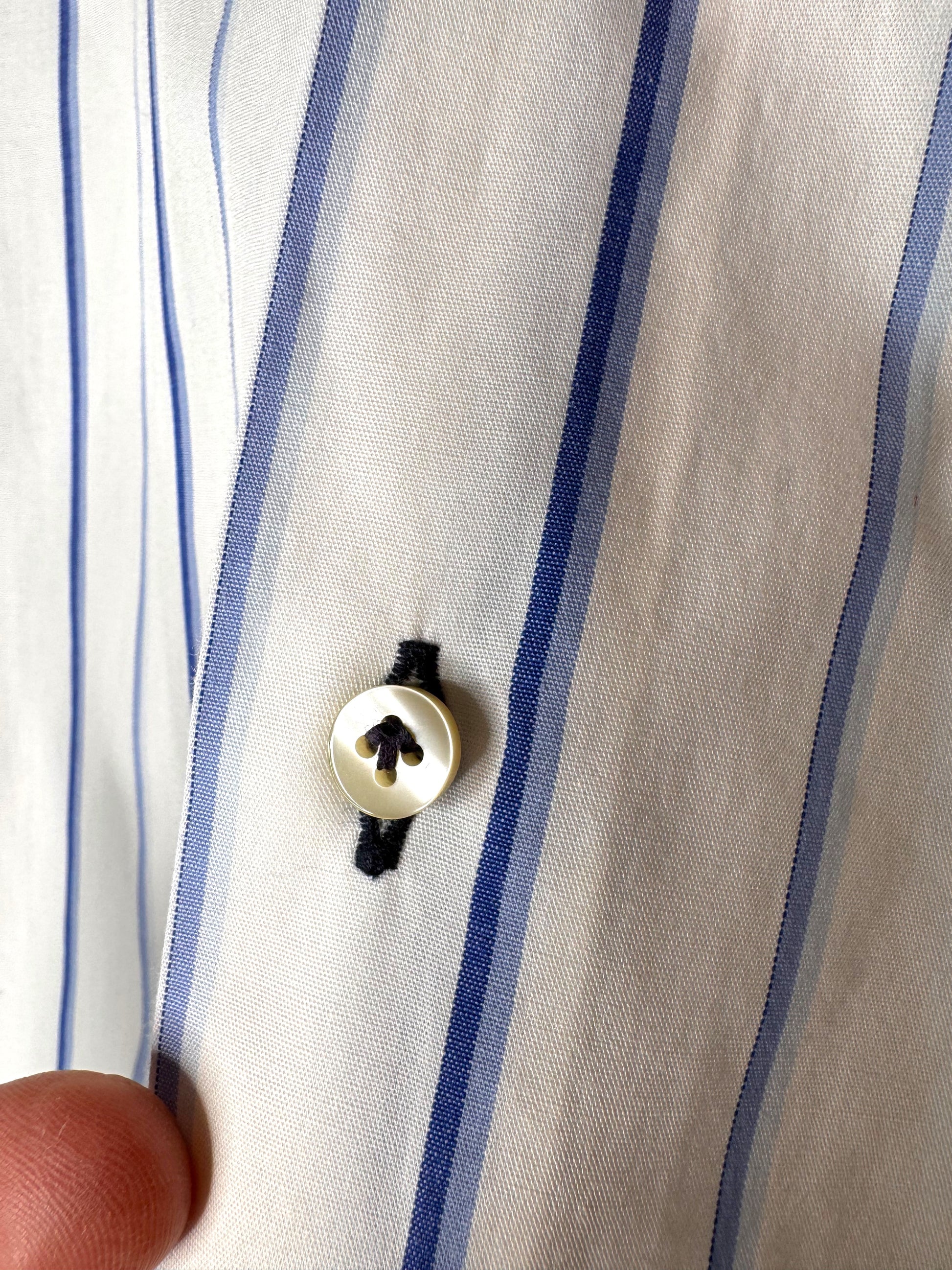 Colletto strutturato, abbottonatura frontale e polsini con bottoni. Stile pulito e raffinato, tipico dell’estetica Ferré, ideale per chi cerca un capo di archivio con fit importante.