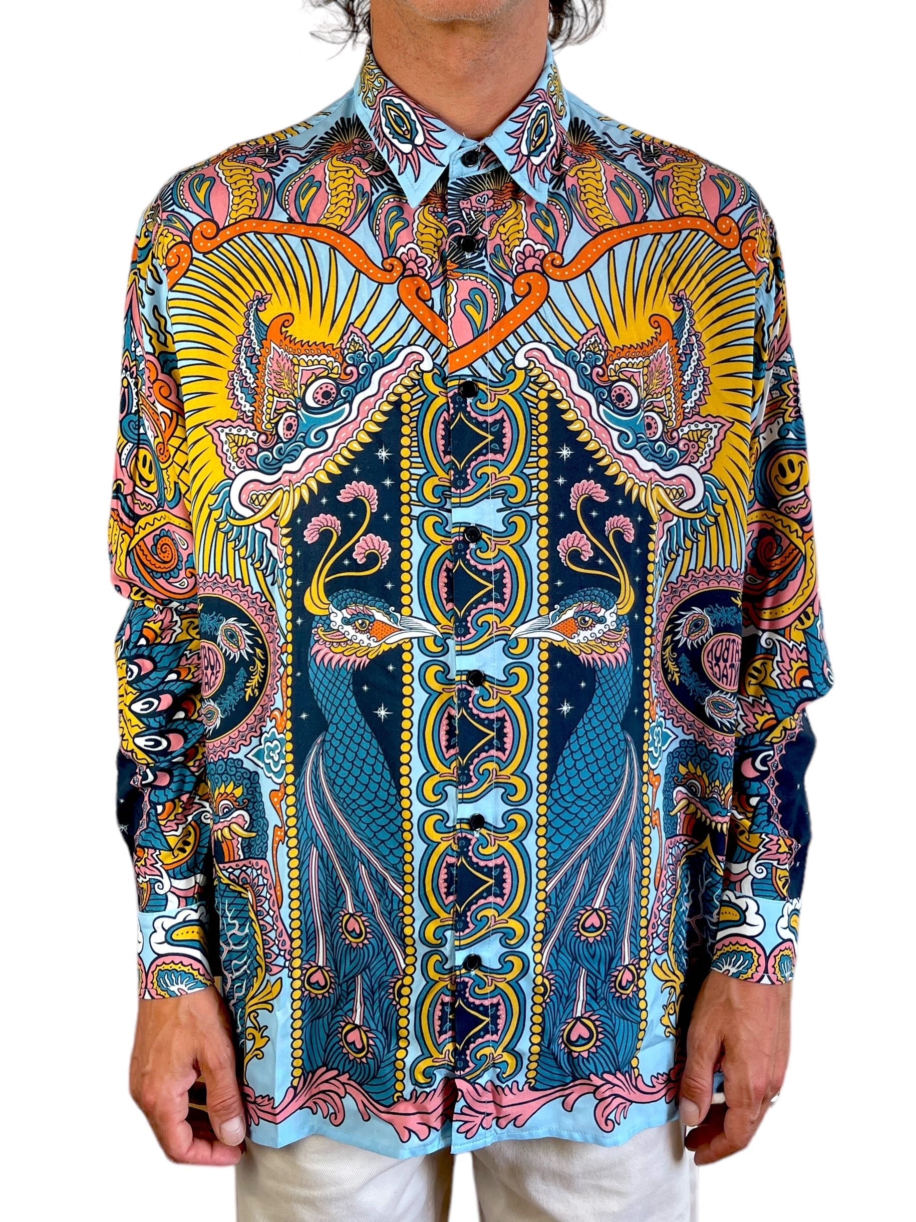 DESIGN ESLUSIVO - Il design rappresenta la bellezza che risiede in ciascun individuo e che dovremmo essere fieri di mostrare, persino in momenti difficili. Le difficoltà nella vita sono rappresentate da spiriti maligni disegnati nel petto, ma la bellezza e l'orgoglio, simboleggiati dal pavone, ci aiutano a superarle e ad apprezzare la bellezza dell'universo. Anche se ci sono persone tossiche rappresentate dal cobra, che possono essere difficili da gestire, esse ci aiutano a diventare più forti e grati per ciò che abbiamo. La camicia Merak ci invita a ricordare che la bellezza è presente in ogni essere umano e che dobbiamo abbracciare la vita con orgoglio, anche quando ci sono sfide da affrontare.