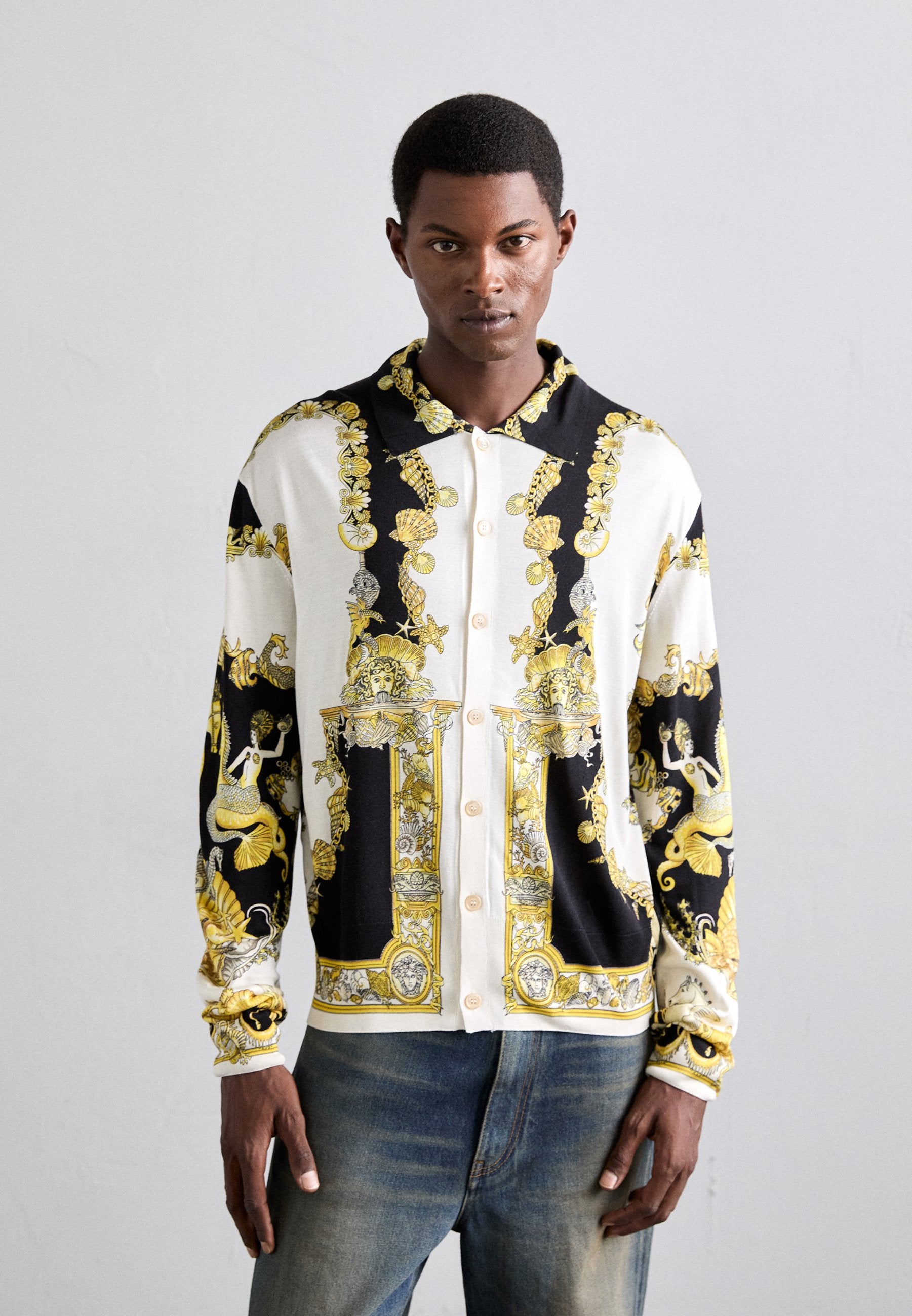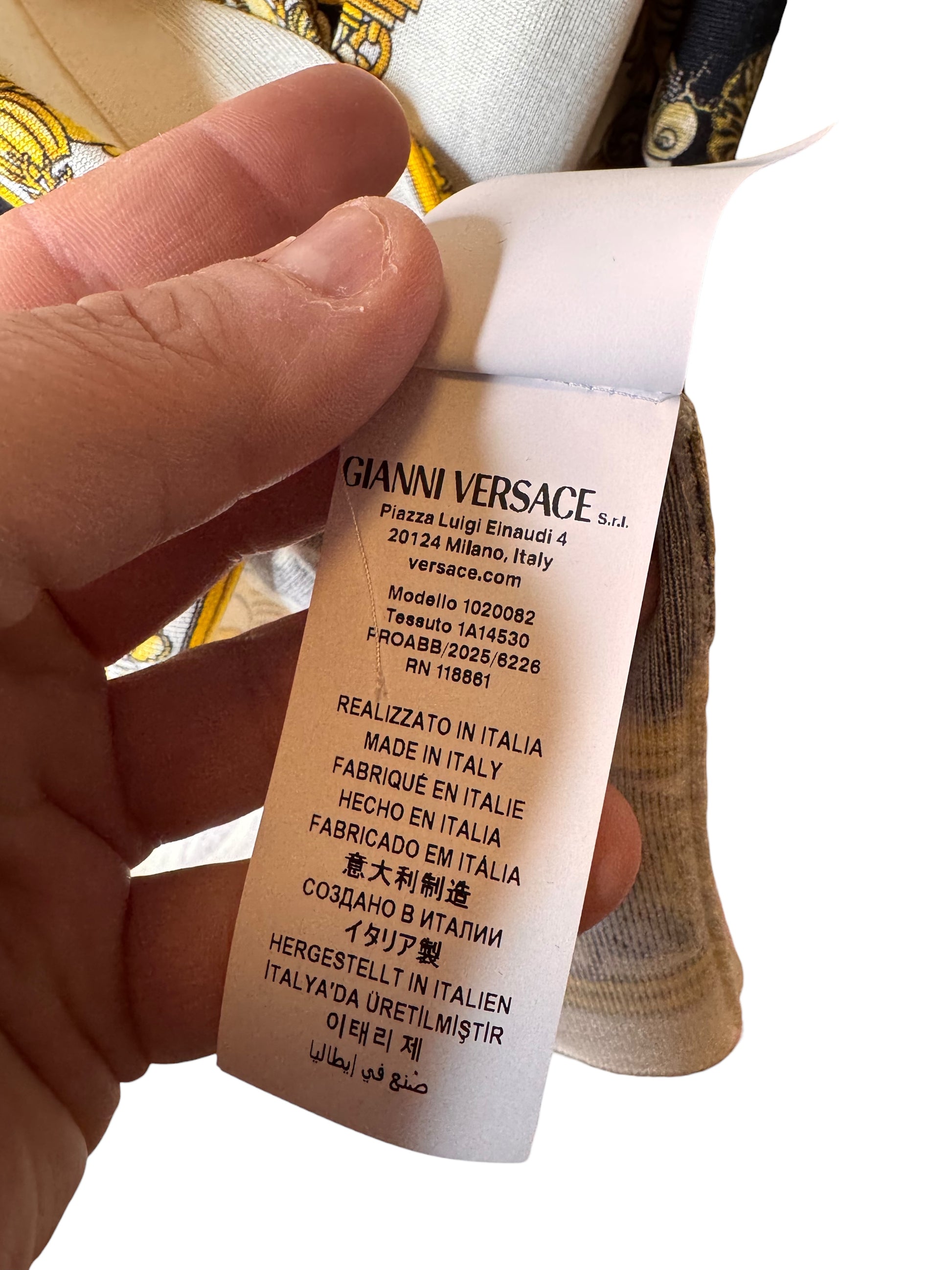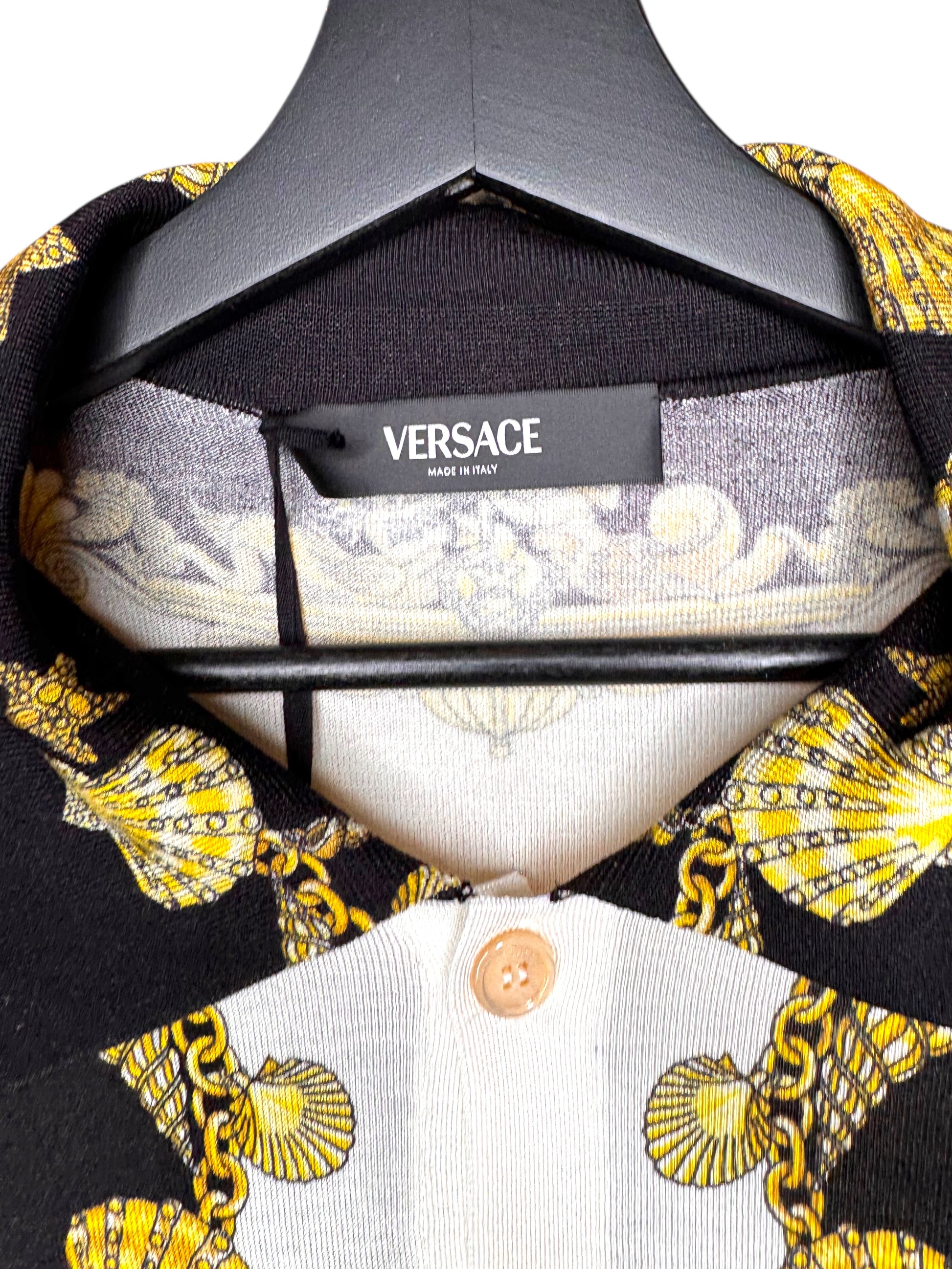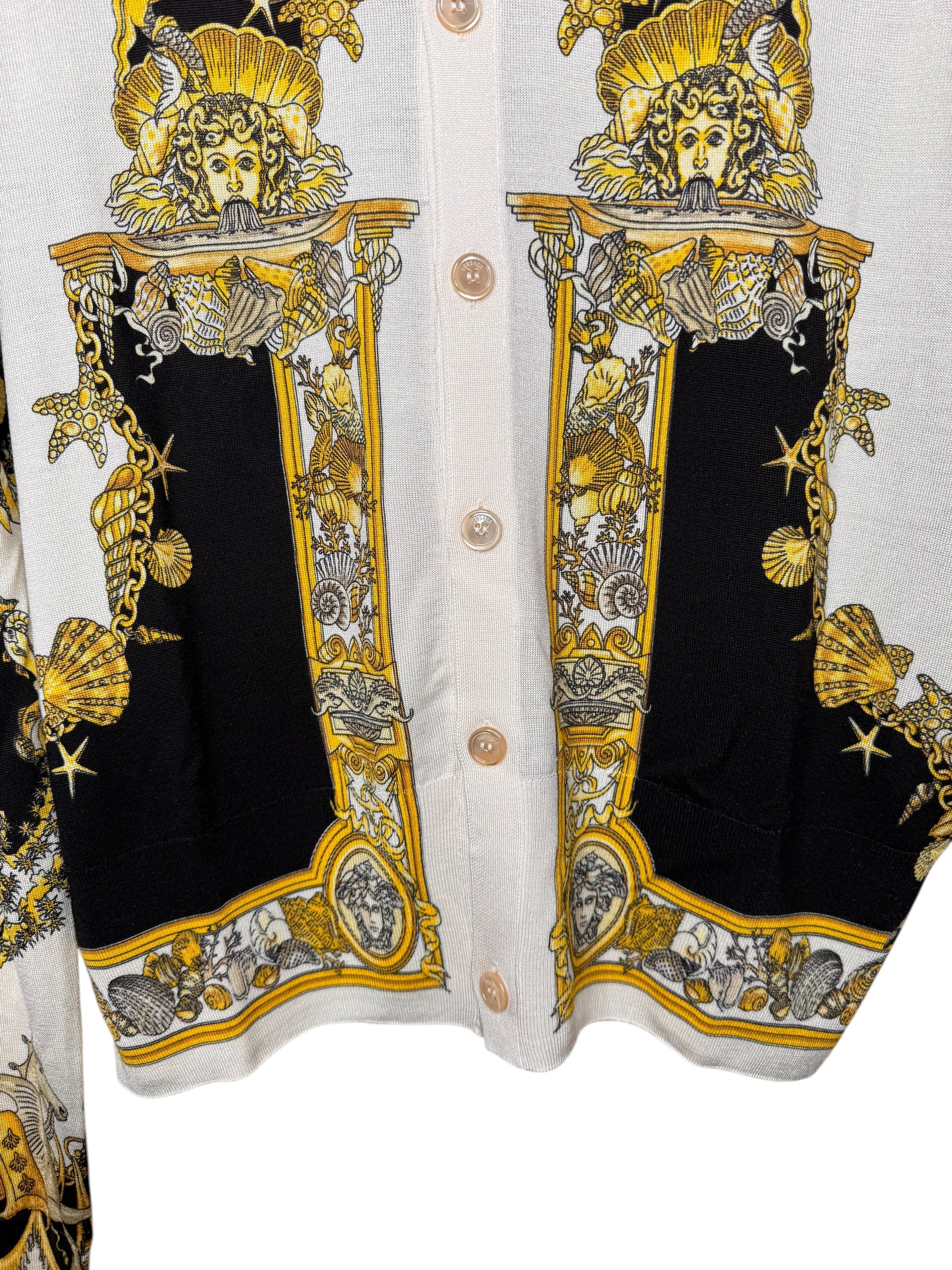 Camicia Versace contemporanea realizzata in seta a maglia (silk knit), caratterizzata da una raffinata stampa barocca a tema marino nei toni del nero, bianco e oro. Un capo di alta gamma che unisce l’estetica iconica della Maison a una costruzione estremamente confortevole e fluida.