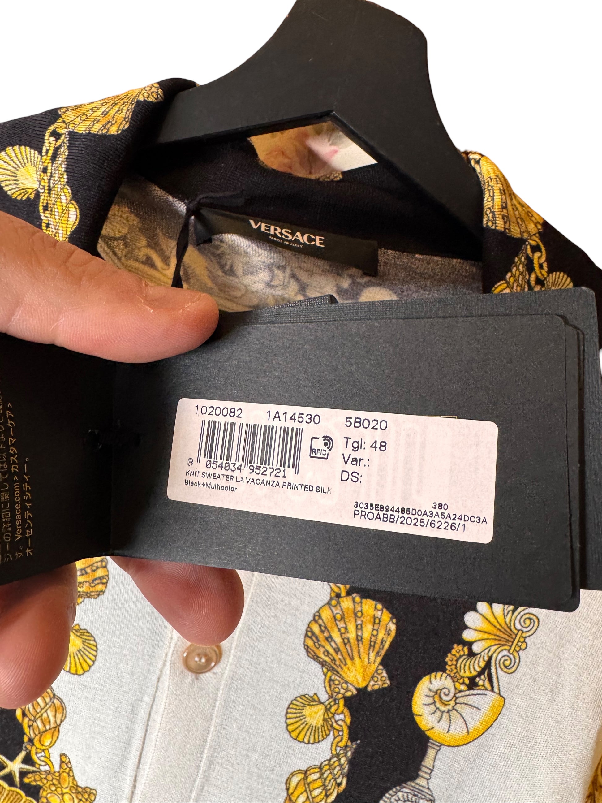Il tessuto in seta lavorata a maglia offre una vestibilità morbida ed elegante, ideale sia per un utilizzo quotidiano ricercato sia per occasioni più sofisticate. Bottoni logati Versace, etichette interne complete e QR code per verifica di autenticità. Prodotto Made in Italy.
