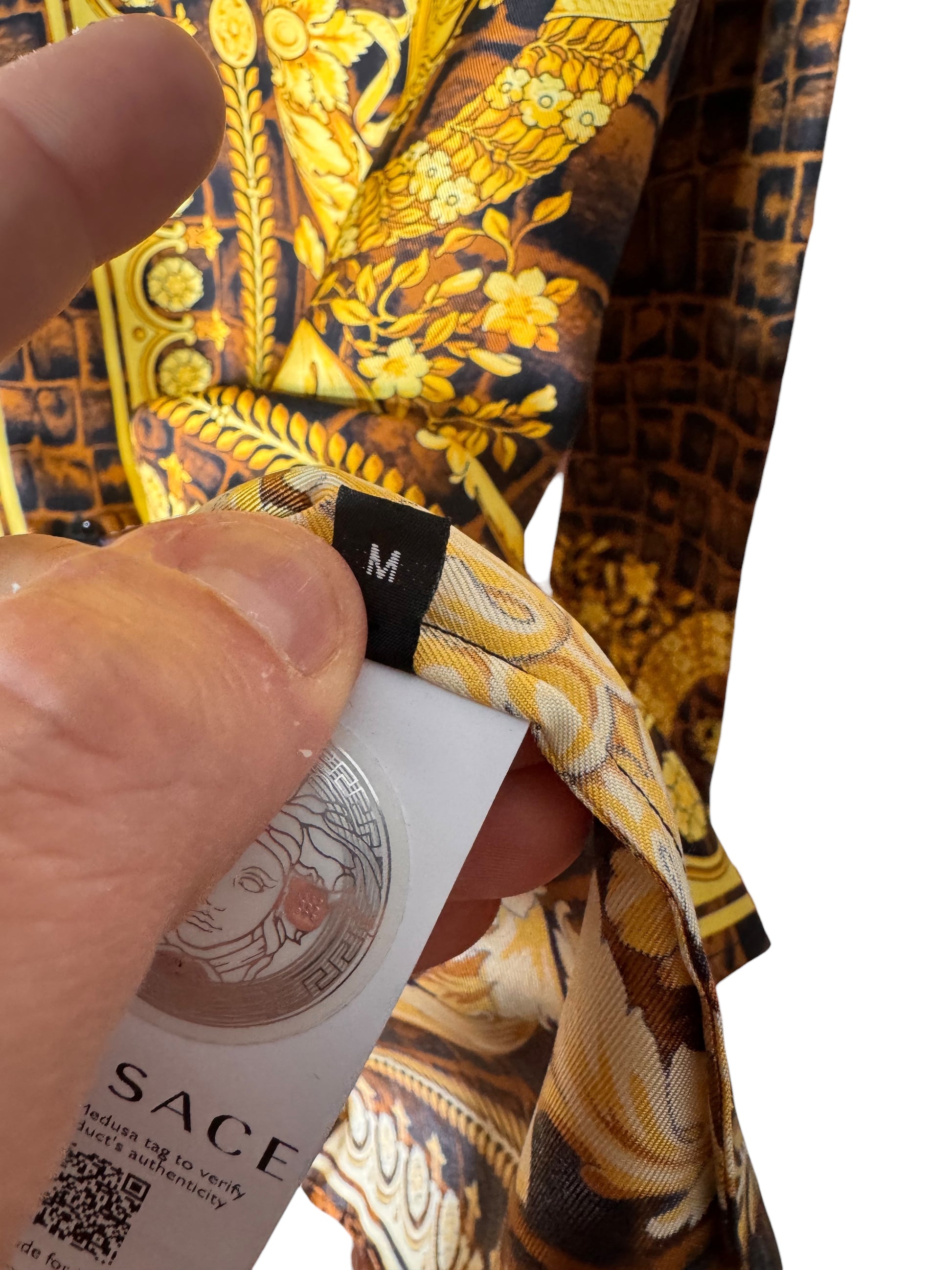 Il design presenta una stampa ricca e simmetrica, con dettagli ornamentali classici Versace, colletto classico e chiusura frontale con bottoni. Capo nuovo con cartellini originali e tag NFC Medusa per la verifica dell’autenticità.
