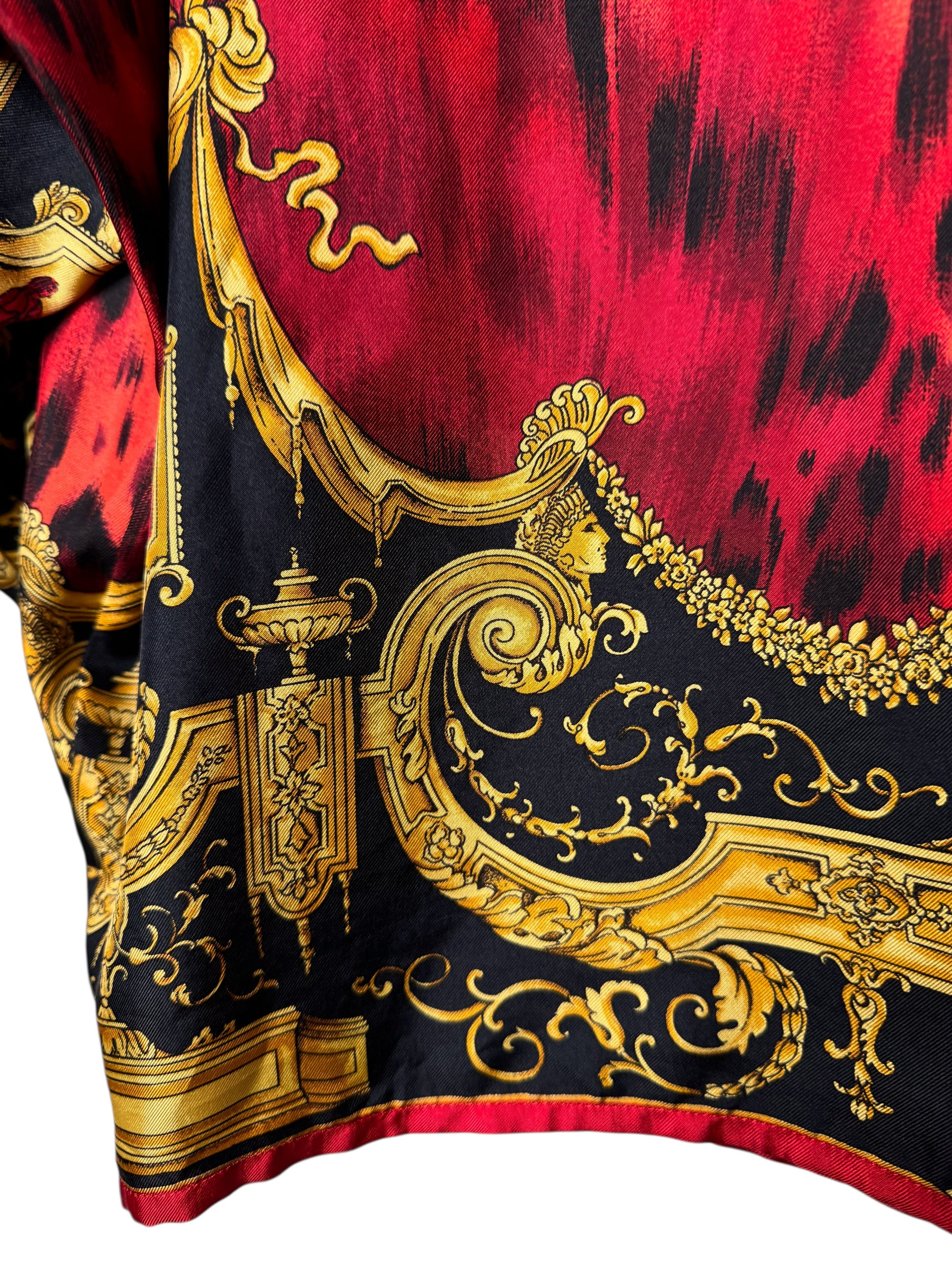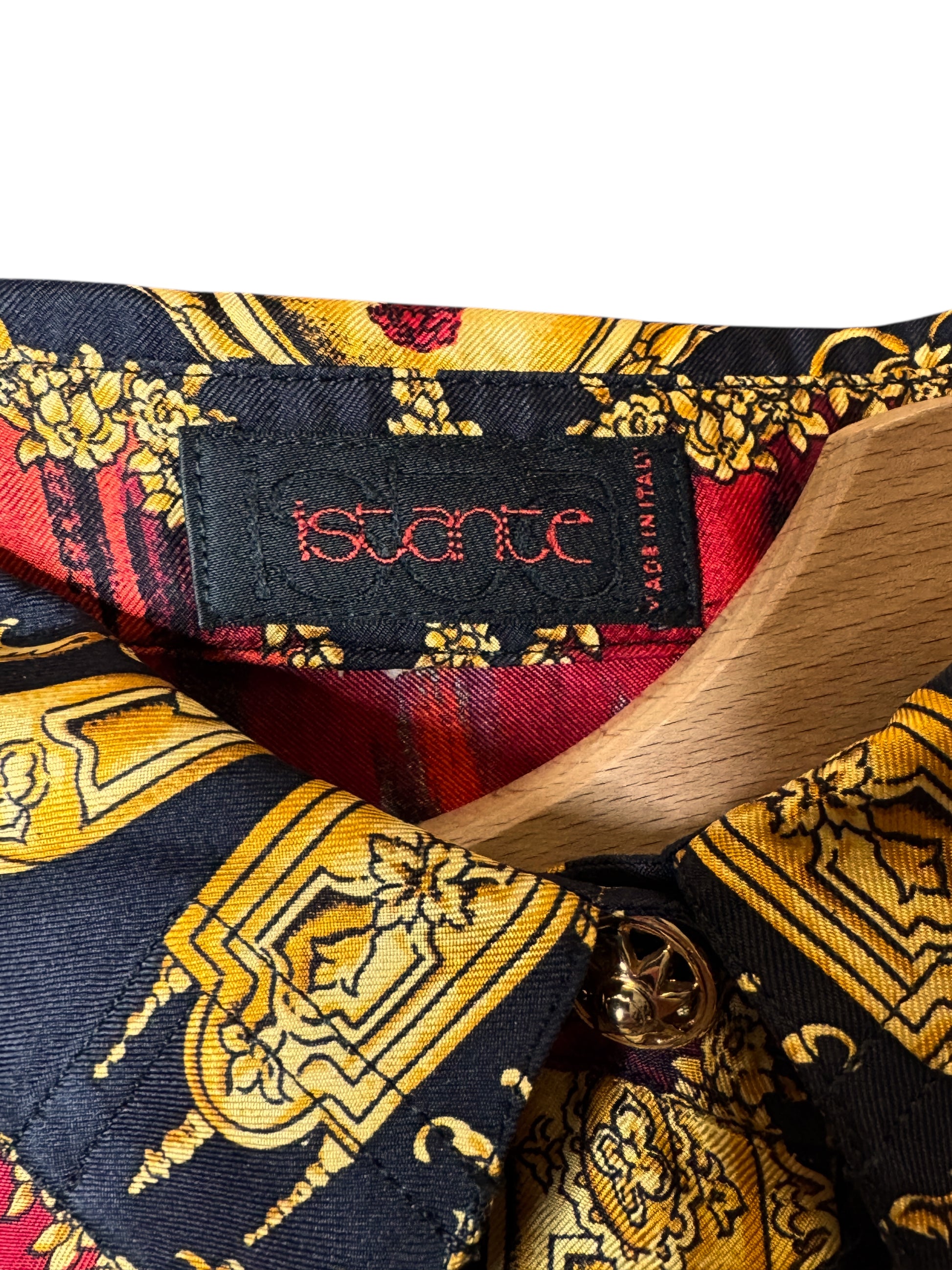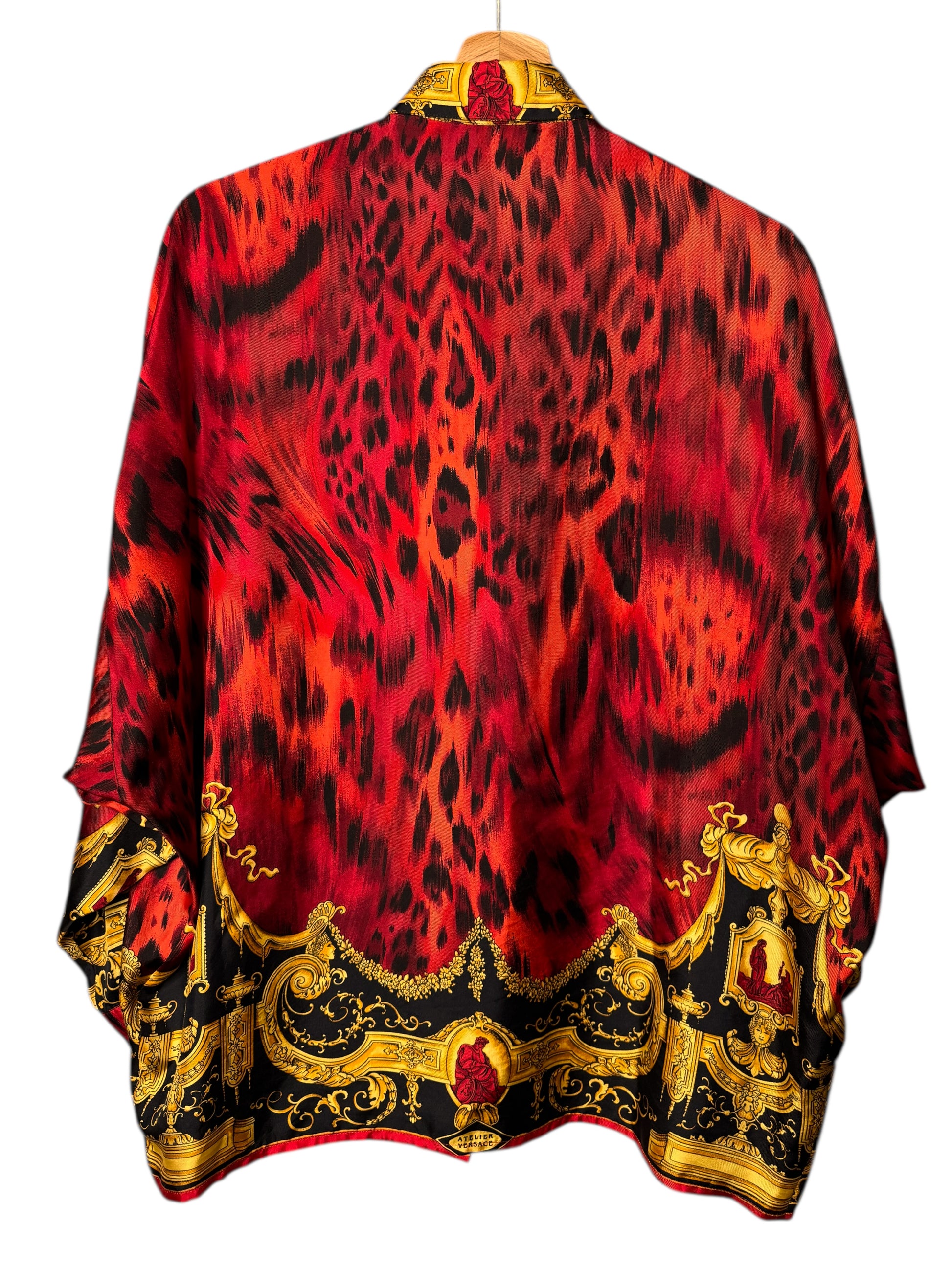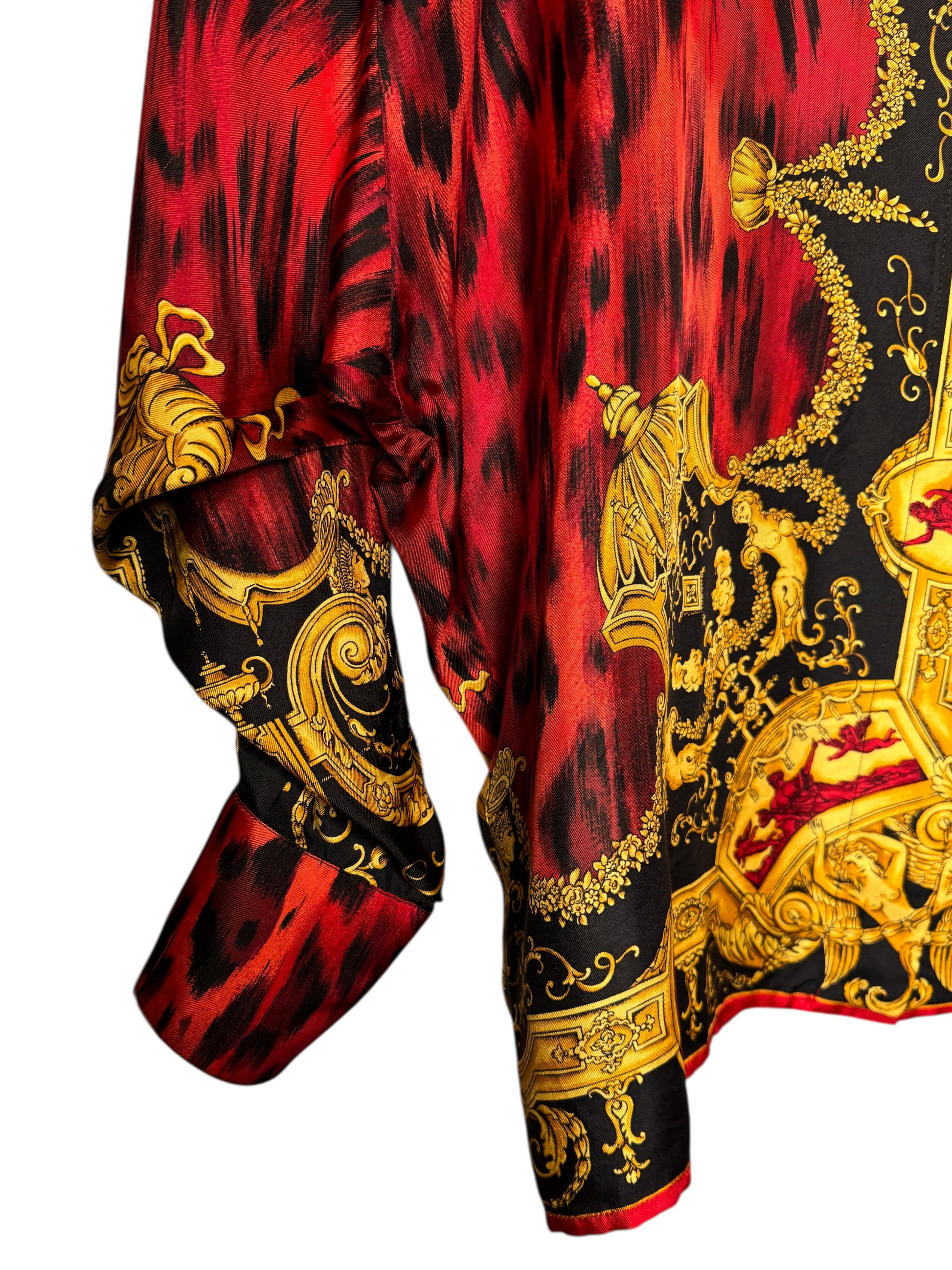 Camicia vintage Gianni Versace appartenente alla linea Istante, realizzata in Italia, taglia 42. Capo raro e iconico in seta con stampa barocca dorata su fondo nero, arricchita da una base animalier rossa. Bottoni dorati decorati, collo importante e vestibilità ampia con maniche a pipistrello. Sul retro è presente la scritta “Atelier Versace” integrata nel disegno. Uno dei pezzi più scenografici dello stile Versace anni ’90.