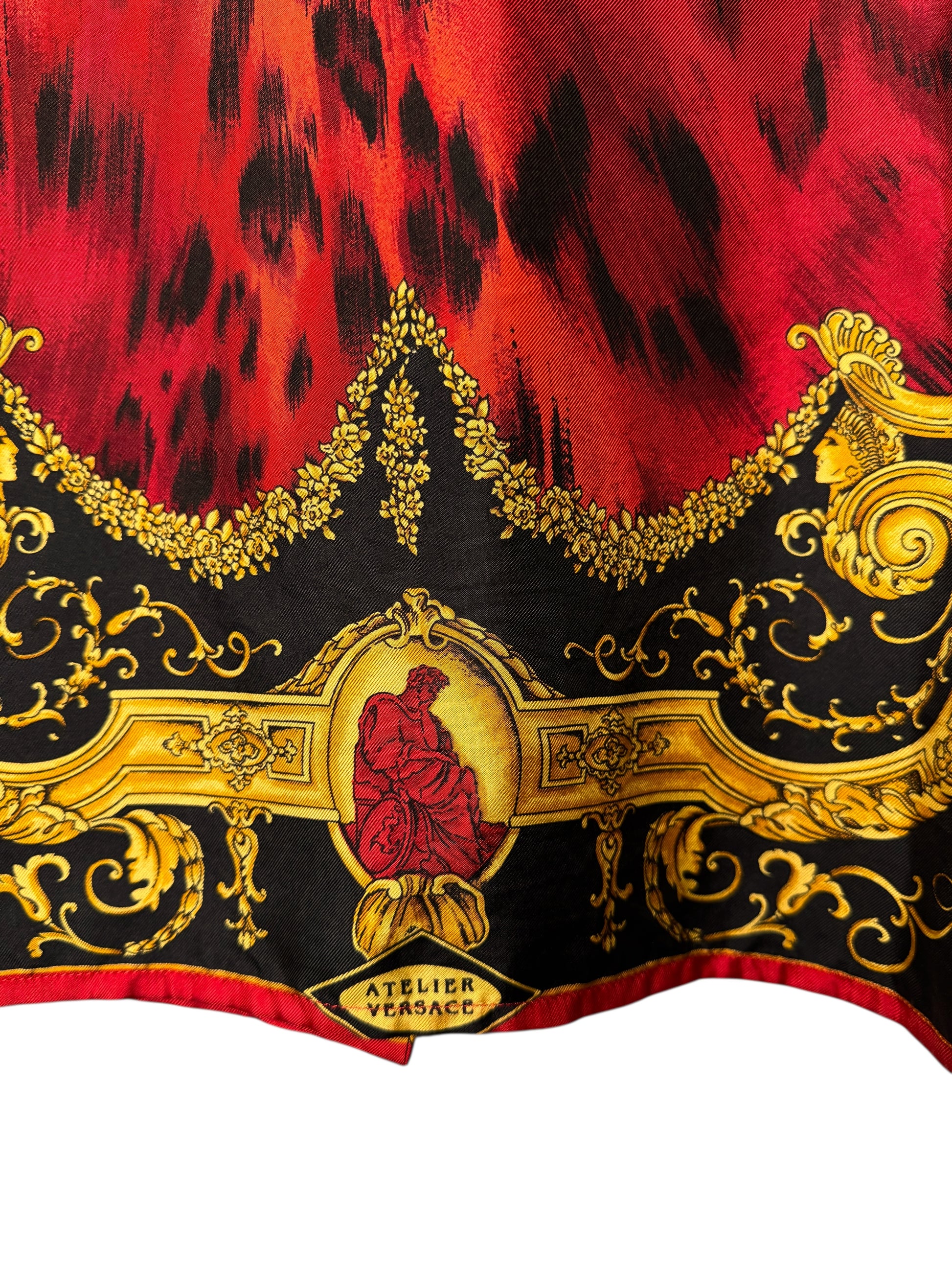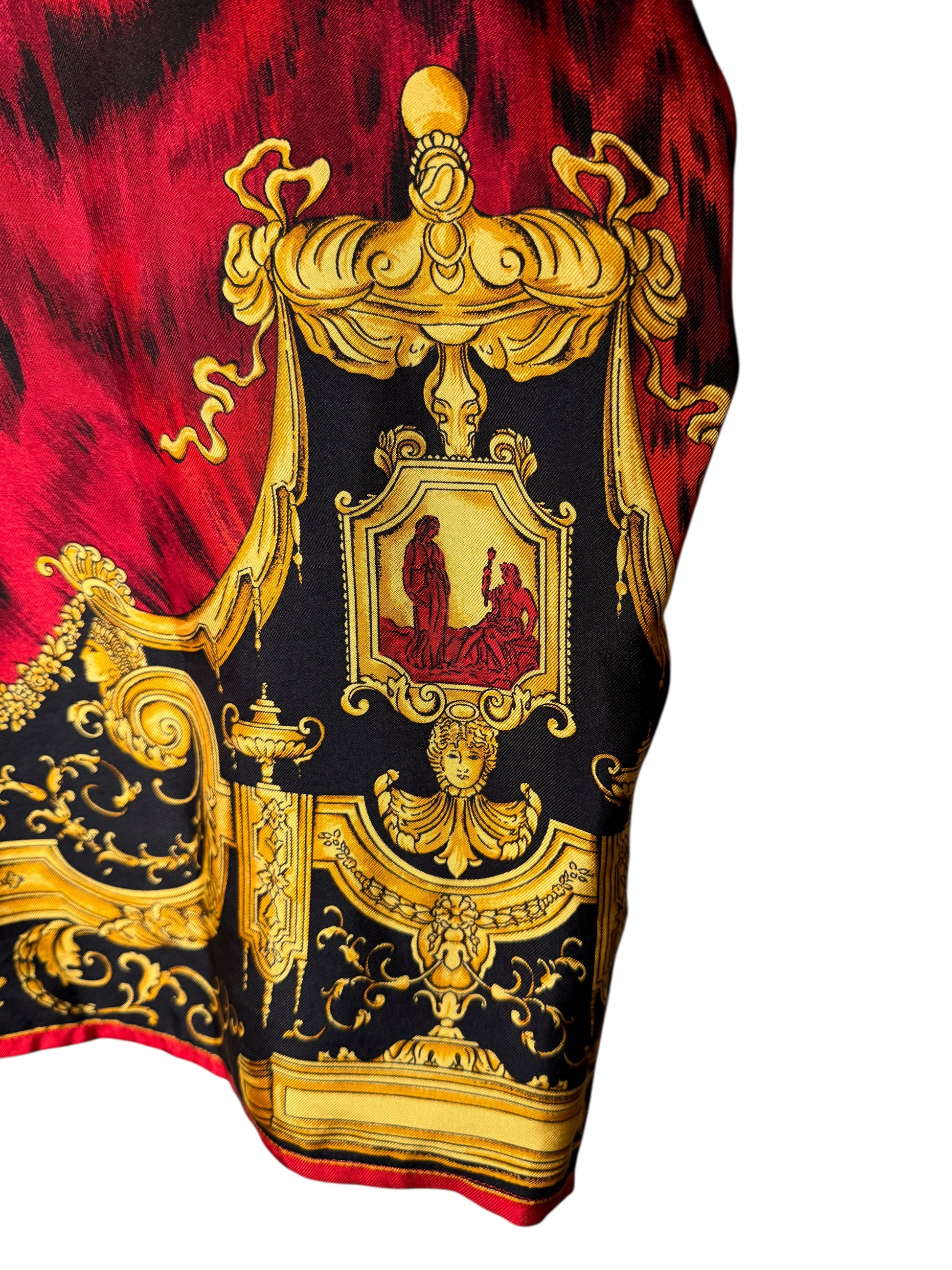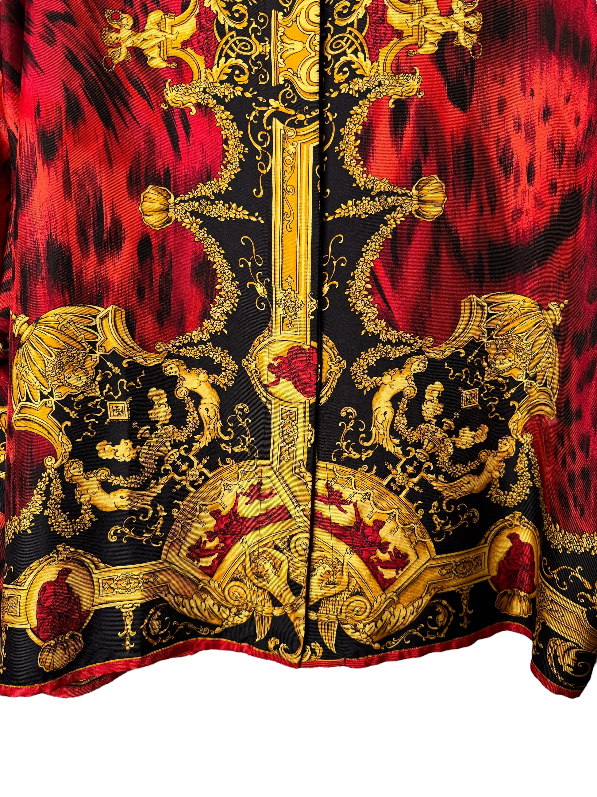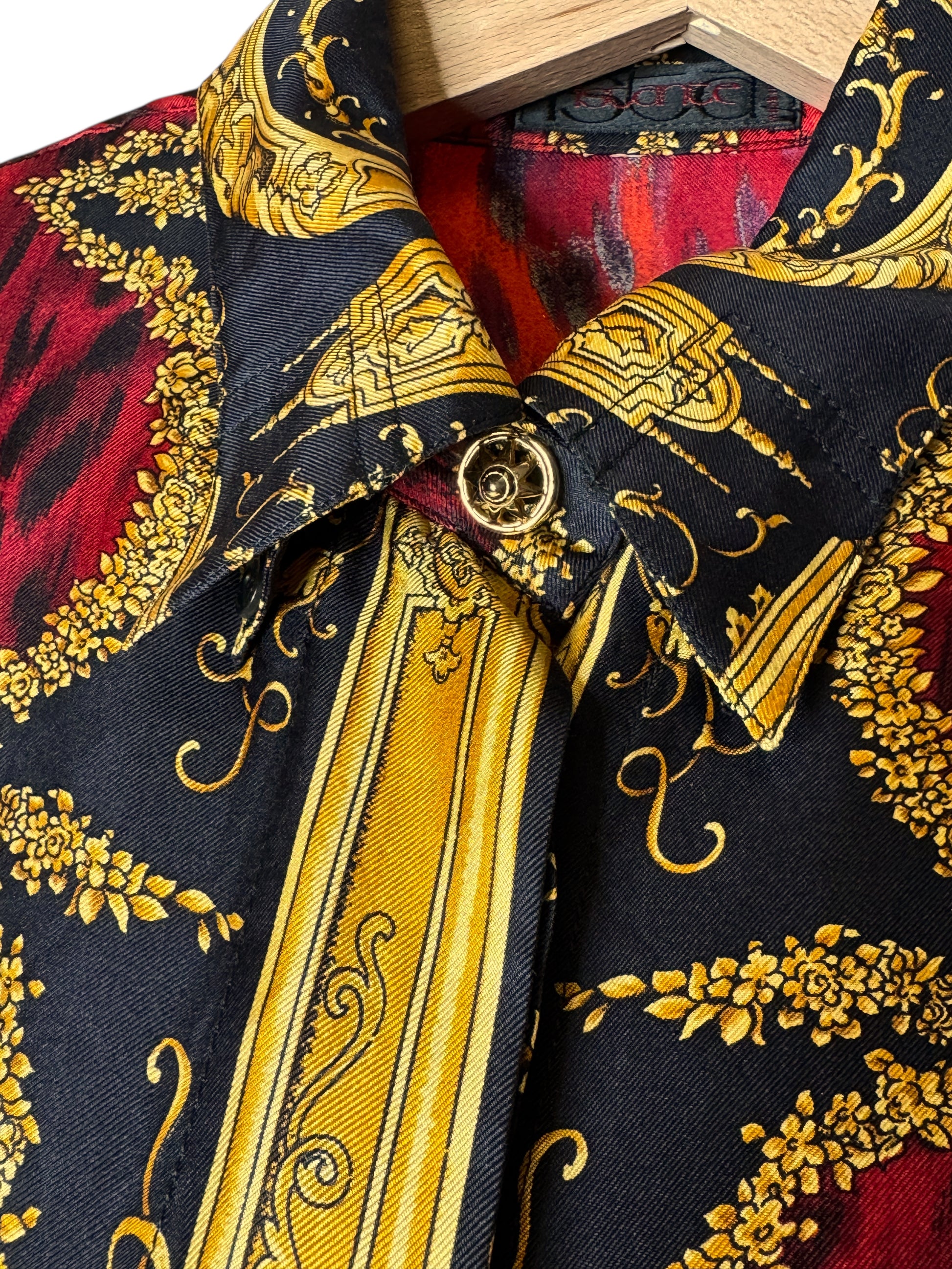 Camicia vintage Gianni Versace appartenente alla linea Istante, realizzata in Italia, taglia 42. Capo raro e iconico in seta con stampa barocca dorata su fondo nero, arricchita da una base animalier rossa. Bottoni dorati decorati, collo importante e vestibilità ampia con maniche a pipistrello. Sul retro è presente la scritta “Atelier Versace” integrata nel disegno. Uno dei pezzi più scenografici dello stile Versace anni ’90.