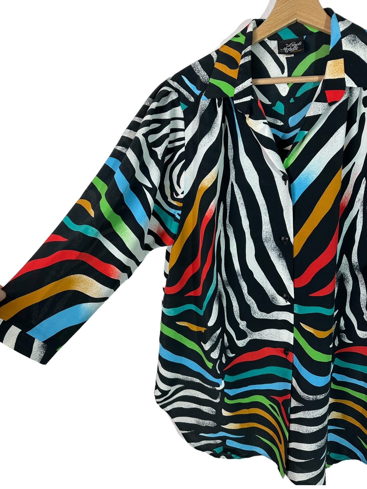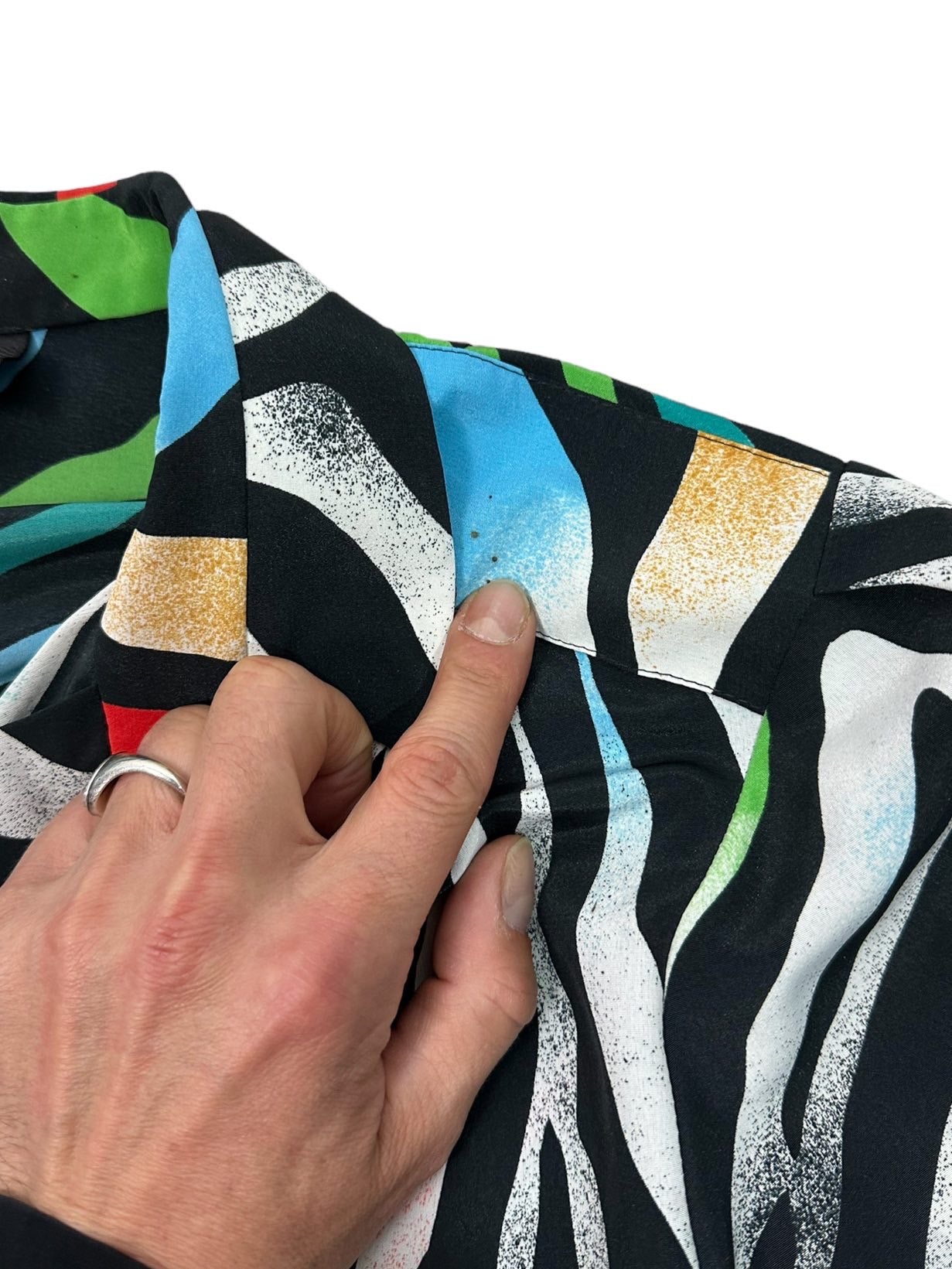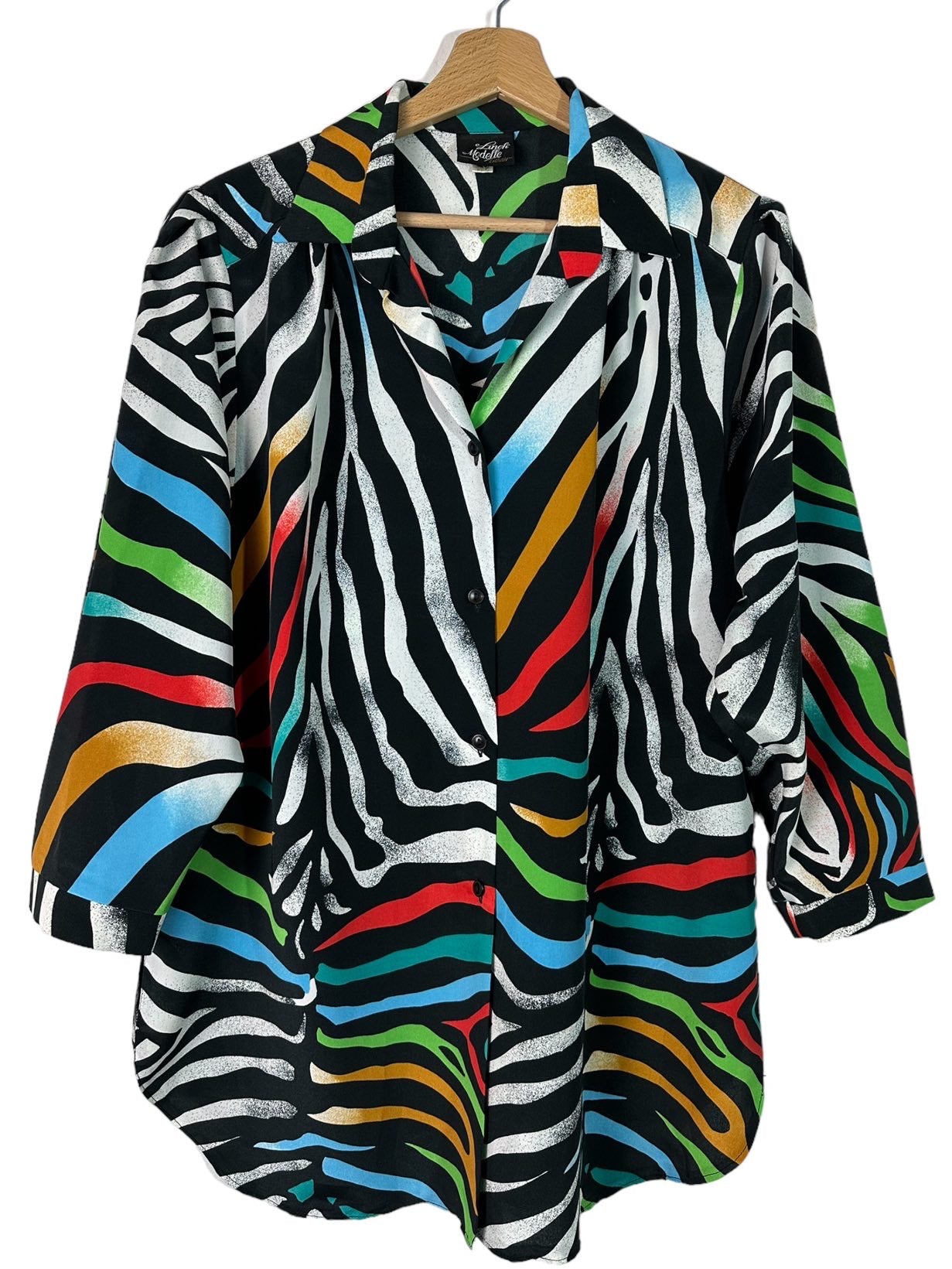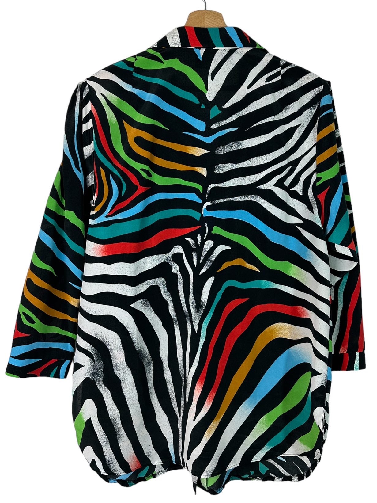 Camicia vintage in fibra sintetica leggera con maniche a tre quarti e stampa simil zebrata multicolor. Piccolissimi segni su una spalla. Tg M