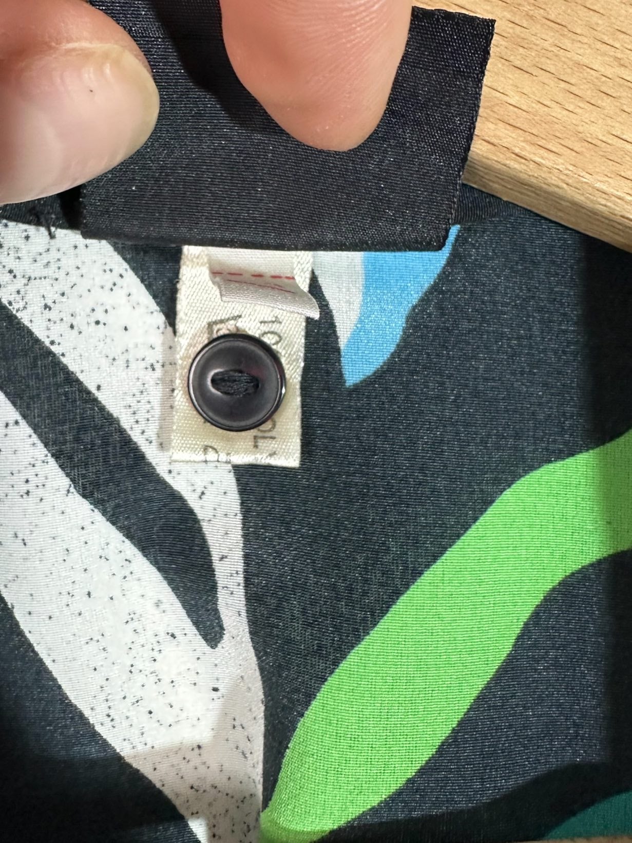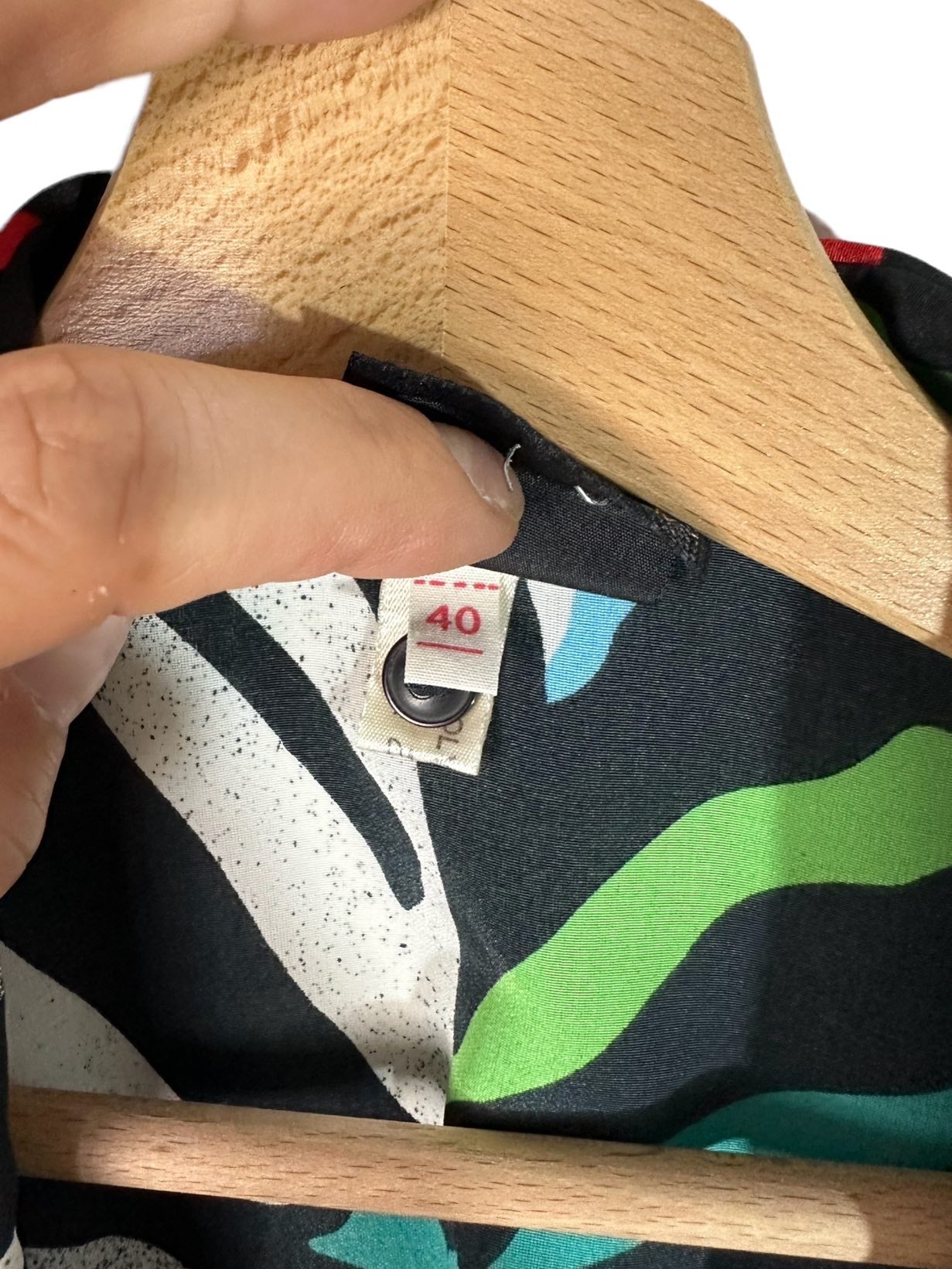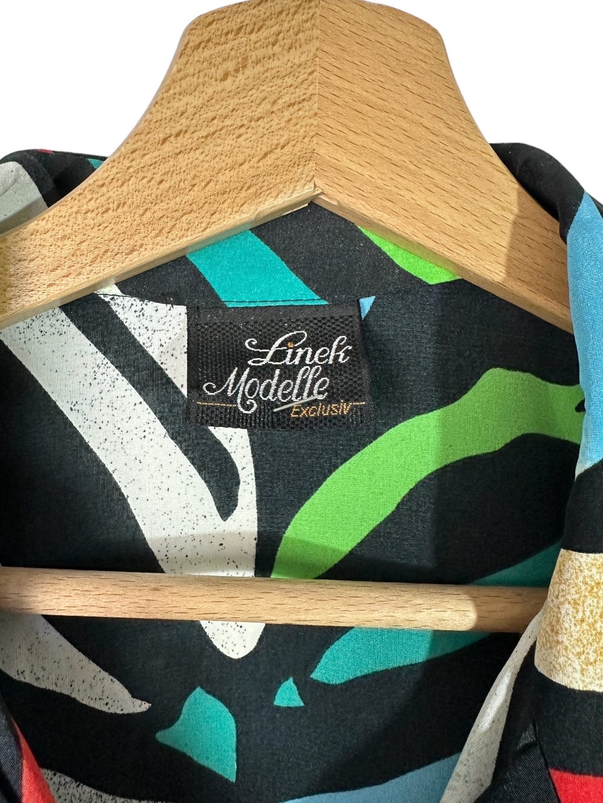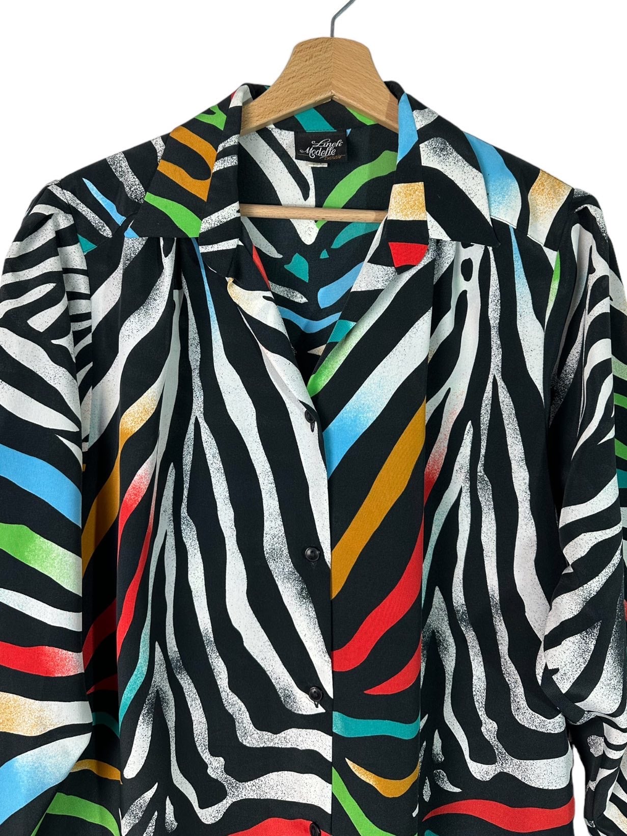 Camicia vintage in fibra sintetica leggera con maniche a tre quarti e stampa simil zebrata multicolor. Piccolissimi segni su una spalla. Tg M
