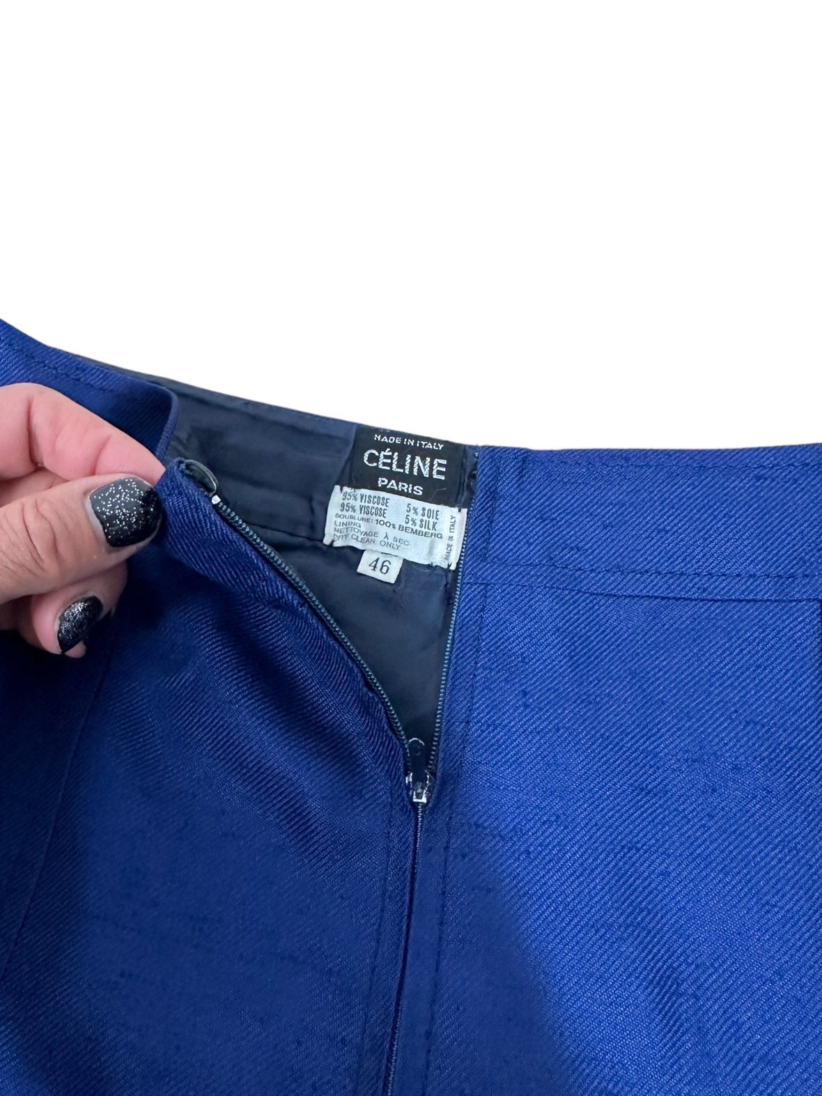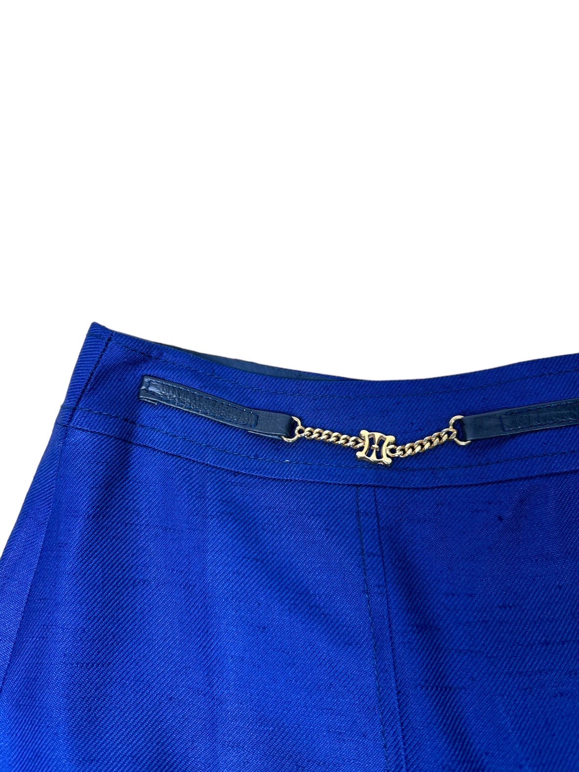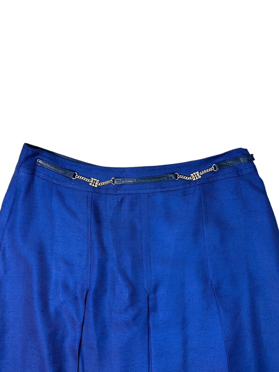 Celine donna vintage a pieghe in viscosa blu con inserto a catene dorate e pelle. Chiusura a zip sul retro. Tg.46