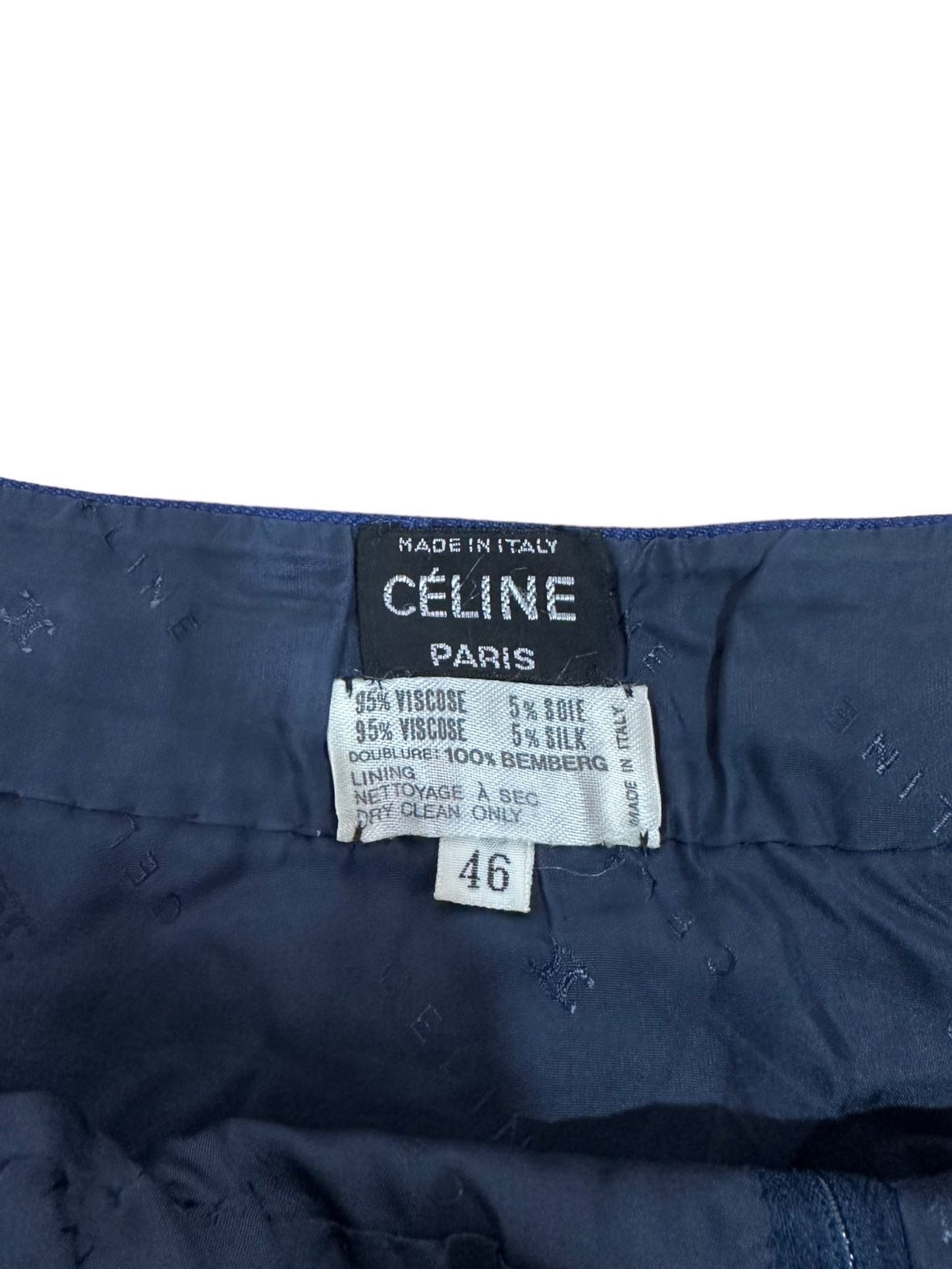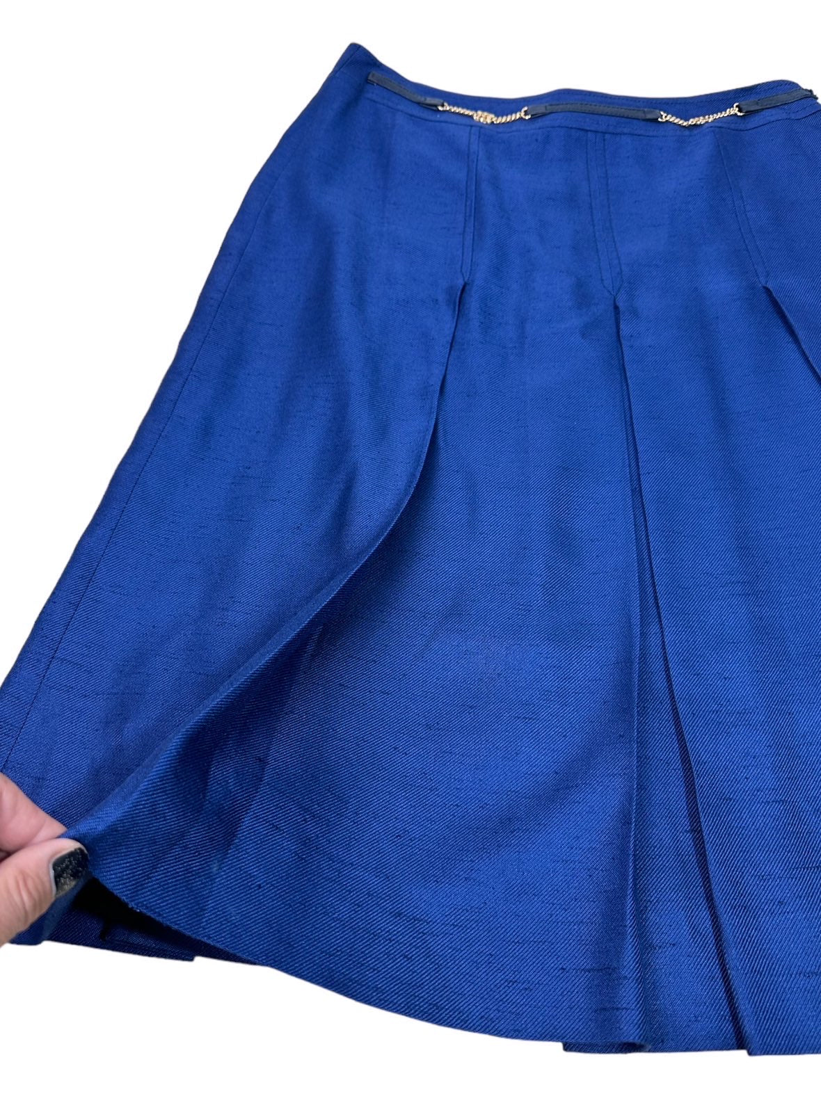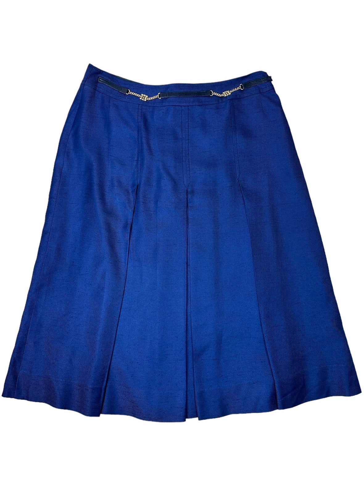 Celine donna vintage a pieghe in viscosa blu con inserto a catene dorate e pelle. Chiusura a zip sul retro. Tg.46