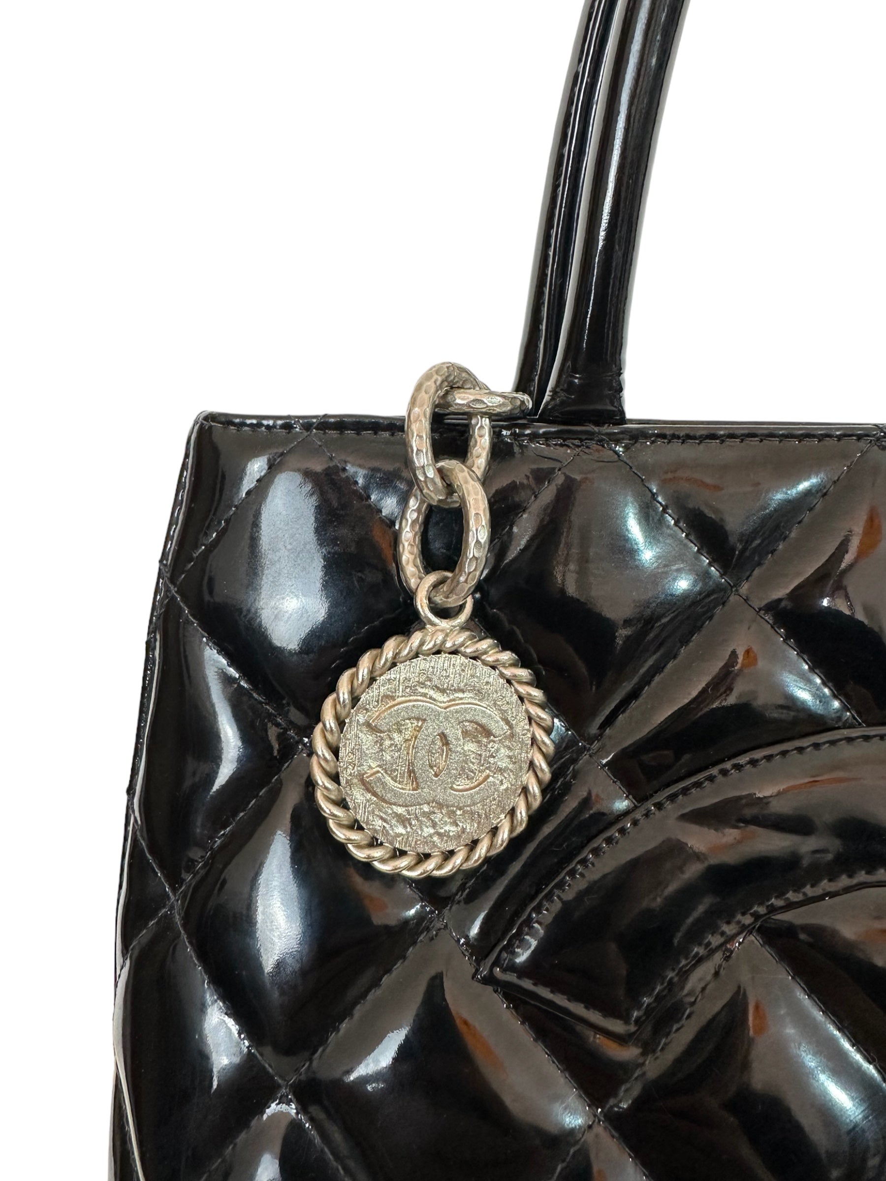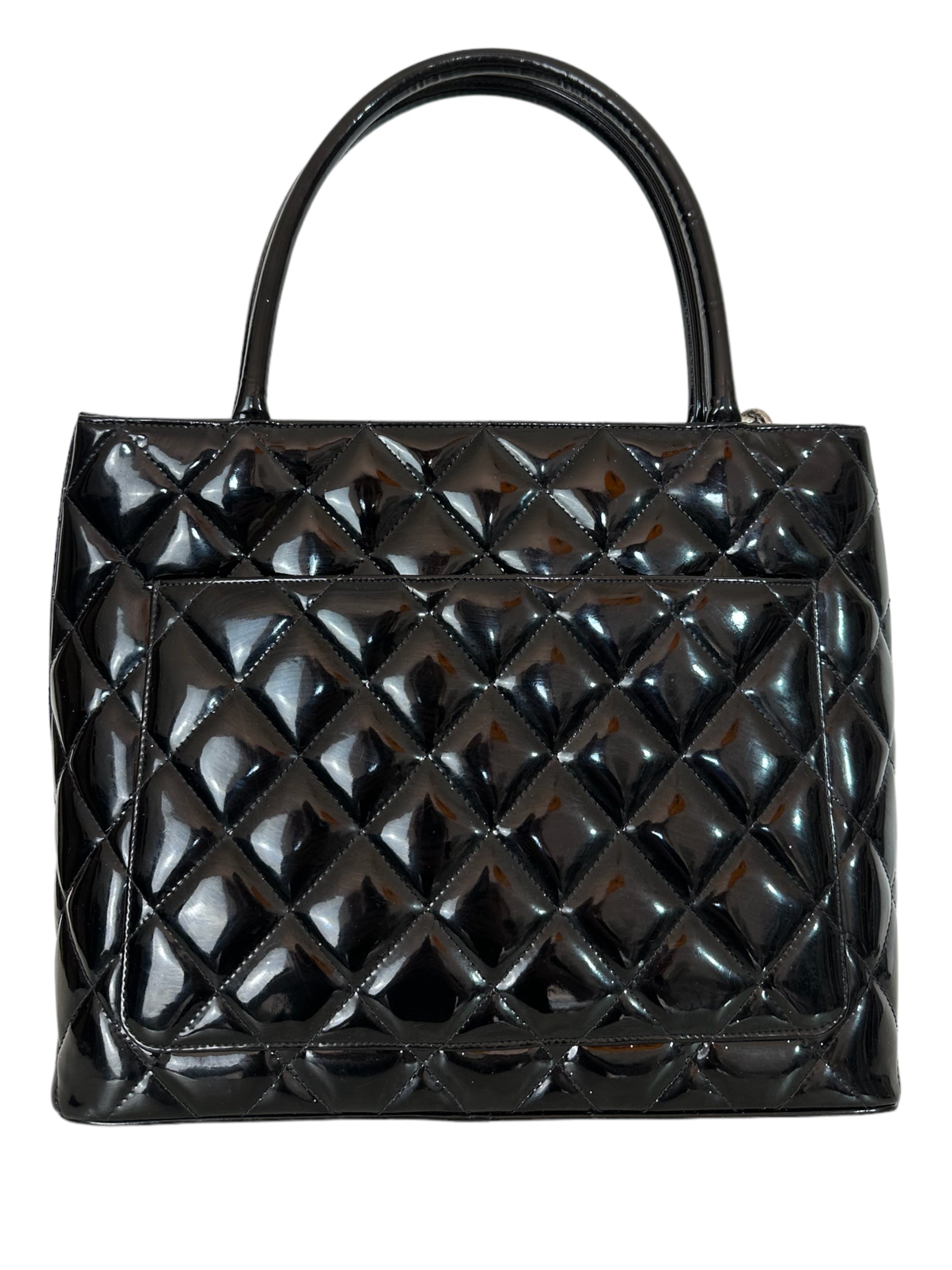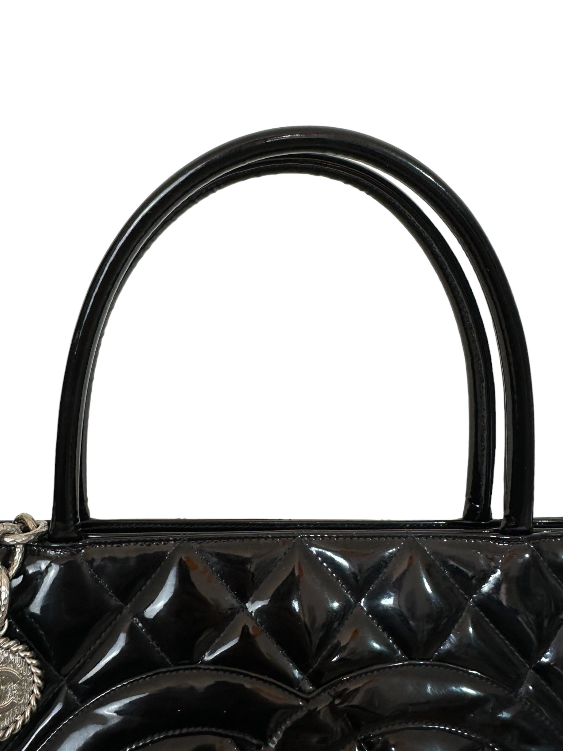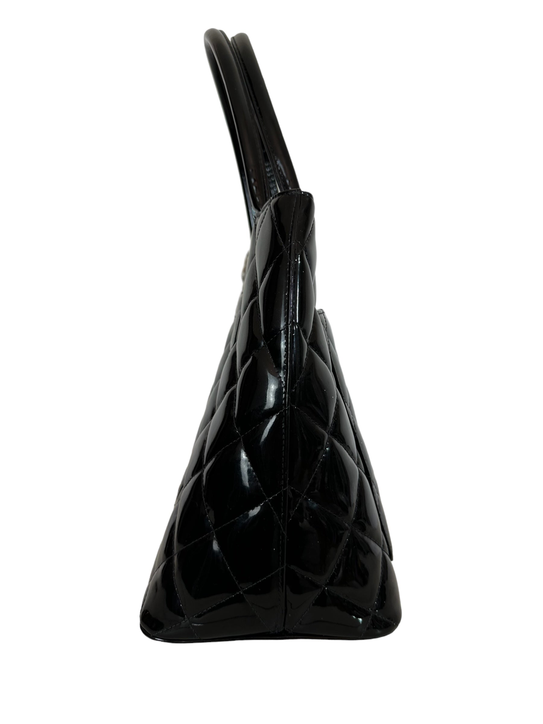 Chanel borsa Médaillon vintage anni 2000s in vernice nera con manici rigidi, maxi logo toni su tono frontale e chiusura a zip con tirante circolare logato. Molto capiente all’interno. Presenta dei micro segni brillantinati in alcuni punti della base visibili in foto, la parte in vernice in alcuni punti risulta leggermente appiccicosa. Viene spedita con dust bag.
