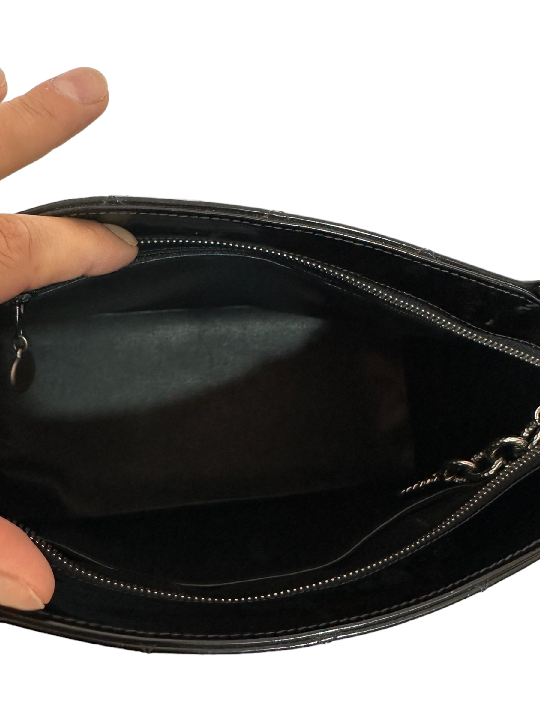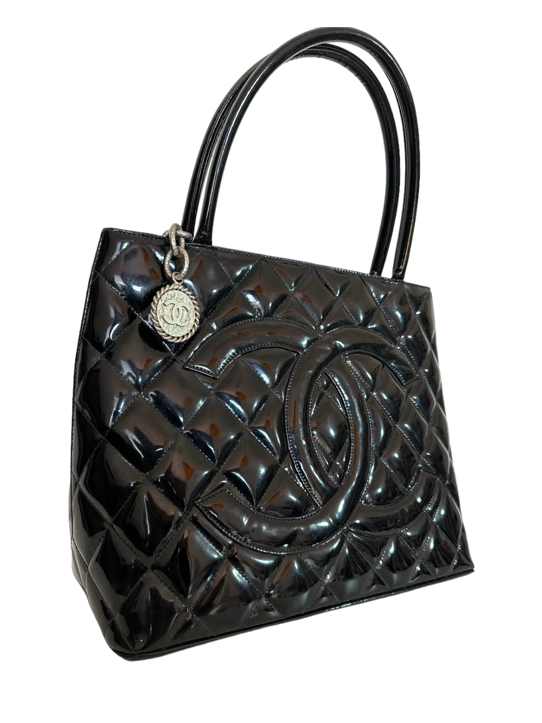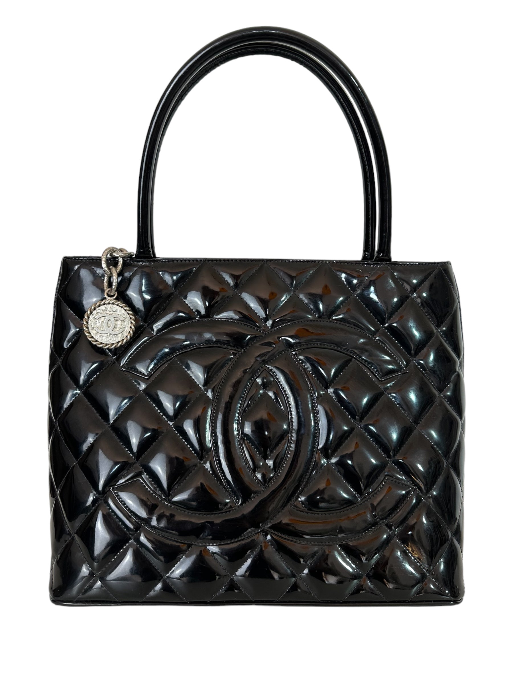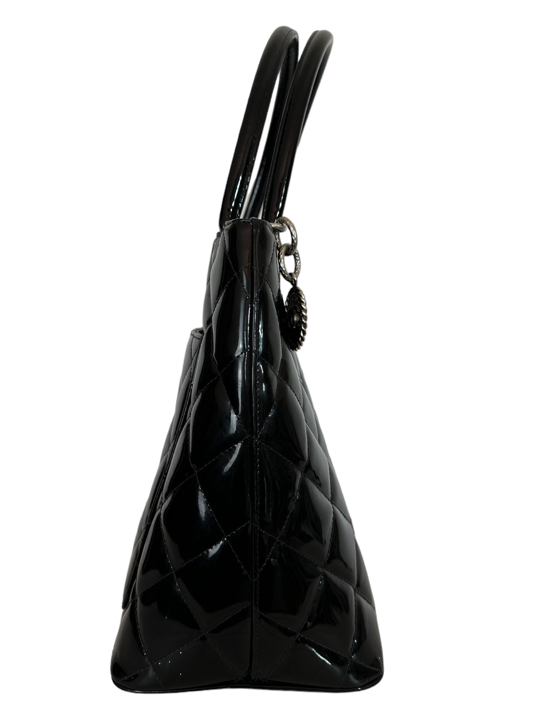 Chanel borsa Médaillon vintage anni 2000s in vernice nera con manici rigidi, maxi logo toni su tono frontale e chiusura a zip con tirante circolare logato. Molto capiente all’interno. Presenta dei micro segni brillantinati in alcuni punti della base visibili in foto, la parte in vernice in alcuni punti risulta leggermente appiccicosa. Viene spedita con dust bag.