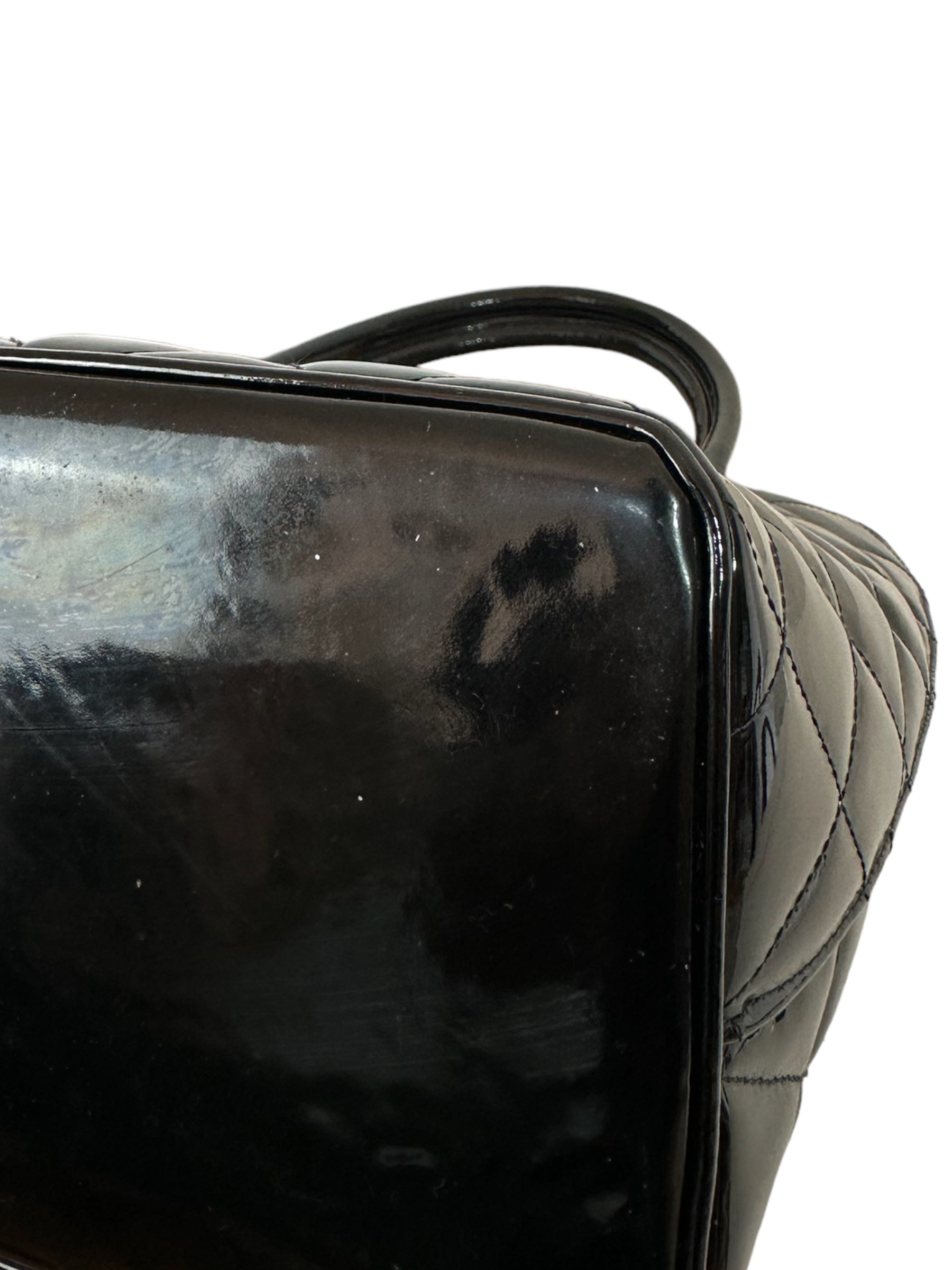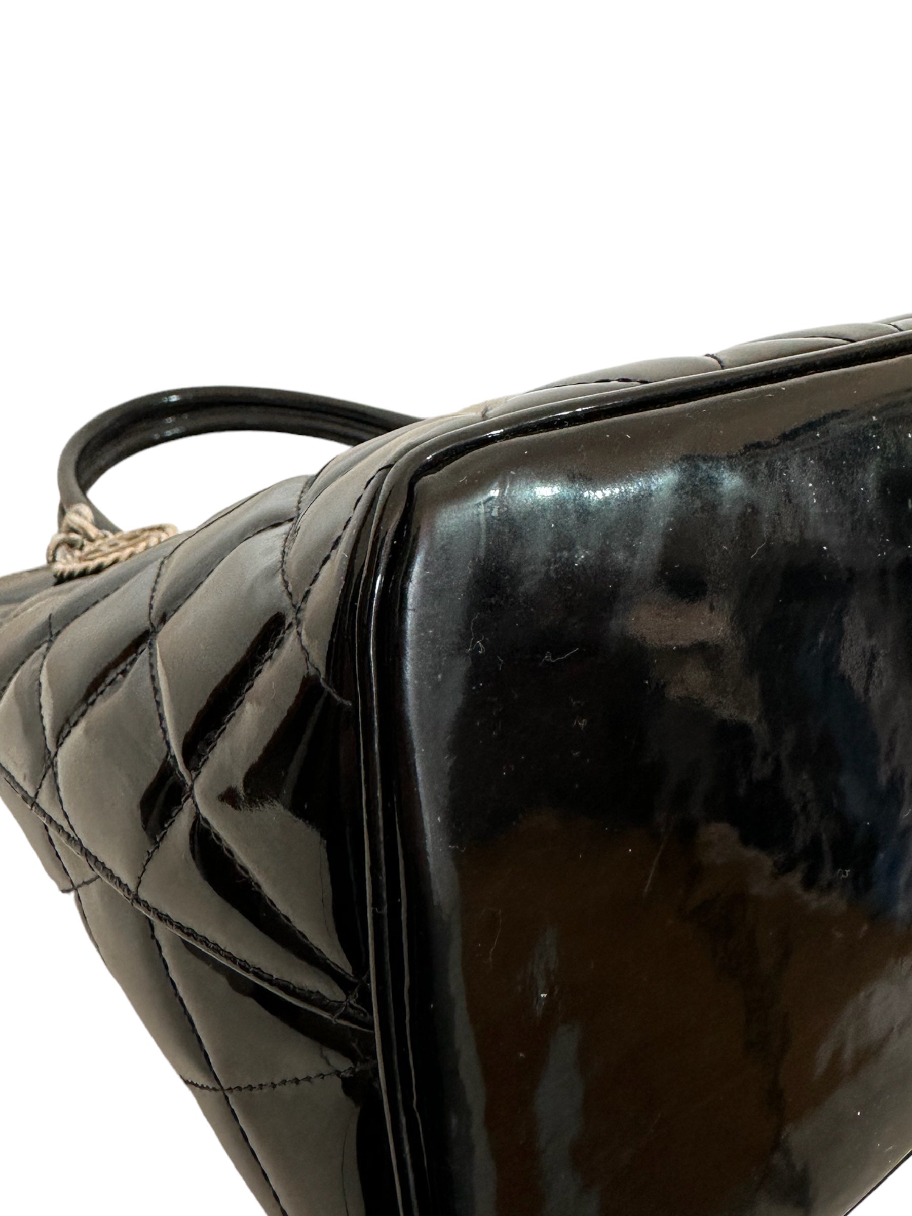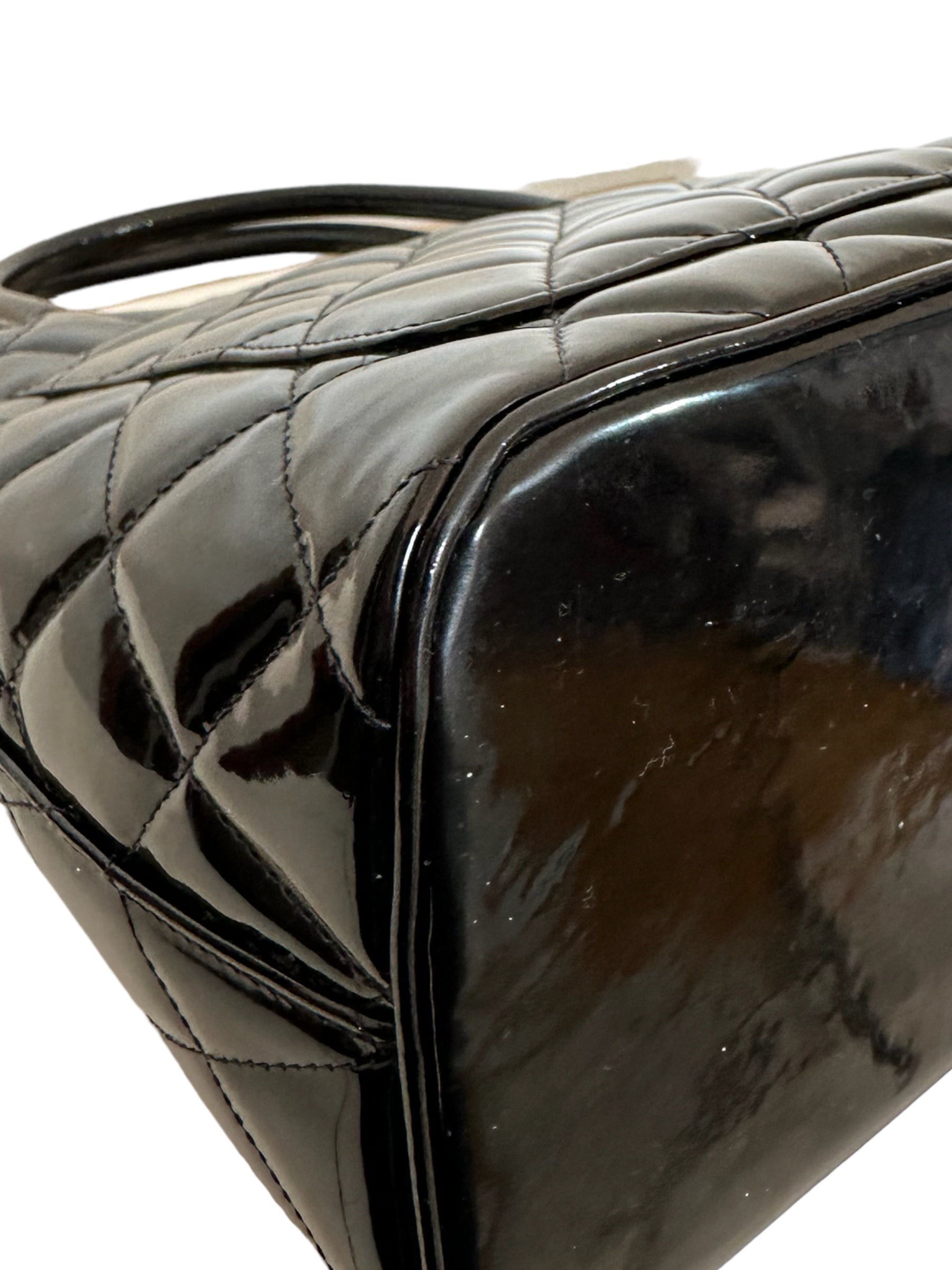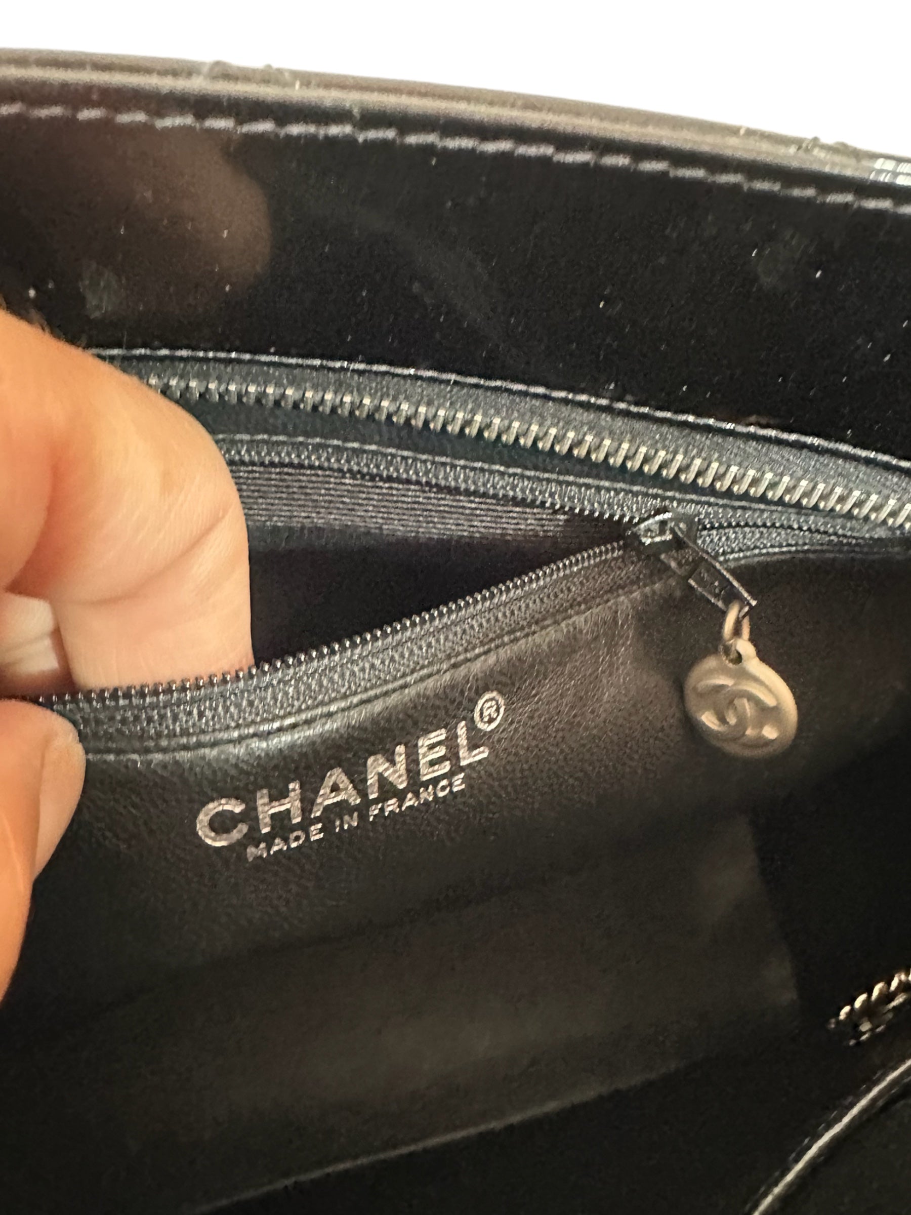 Chanel borsa Médaillon vintage anni 2000s in vernice nera con manici rigidi, maxi logo toni su tono frontale e chiusura a zip con tirante circolare logato. Molto capiente all’interno. Presenta dei micro segni brillantinati in alcuni punti della base visibili in foto, la parte in vernice in alcuni punti risulta leggermente appiccicosa. Viene spedita con dust bag.