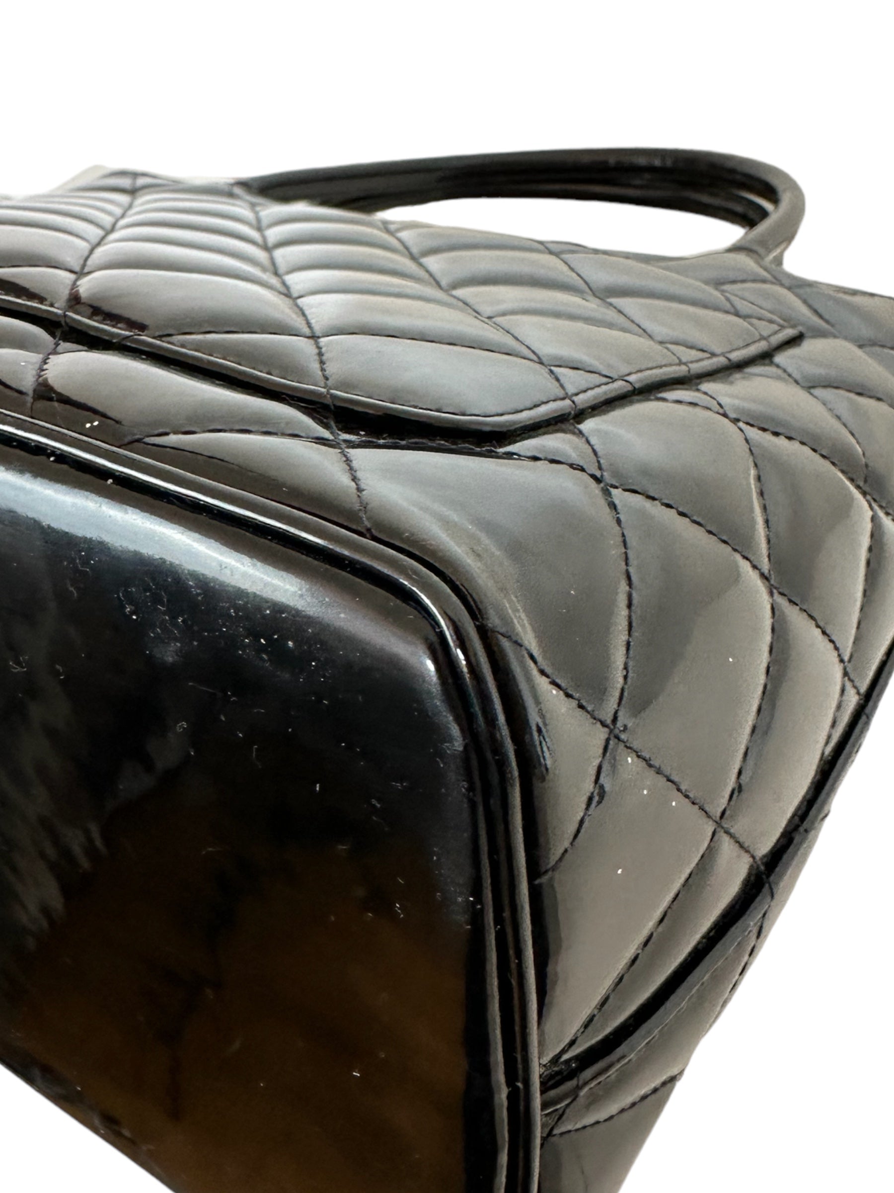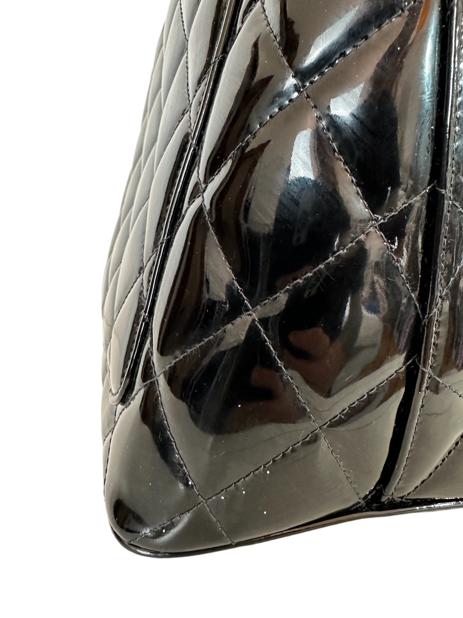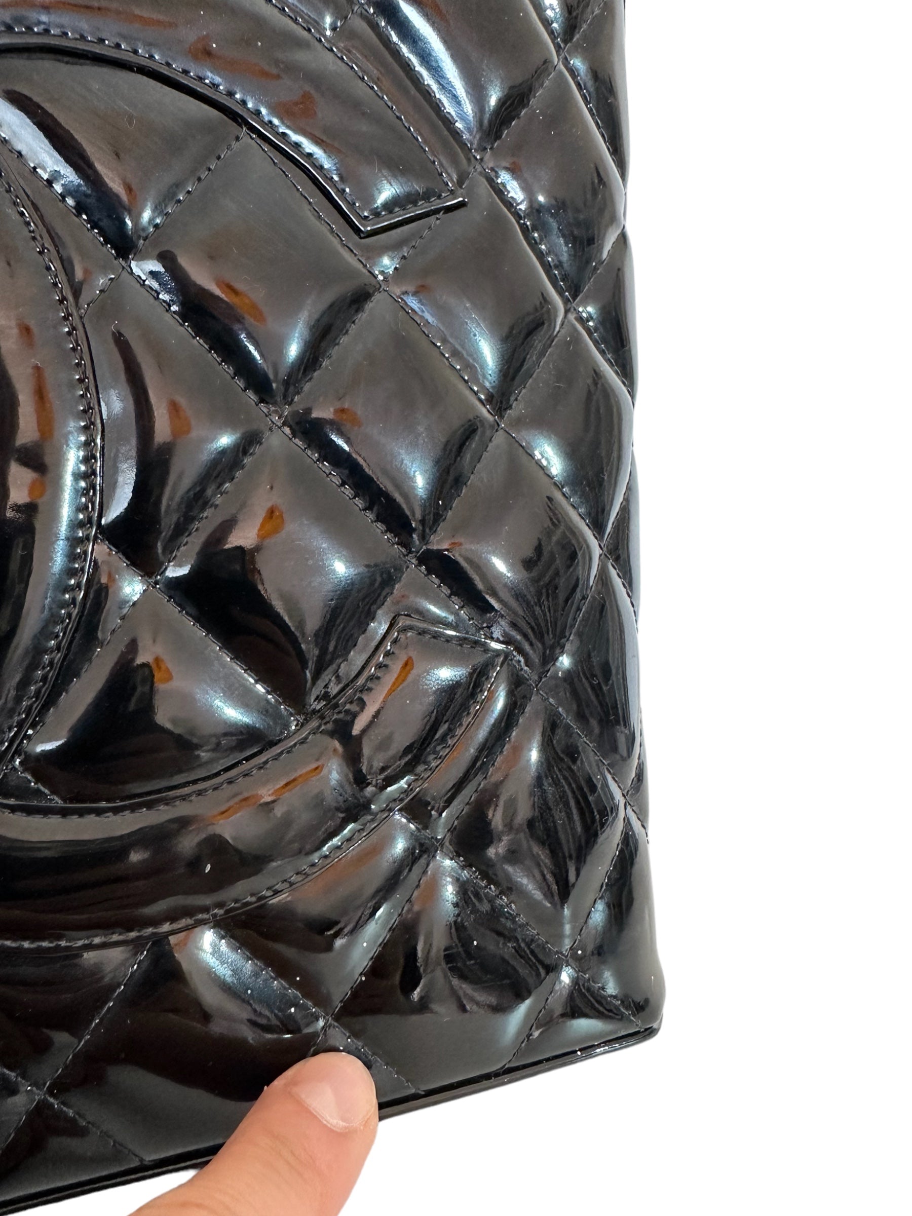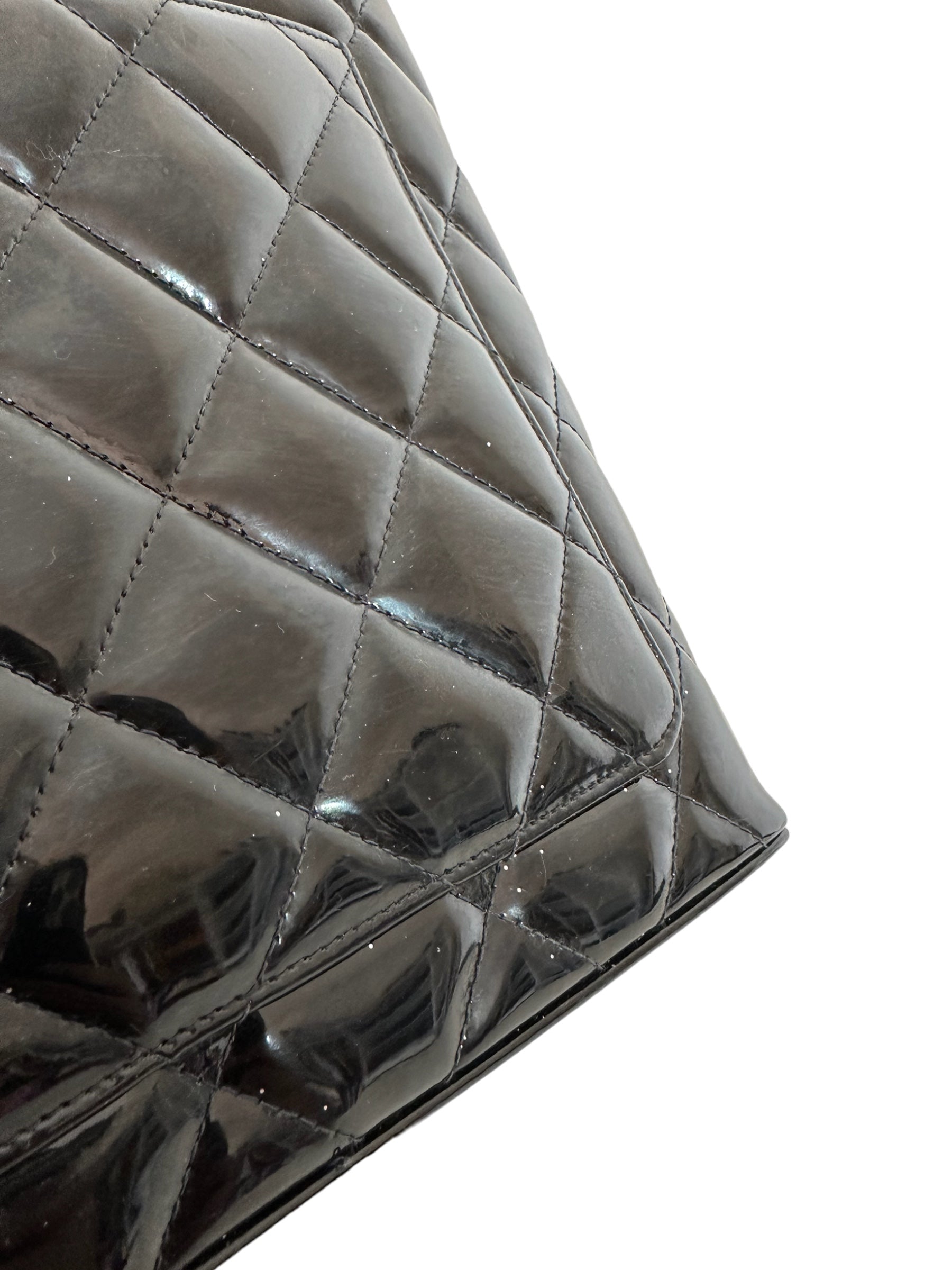 Chanel borsa Médaillon vintage anni 2000s in vernice nera con manici rigidi, maxi logo toni su tono frontale e chiusura a zip con tirante circolare logato. Molto capiente all’interno. Presenta dei micro segni brillantinati in alcuni punti della base visibili in foto, la parte in vernice in alcuni punti risulta leggermente appiccicosa. Viene spedita con dust bag.