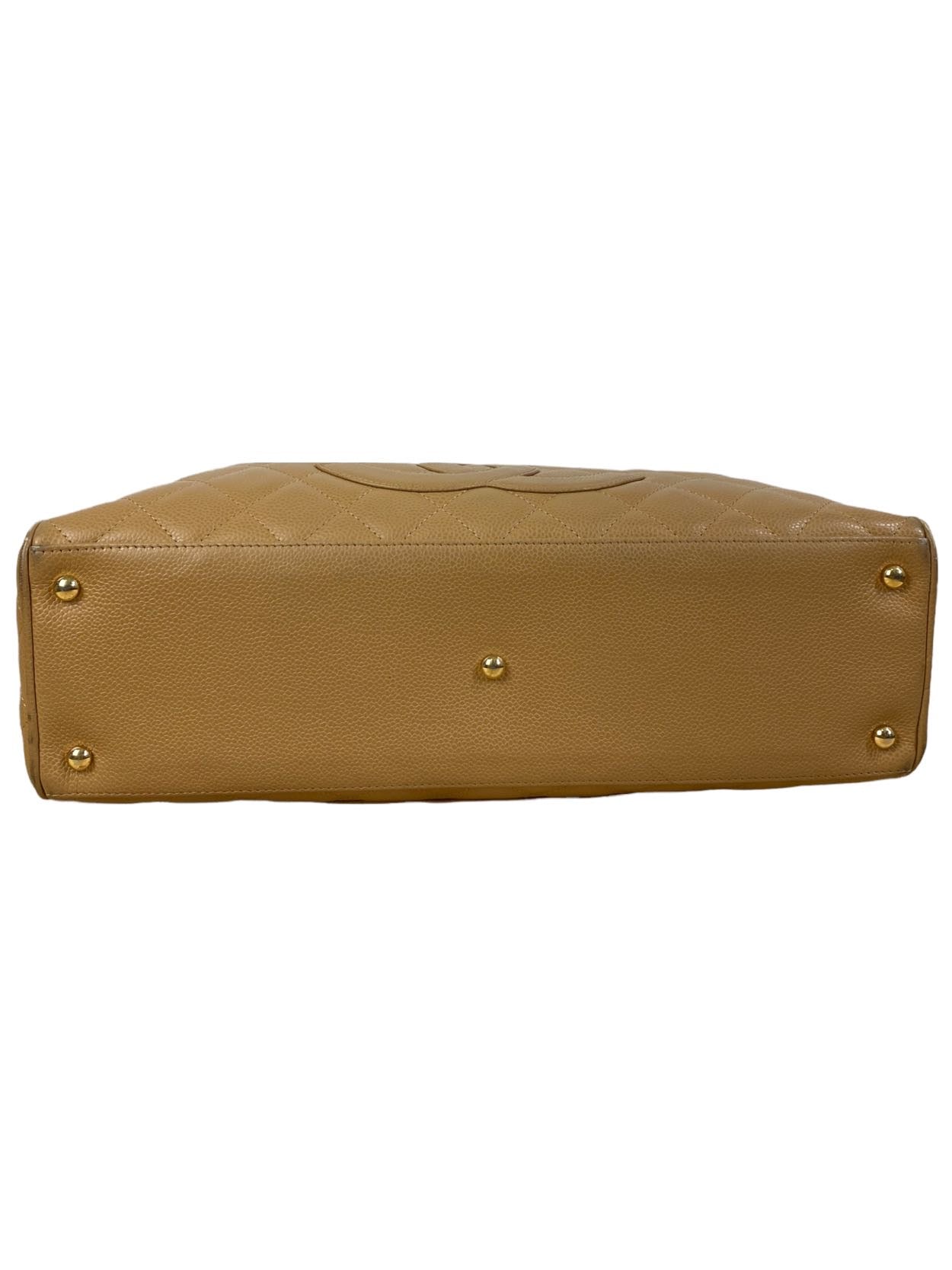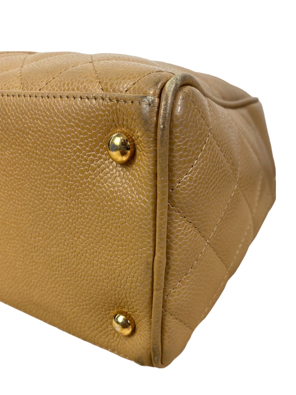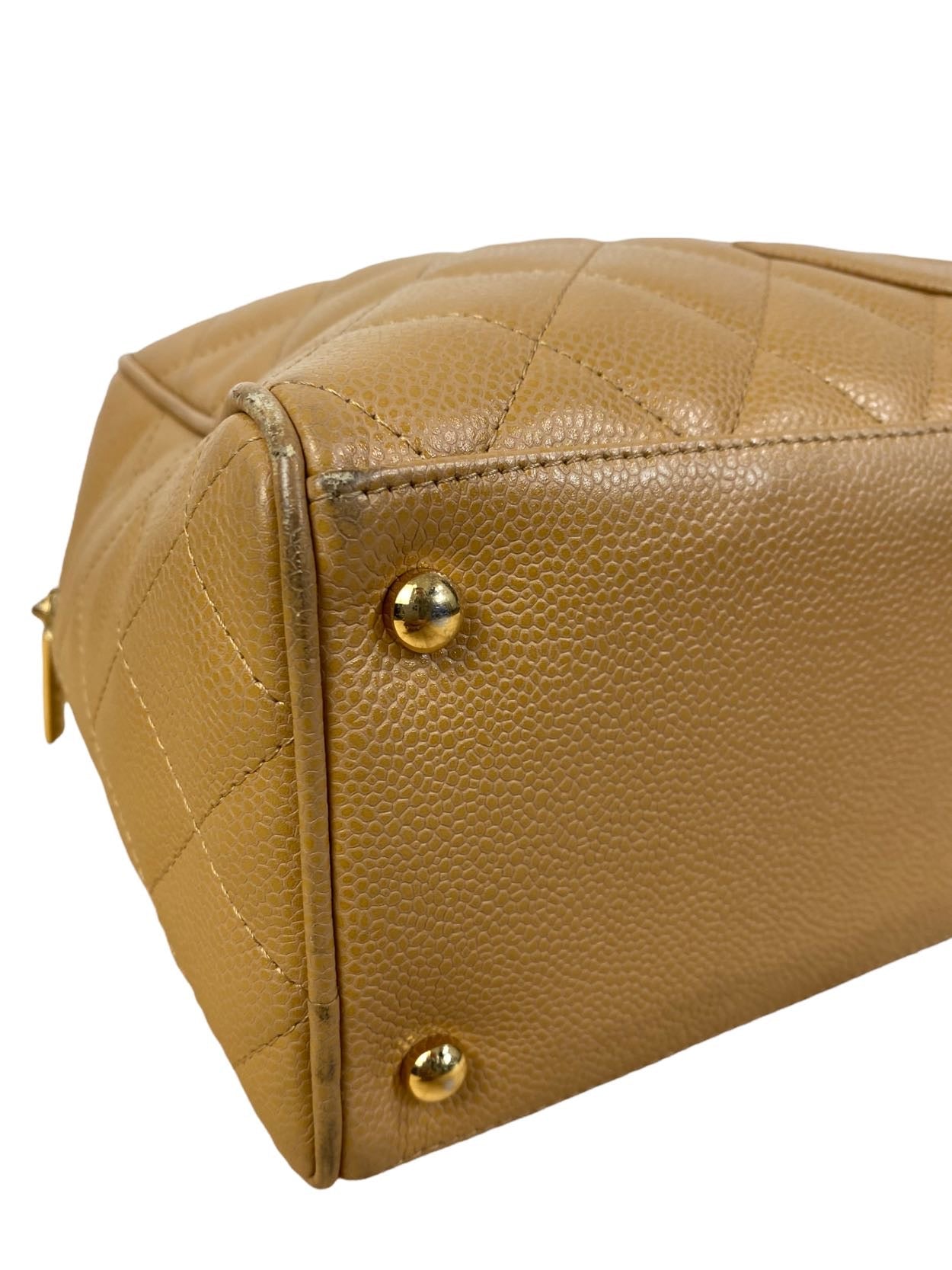 Borsa vintage in pelle trapuntata colo cammello con maniche rivivi e maxi logo sul davati. Tirante per chiusura in metallo. Presenta lievi segni di usura sugli angoli.
