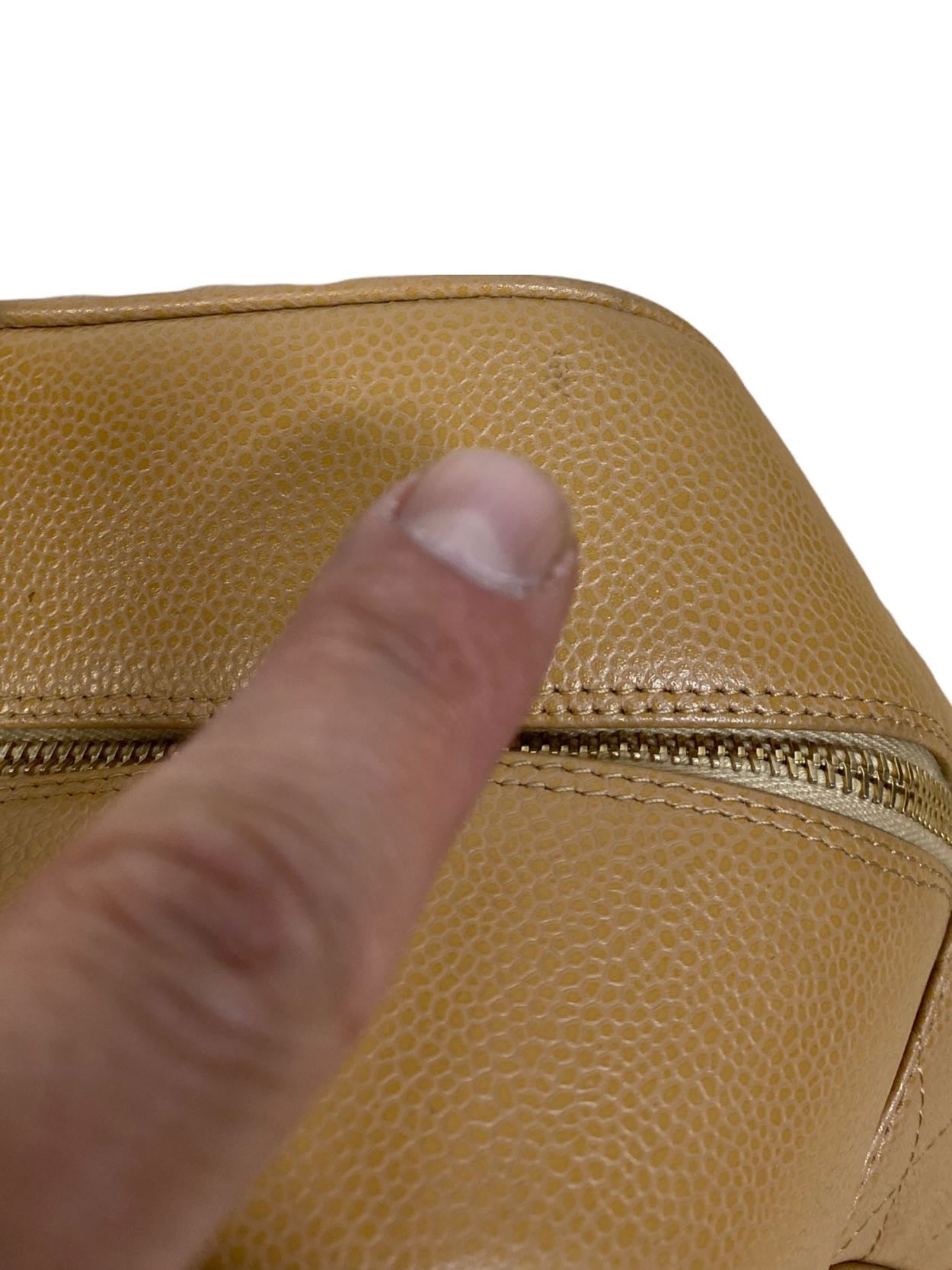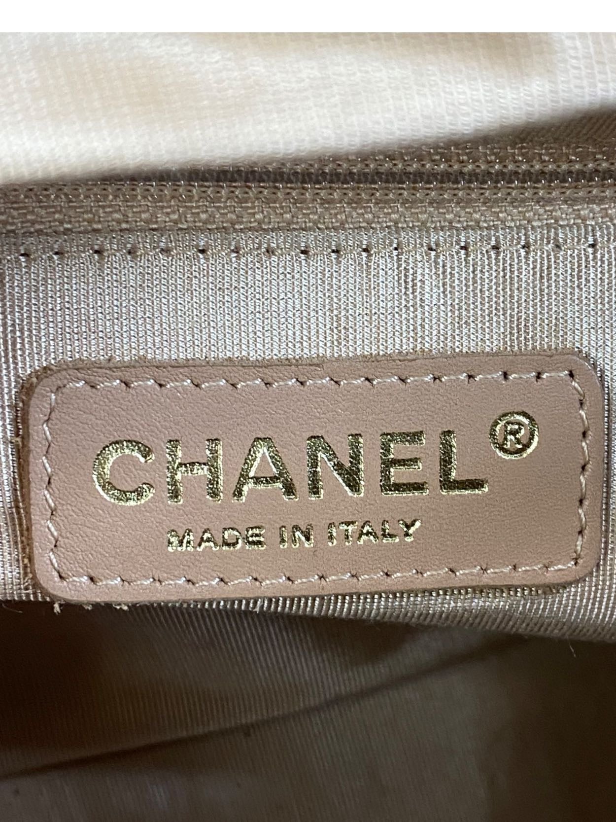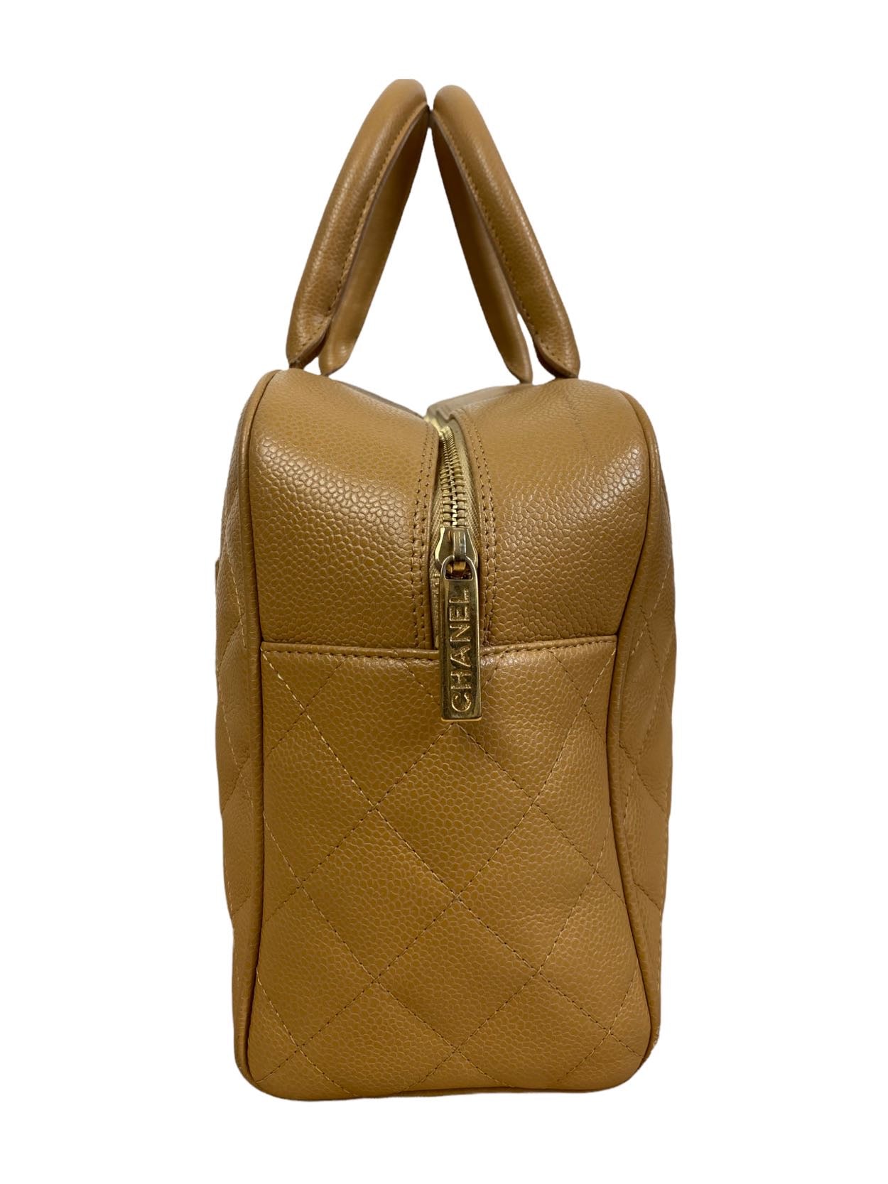 Borsa vintage in pelle trapuntata colo cammello con maniche rivivi e maxi logo sul davati. Tirante per chiusura in metallo. Presenta lievi segni di usura sugli angoli.