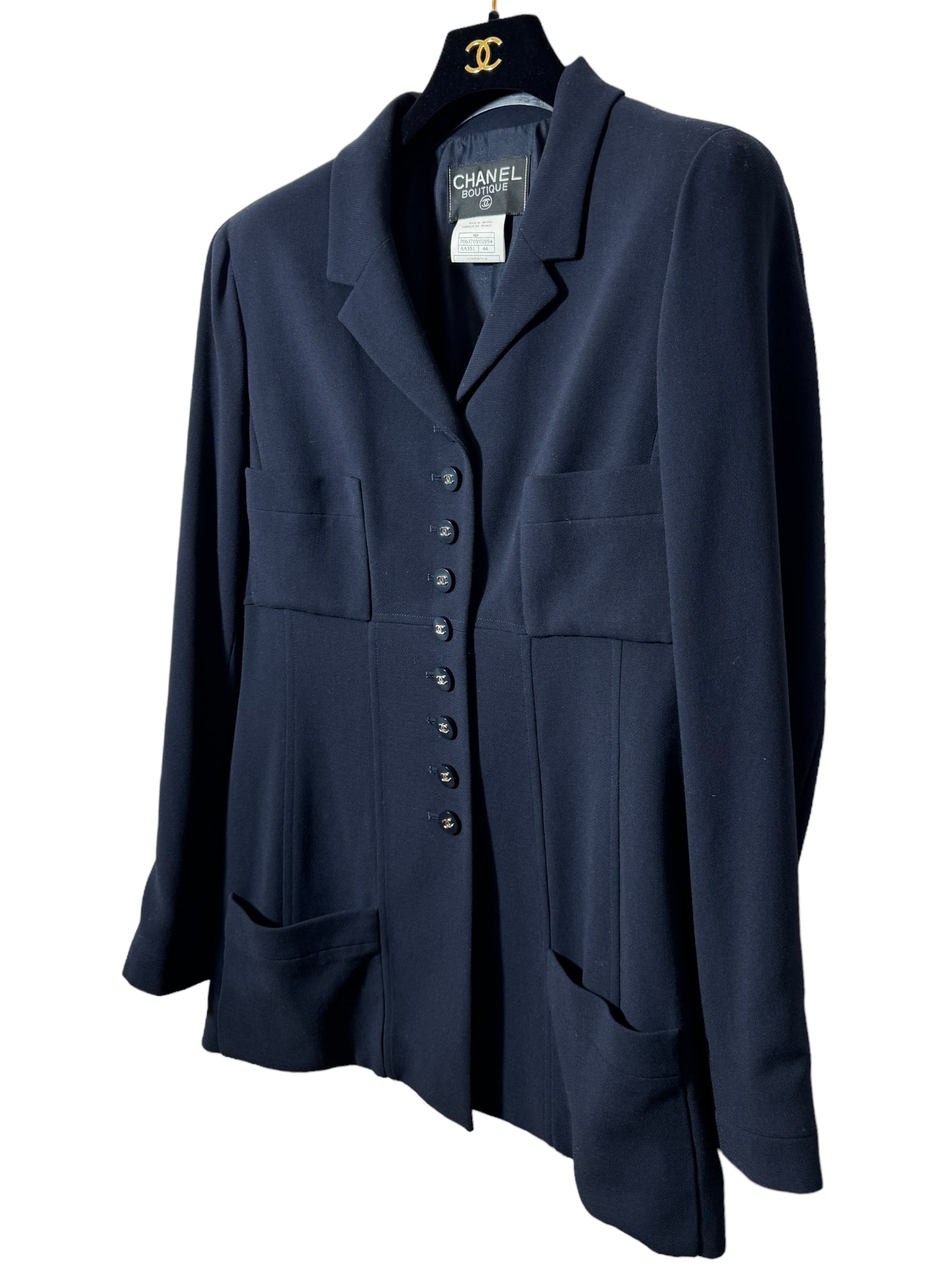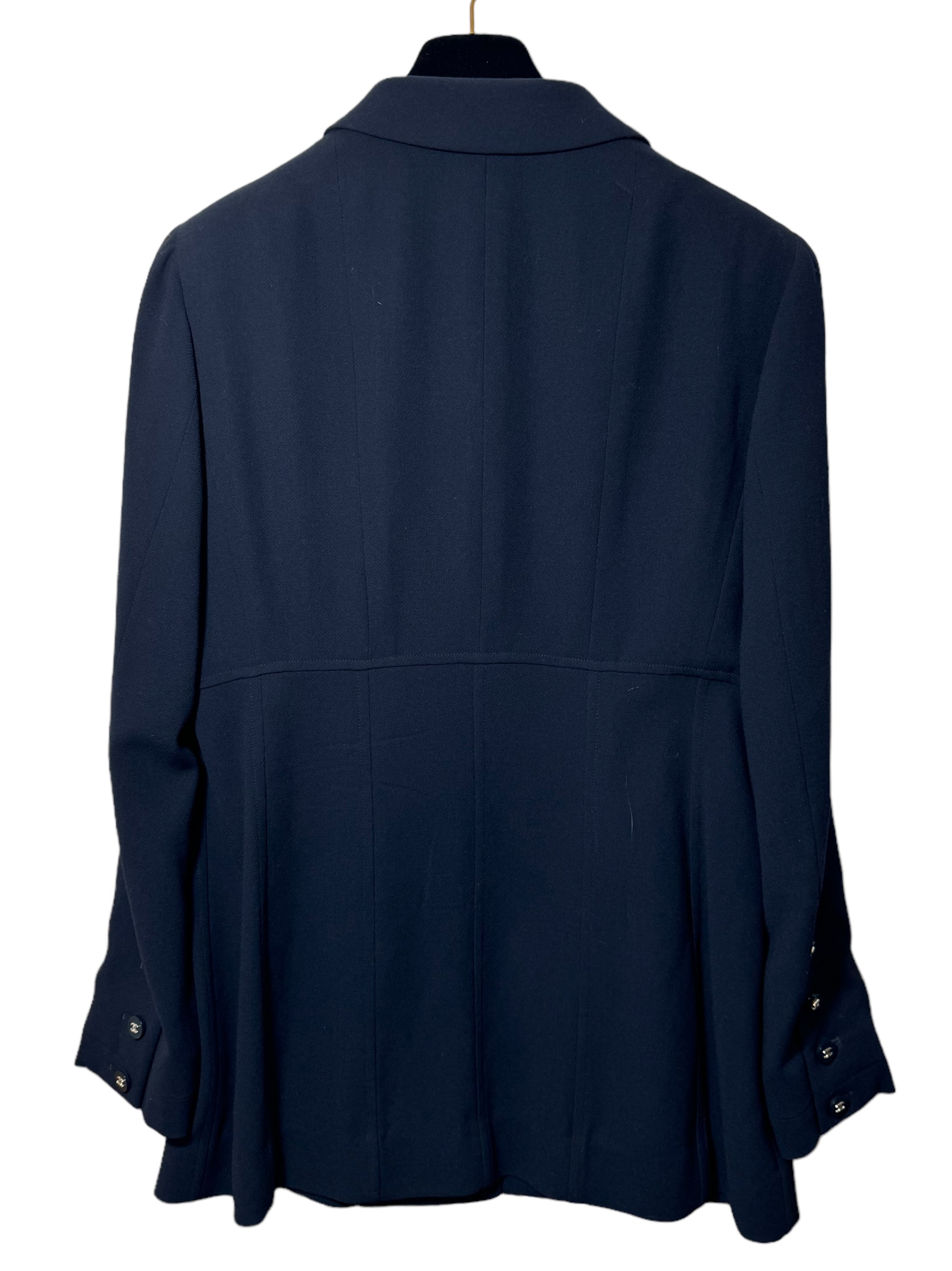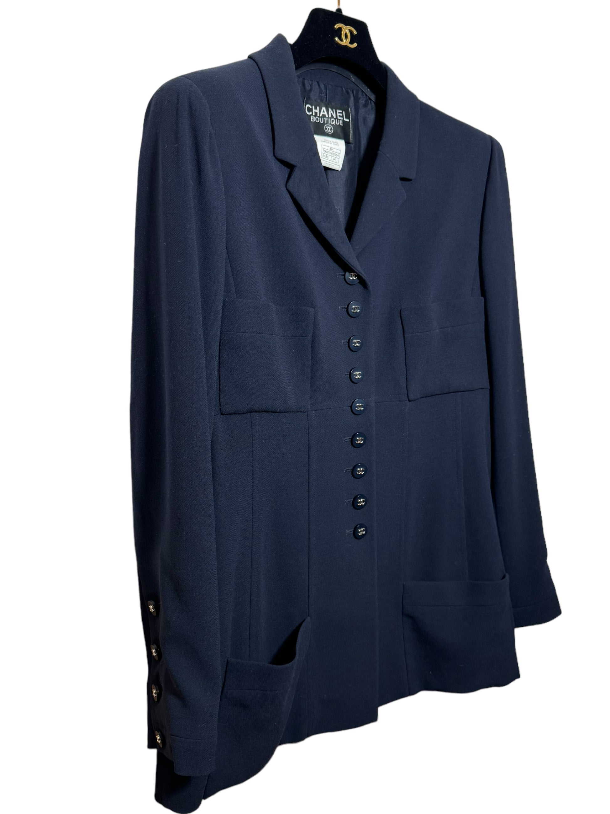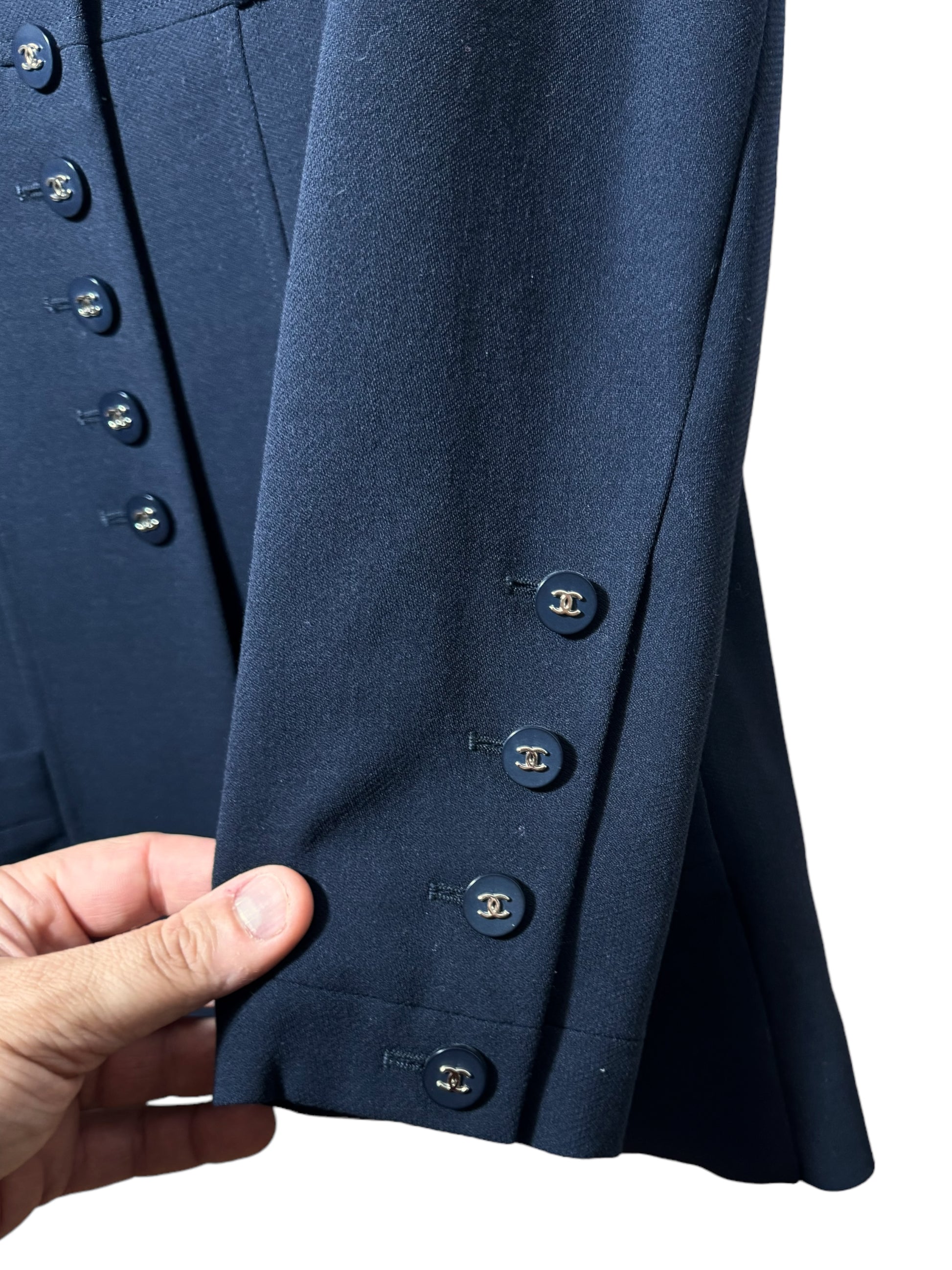 Chanel giacca vintage In lana blu e foderata in seta, con 4 tasche e una lunga fila di bottoni con logo CC sul davanti e sulle maniche. Taglia 44.