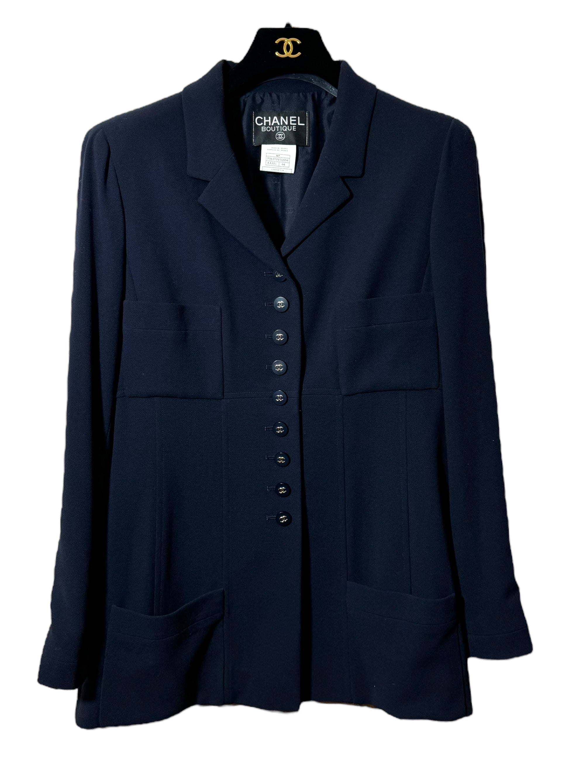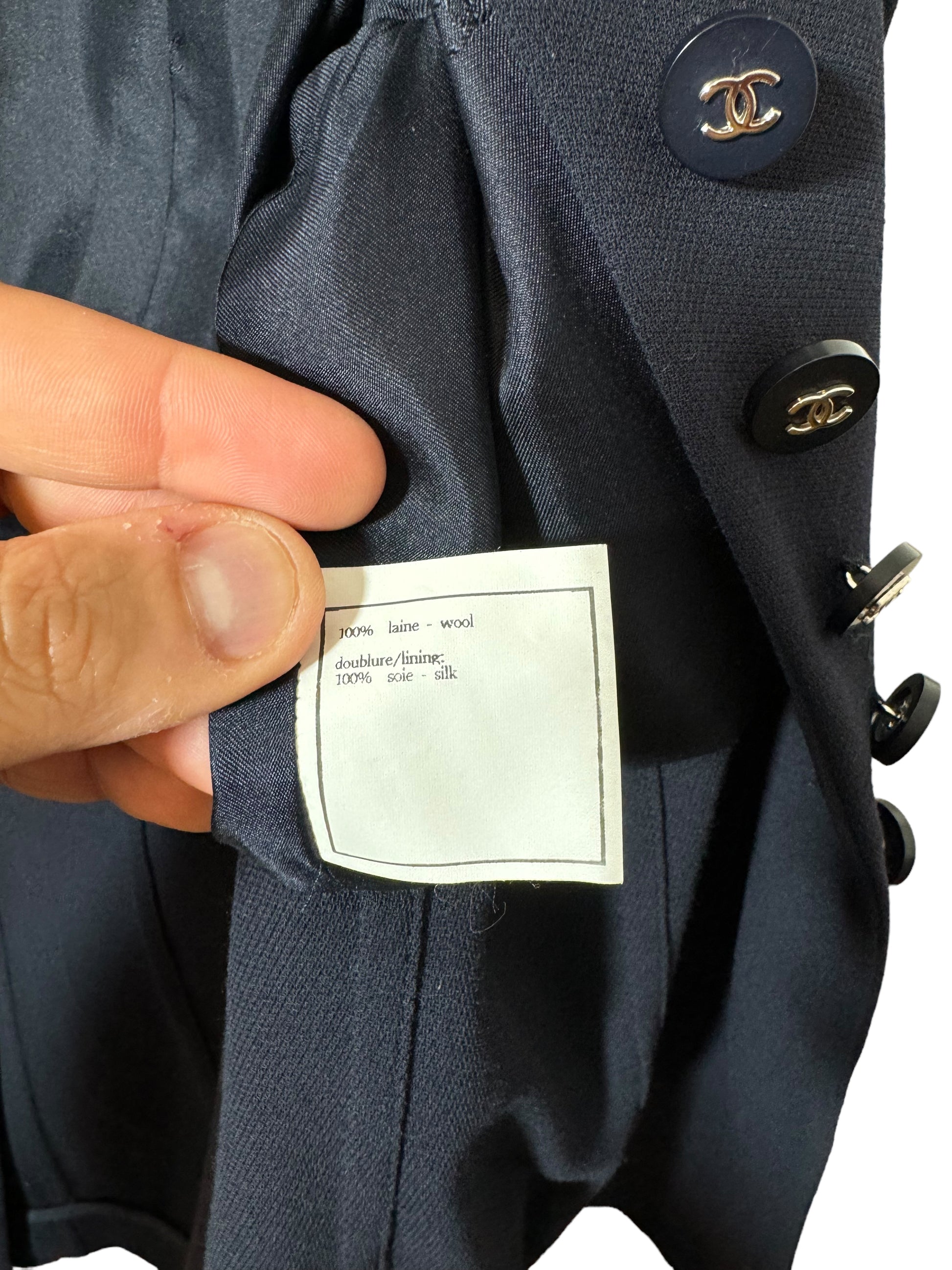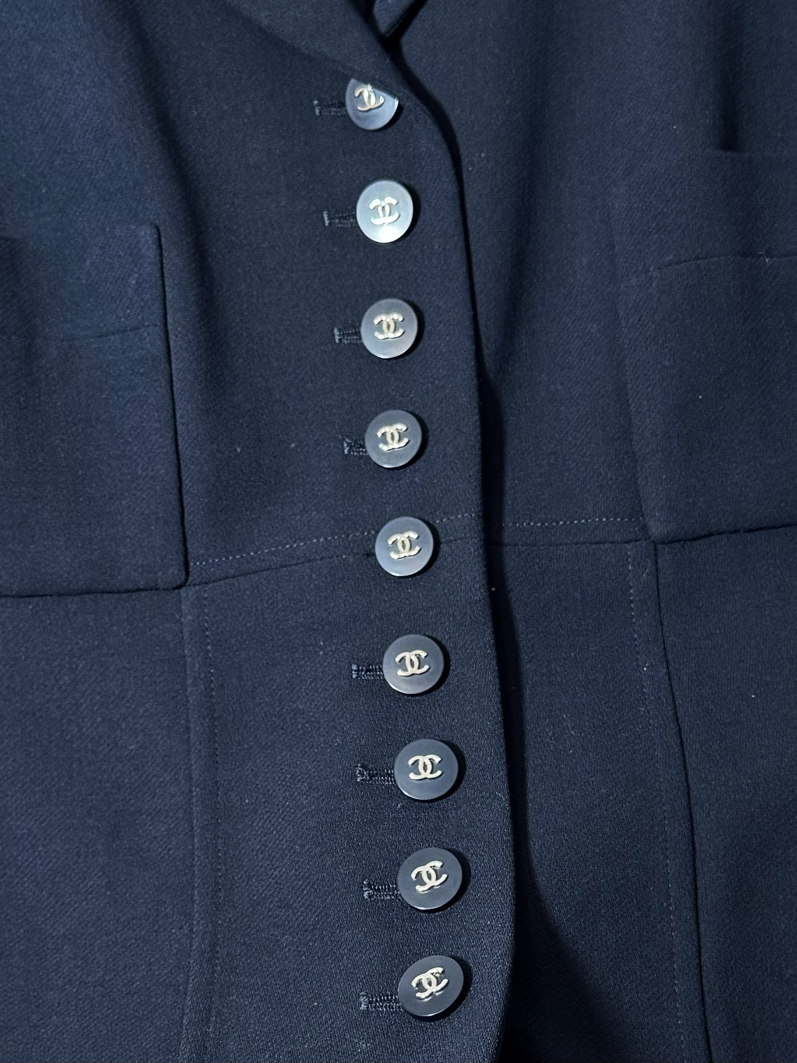 Chanel giacca vintage In lana blu e foderata in seta, con 4 tasche e una lunga fila di bottoni con logo CC sul davanti e sulle maniche. Taglia 44.