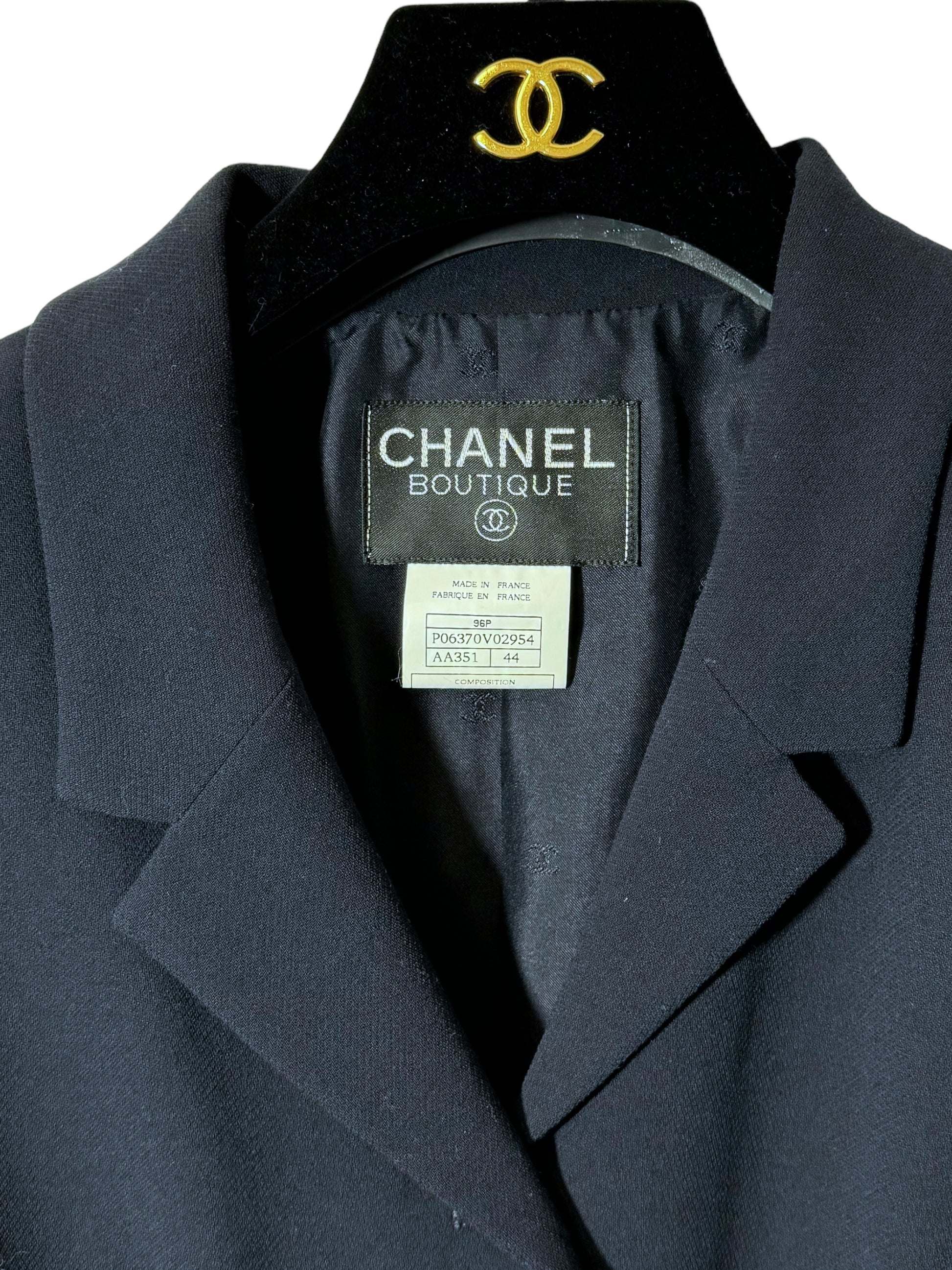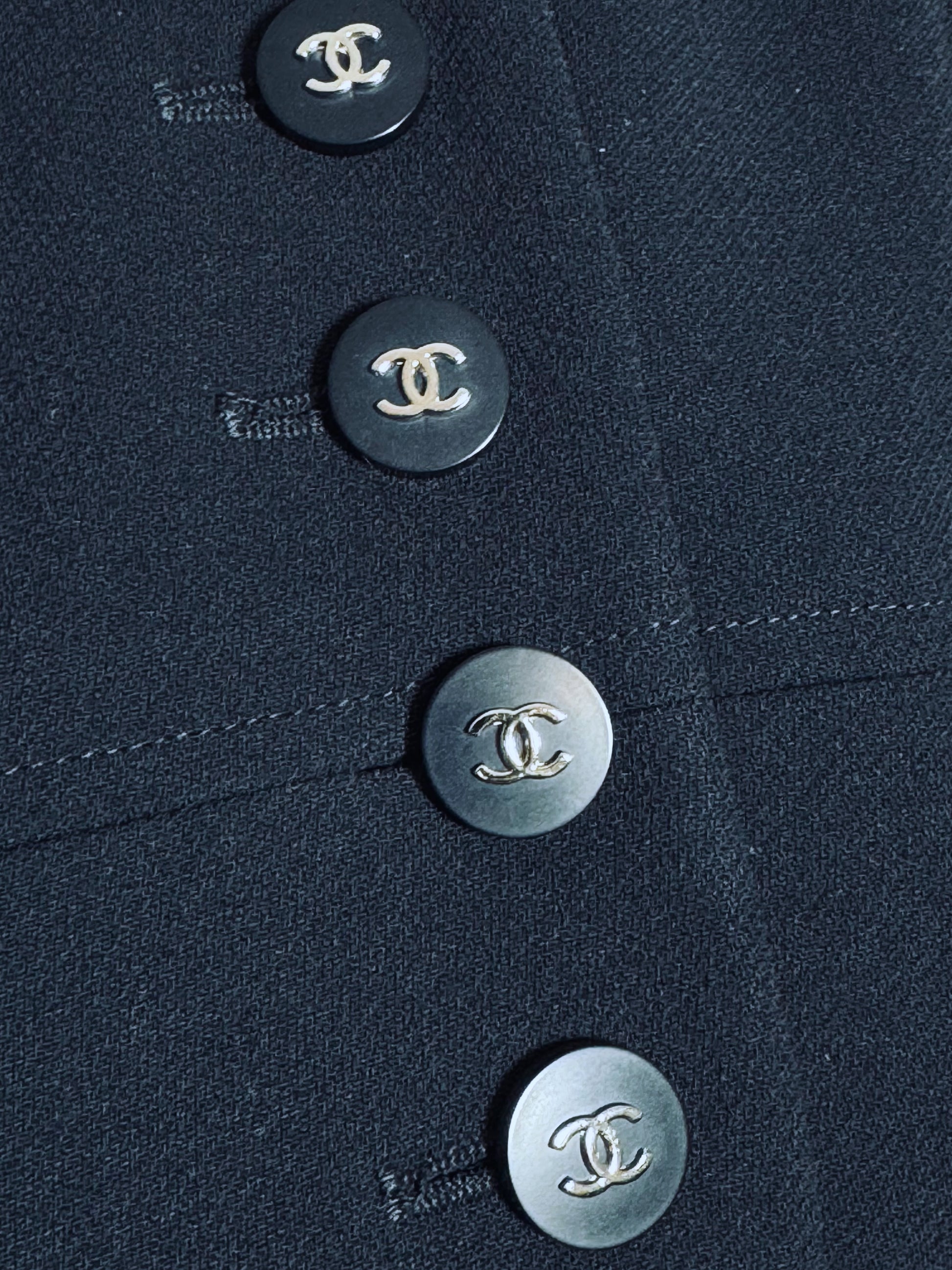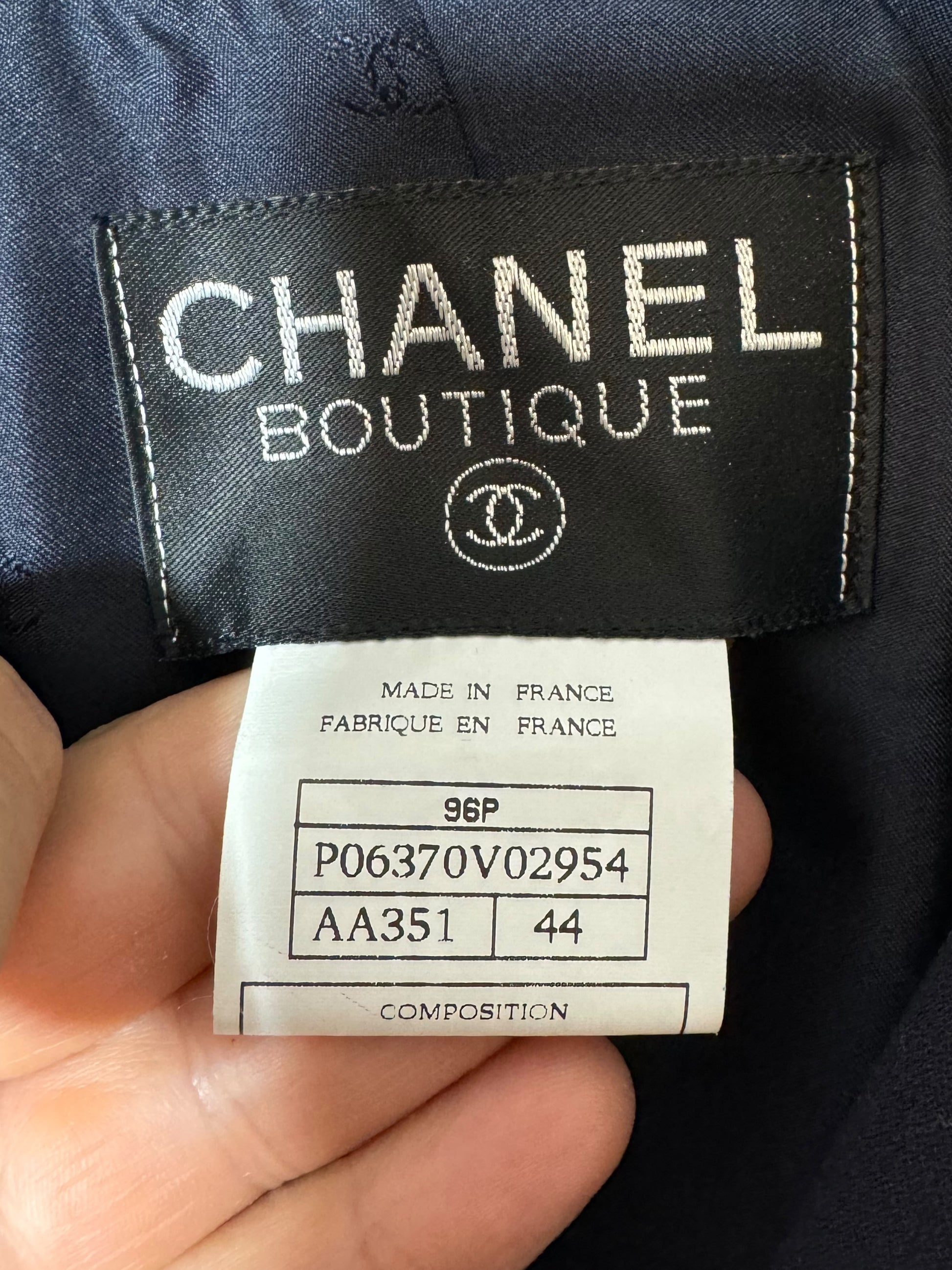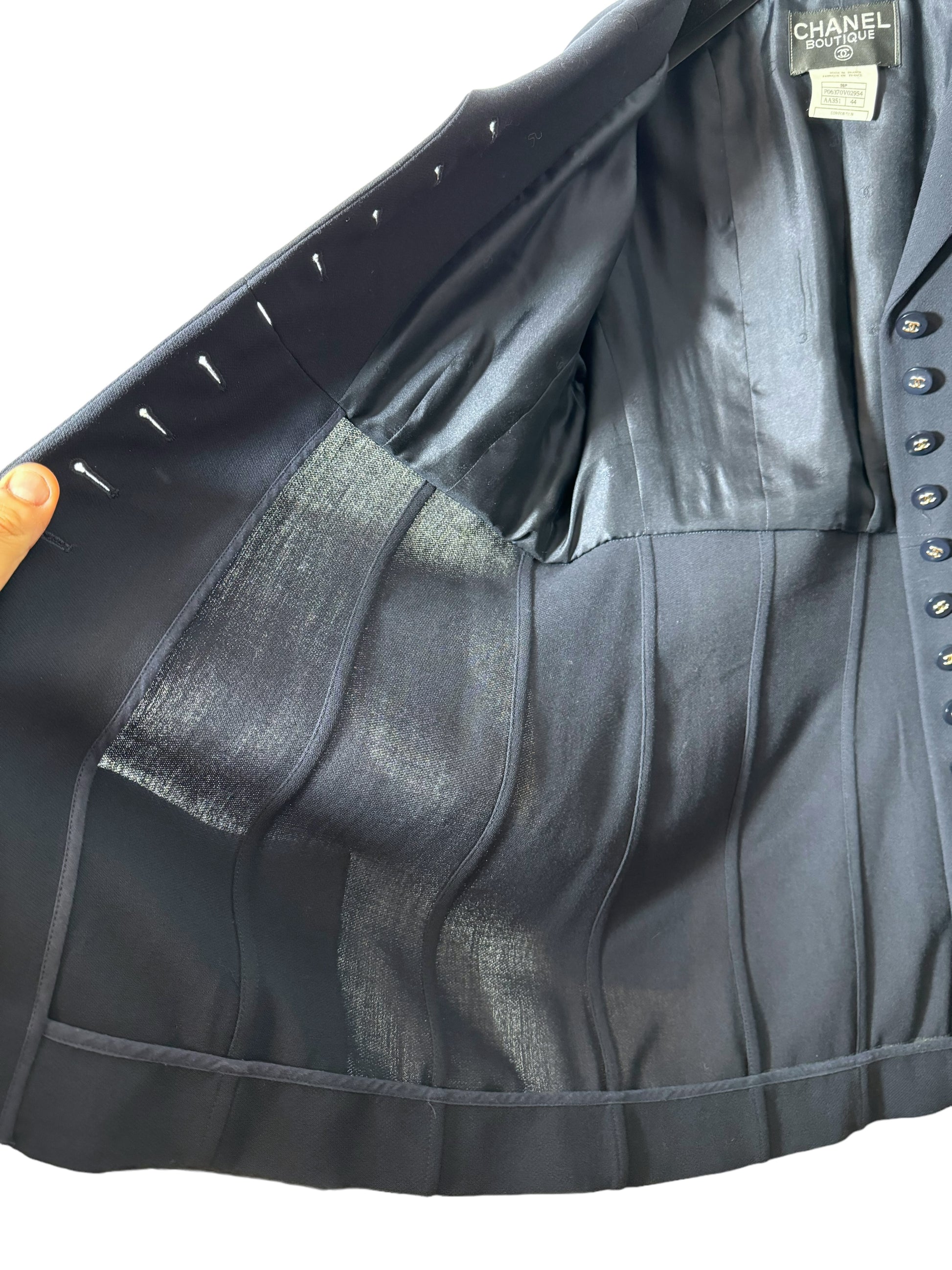 Chanel giacca vintage In lana blu e foderata in seta, con 4 tasche e una lunga fila di bottoni con logo CC sul davanti e sulle maniche. Taglia 44.