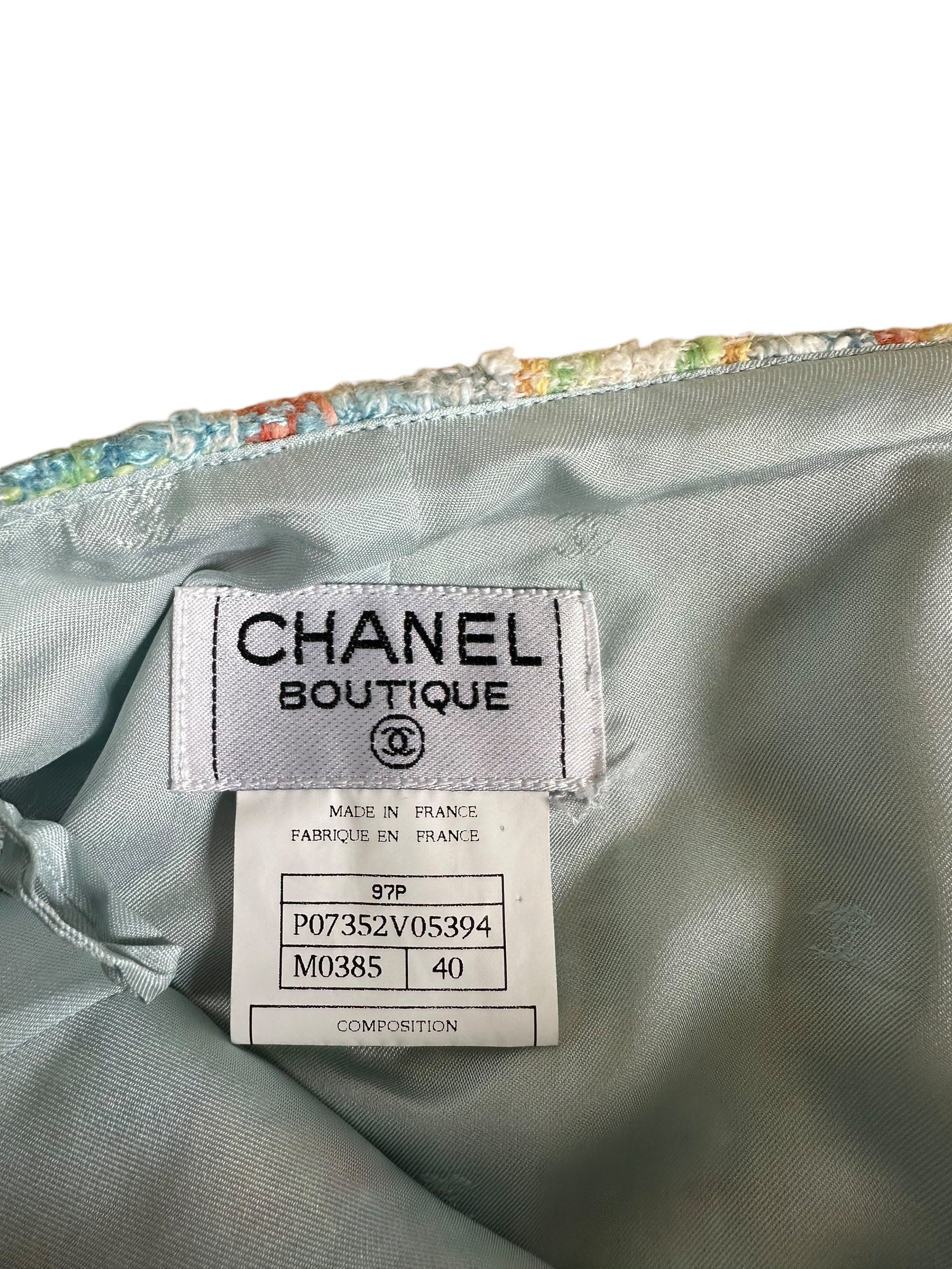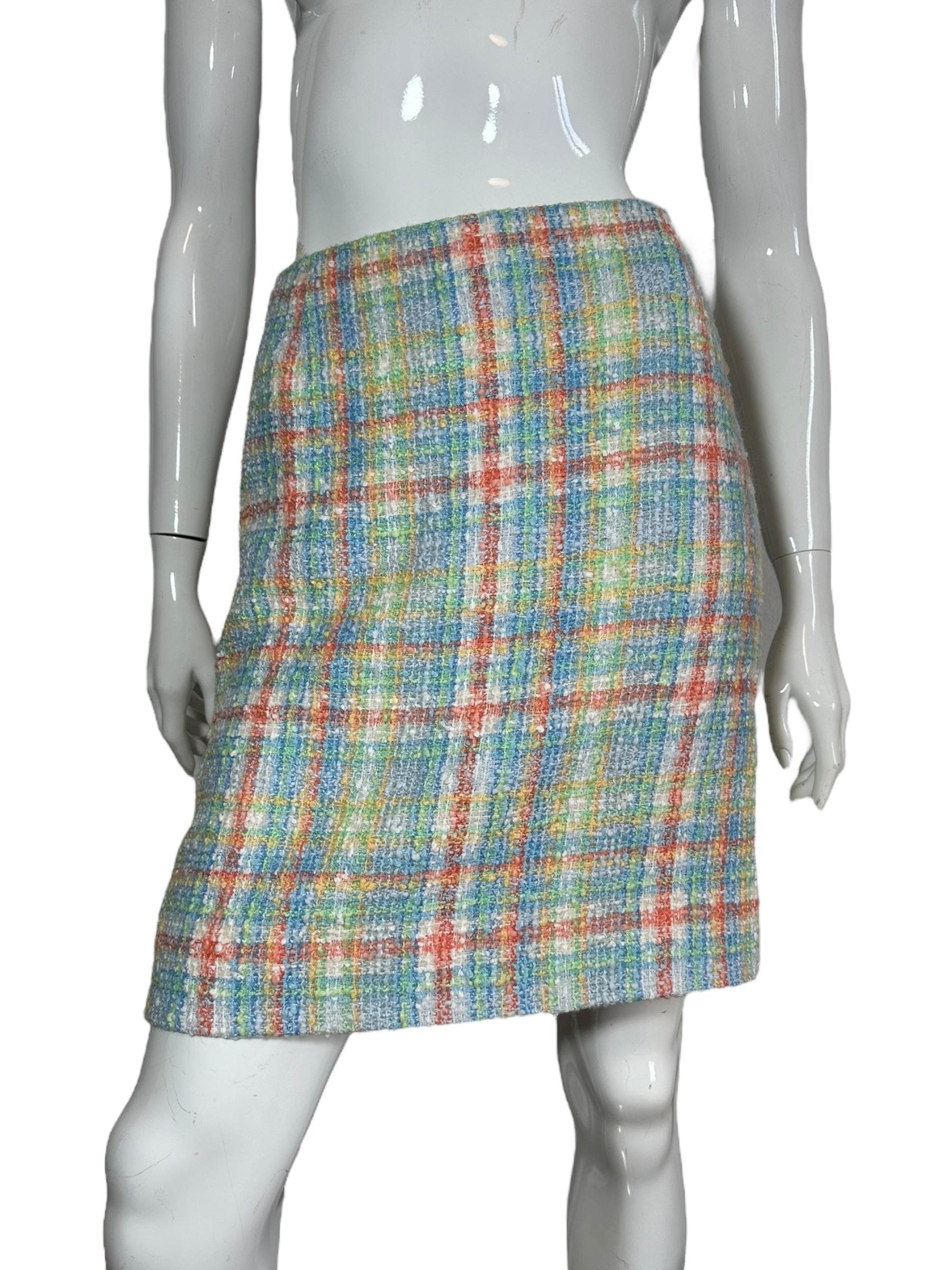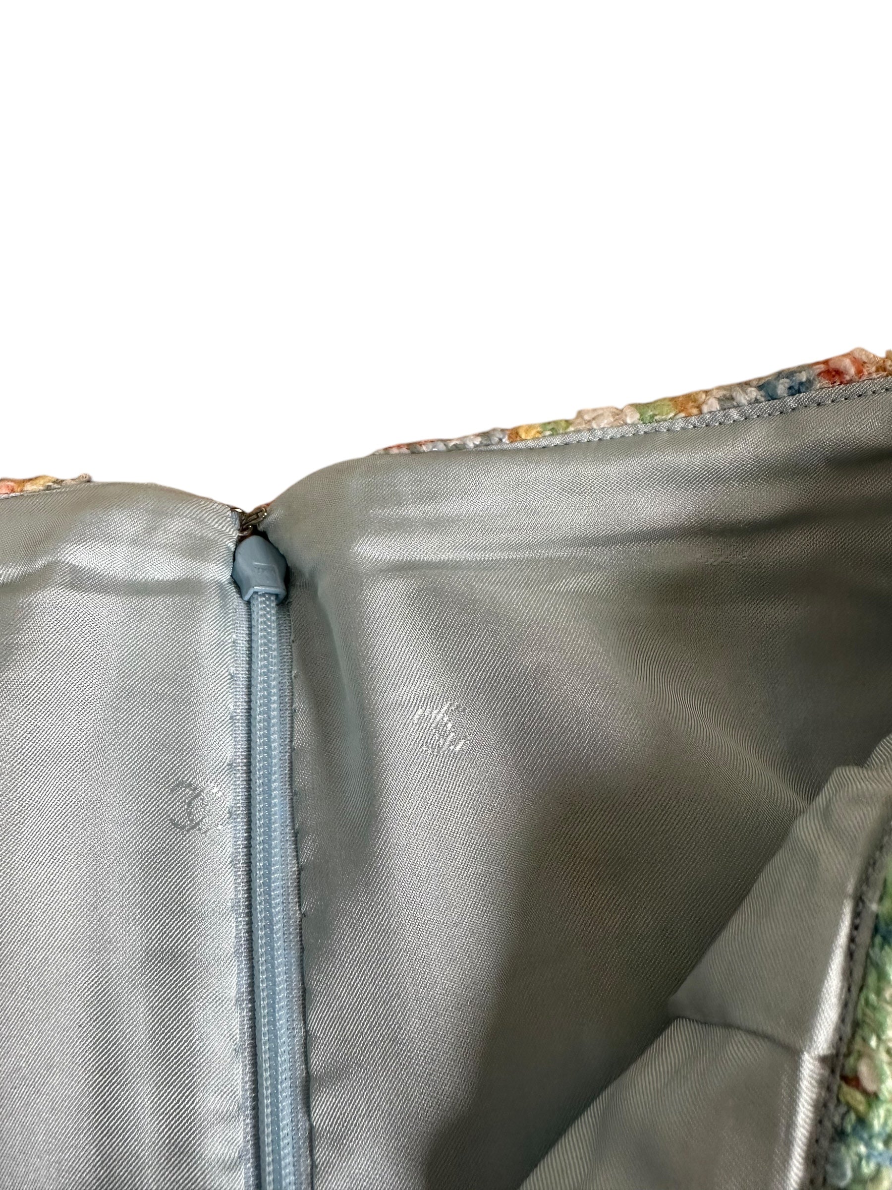 Chanel gonna vintage a vita alta in cotone, viscosa e lana bouclè multicolor con chiusura a zip sul retro e interno foderato in seta. Tg. 40 Francese
