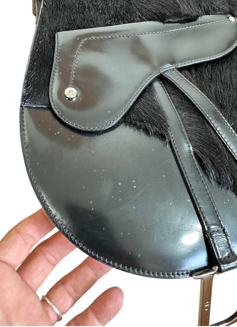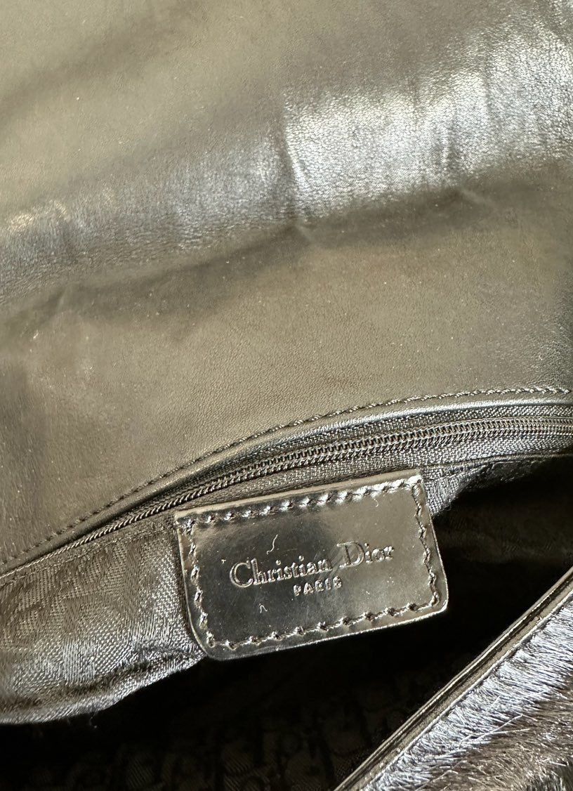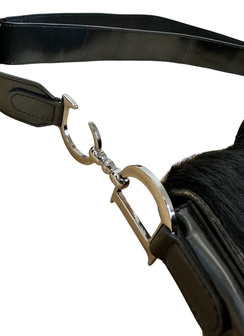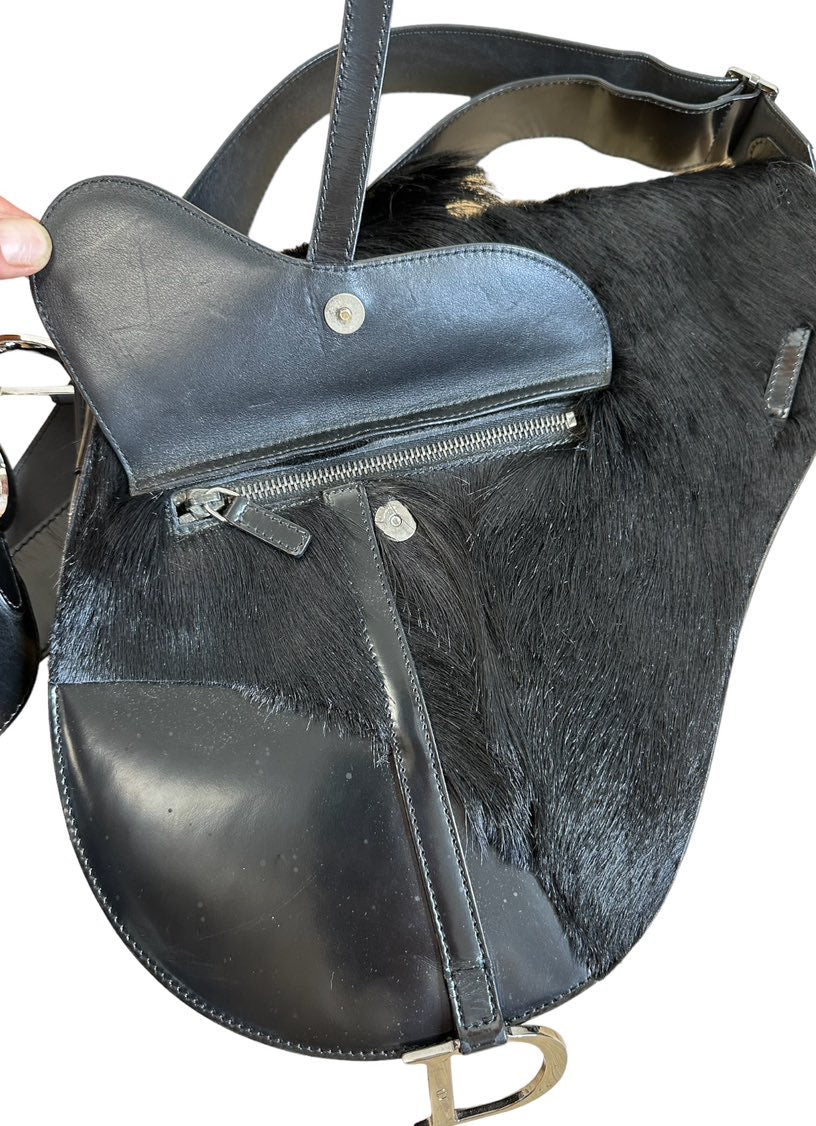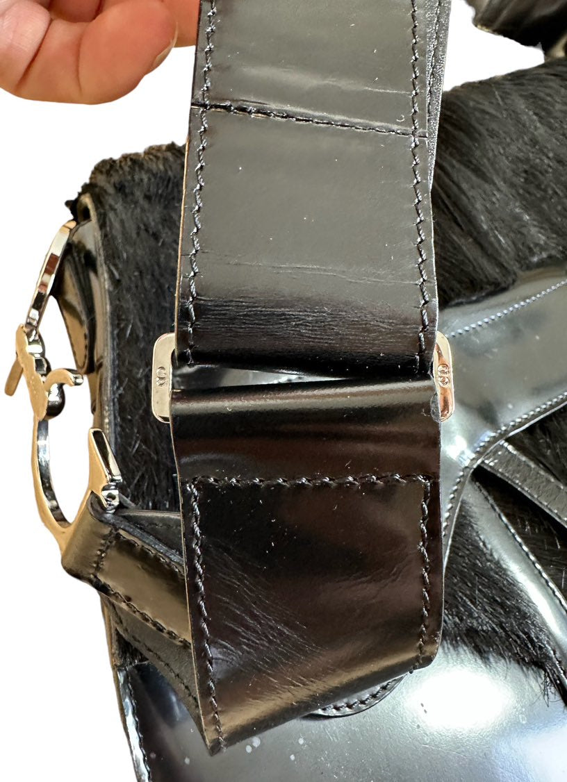 Christian Dior borsa vintage modello della in cavallino e pelle nera con tracolla regolabile, hardware in metallo argento. Dispone di un ampio spazio interno con taschino a zip. Taschino sul davanti. Presenta dei piccoli puntini poco visibili sulla pelle e in piccole segno sulla pelle all’altezza del logo pendente in metallo. Misura media. È possibile portarla anche a spalla.