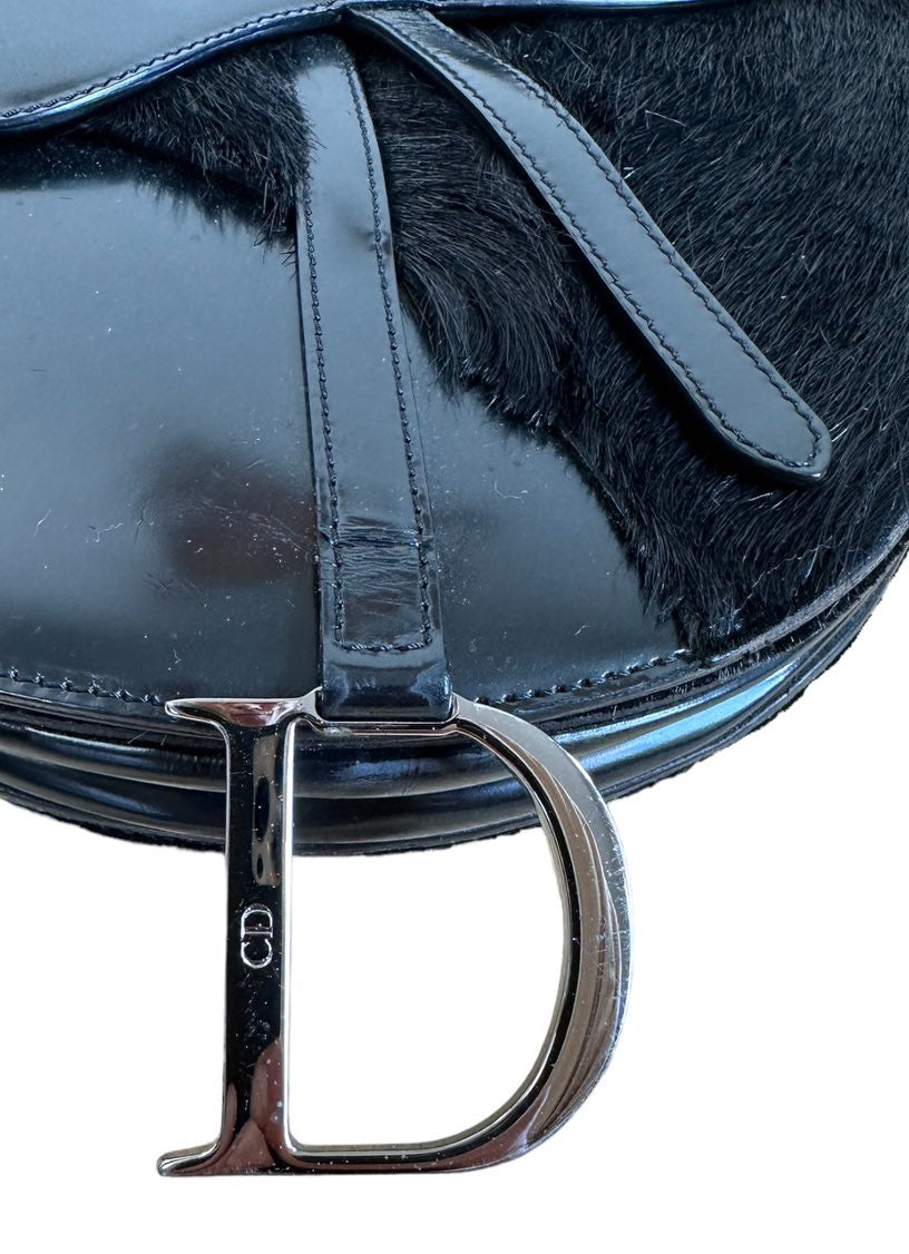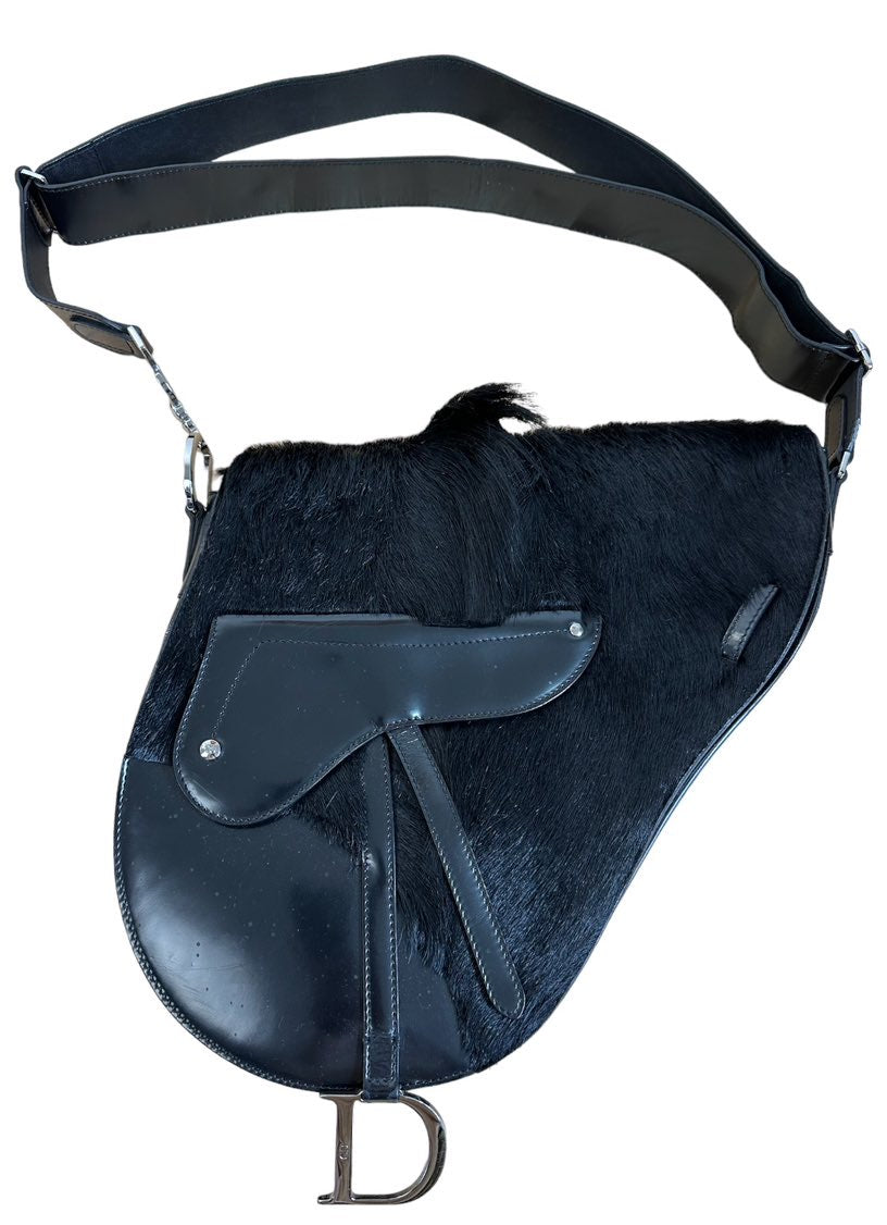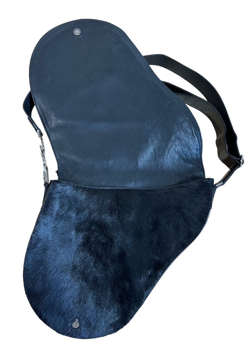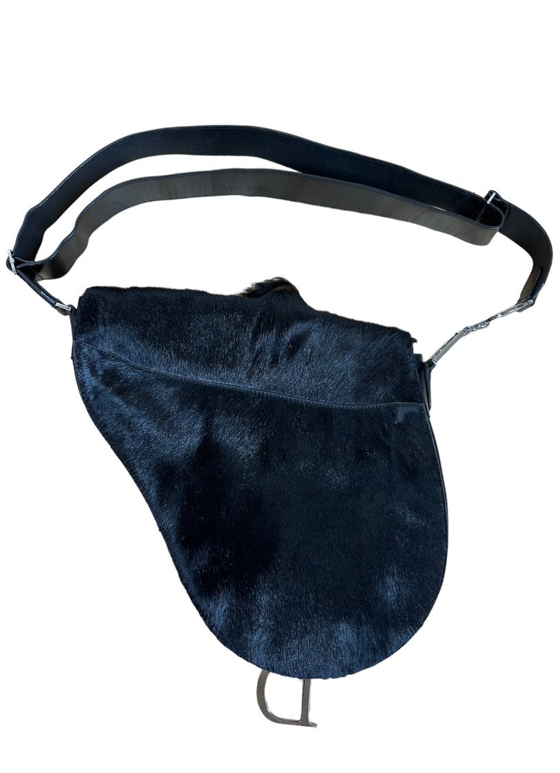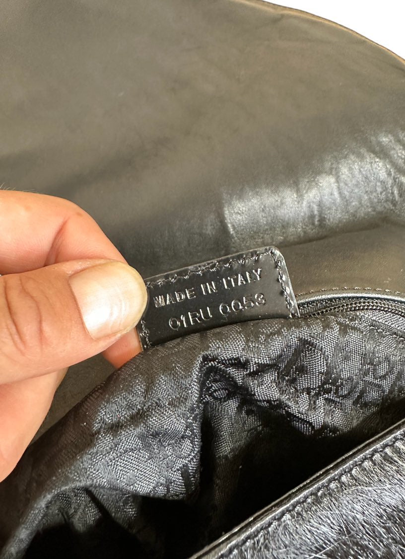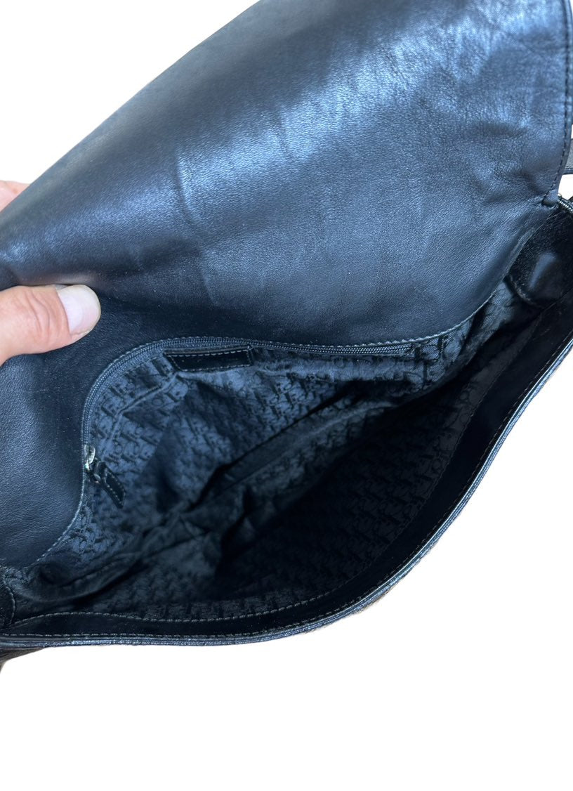 Christian Dior borsa vintage modello della in cavallino e pelle nera con tracolla regolabile, hardware in metallo argento. Dispone di un ampio spazio interno con taschino a zip. Taschino sul davanti. Presenta dei piccoli puntini poco visibili sulla pelle e in piccole segno sulla pelle all’altezza del logo pendente in metallo. Misura media. È possibile portarla anche a spalla.