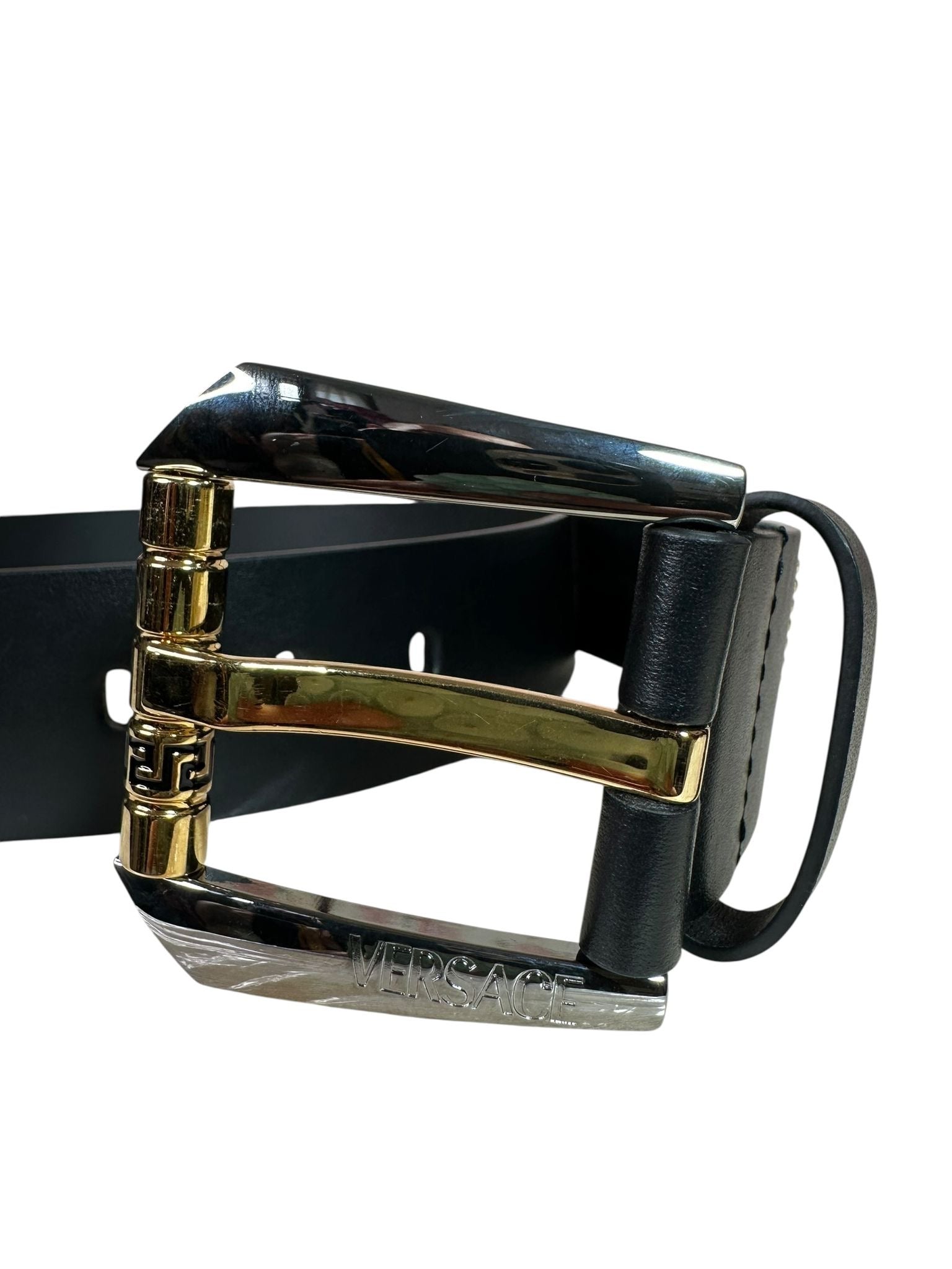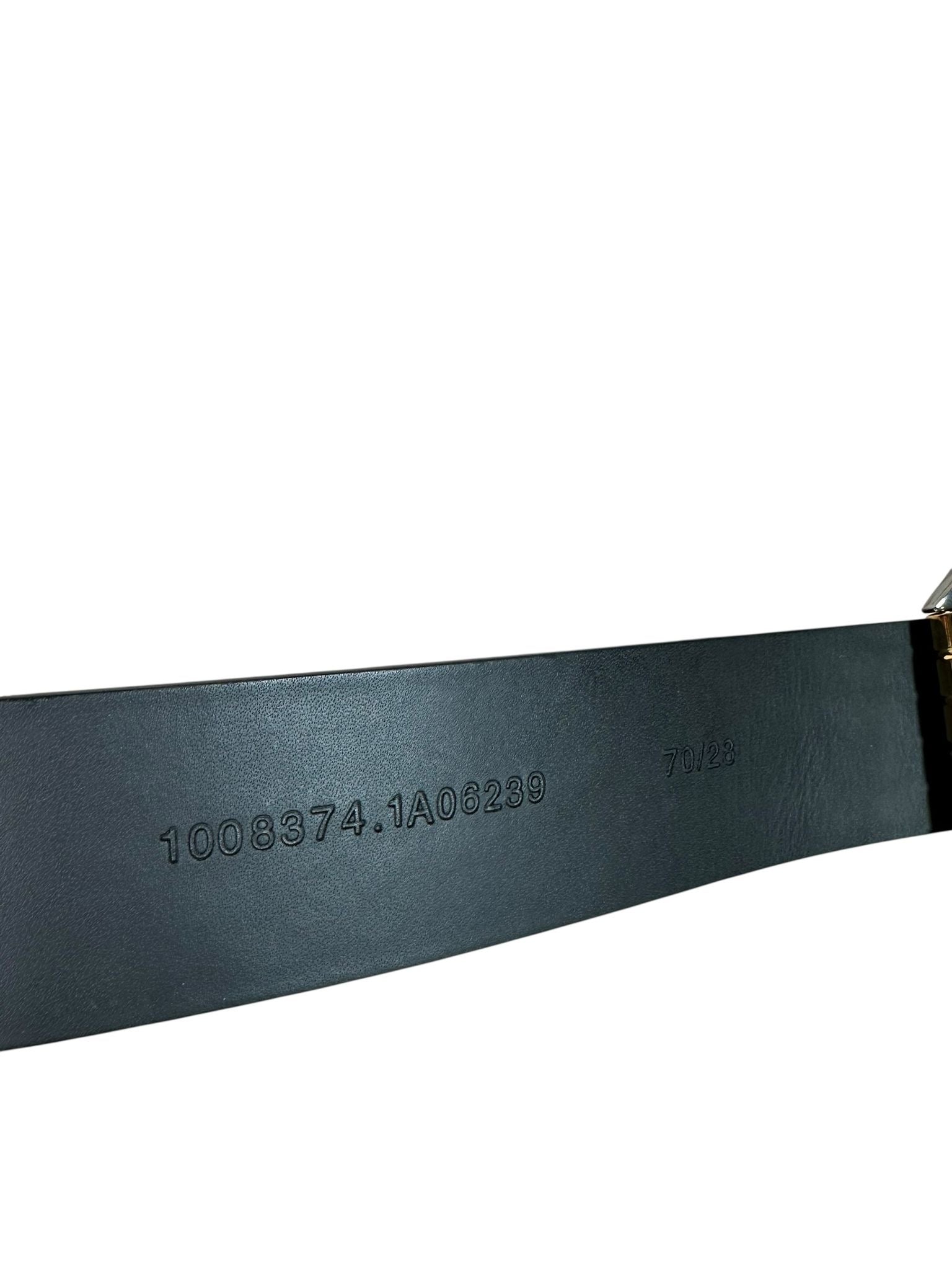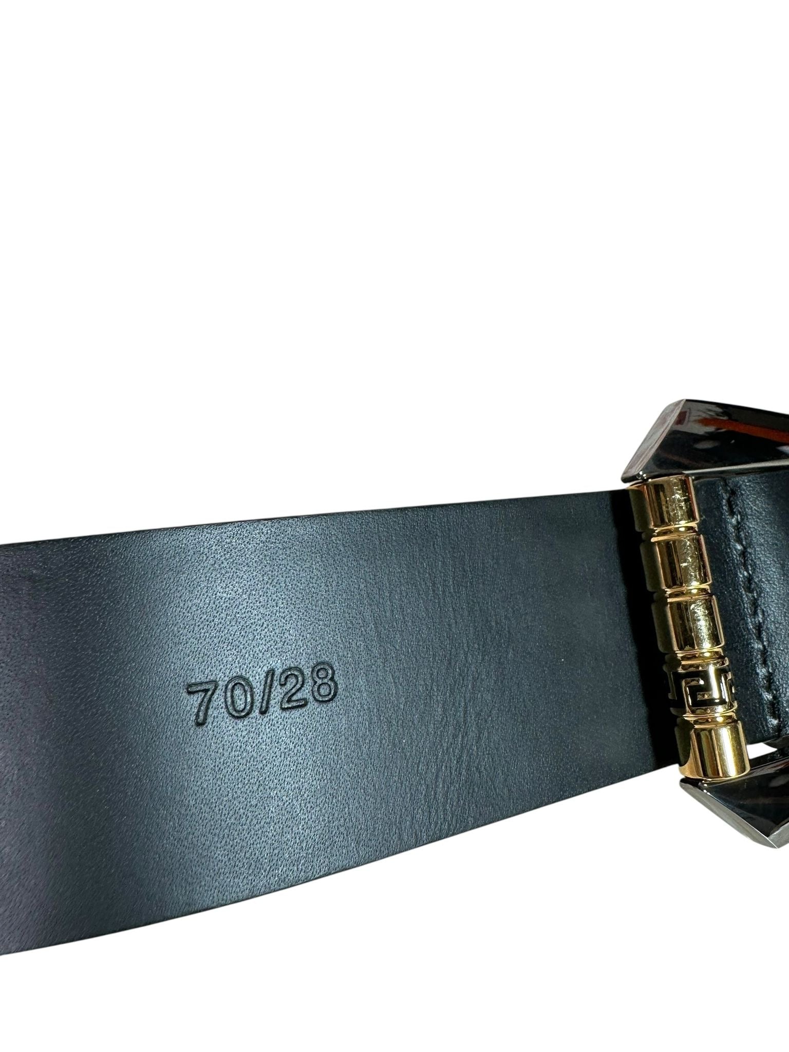 Cintura originale Versace in pelle nera, decorata frontalmente con l'iconico logo "VERSACE"