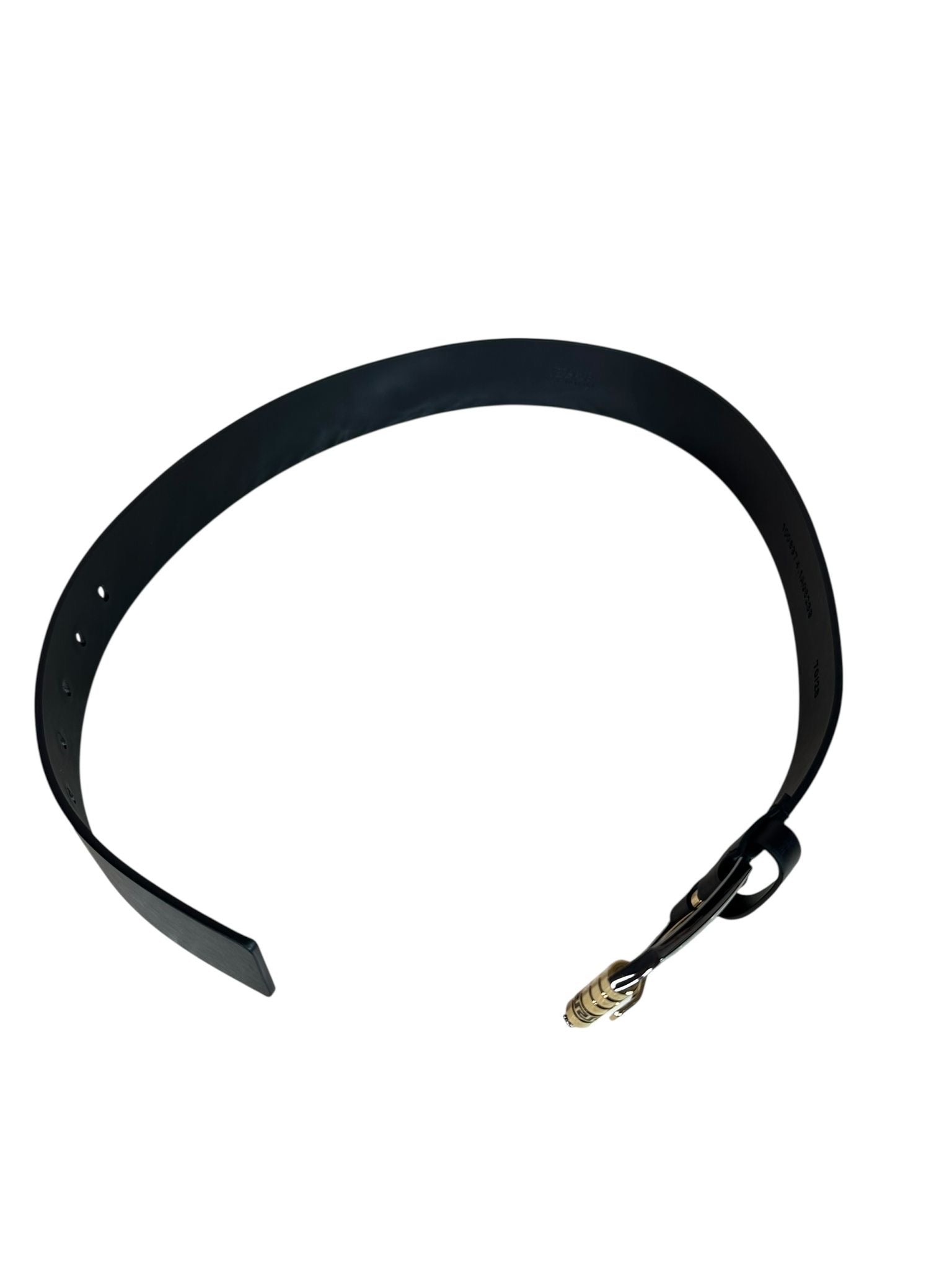 Fibbia in metallo dorato e nero con chiusura a vite, impreziosita da dettagli cilindrici in stile greco e logo inciso.