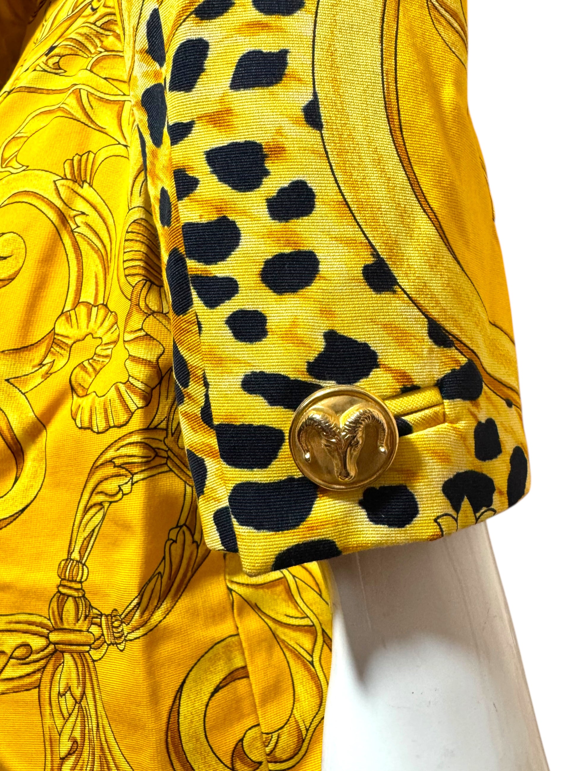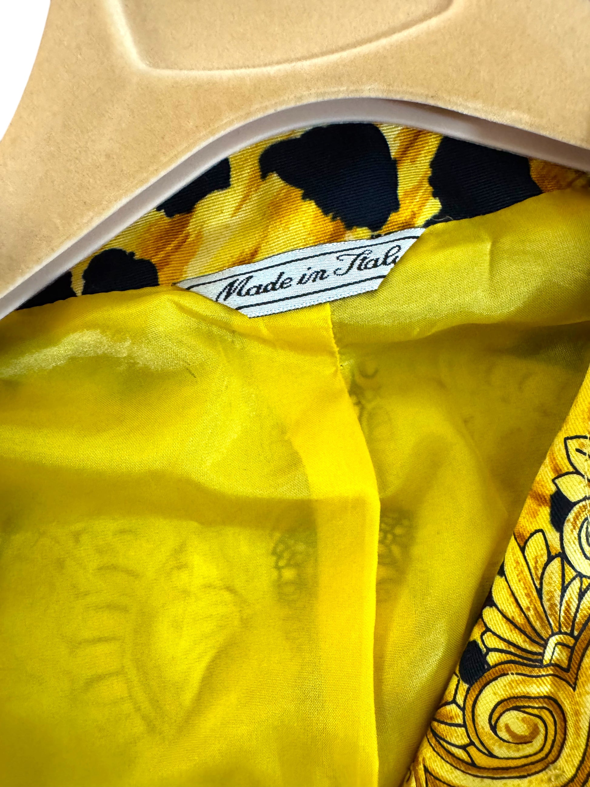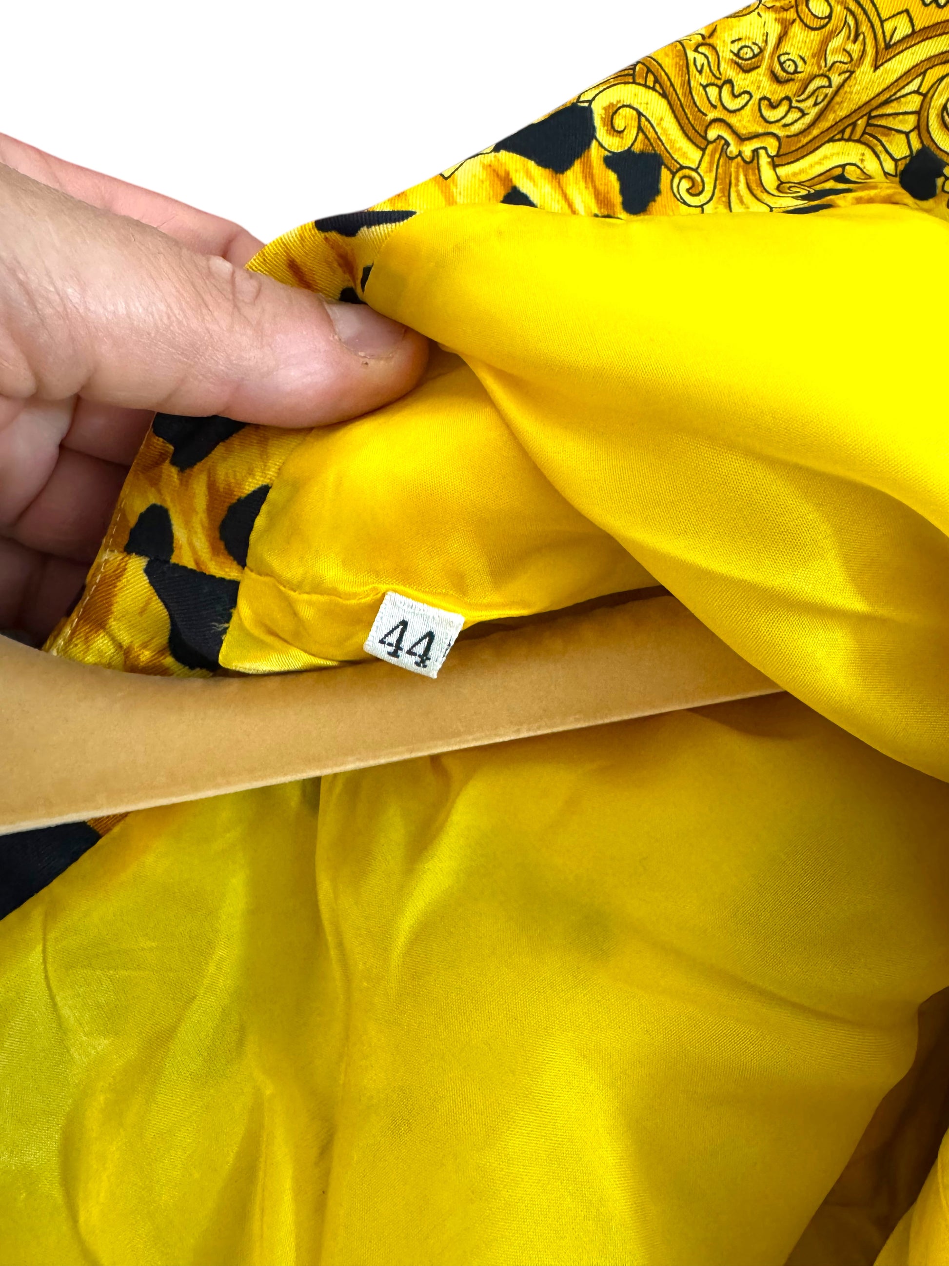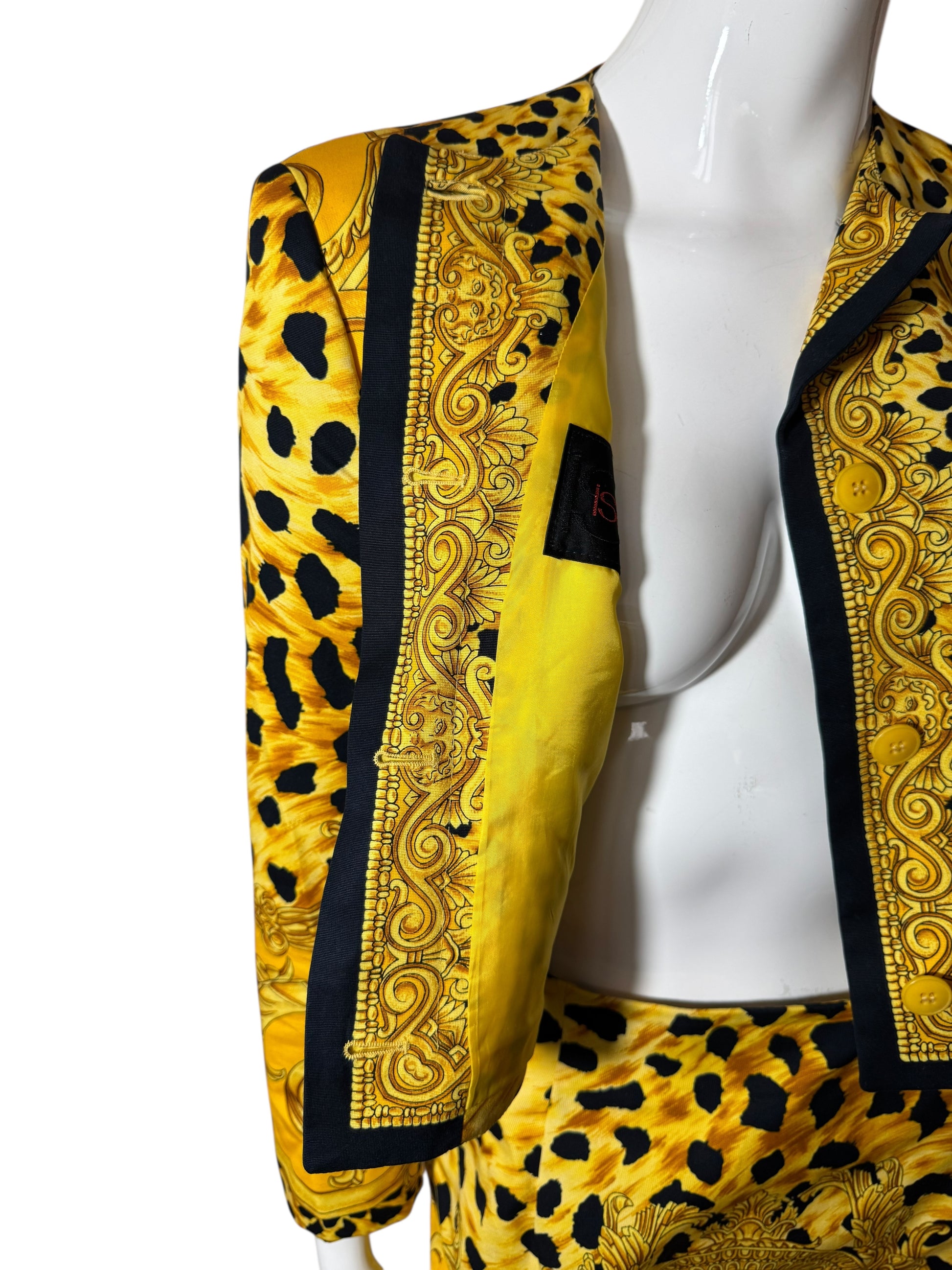 Raro completo vintage anni ‘90 firmato Istante by Gianni Versace, composto da giacca strutturata e gonna coordinata. Caratterizzato dall’iconica stampa barocca oro con motivi animalier su fondo giallo, tipica dell’estetica opulenta di Versace. Bottoni dorati decorati con testa d’ariete, fodera interna gialla lucida e manifattura Made in Italy.