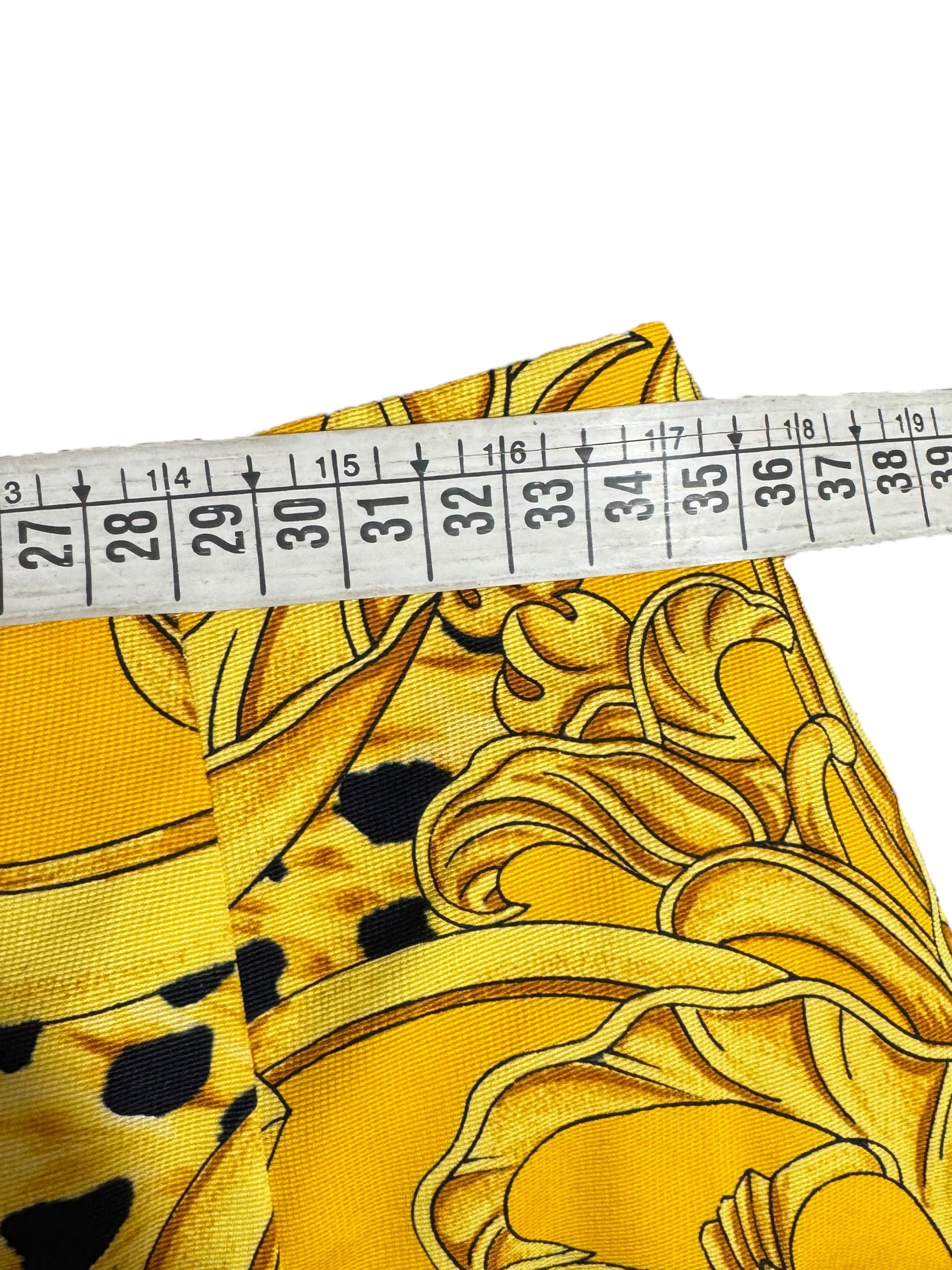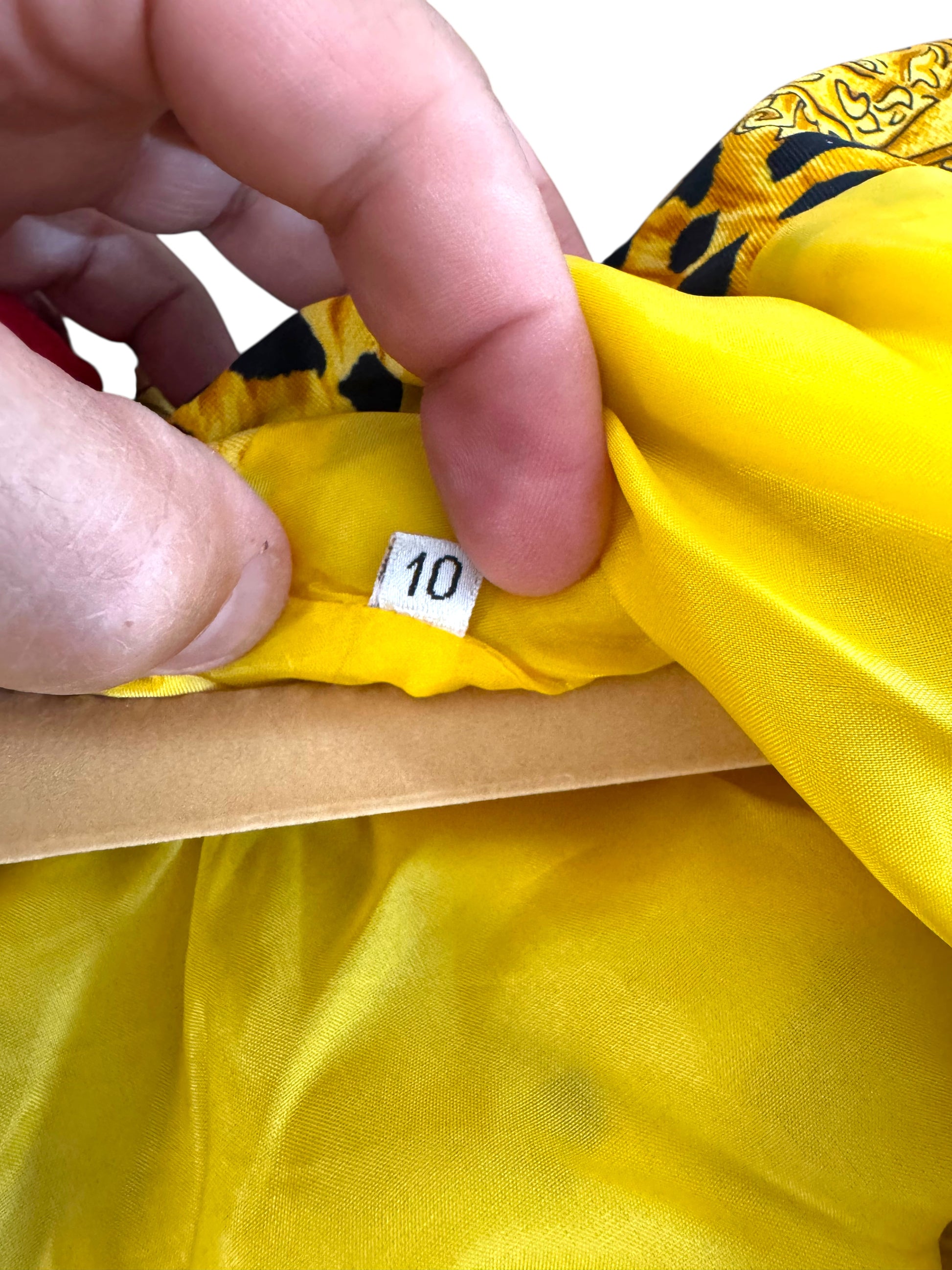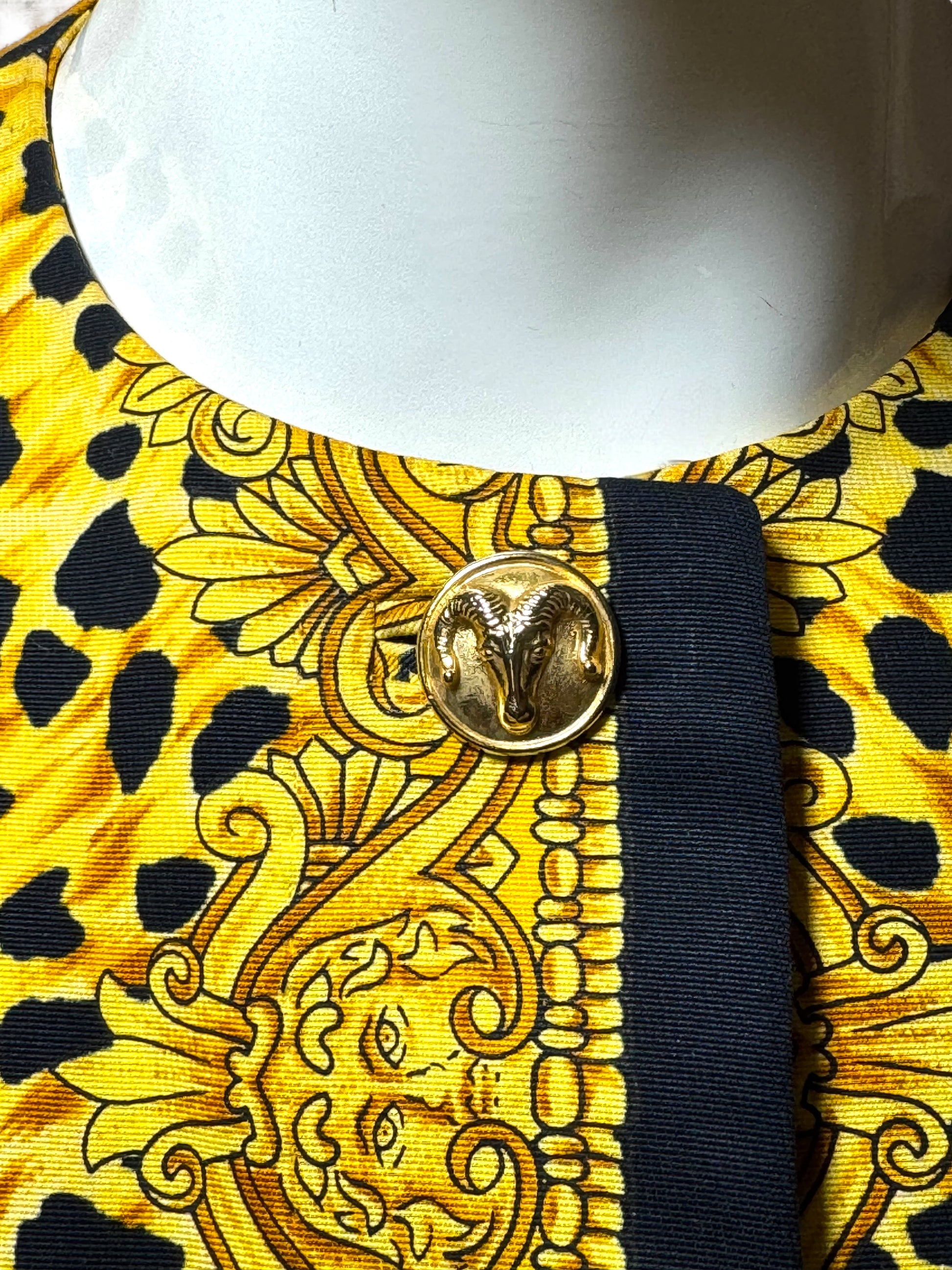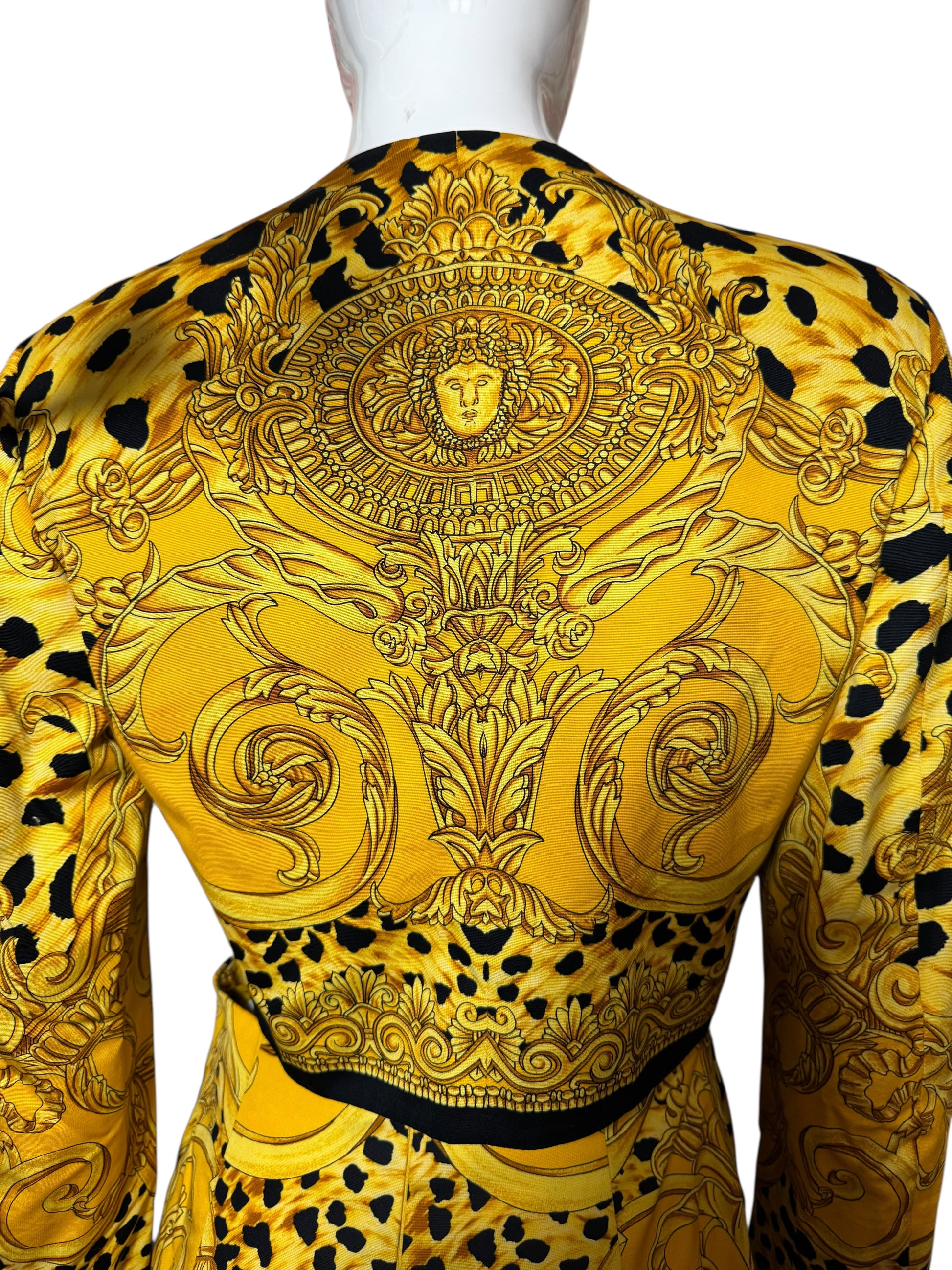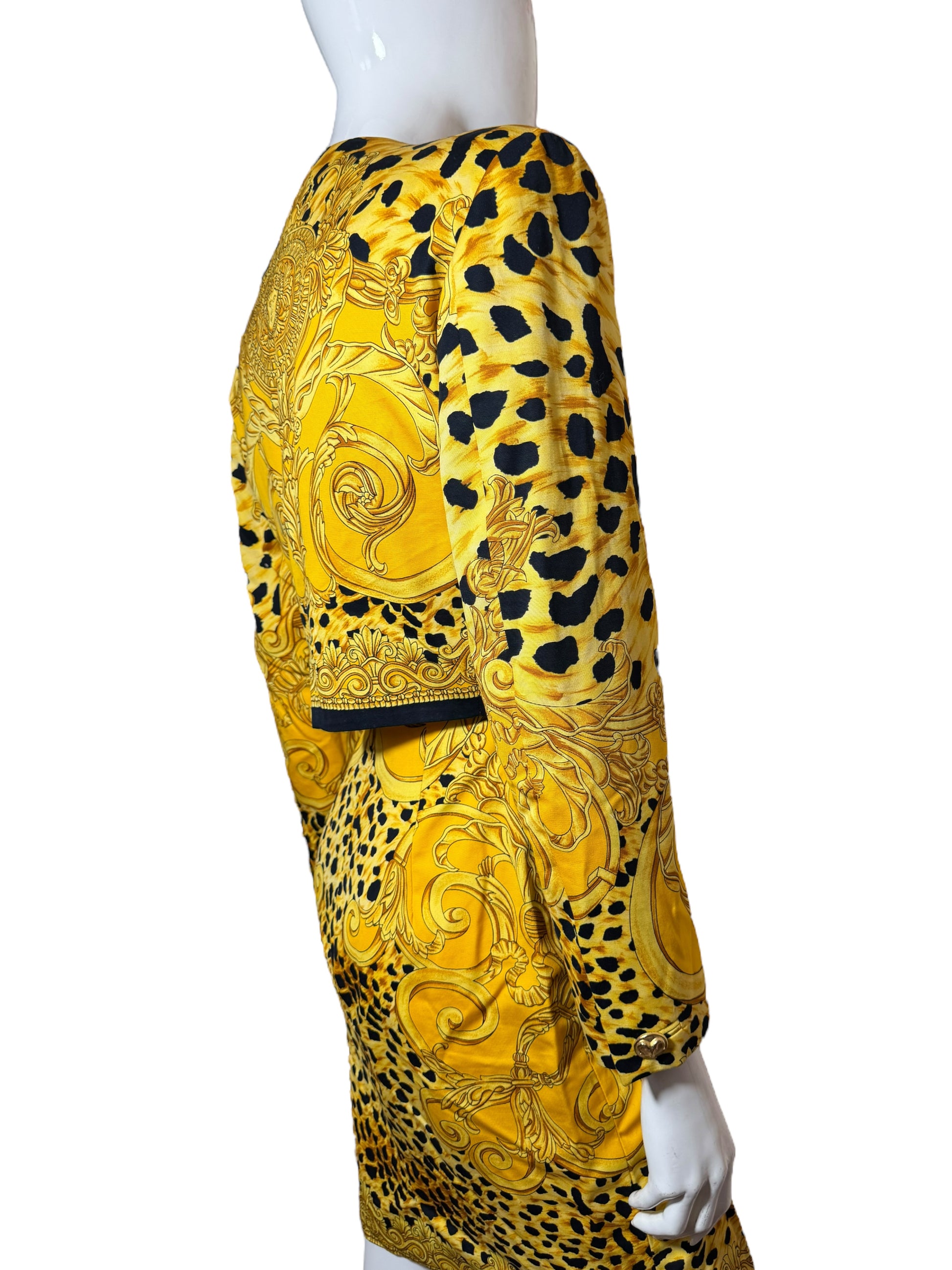 Raro completo vintage anni ‘90 firmato Istante by Gianni Versace, composto da giacca strutturata e gonna coordinata. Caratterizzato dall’iconica stampa barocca oro con motivi animalier su fondo giallo, tipica dell’estetica opulenta di Versace. Bottoni dorati decorati con testa d’ariete, fodera interna gialla lucida e manifattura Made in Italy.