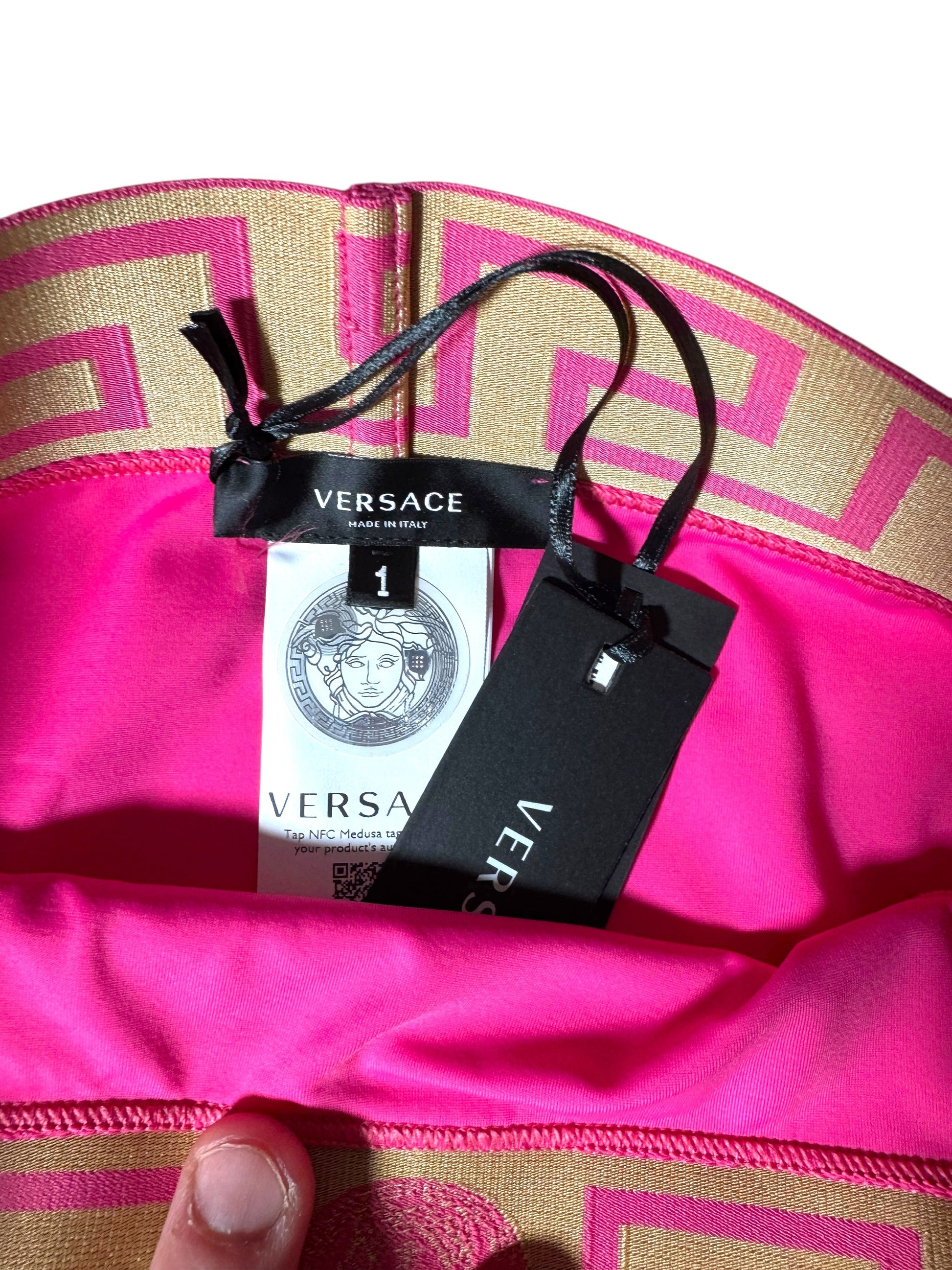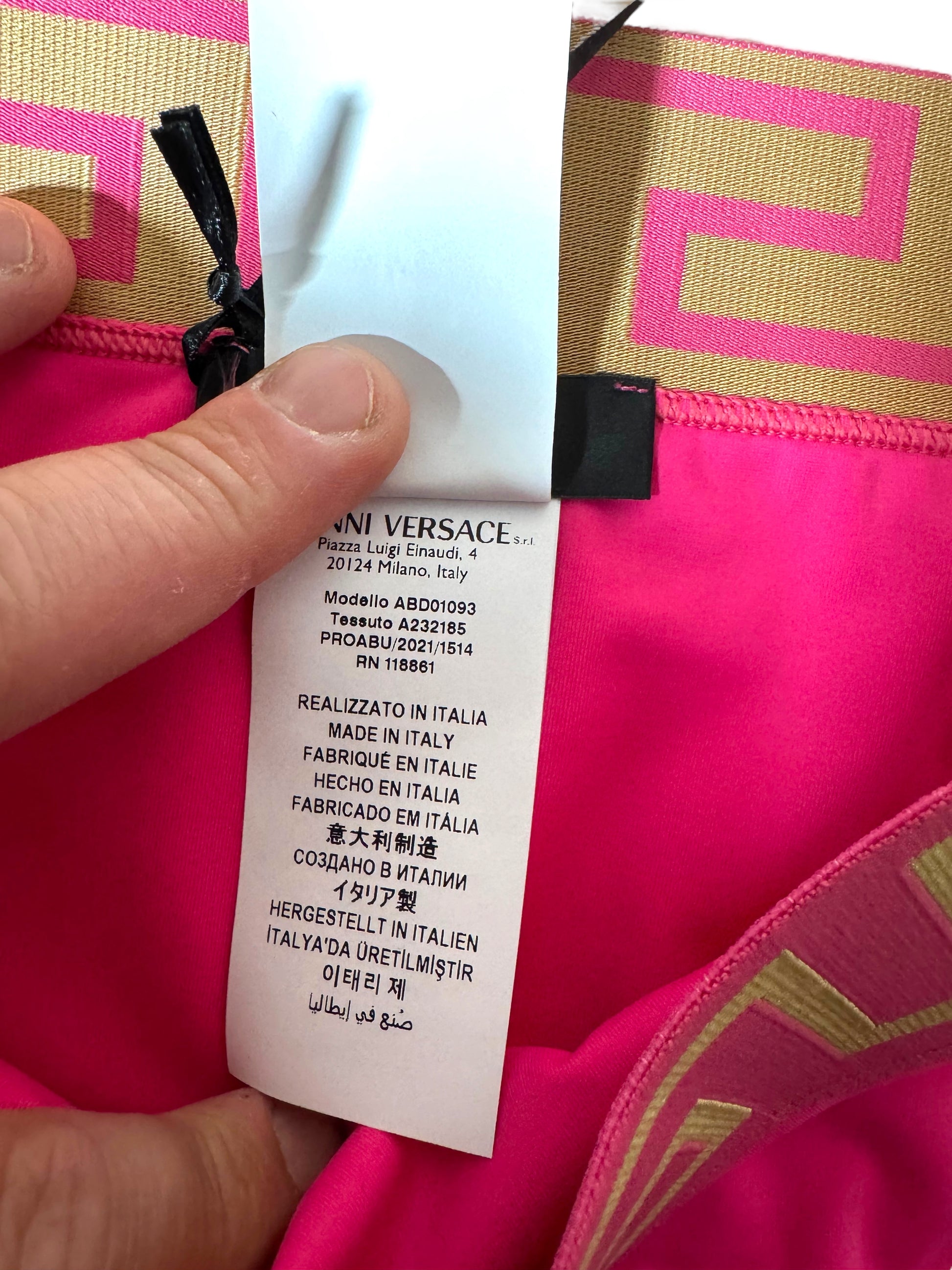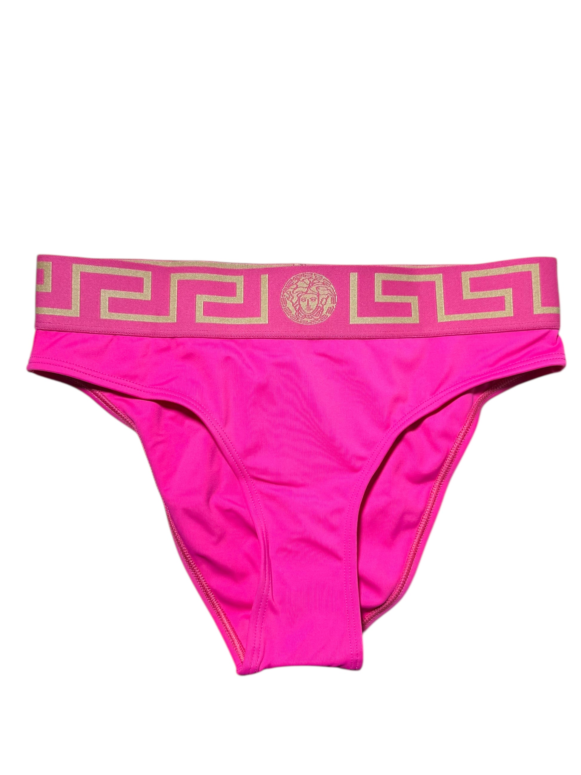 Costume da bagno donna VERSACE fucsia – Slip con fascia Greca dorata – Taglia 1