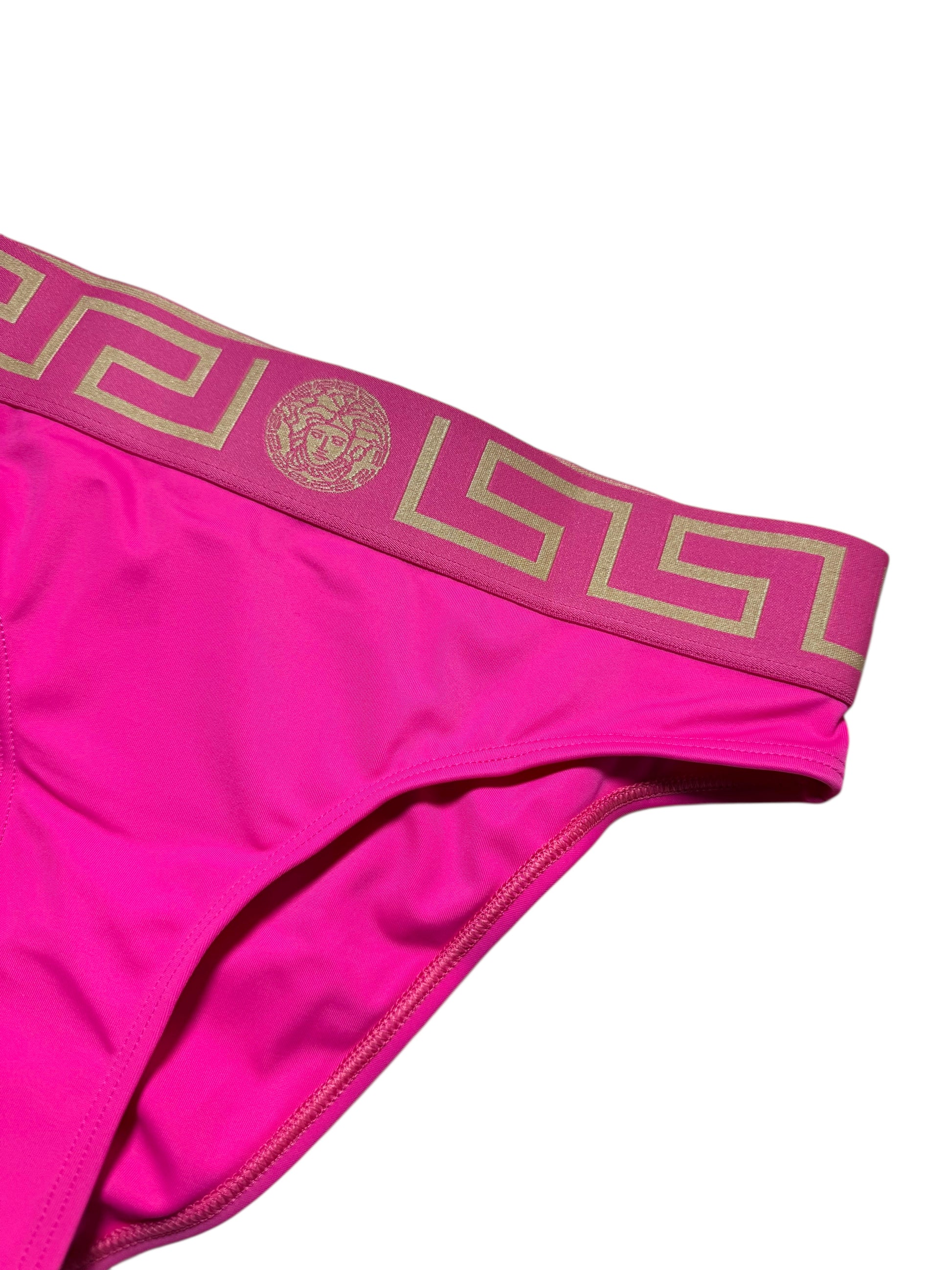 Slip da bagno donna firmato VERSACE, in vivace colore fucsia con l’iconica fascia elastica decorata dal motivo Greca dorato e Medusa centrale tono su tono. Taglia 1. Un modello esclusivo realizzato in Italia, ideale per chi desidera distinguersi con eleganza e stile anche in spiaggia o in piscina.