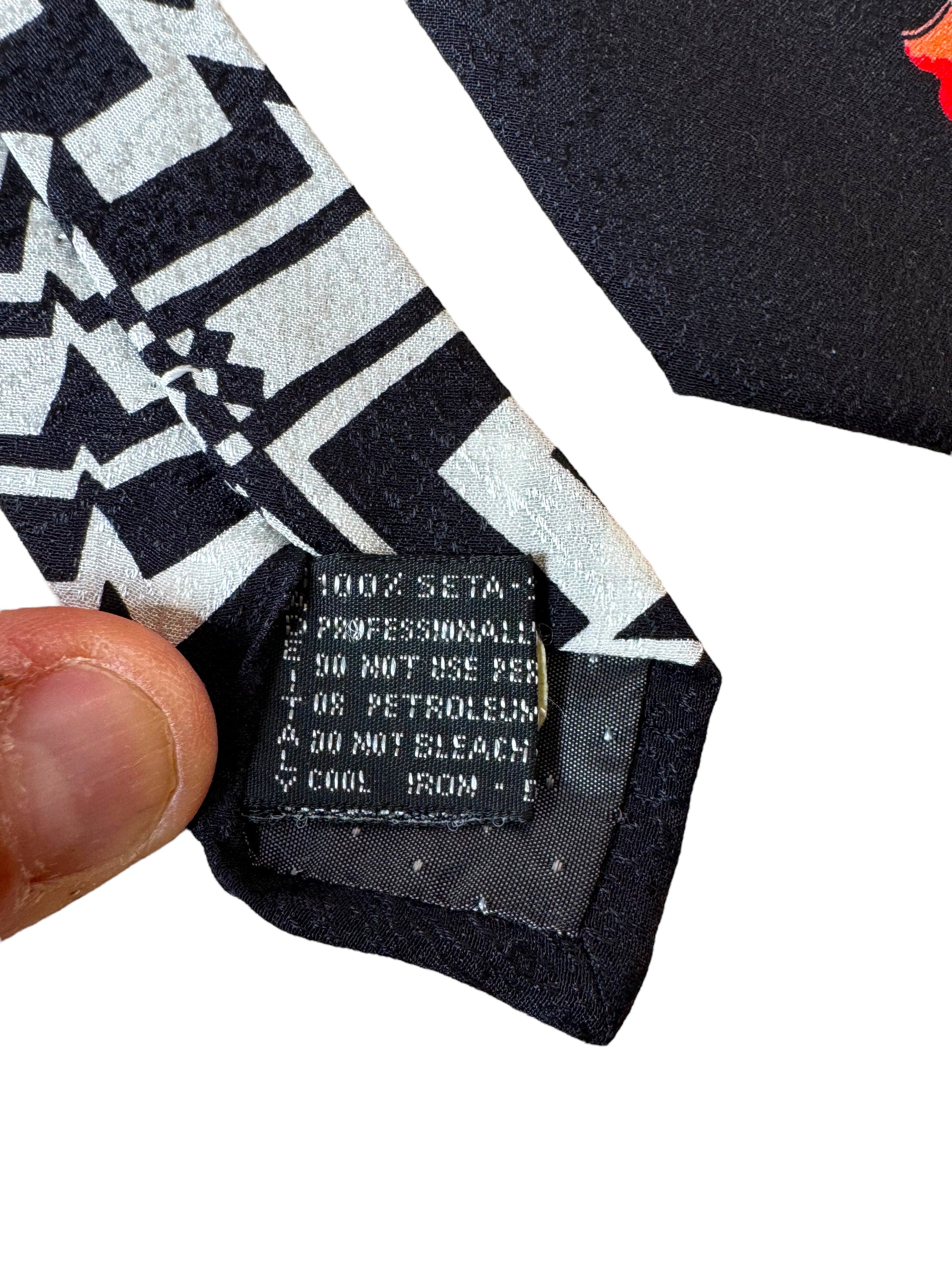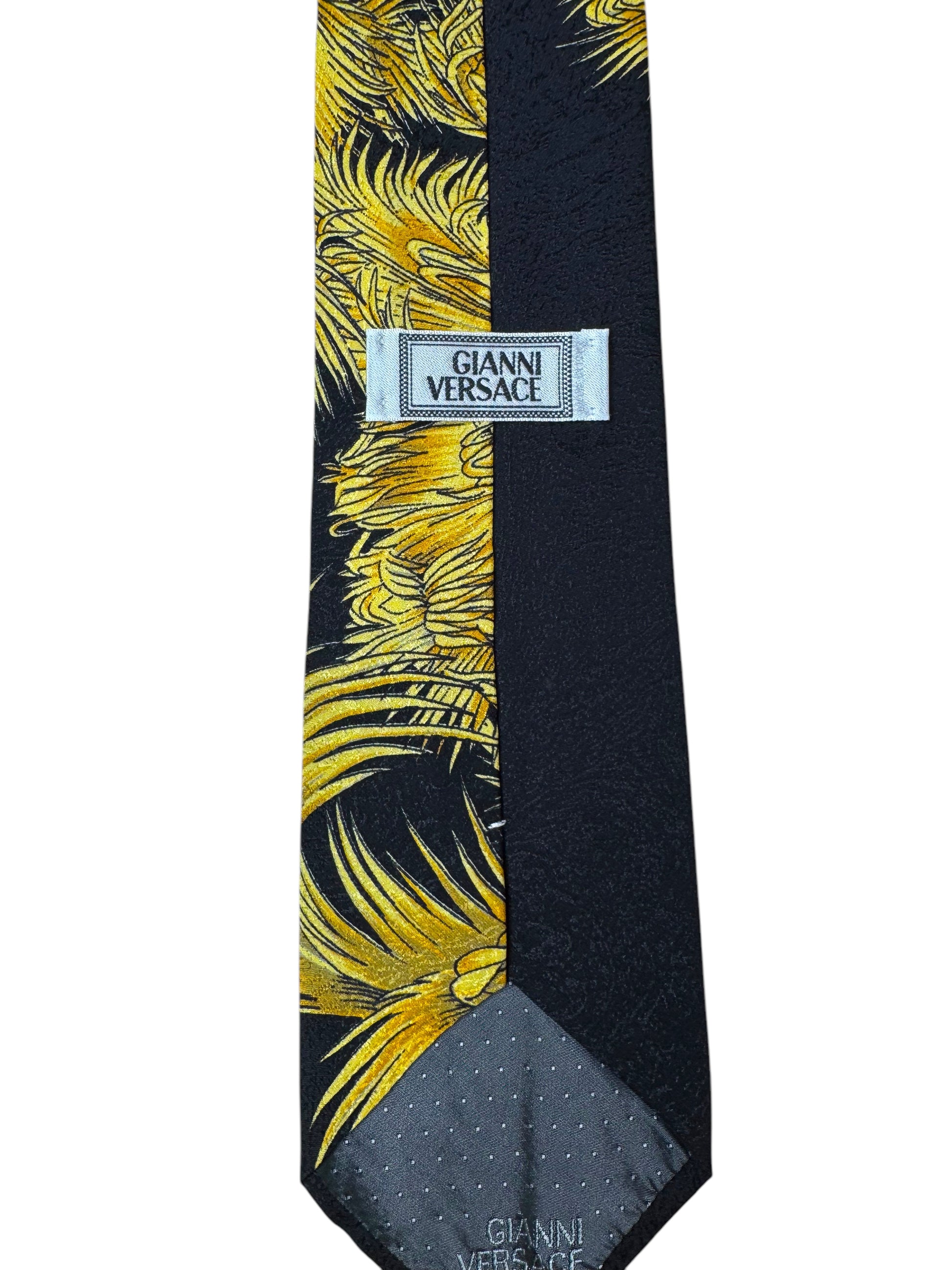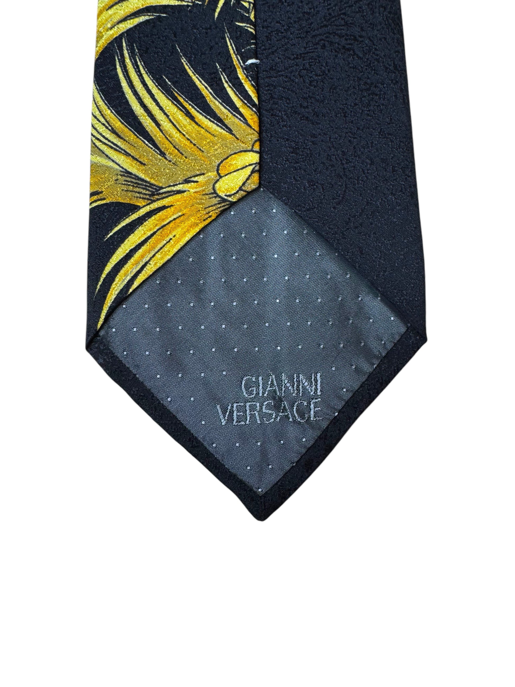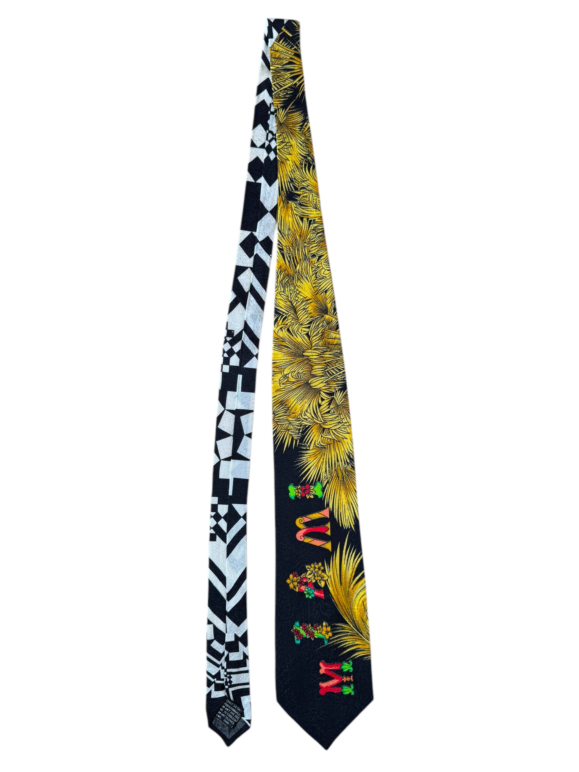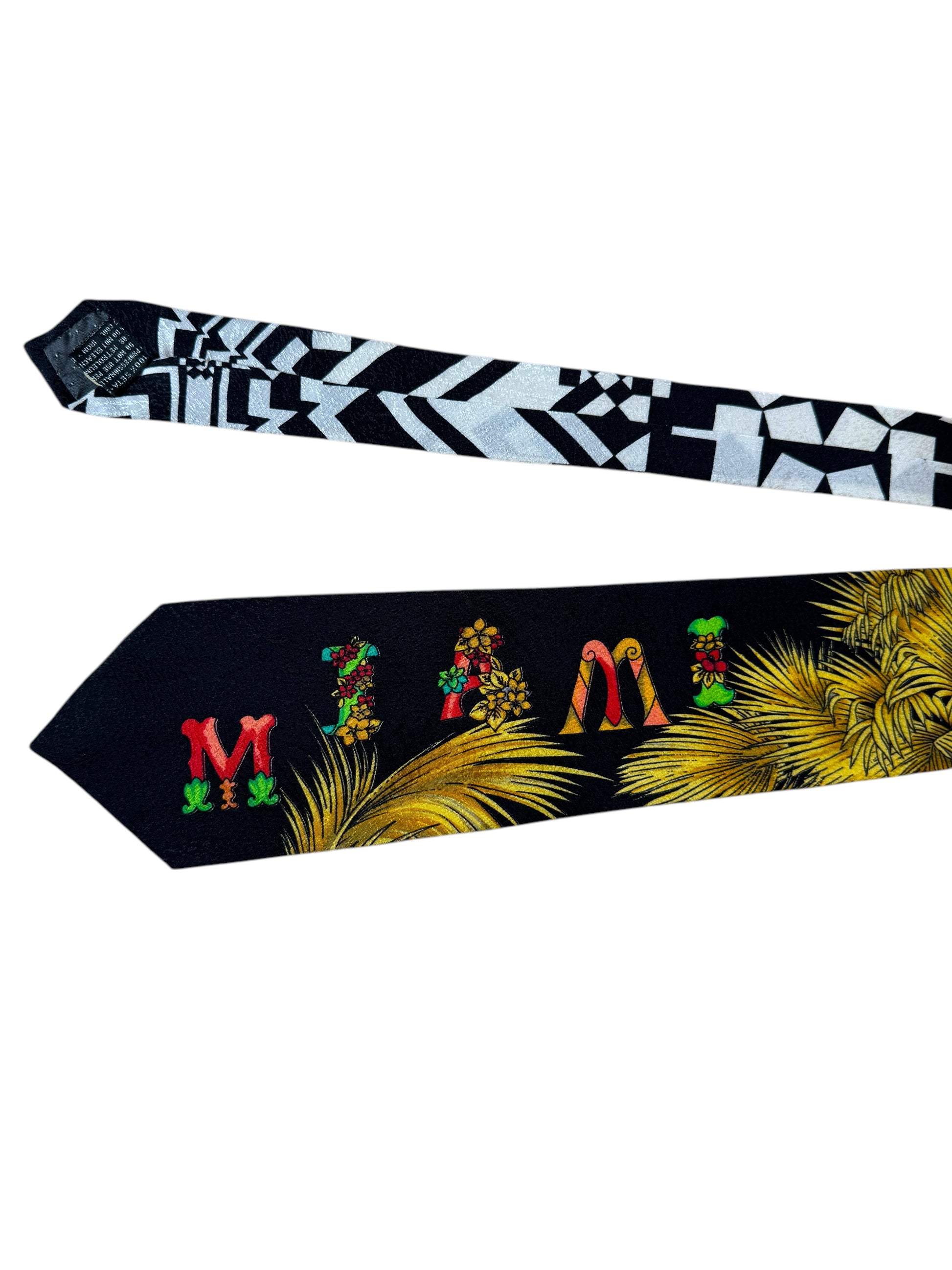 Cravatta originale Gianni Versace, realizzata in 100% seta, dal design audace e iconico. Presenta un motivo tropicale con palme dorate su sfondo nero e la scritta “MIAMI” decorata con fiori colorati. Il retro della cravatta propone un contrastante motivo geometrico in bianco e nero, che la rende unica e distintiva. Etichette originali presenti sul retro e sulla fodera.