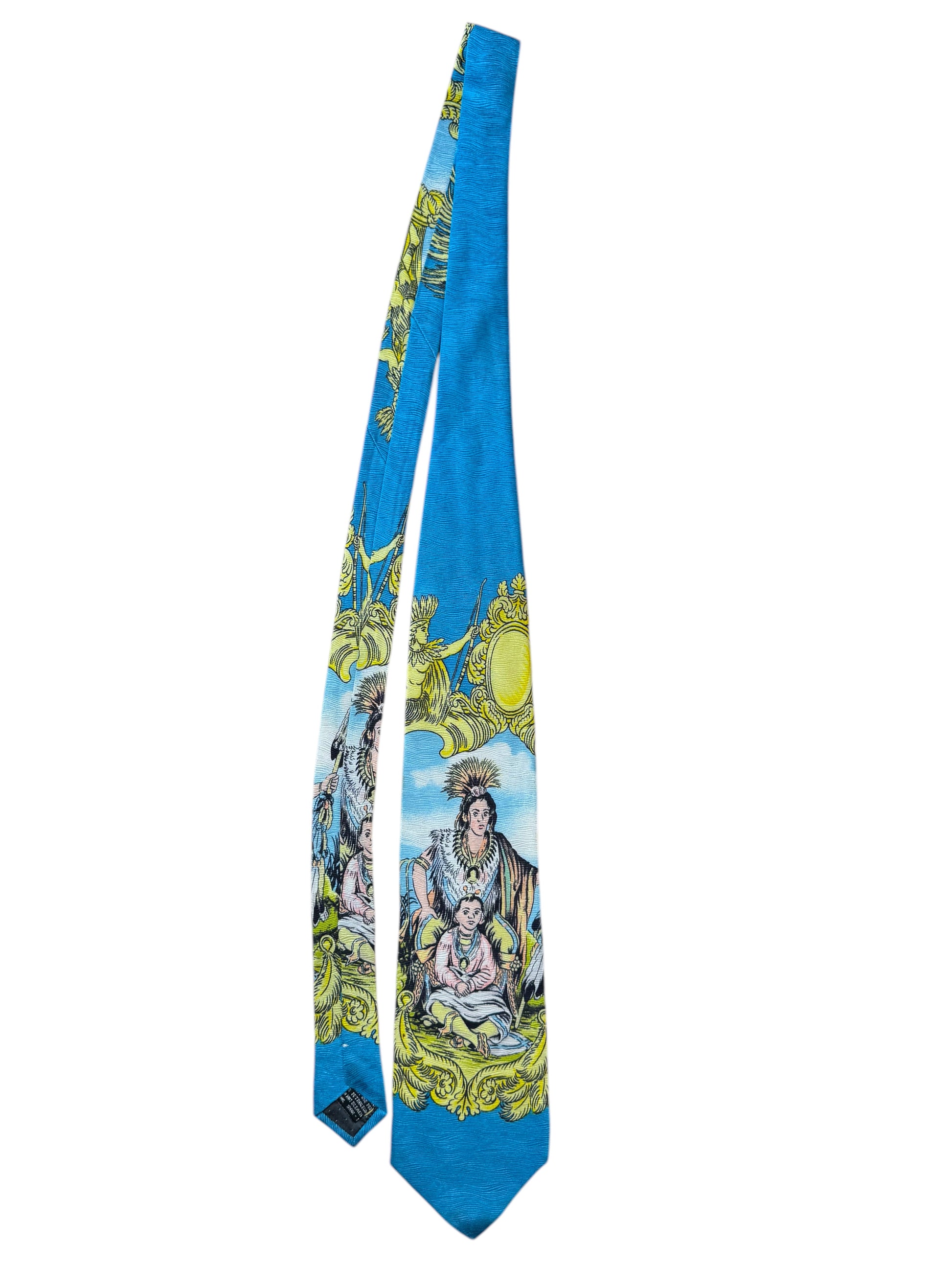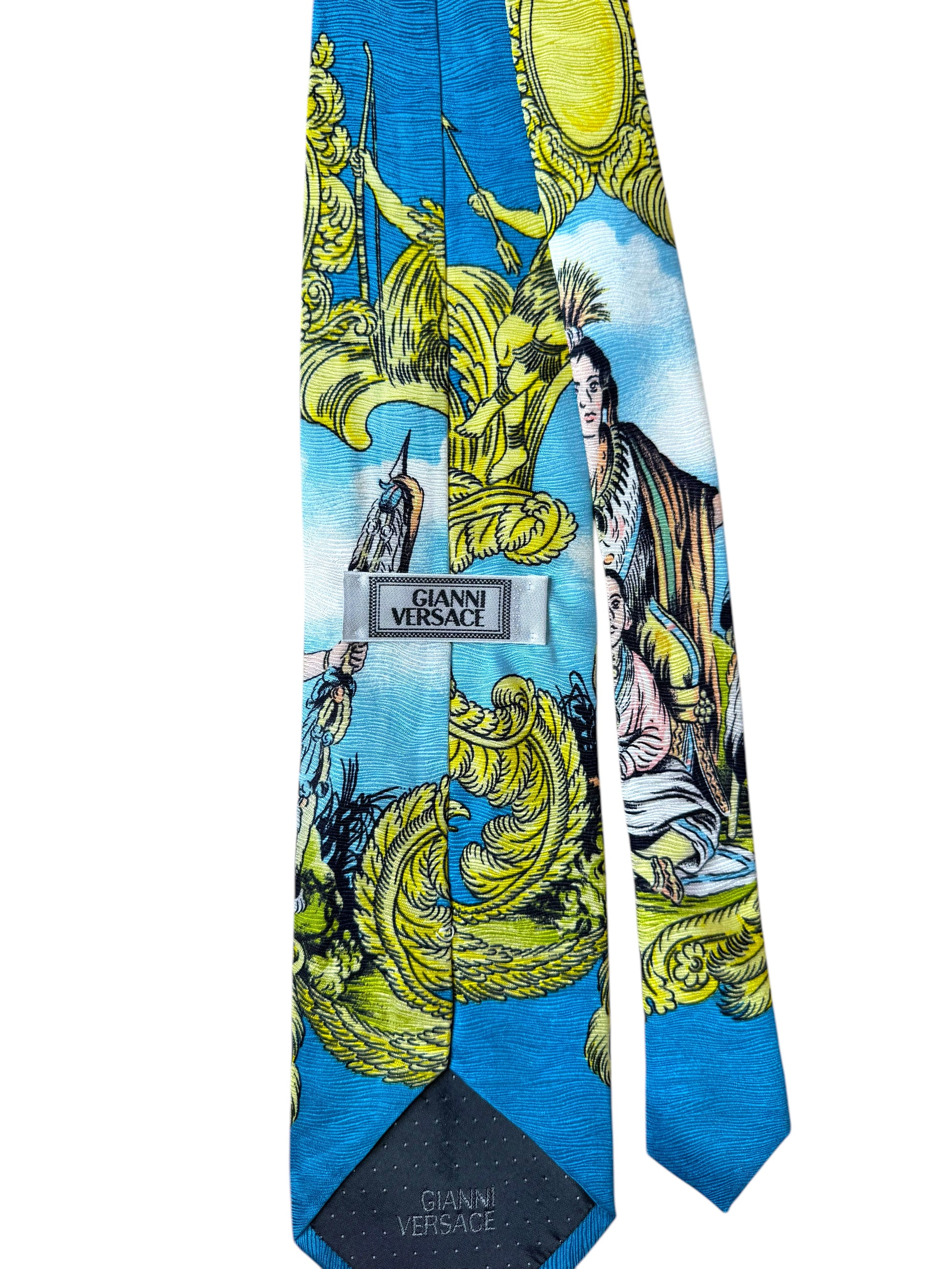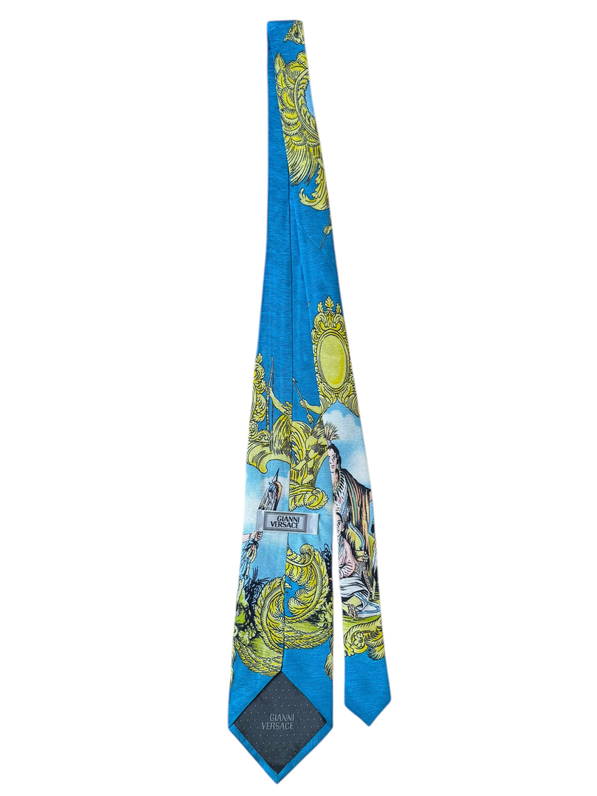 Cravatta originale Gianni Versace, rara e da collezione, realizzata in 100% seta con stampa barocca multicolore. Il motivo raffigura scene mitologiche con figure di nativi e decorazioni dorate su fondo azzurro. Una vera opera d’arte tessile degli anni ‘90, appartenente alla linea storica firmata Gianni Versace, non alla produzione contemporanea.