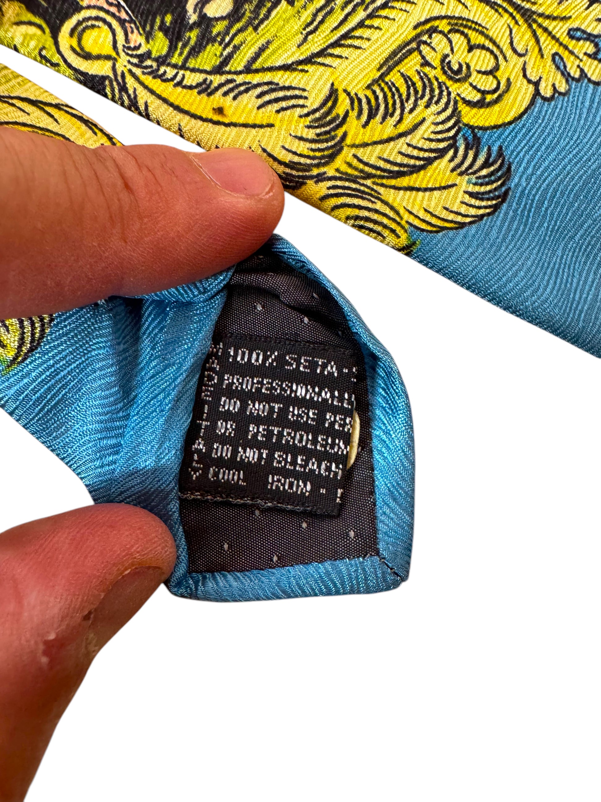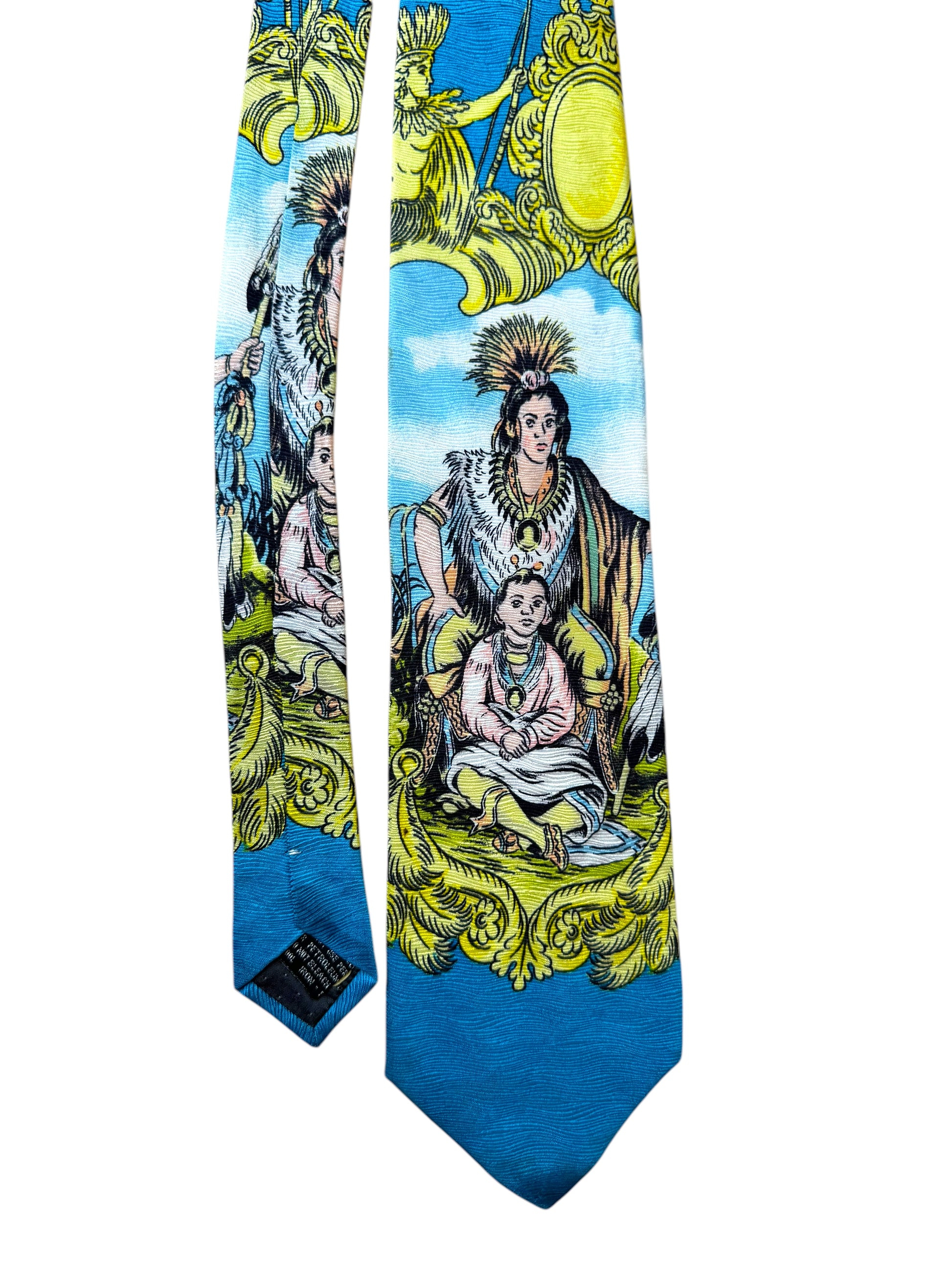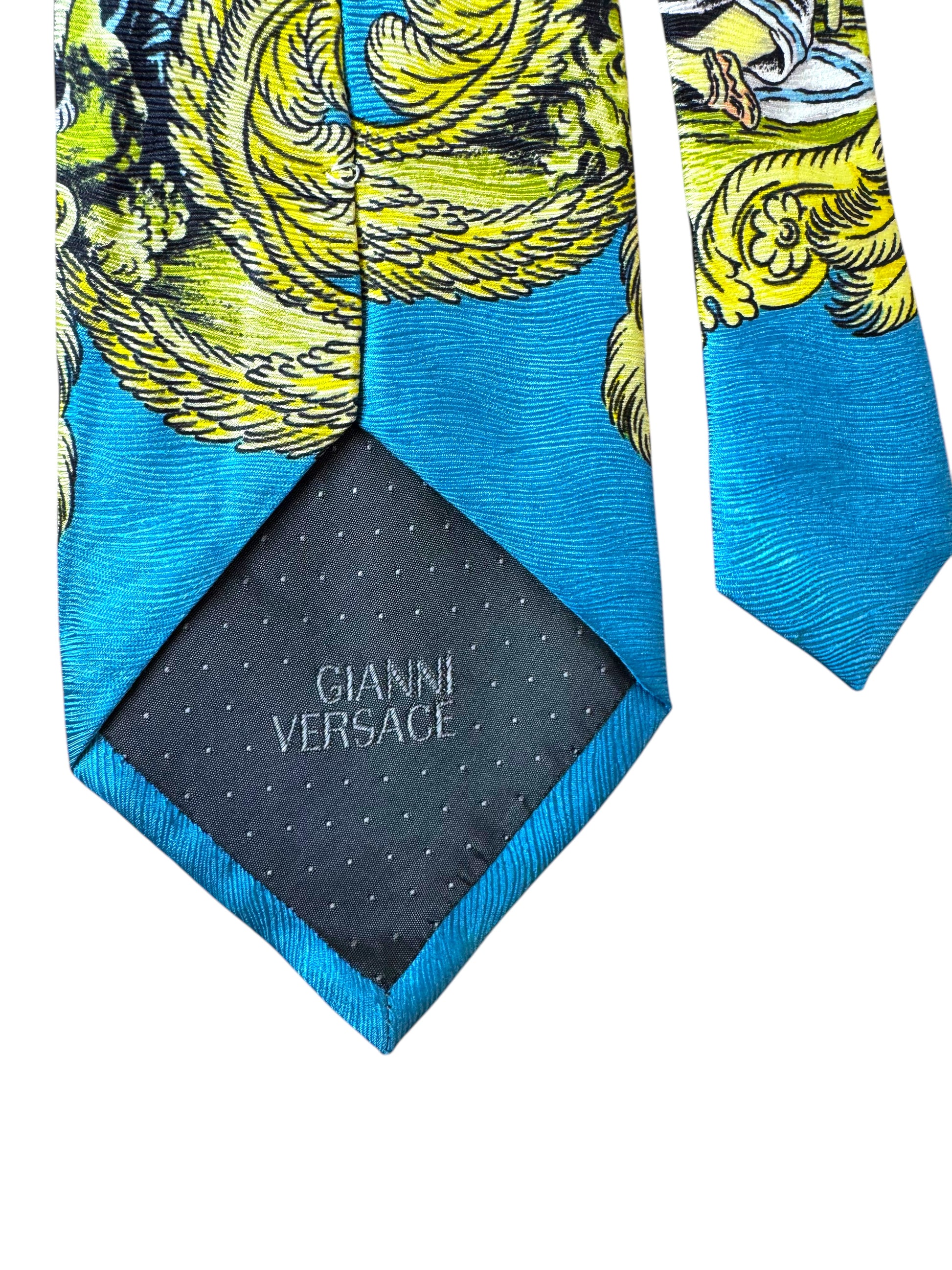 Cravatta originale Gianni Versace, rara e da collezione, realizzata in 100% seta con stampa barocca multicolore. Il motivo raffigura scene mitologiche con figure di nativi e decorazioni dorate su fondo azzurro. Una vera opera d’arte tessile degli anni ‘90, appartenente alla linea storica firmata Gianni Versace, non alla produzione contemporanea.