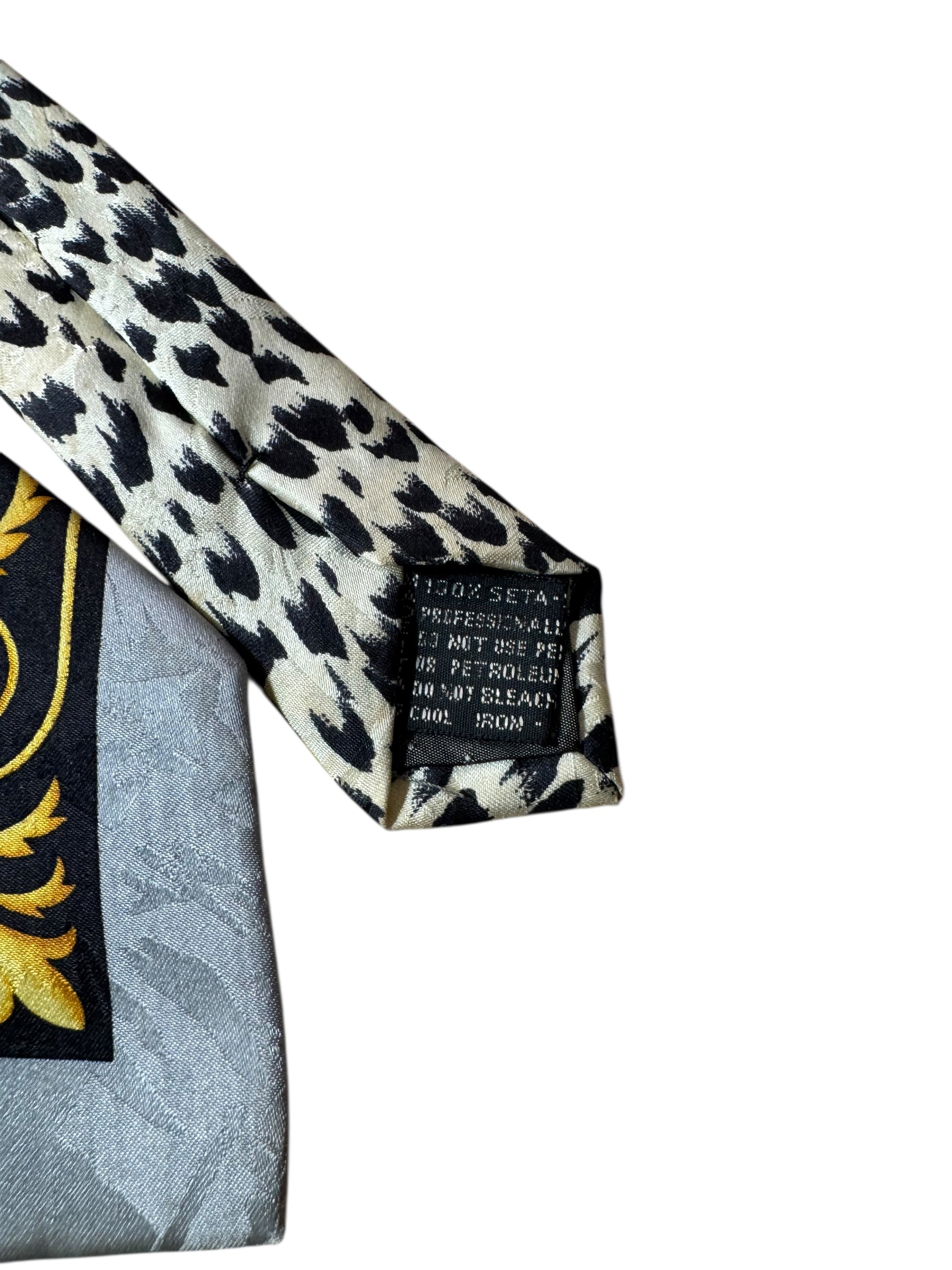 Cravatta originale Gianni Versace in pura seta, caratterizzata da un’elegante stampa barocca nei toni dell’oro e nero con motivo Medusa centrale, abbinata a un retro con fantasia animalier bianco e nero.