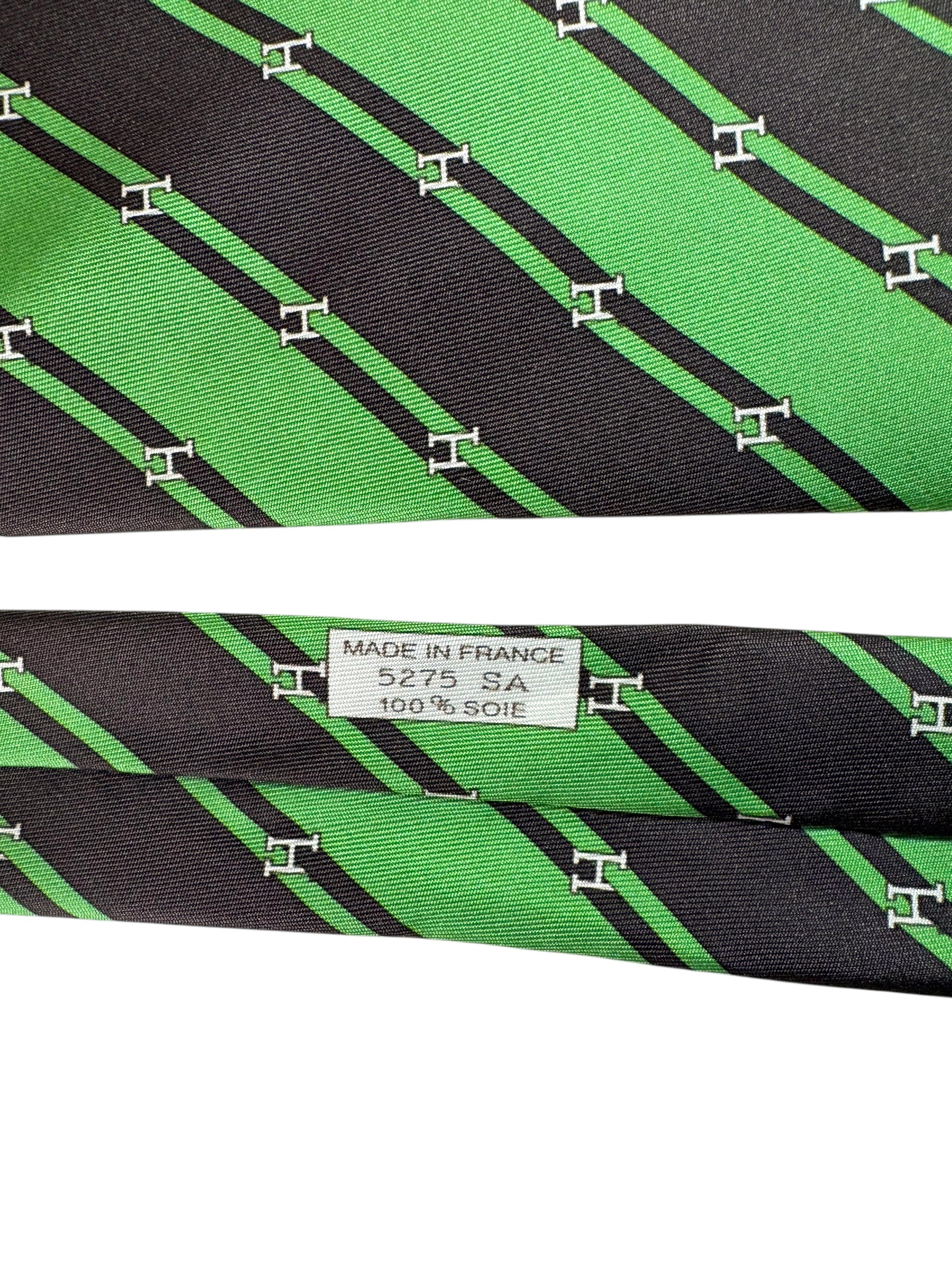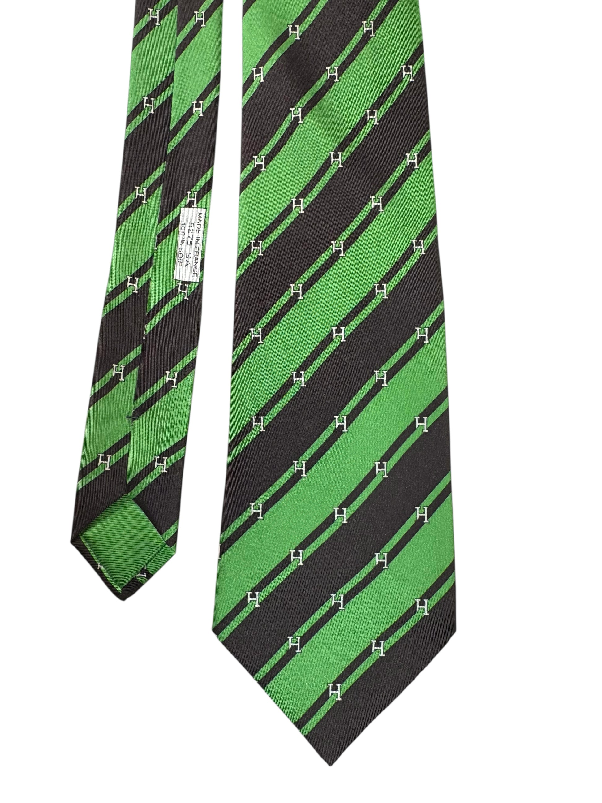 Cravatta Hermès Paris Vintage in Seta – Righe Diagonali Verde/Nero – Logo “H” – Made in France