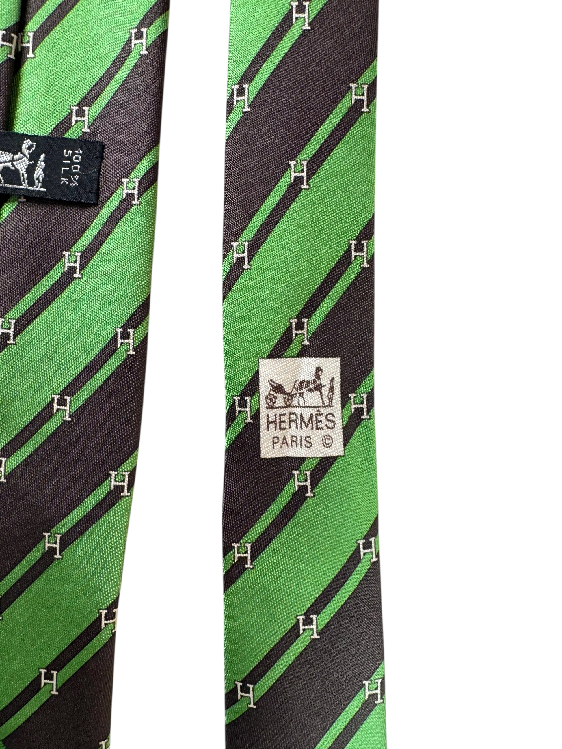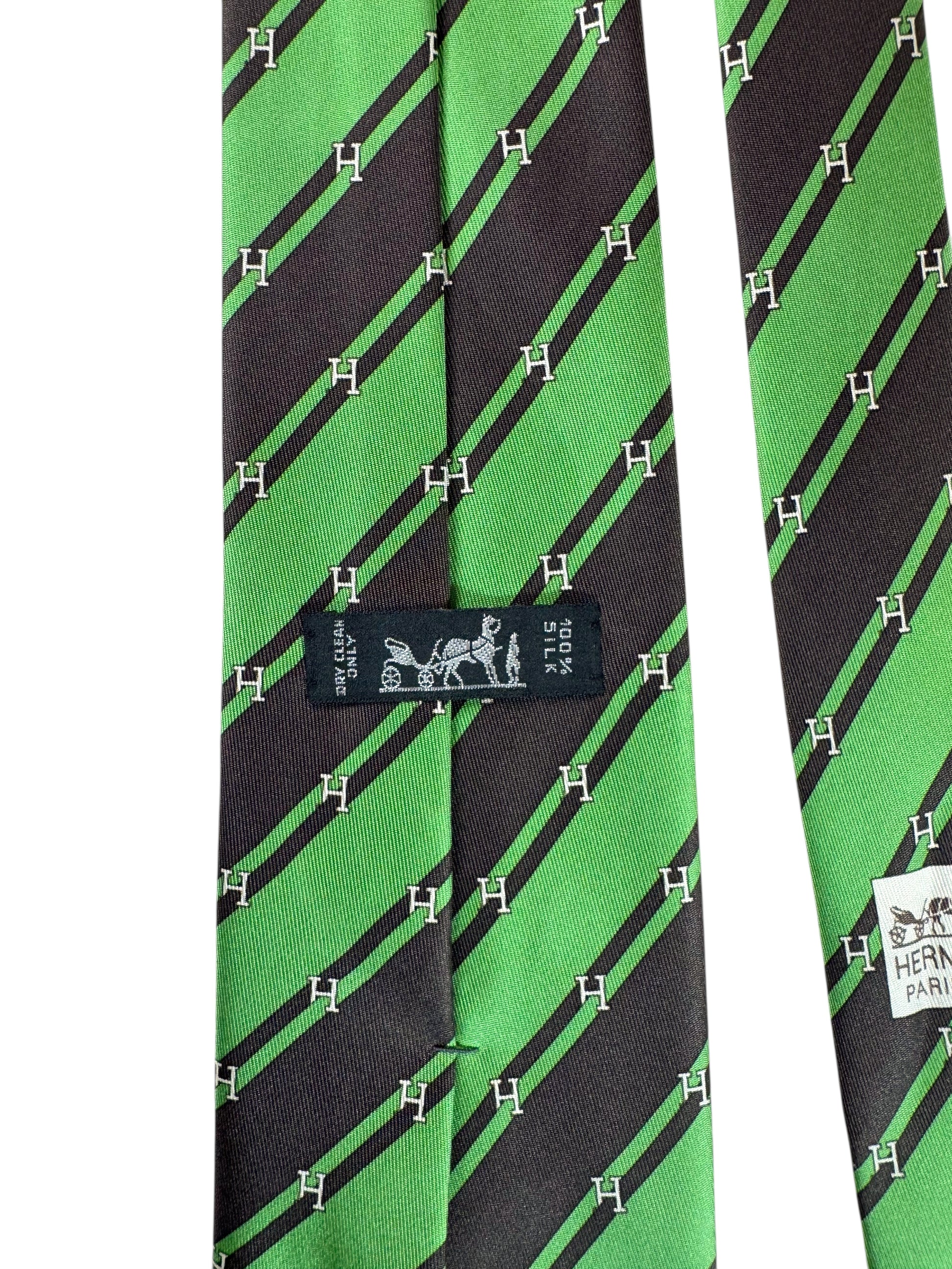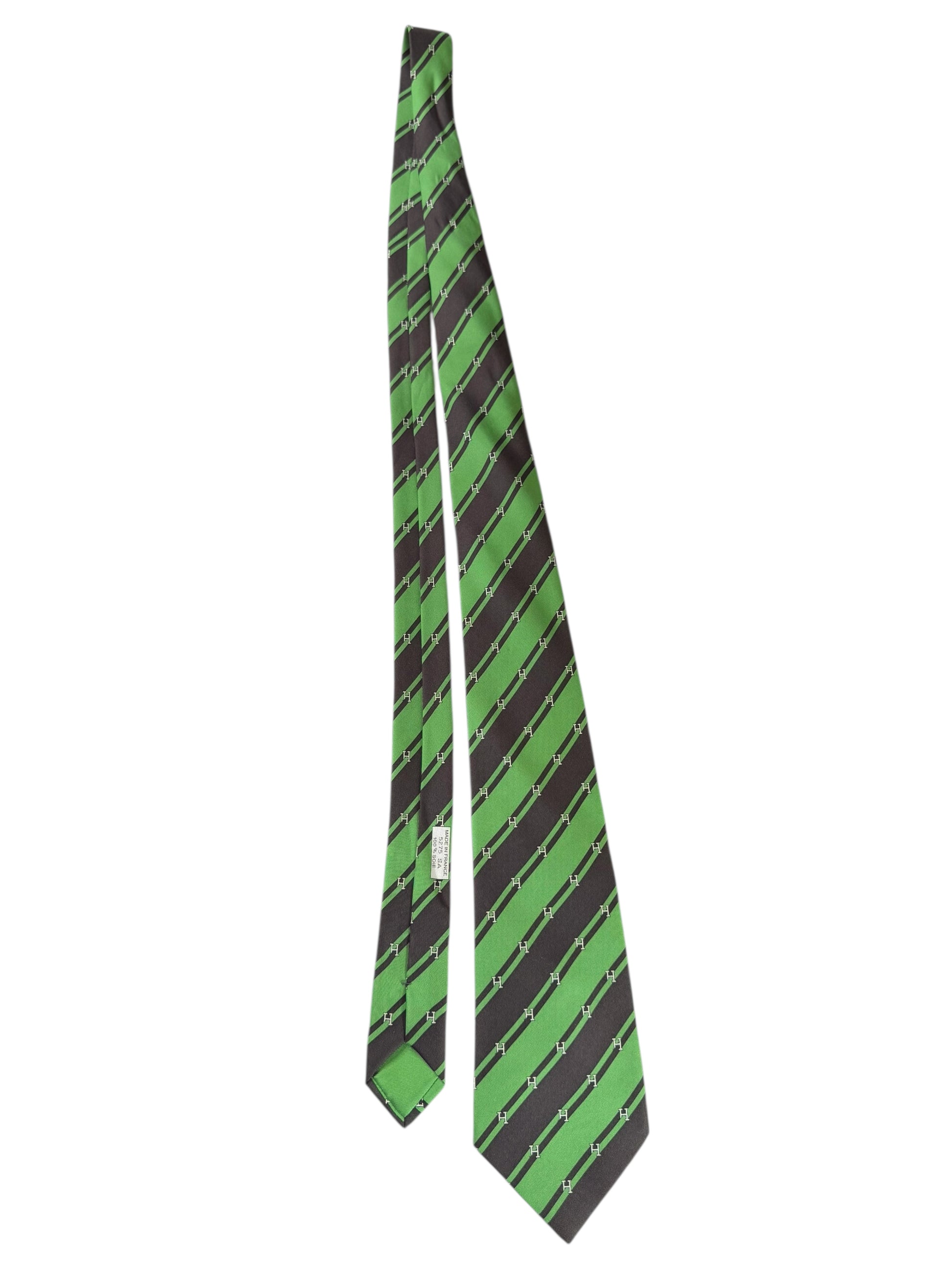 Cravatta vintage originale Hermès Paris in 100% seta, prodotta in Francia. Design a righe diagonali verdi e nere con micro-logo “H” bianco ripetuto, stile classico ed elegante tipico delle collezioni d’archivio Hermès. Ideale sia per collezionisti sia per chi cerca un accessorio raffinato e distintivo.