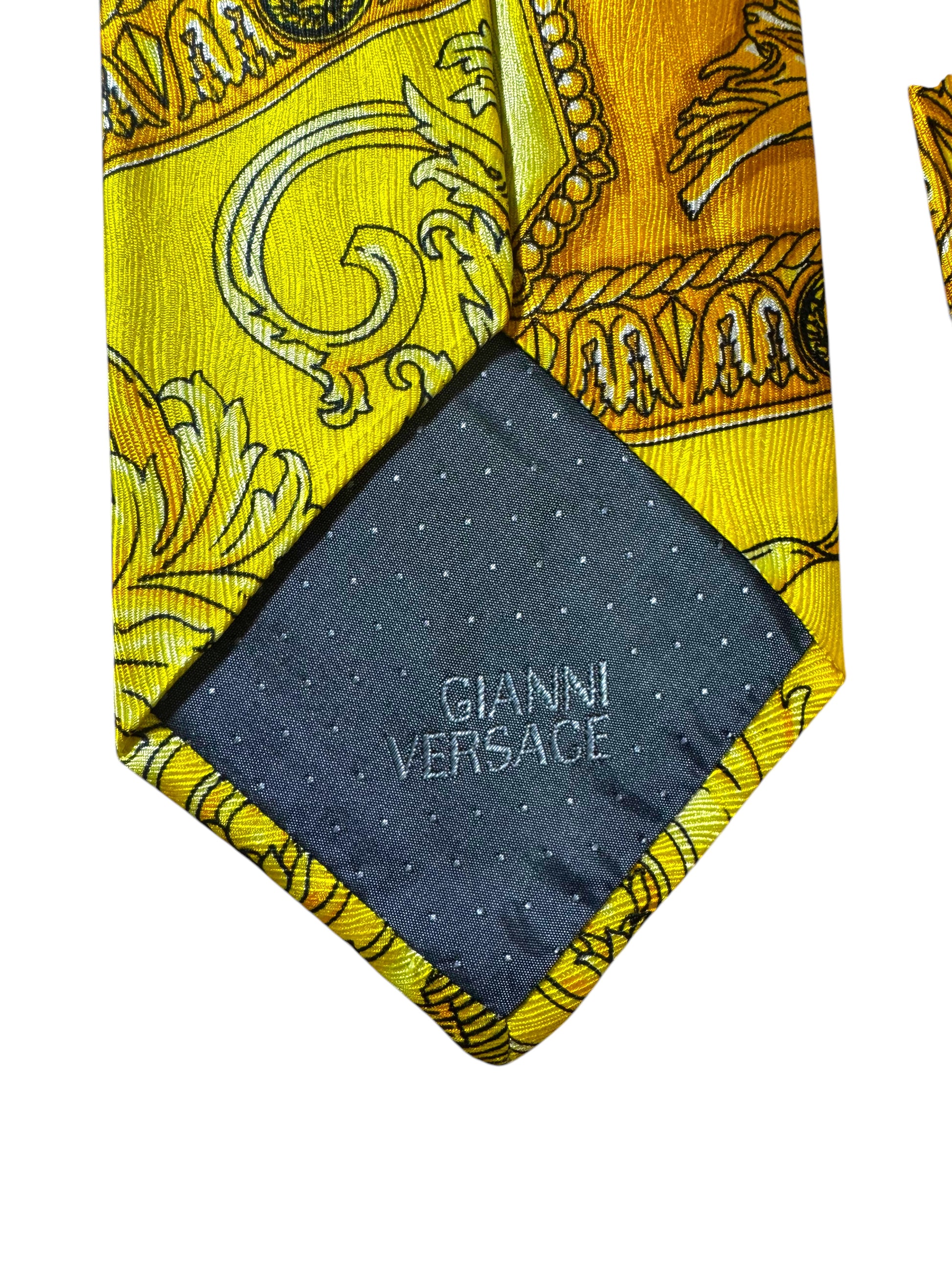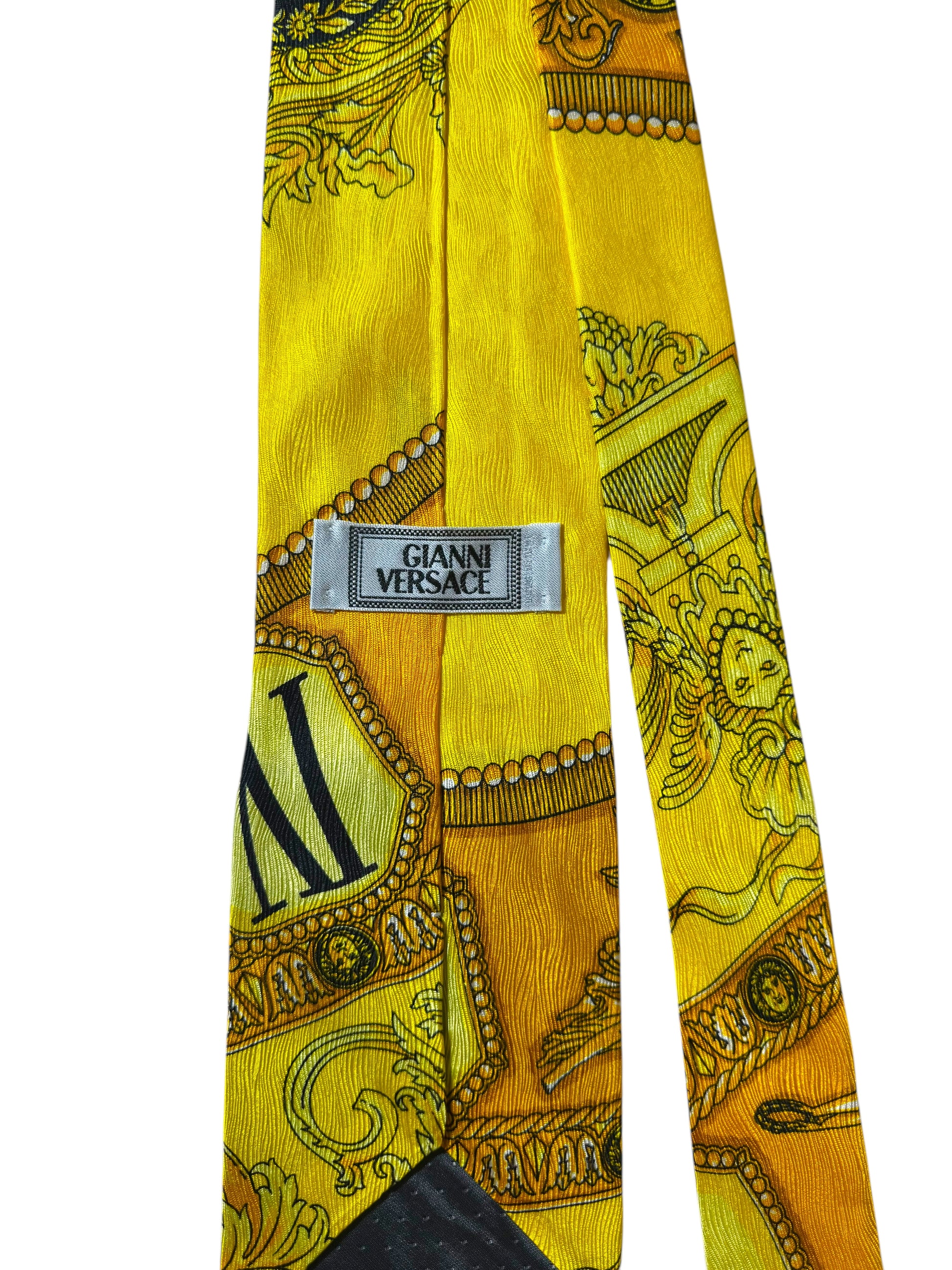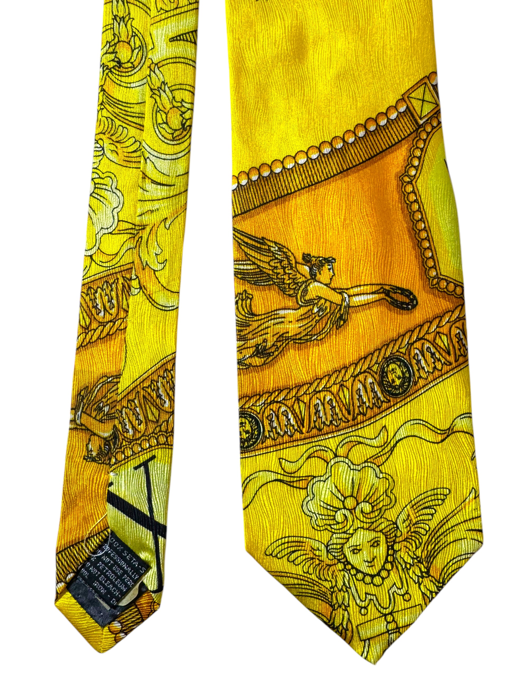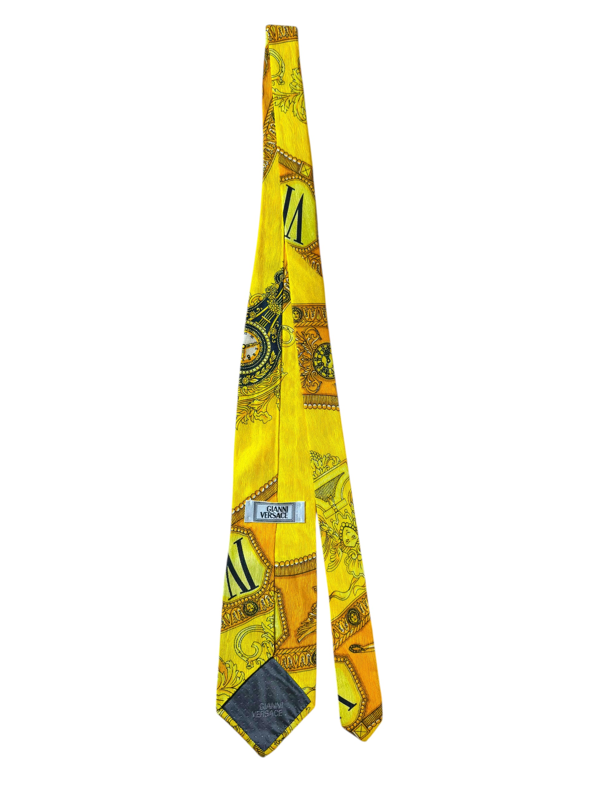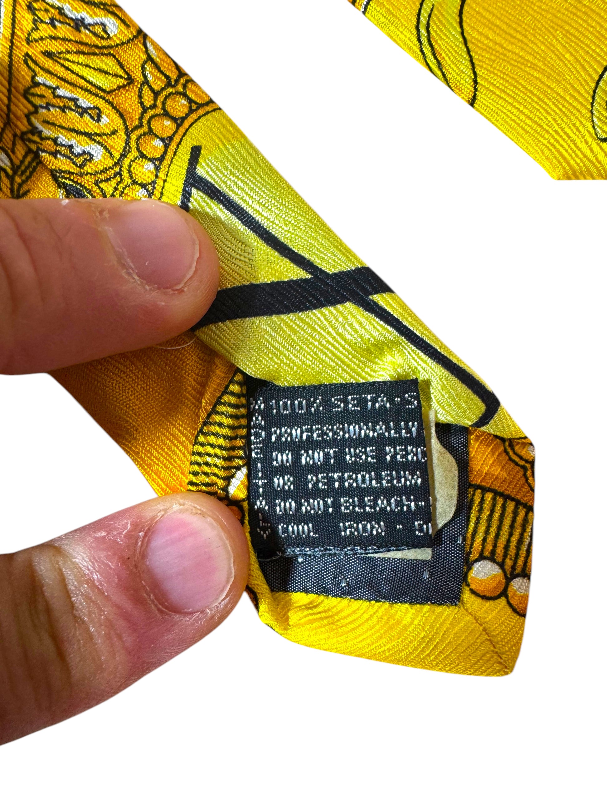 Raffinata cravatta vintage Gianni Versace in pura seta, Made in Italy. Il design presenta una vivace fantasia barocca nei toni del giallo e oro, con dettagli di orologi antichi, motivi architettonici e figure angeliche. Un pezzo dallo stile inconfondibile e ricercato, ideale per collezionisti o per chi desidera un accessorio di forte impatto visivo. Logo Gianni Versace ricamato sul retro. Etichetta originale presente.