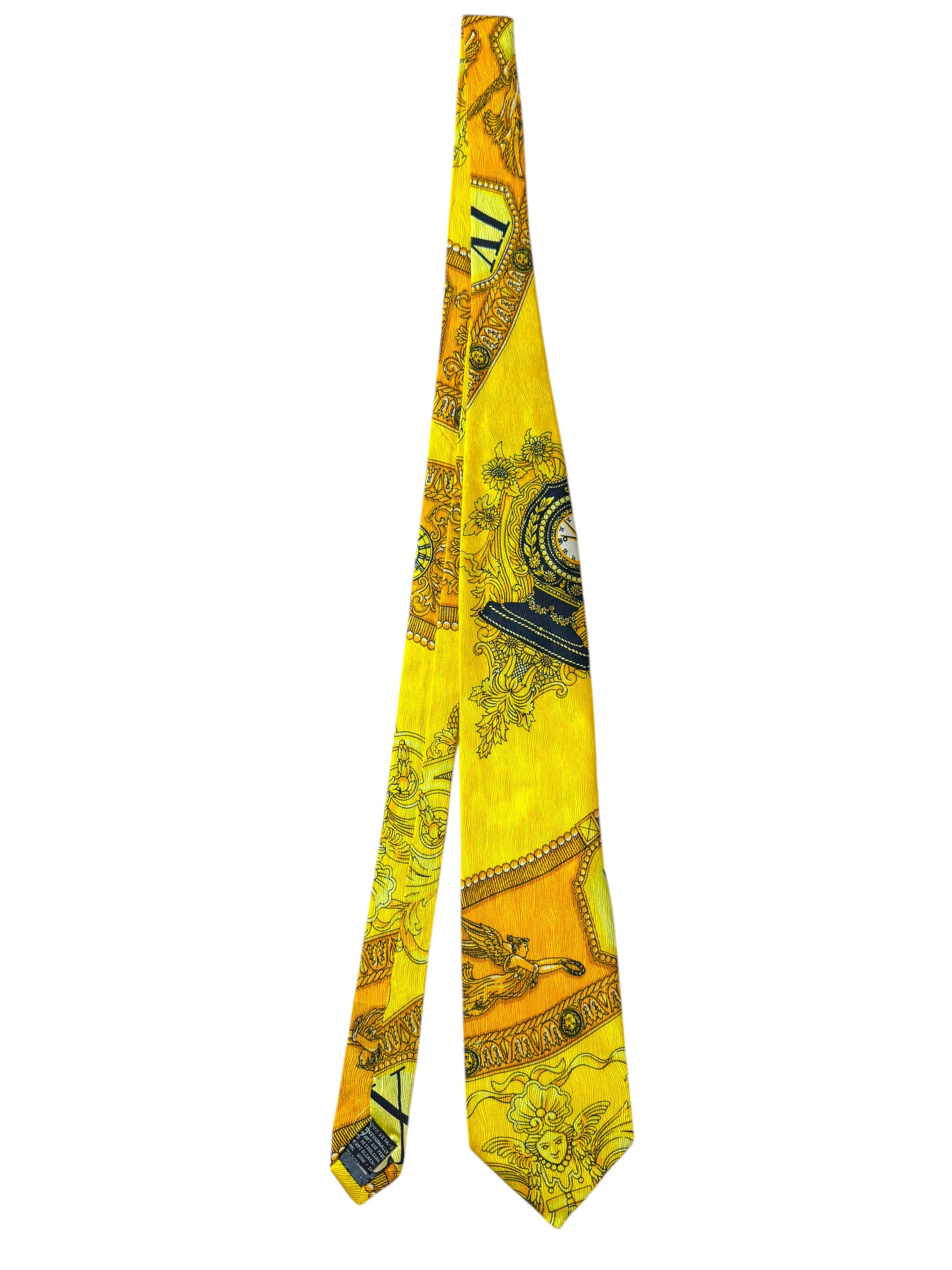 Cravatta vintage Gianni Versace oro barocco con orologi e angeli – 100% seta Made in Italy