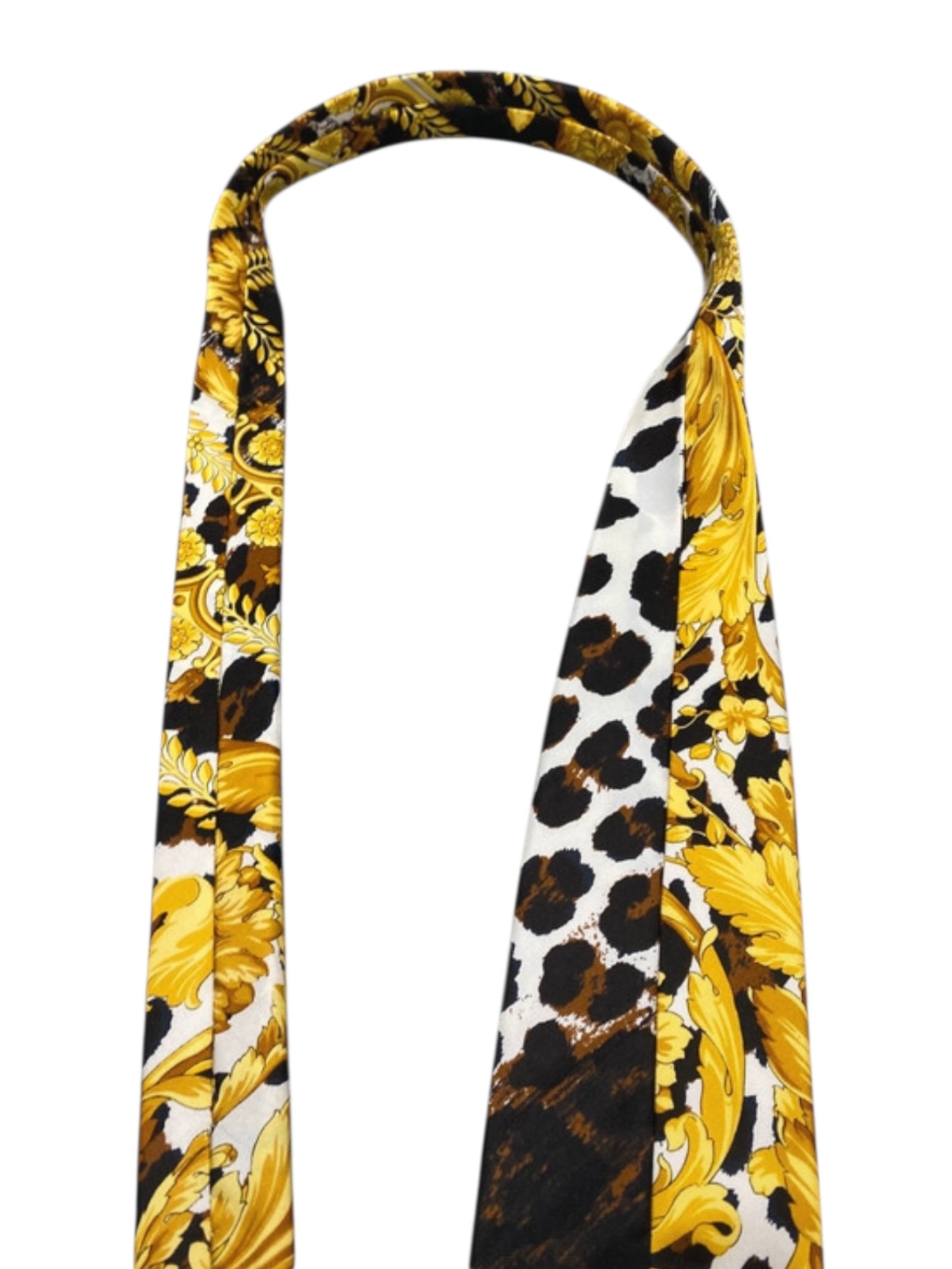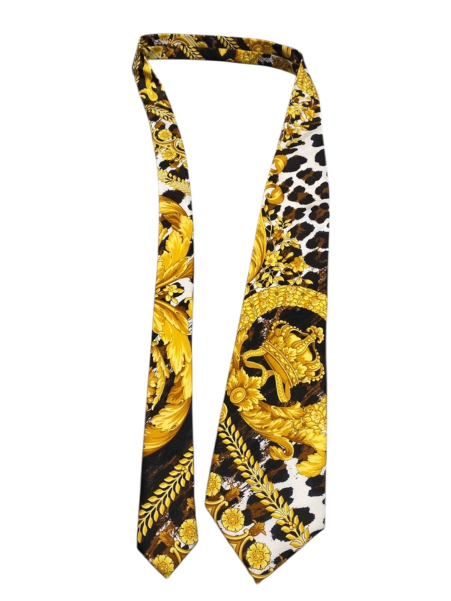 Cravatta originale Gianni Versace, autentico pezzo vintage in pura seta, caratterizzata dalla prestigiosa stampa “Wild Barocco”, che unisce elementi Baroque dorati a motivo animalier leopardato su fondo bianco. Realizzata in Italia con materiali pregiati, è un accessorio iconico e ricercato, ideale anche per collezionisti.