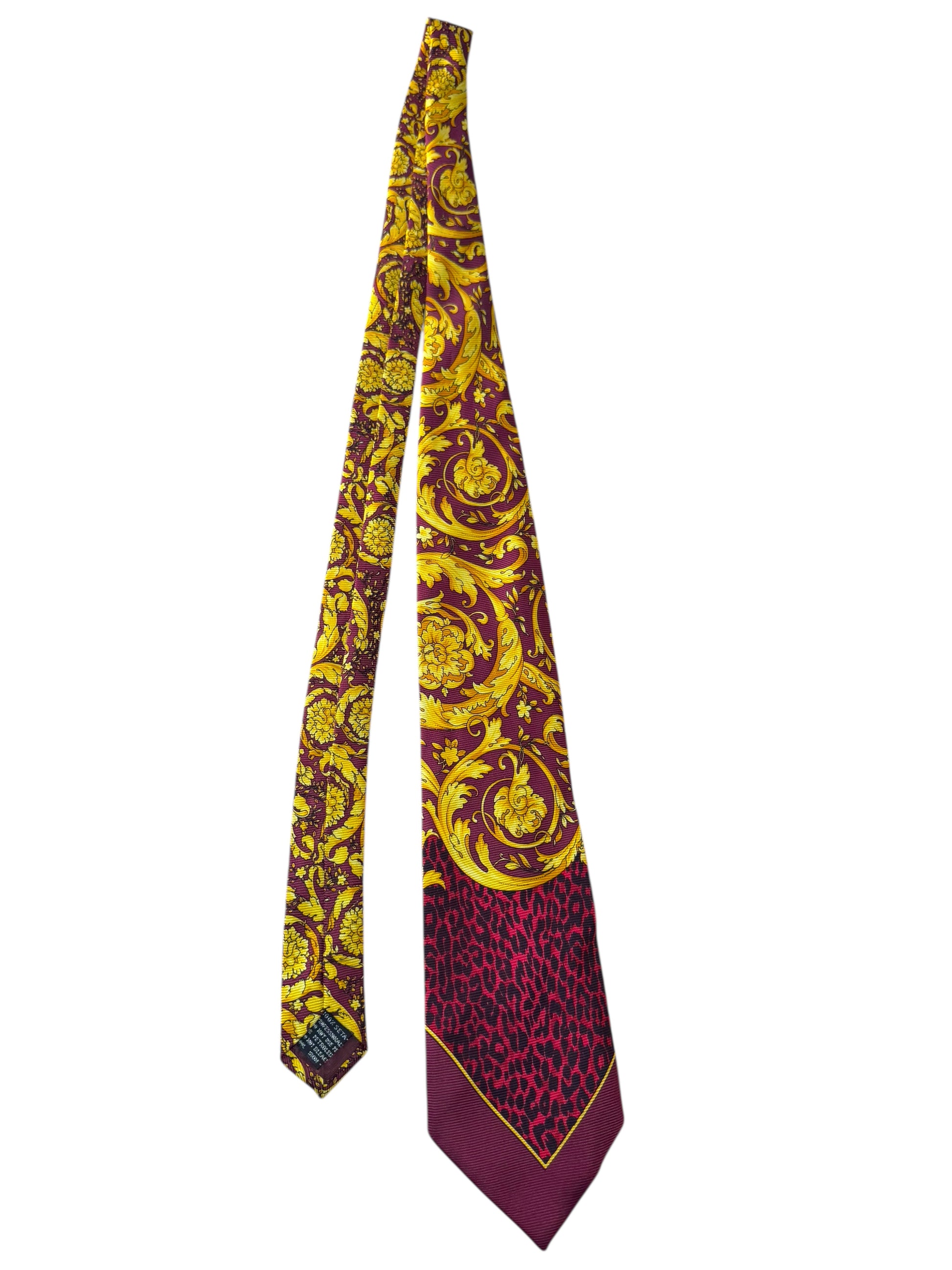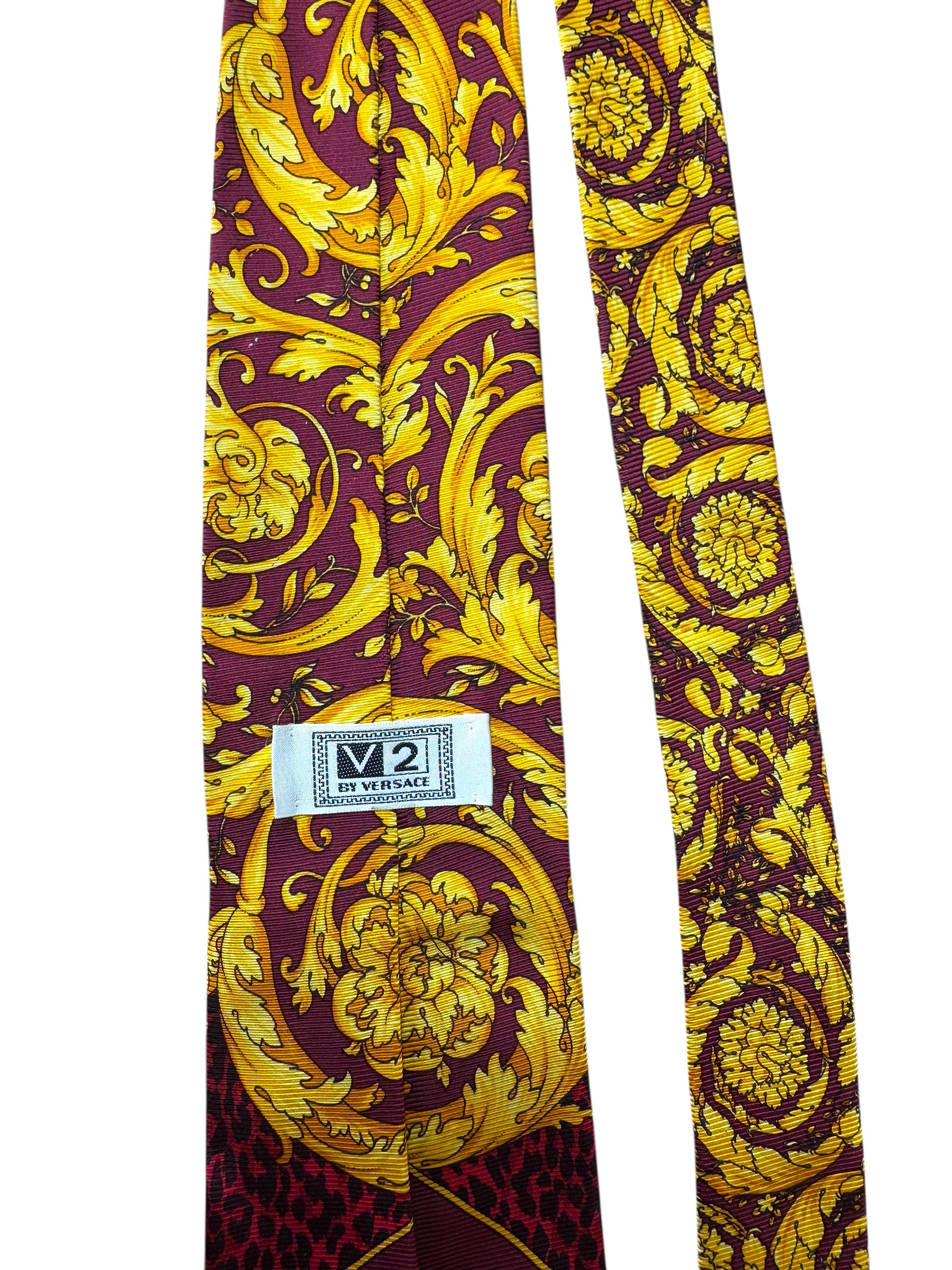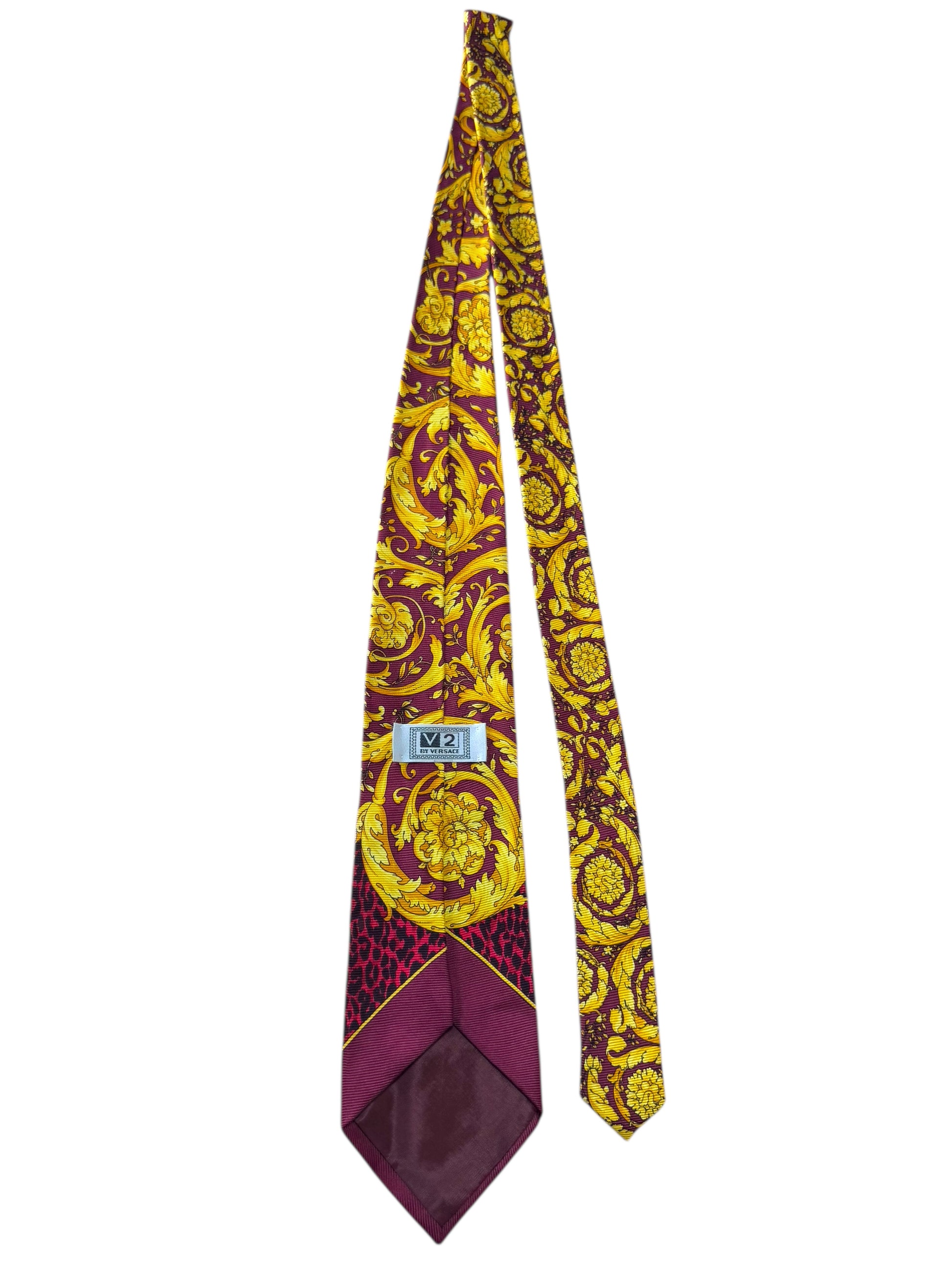 Cravatta vintage firmata V2 by Versace, realizzata in 100% seta, con l’inconfondibile stampa barocca gialla su sfondo rosso e motivo leopardato nella parte inferiore. Un accessorio di grande impatto visivo, perfetto per collezionisti e amanti dello stile Versace anni ’90.