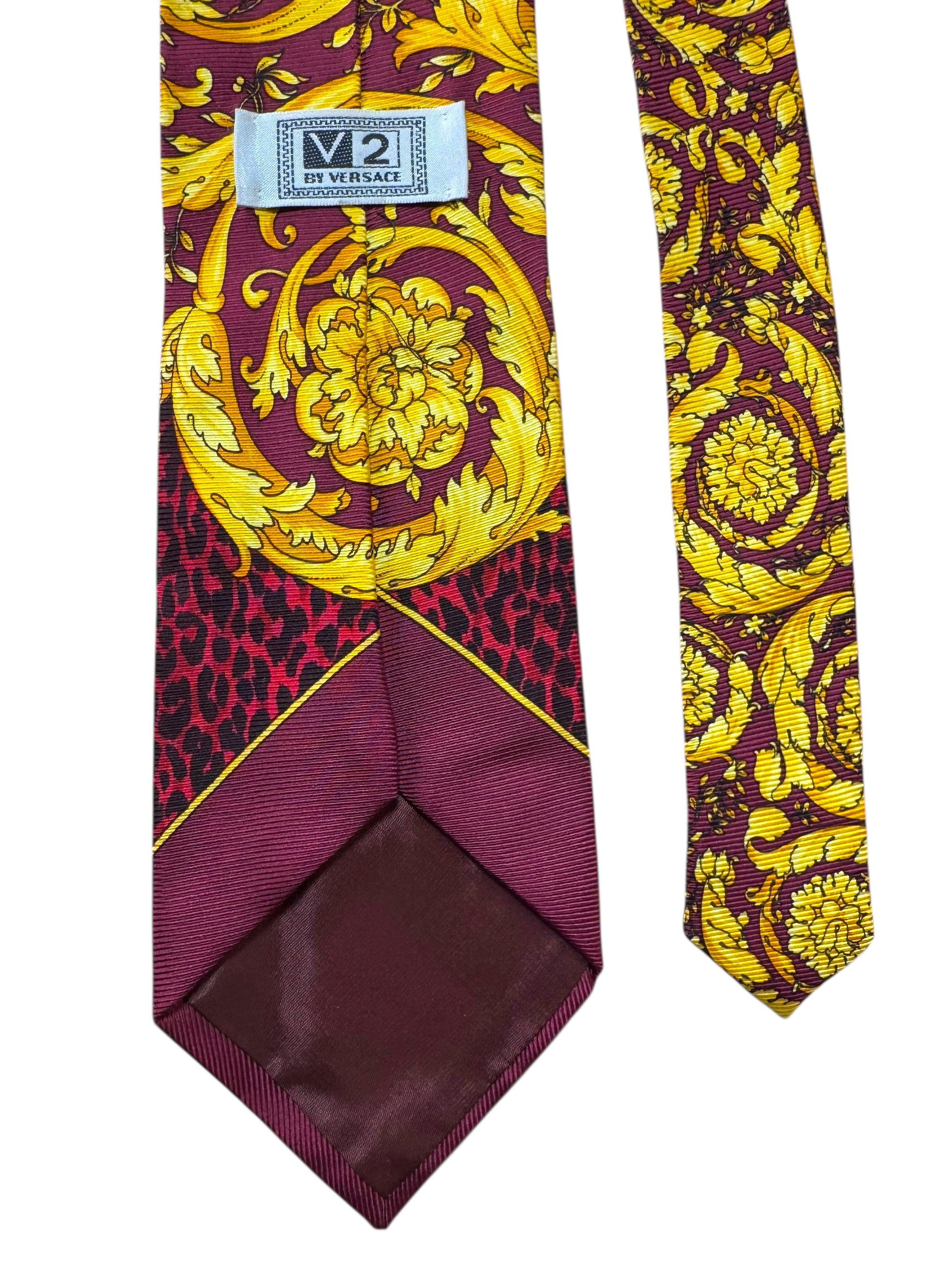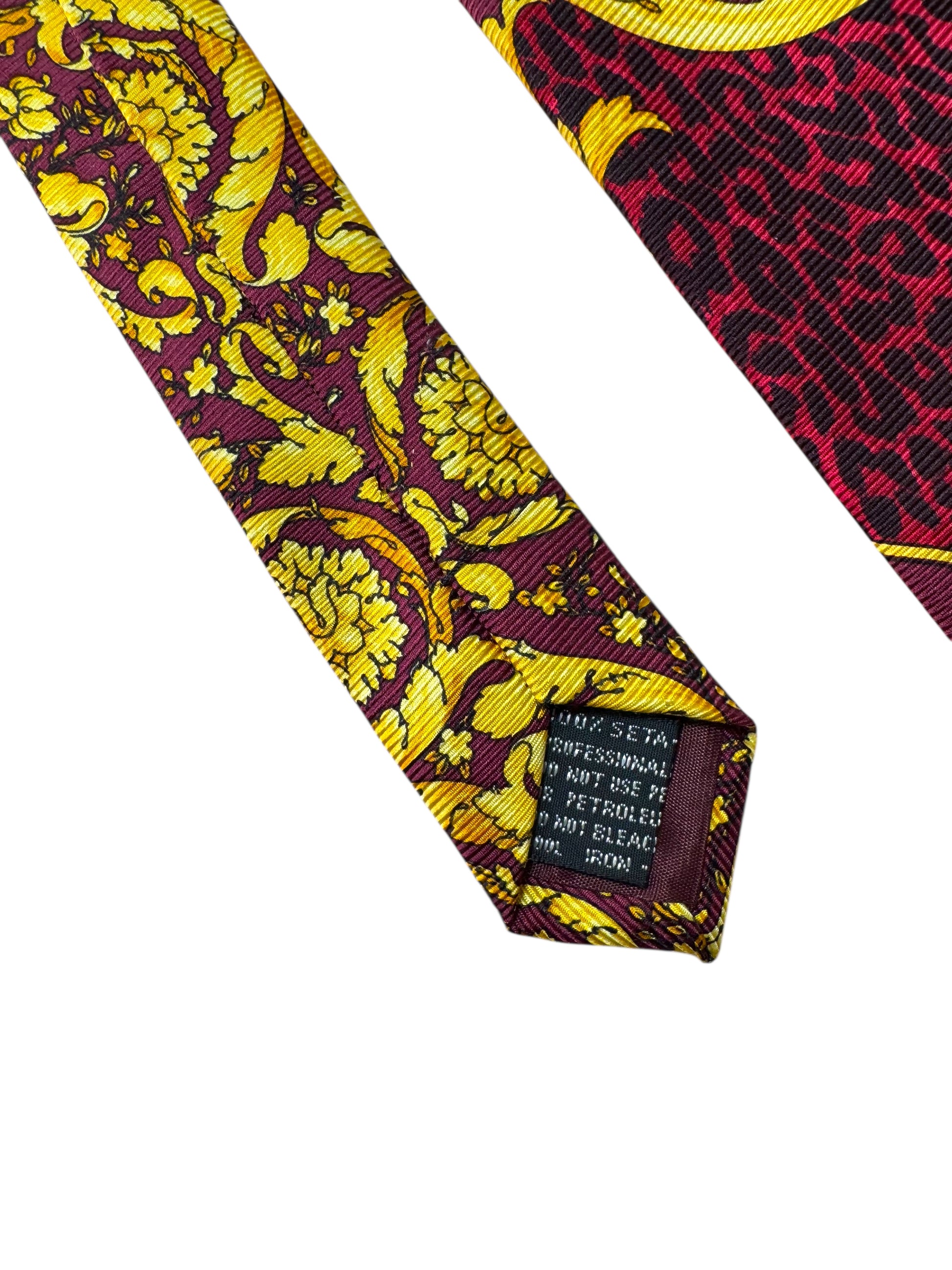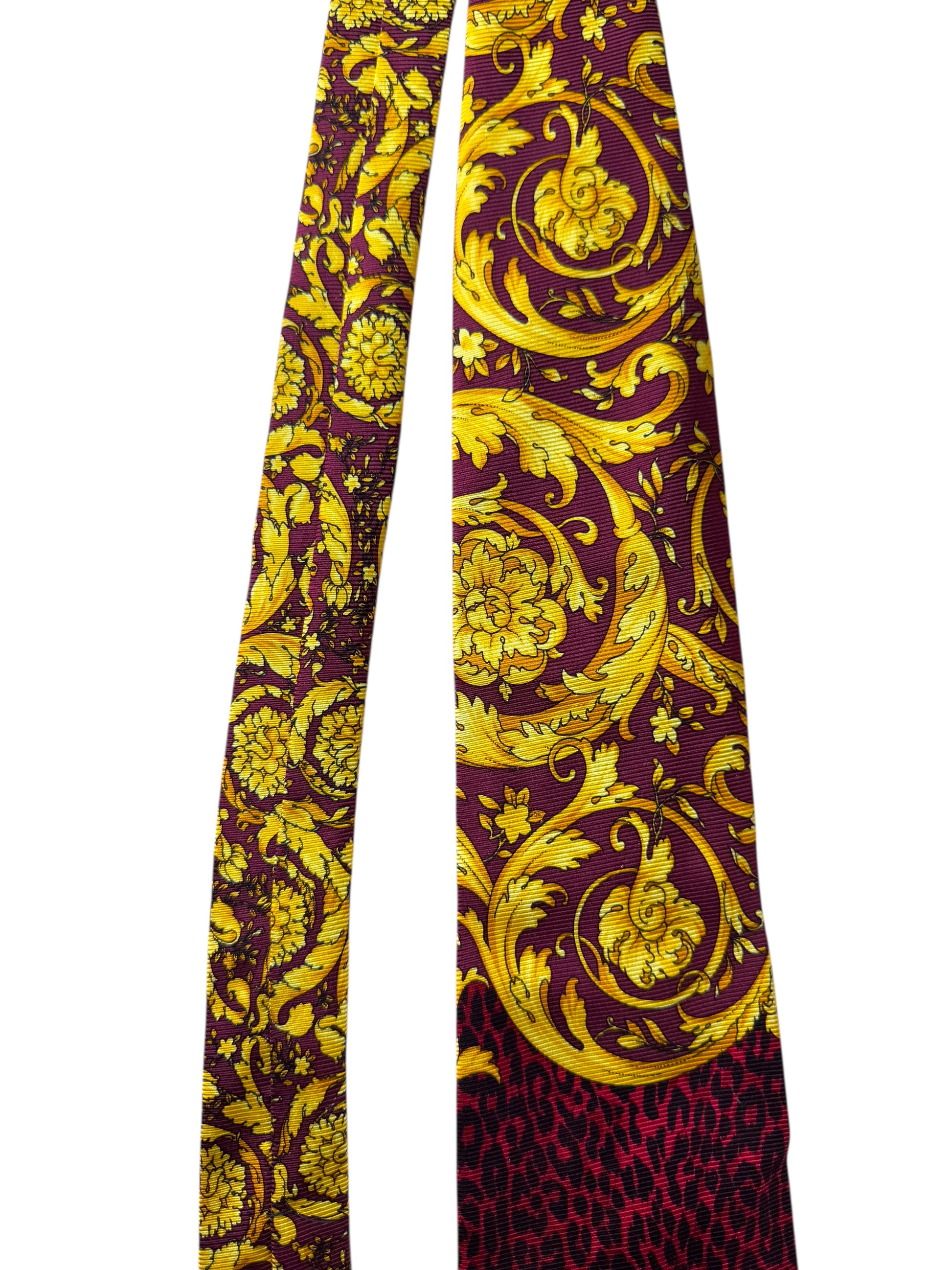 Cravatta vintage firmata V2 by Versace, realizzata in 100% seta, con l’inconfondibile stampa barocca gialla su sfondo rosso e motivo leopardato nella parte inferiore. Un accessorio di grande impatto visivo, perfetto per collezionisti e amanti dello stile Versace anni ’90.