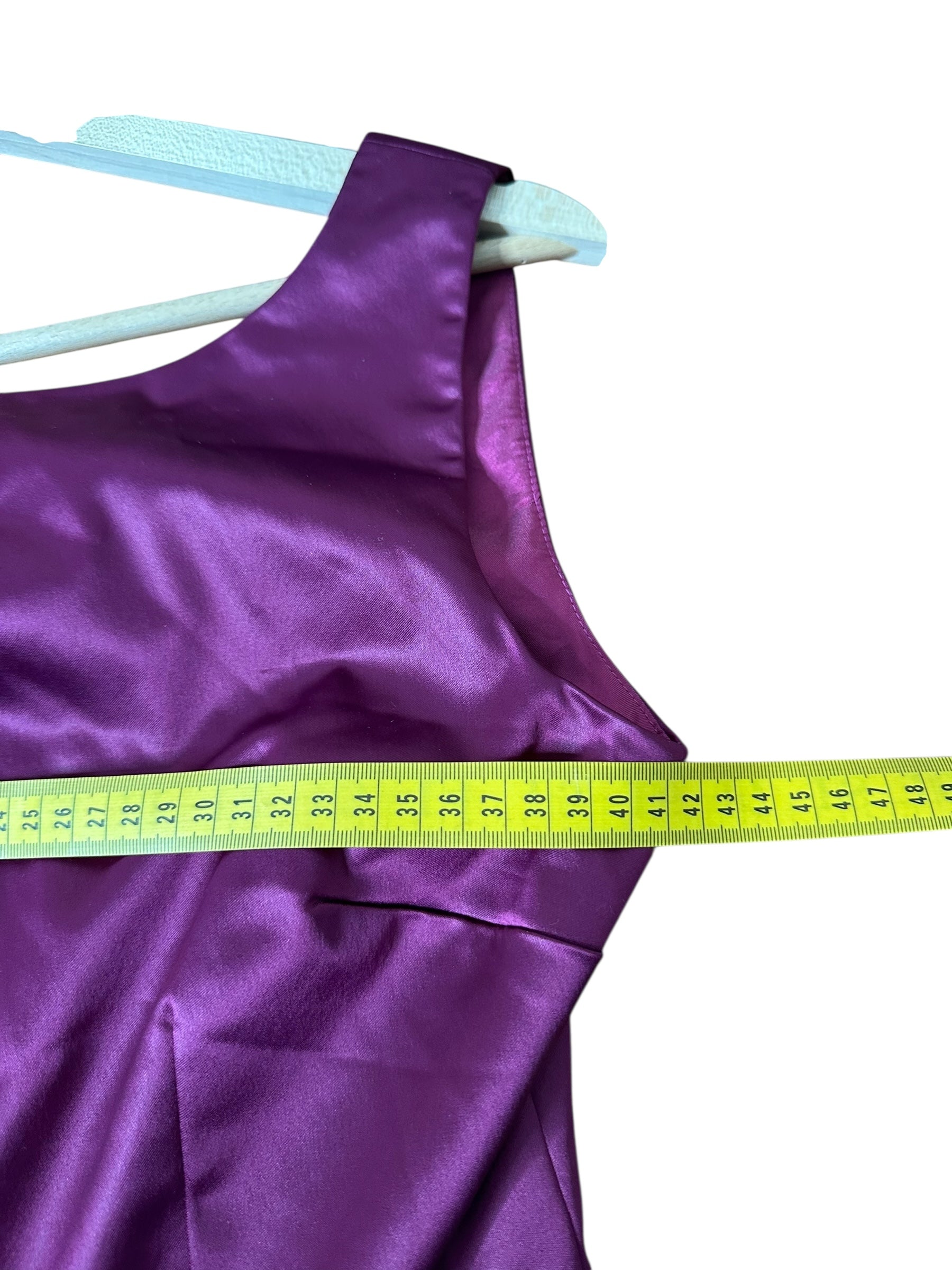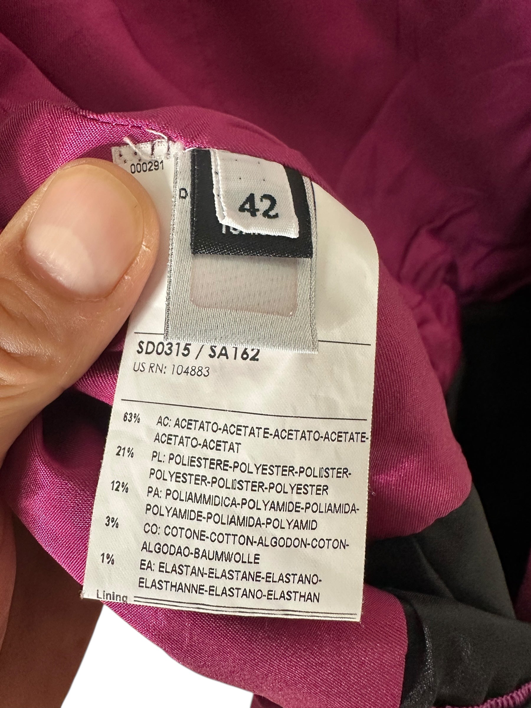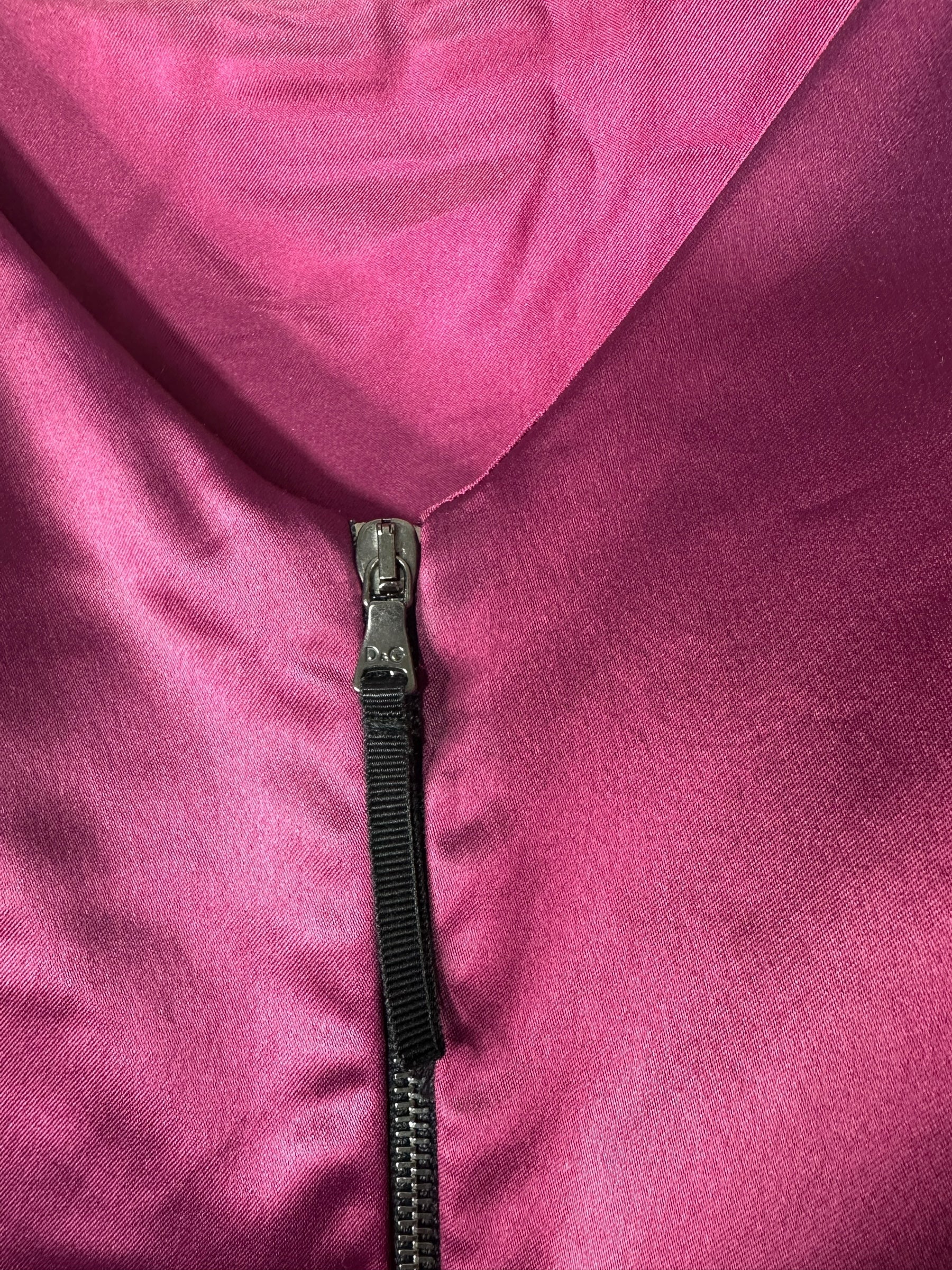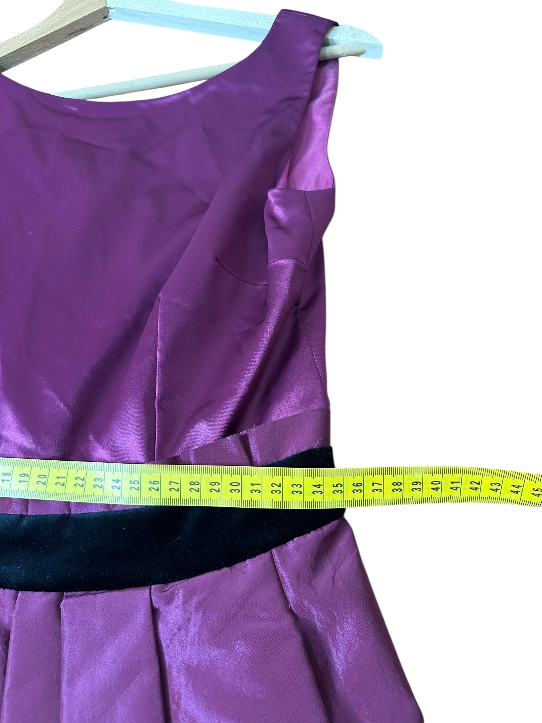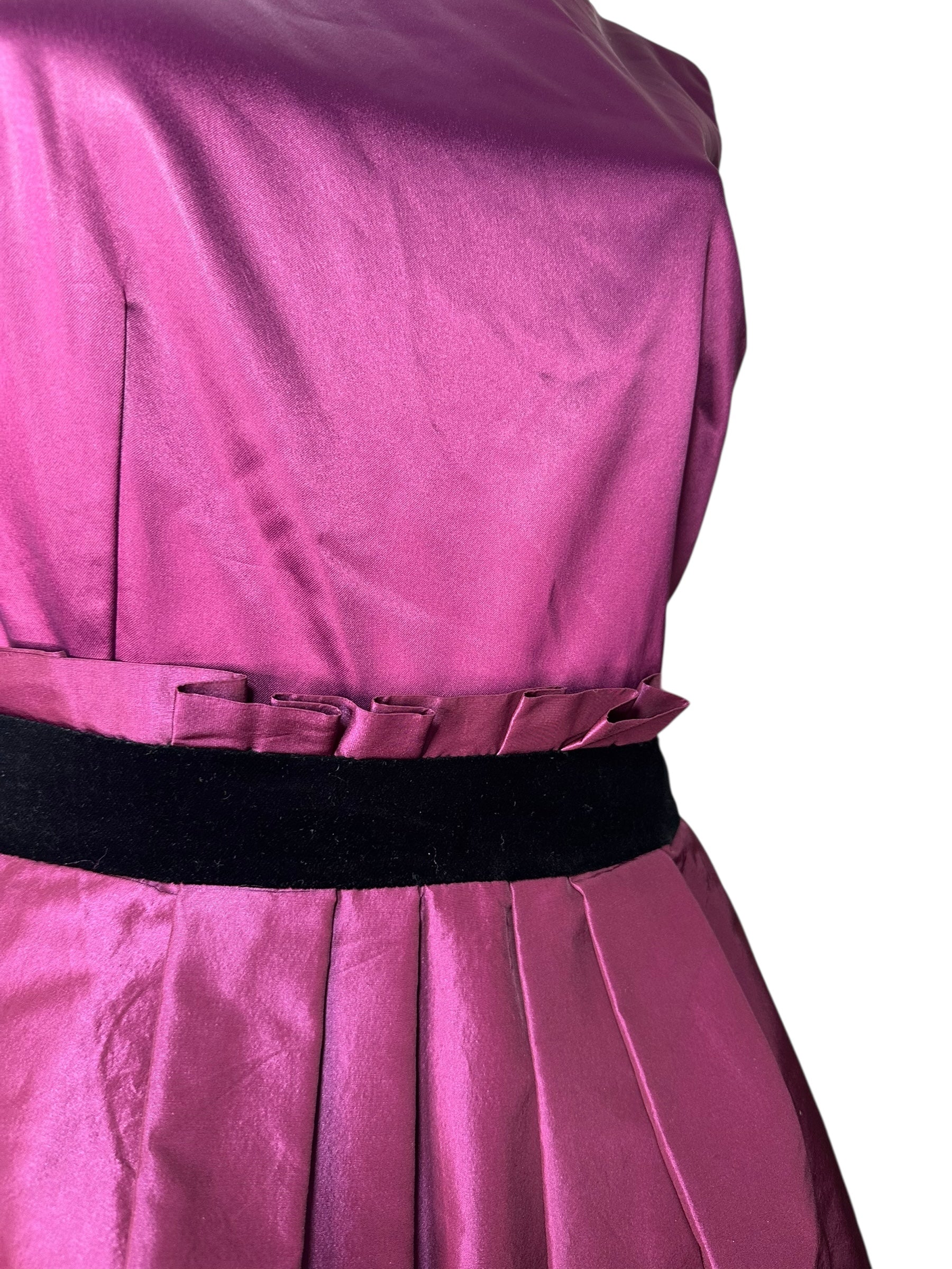 Abito vintage firmato D&G Dolce & Gabbana, realizzato in un raffinato taffetà color viola con finitura leggermente cangiante. Il modello presenta scollatura rotonda sul davanti e scollo a V sulla schiena, con chiusura tramite zip posteriore logata. La gonna è ampia e strutturata, arricchita da pieghe profonde che donano volume e movimento. In vita è presente una cintura a contrasto in velluto nero, decorata da una sottile rifinitura a piegoline tono su tono.