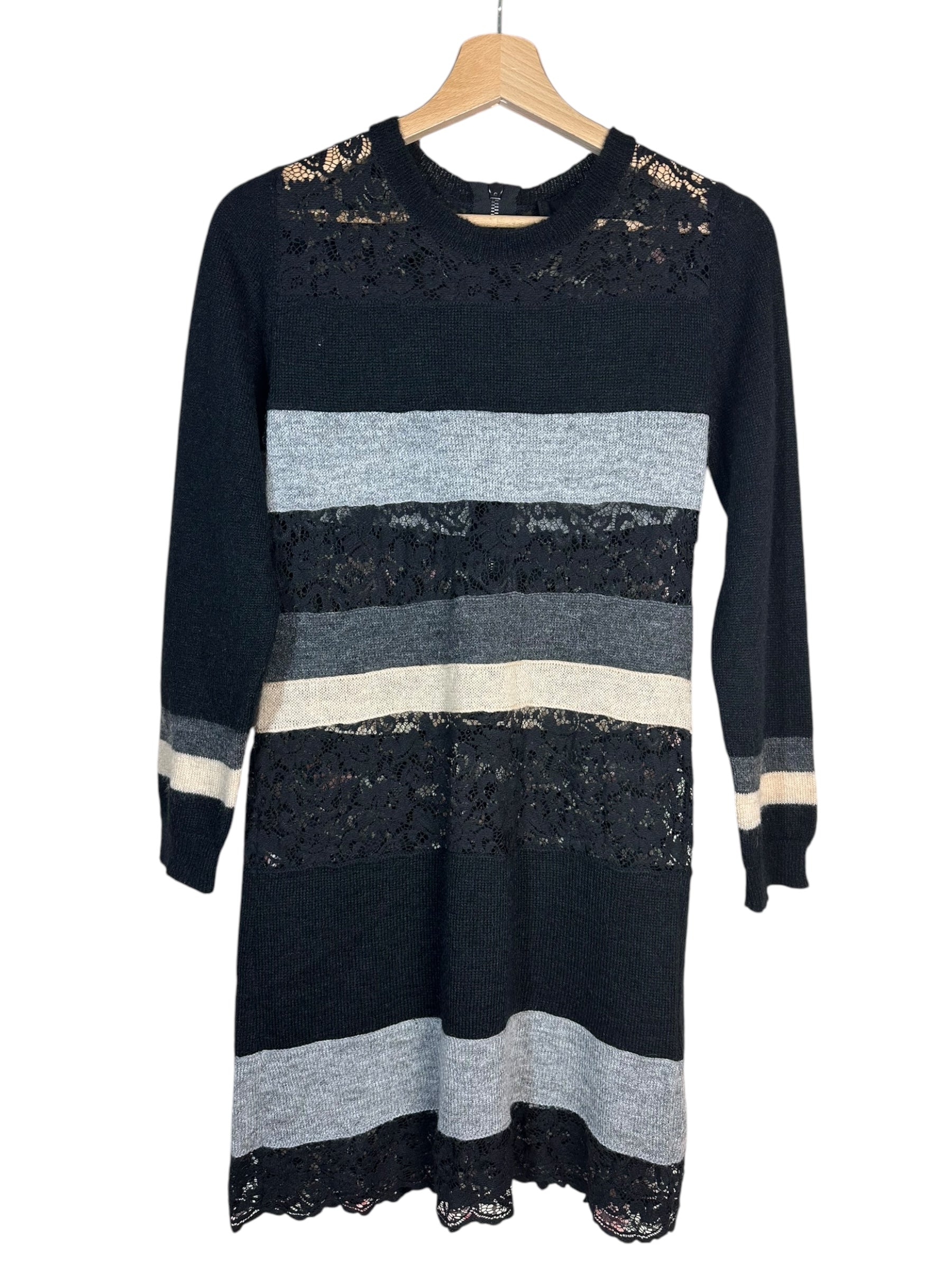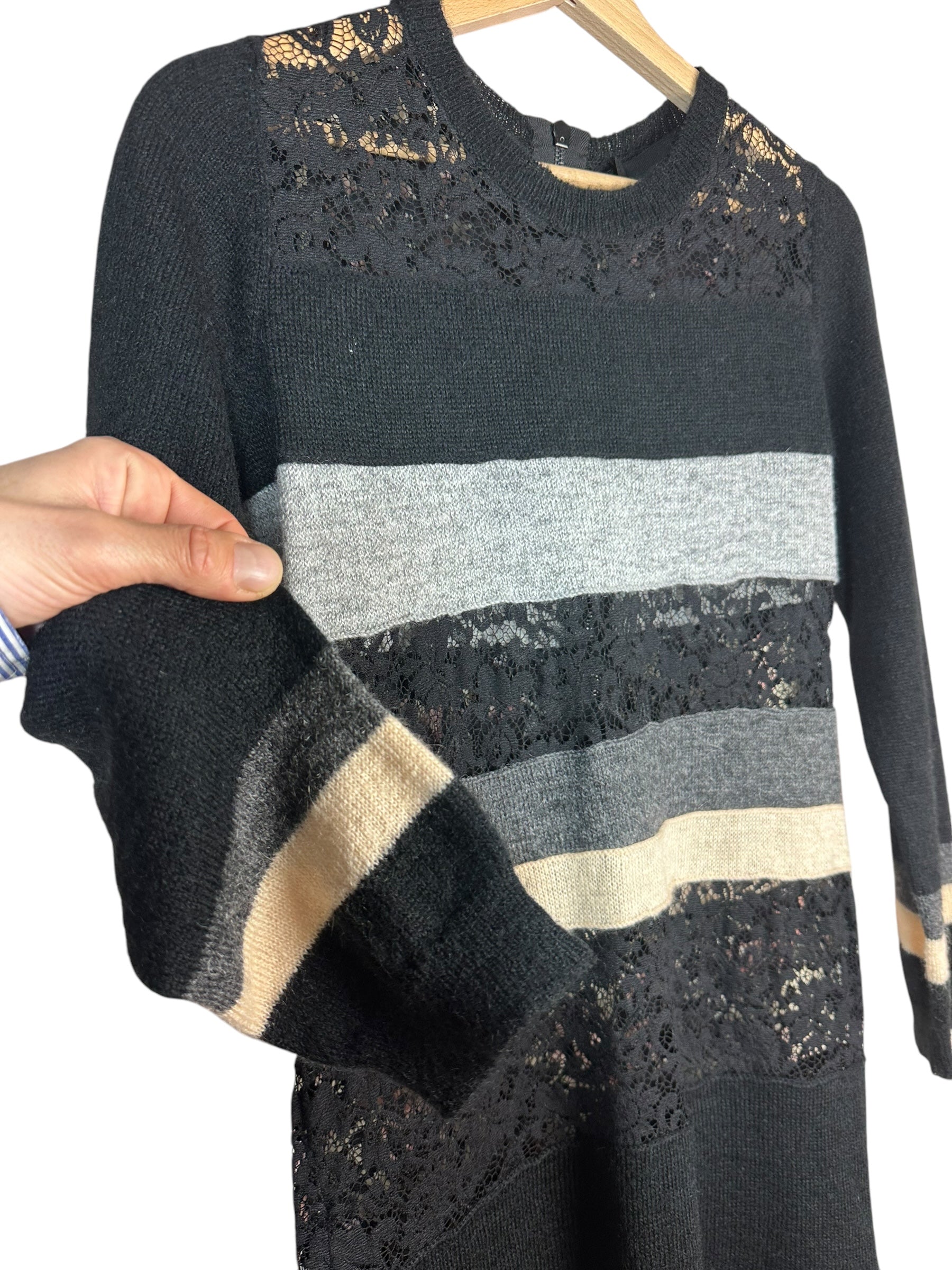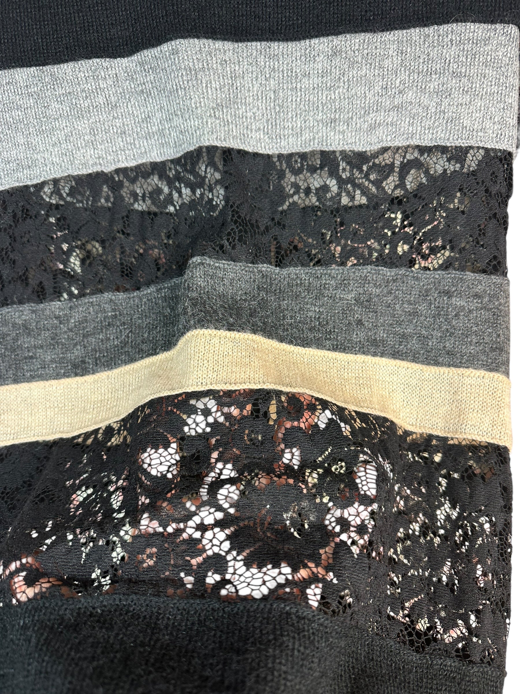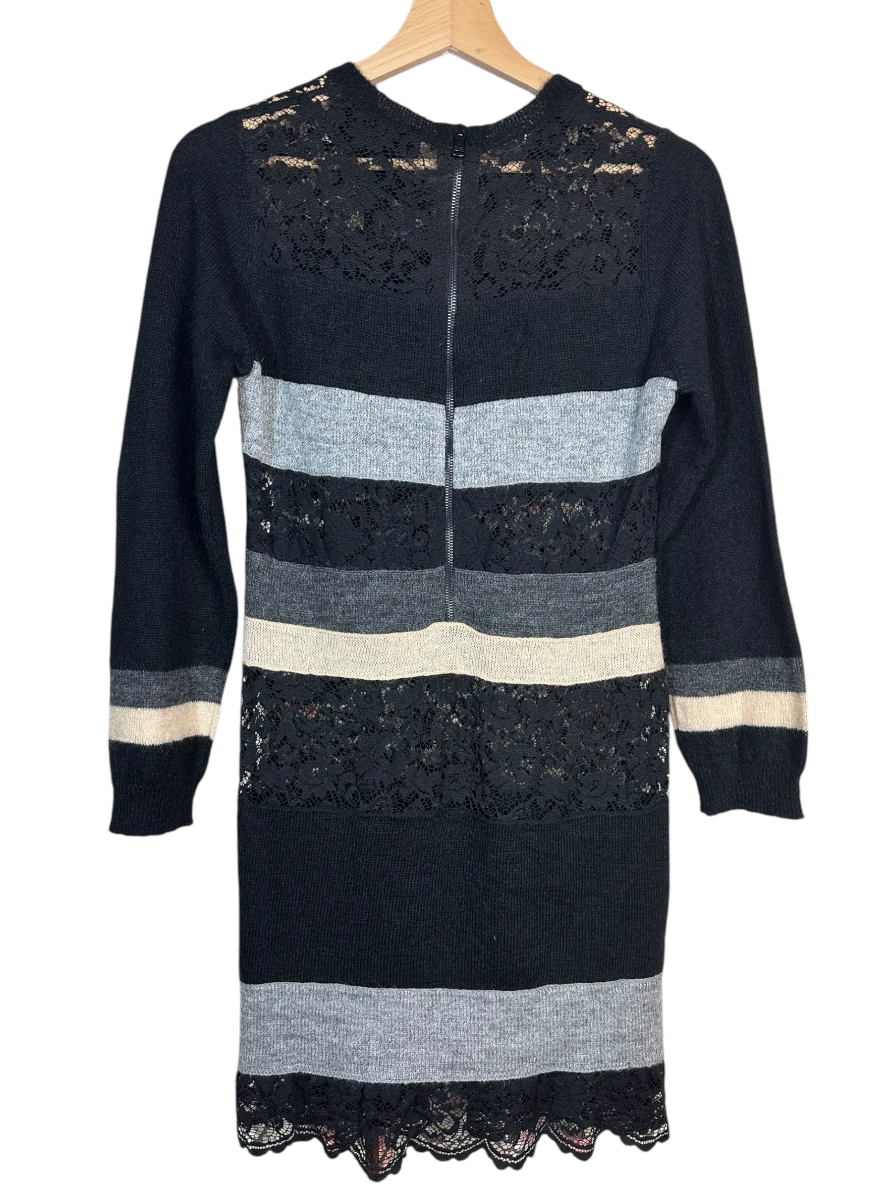 Questo abito a righe orizzontali alterna pannelli in maglia morbida e trasparenze in pizzo floreale nero.