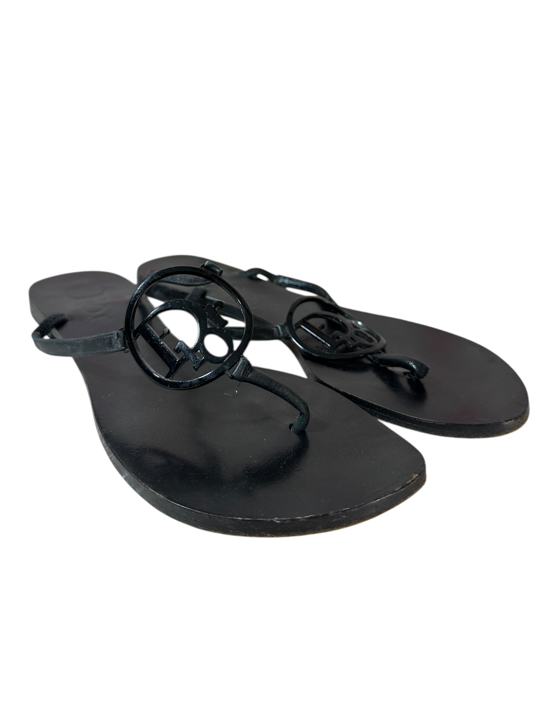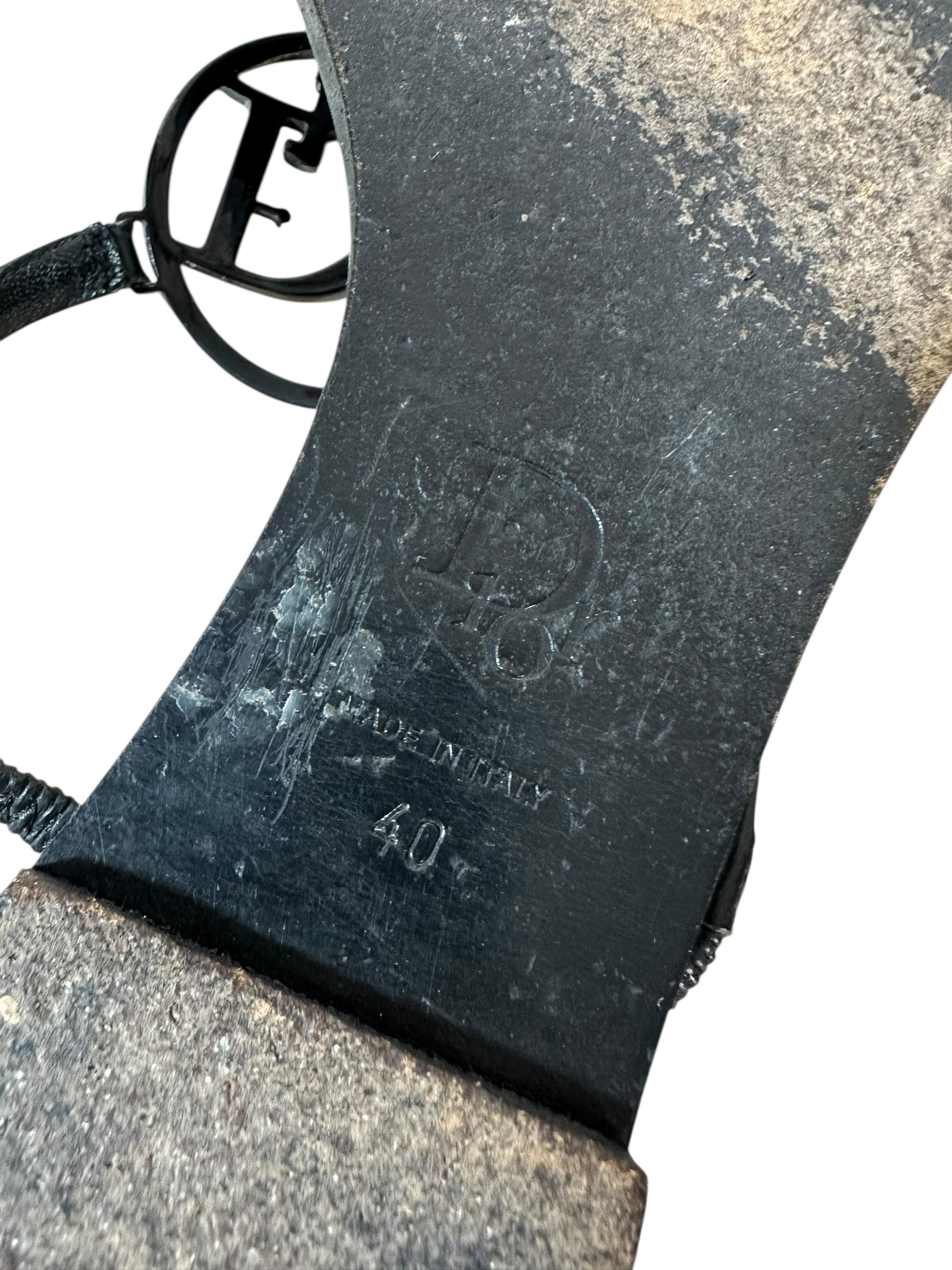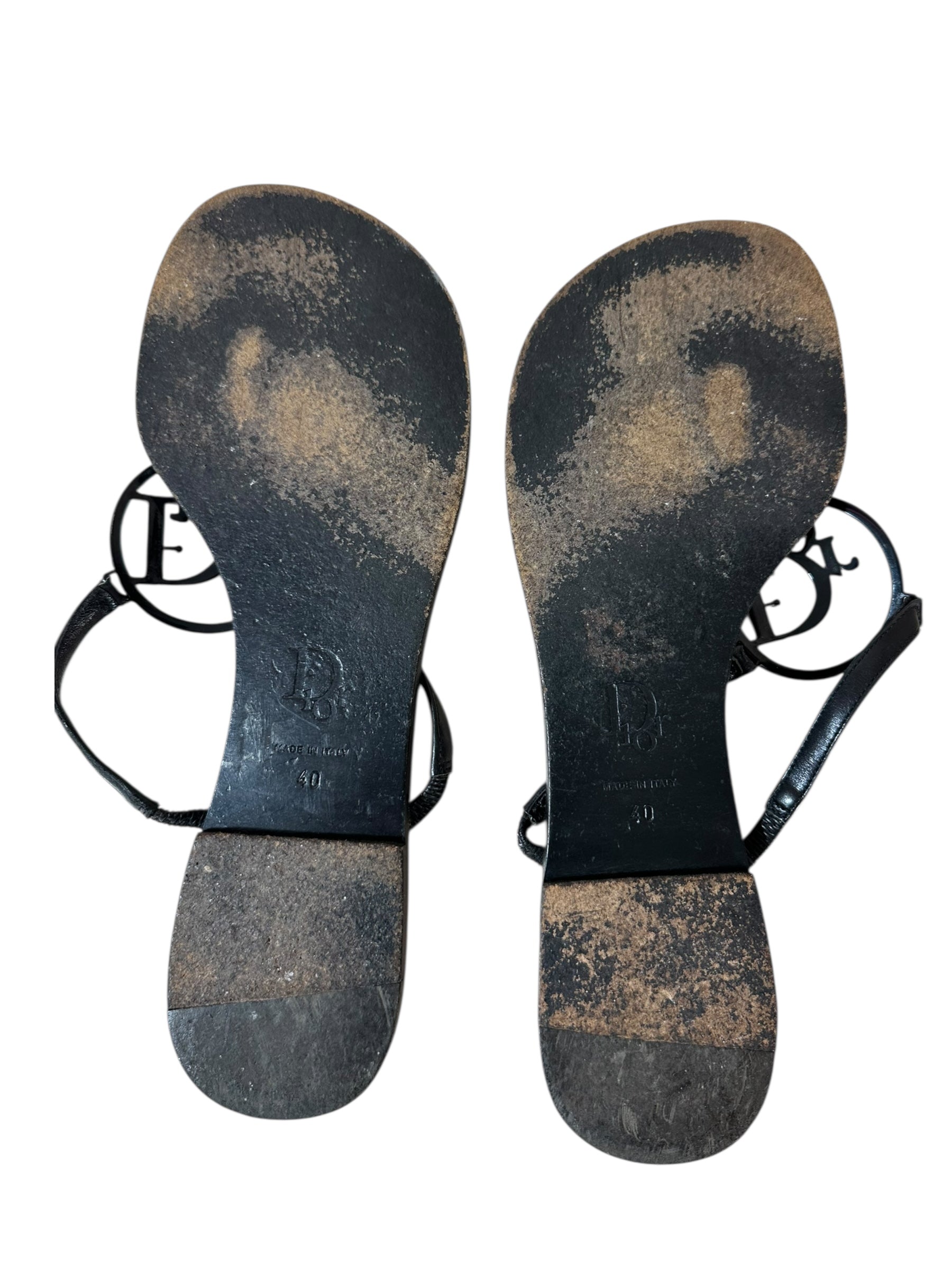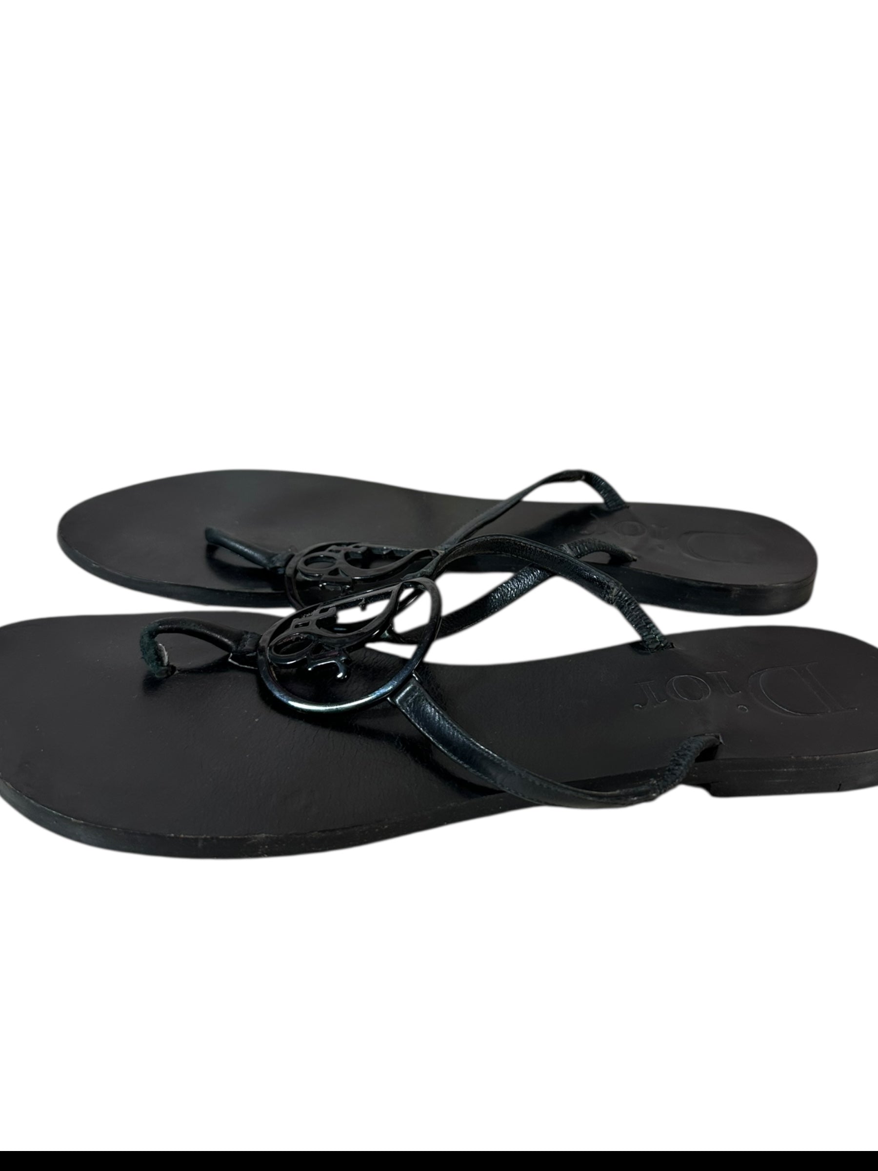 Sandali infradito vintage firmati Dior, realizzati in pelle nera con finitura lucida e impreziositi da un logo CD traforato in vernice tono su tono applicato centralmente. Modello essenziale ma raffinato, ideale per look estivi casual-chic. Suola piatta in cuoio con marchio inciso e dicitura Made in Italy. Taglia 40.