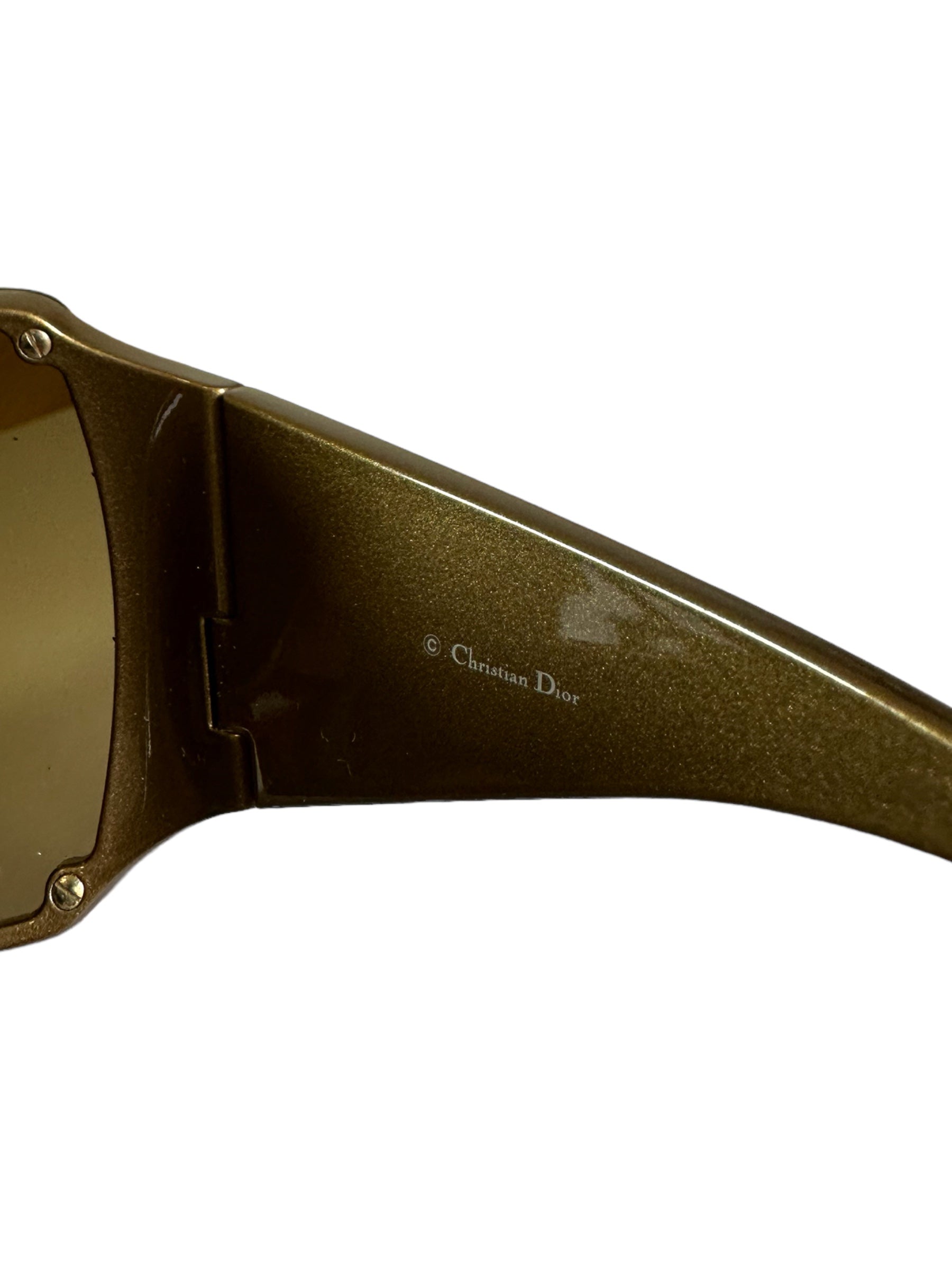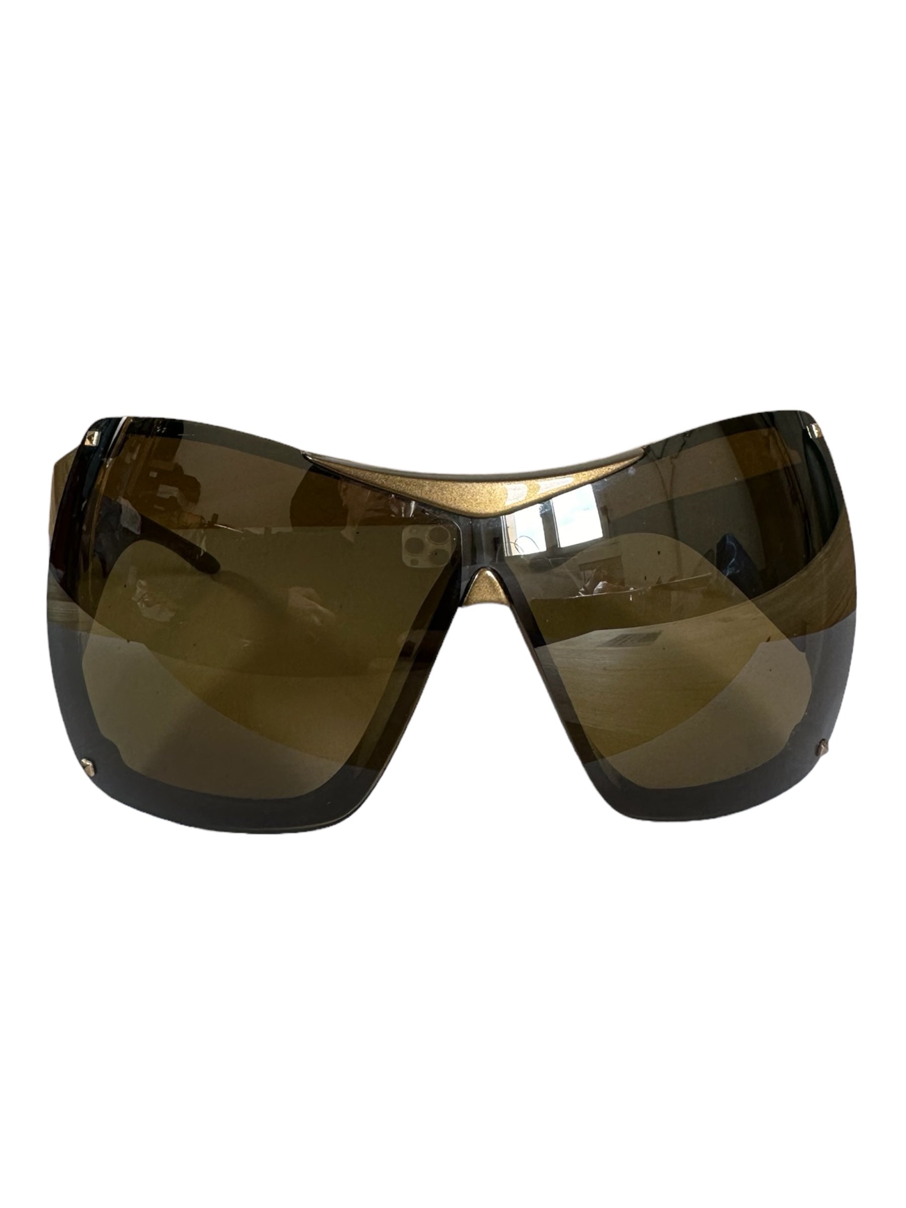 Dior occhiali vintage a mascherina con montatura in plastica dorata e lenti marroni leggermente trasparenti. Potrebbero presentare dei micro segni poco visibili vengono spediti con custodia originale in discrete condizioni.