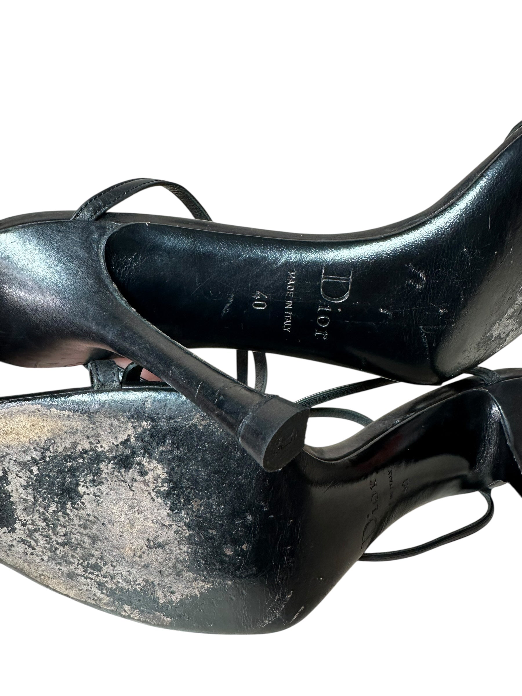 Sandali Dior d’archivio firmati John Galliano, realizzati in pelle nera con struttura a listini incrociati e logo a contrasto sulla soletta interna. La calzatura presenta un piccolo segno di usura su uno dei laccetti, visibile in foto, oltre a lievi segni sulla pelle e sulla suola dovuti al normale utilizzo, trattandosi di un articolo second-hand. Numero riportato all’interno: 40.