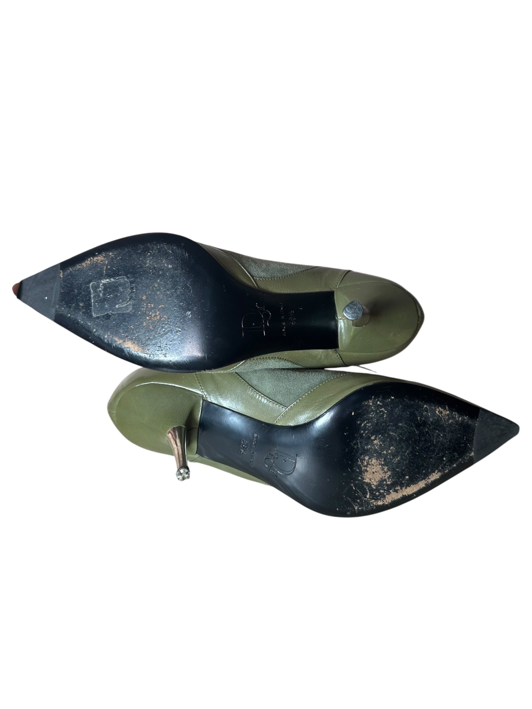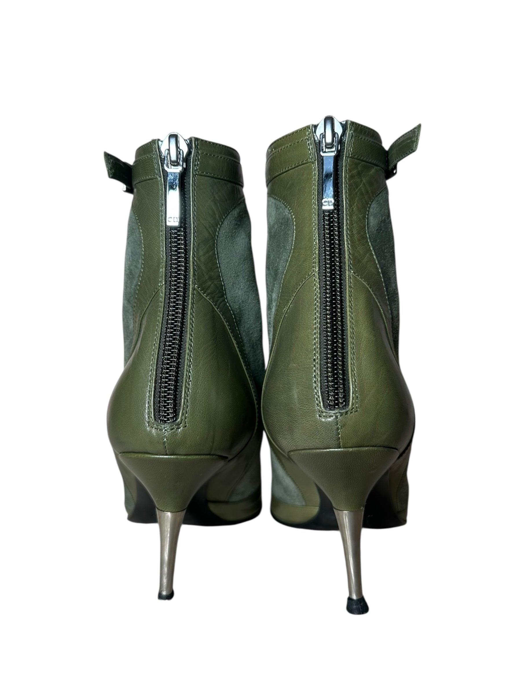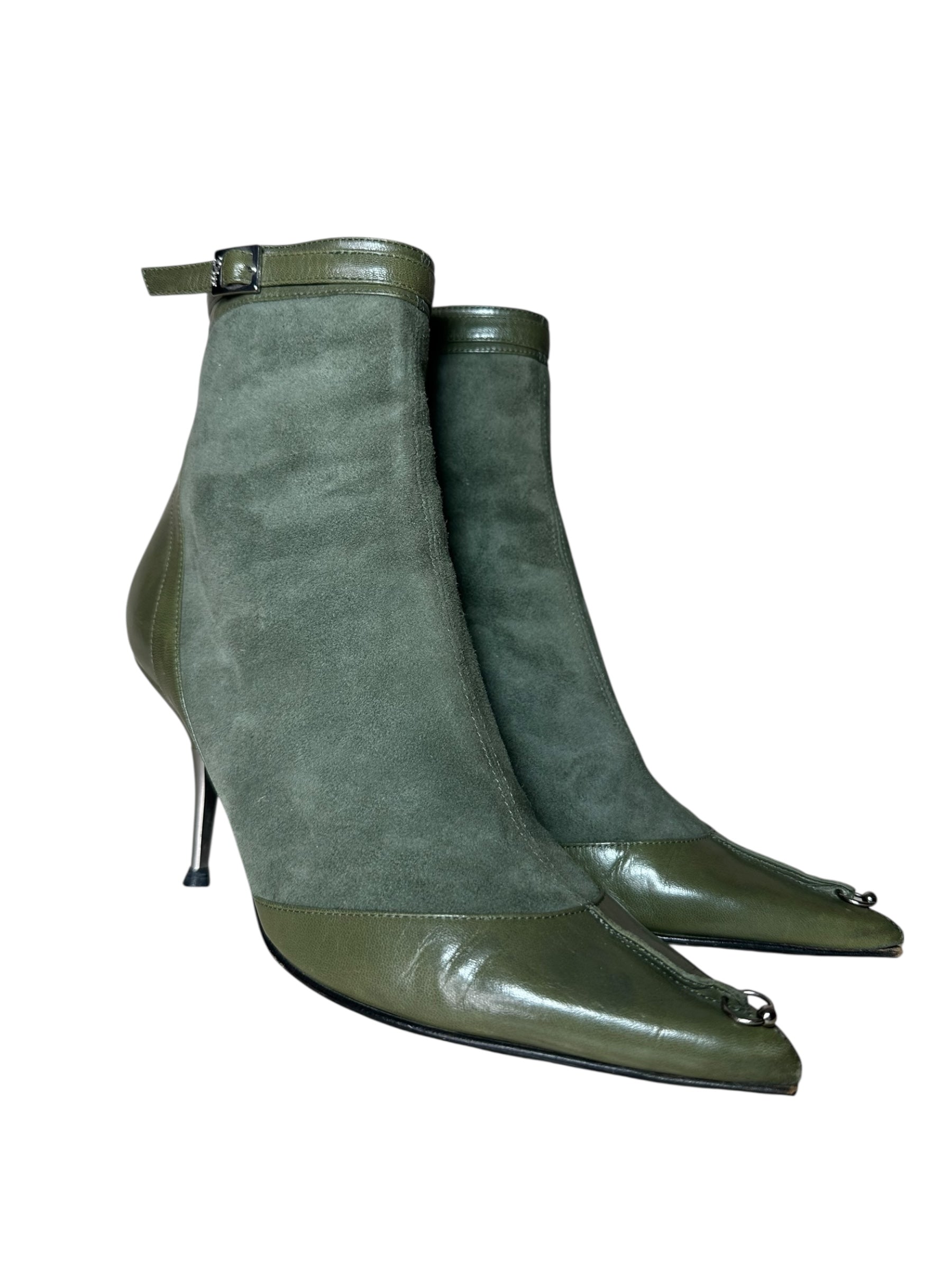 Stivaletti a punta Dior vintage in pregiata pelle e camoscio verde oliva, con inserti in pelle liscia sulla punta e sul tallone. Caratterizzati da un design affusolato, fibbia con logo “Dior” alla caviglia, chiusura con zip posteriore e dettaglio metallico decorativo sul davanti. Il tacco a stiletto in metallo misura circa 8 cm.