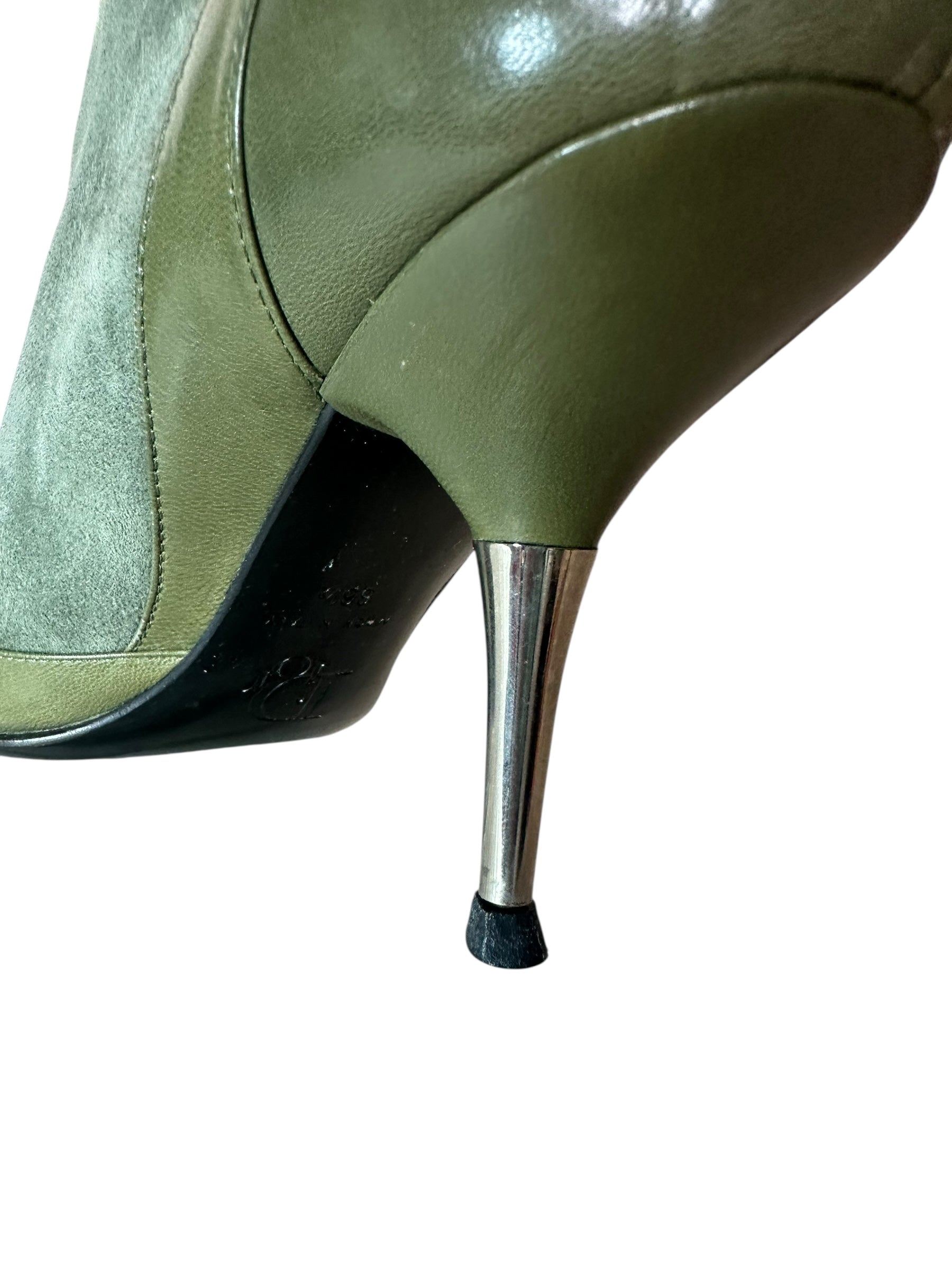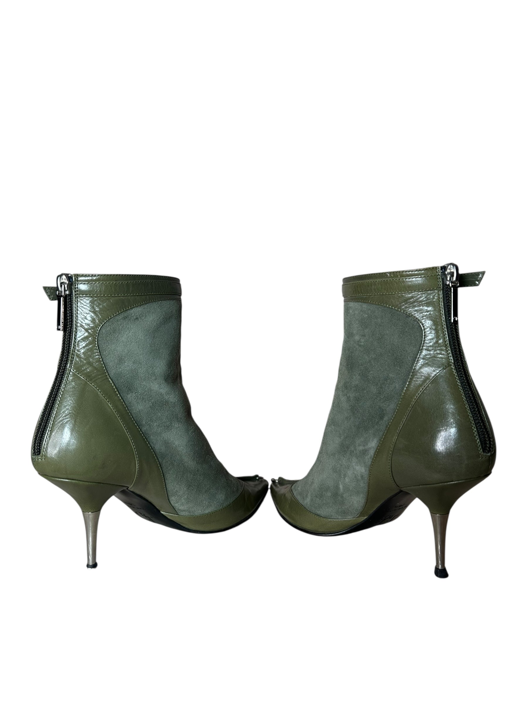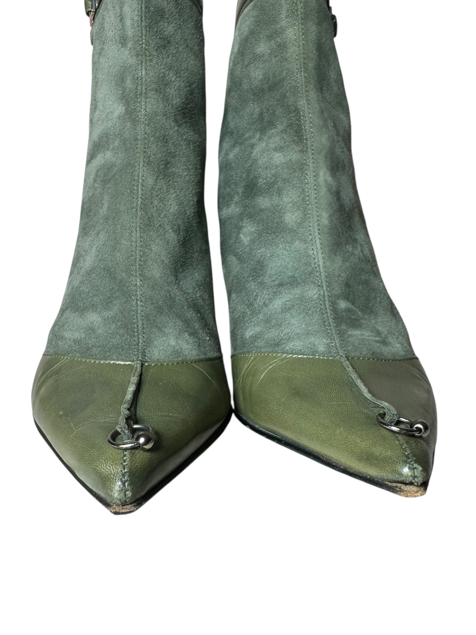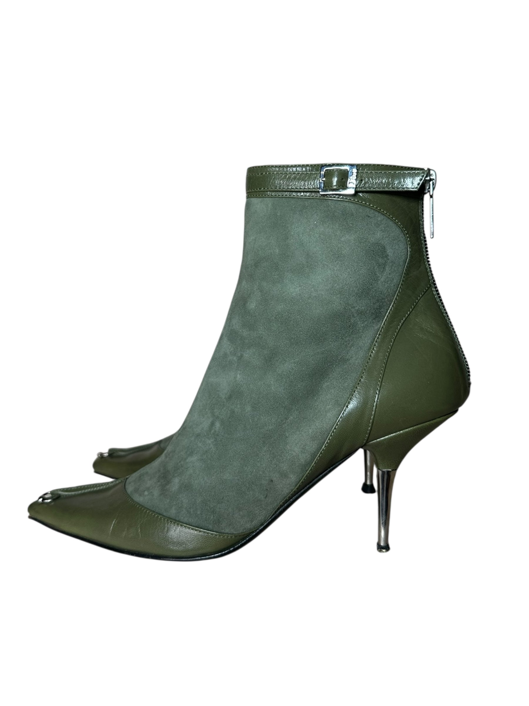 Stivaletti a punta Dior vintage in pregiata pelle e camoscio verde oliva, con inserti in pelle liscia sulla punta e sul tallone. Caratterizzati da un design affusolato, fibbia con logo “Dior” alla caviglia, chiusura con zip posteriore e dettaglio metallico decorativo sul davanti. Il tacco a stiletto in metallo misura circa 8 cm.