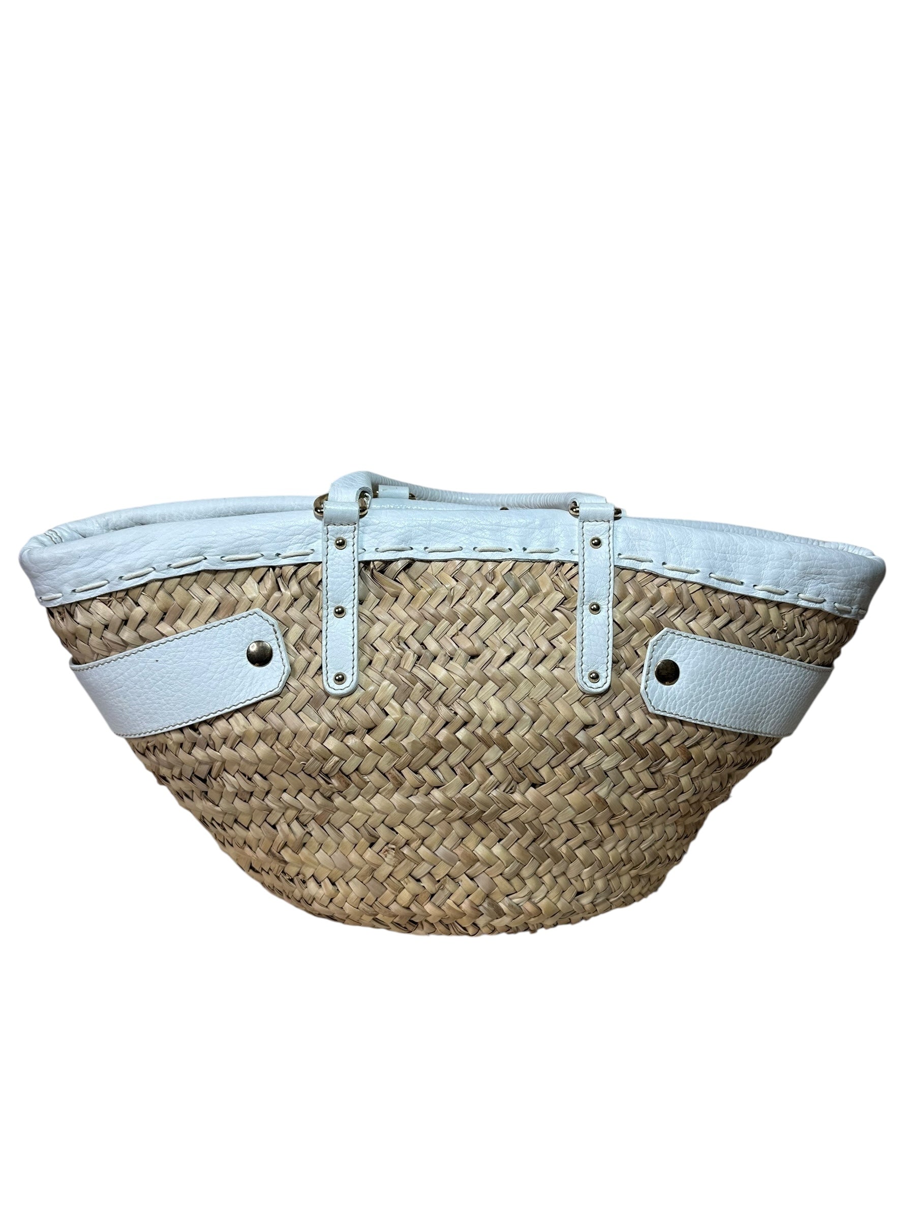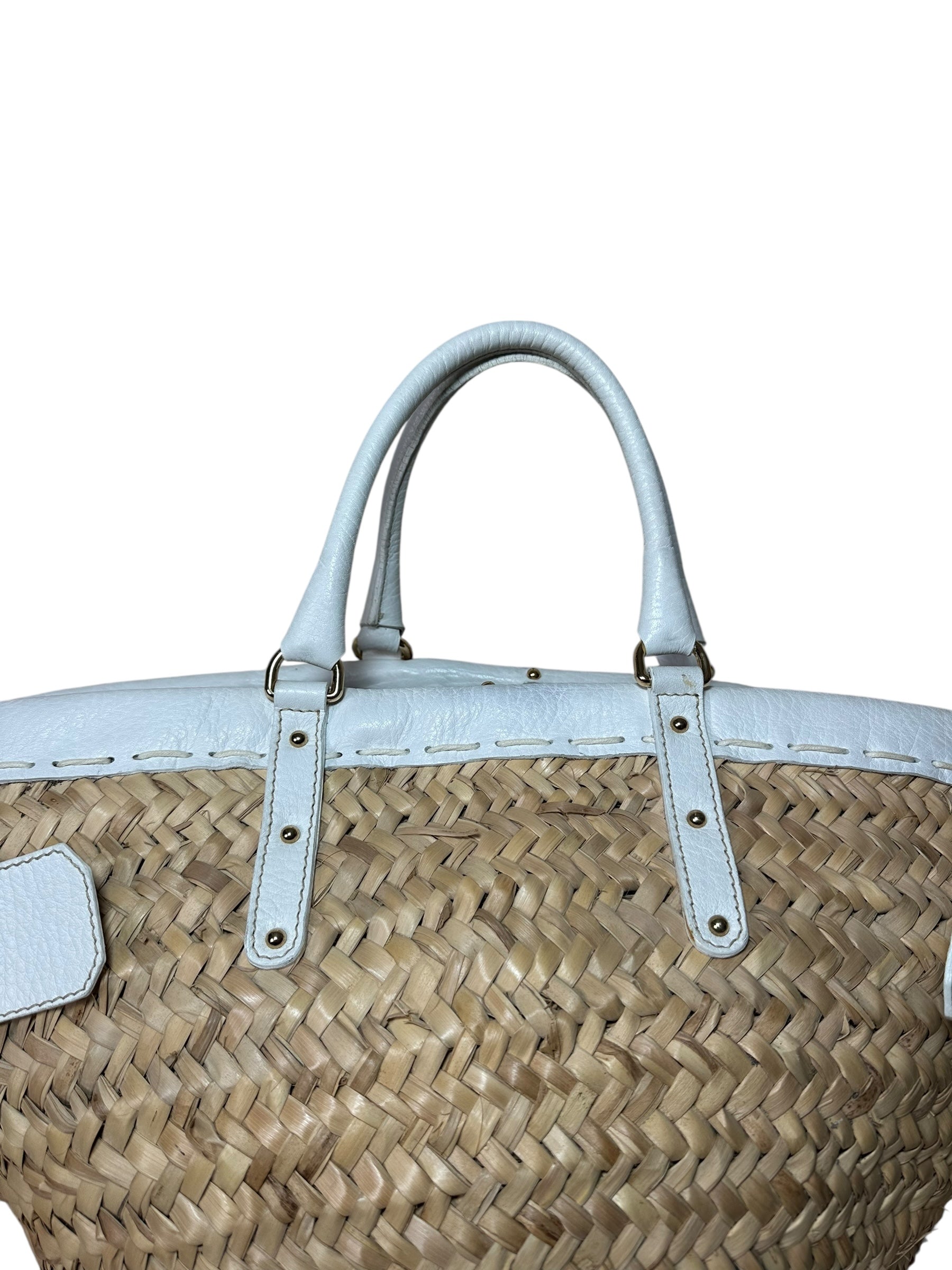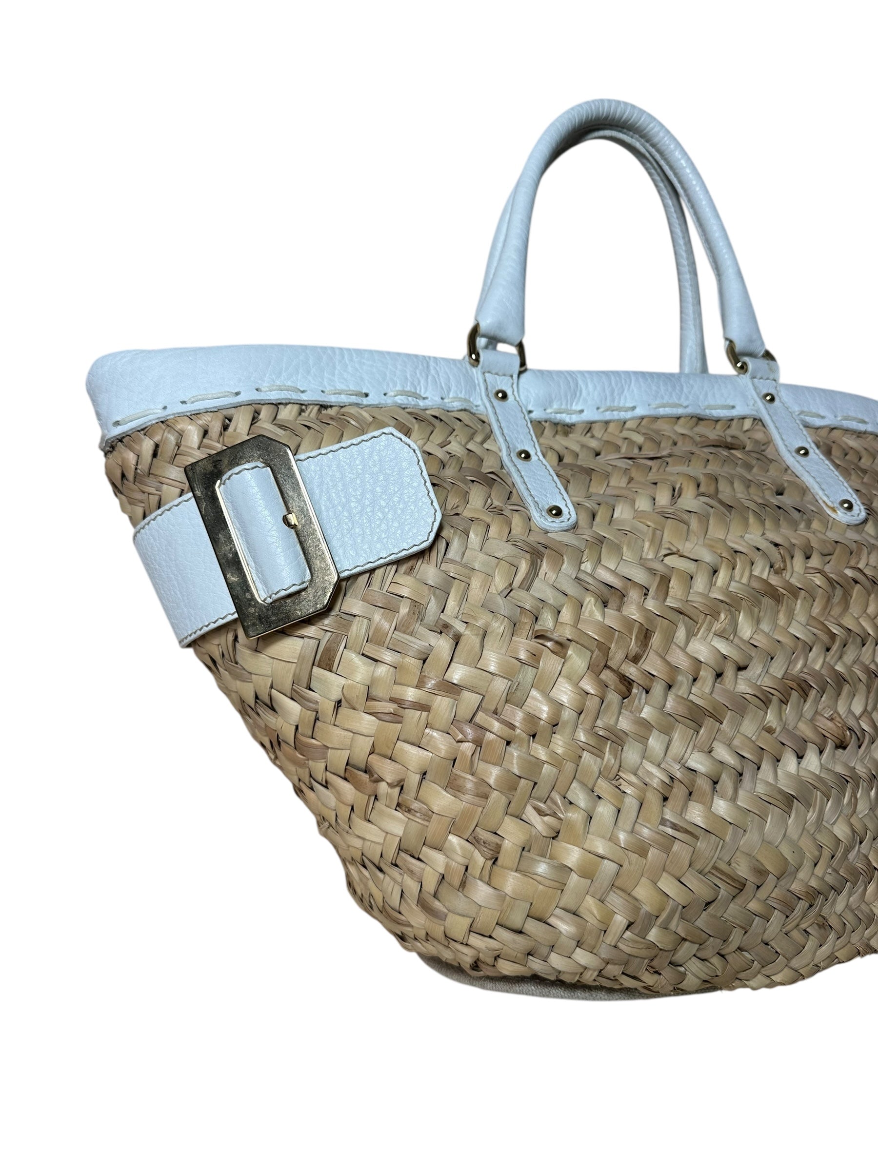 Borsa shopping in raffia naturale intrecciata, arricchita da dettagli in pelle bianca e manici doppi in pelle. Il design è impreziosito da due fibbie decorative laterali in metallo dorato anticato e fondo strutturato con piedini protettivi in metallo. Internamente è foderata in tessuto con fantasia animalier tipica della maison e dispone di una tasca con zip.