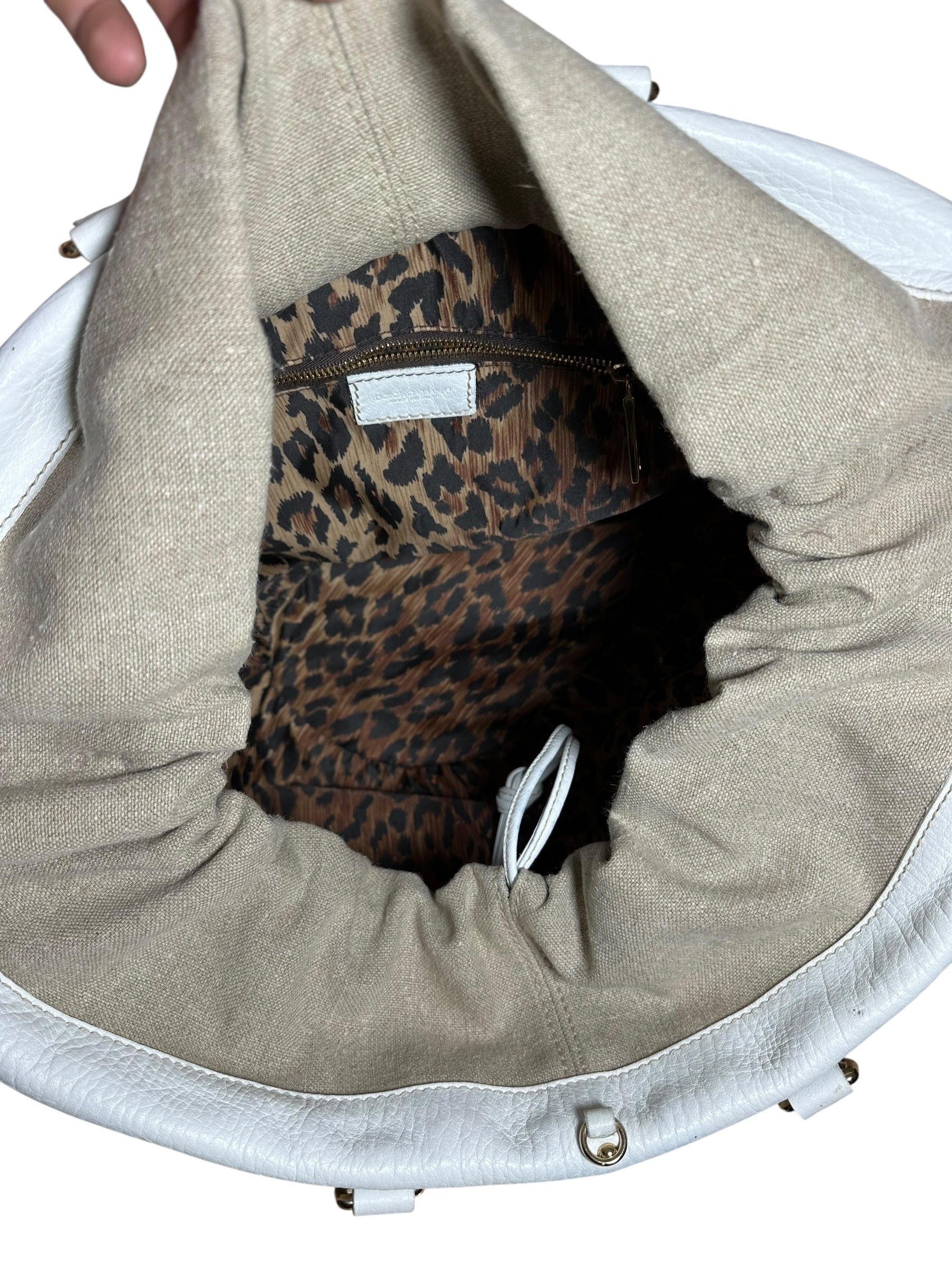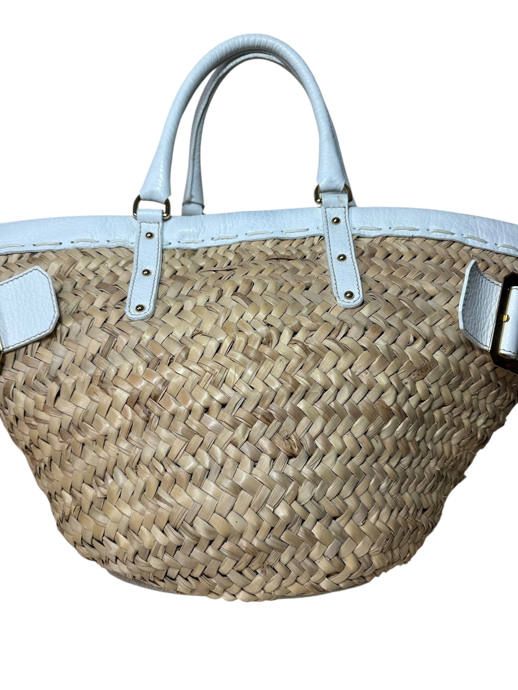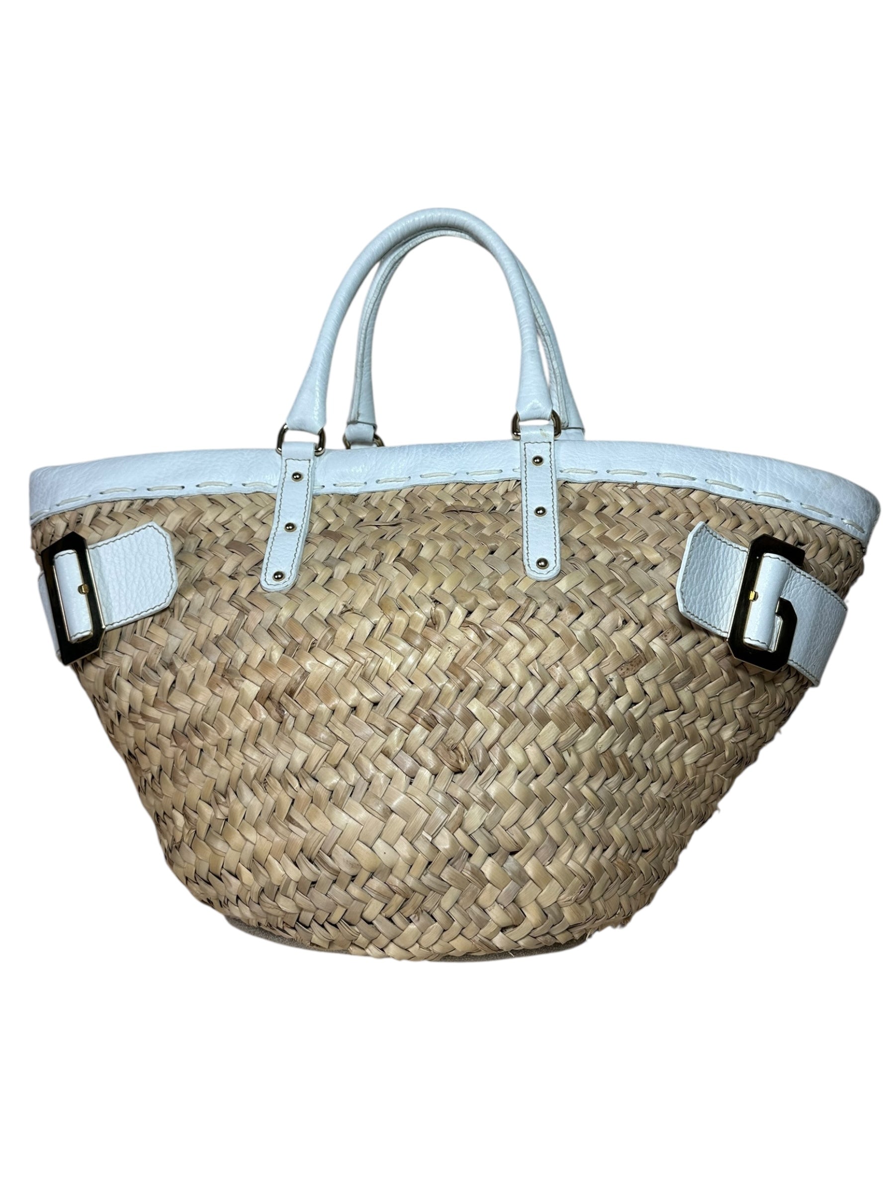 Borsa shopping in raffia naturale intrecciata, arricchita da dettagli in pelle bianca e manici doppi in pelle. Il design è impreziosito da due fibbie decorative laterali in metallo dorato anticato e fondo strutturato con piedini protettivi in metallo. Internamente è foderata in tessuto con fantasia animalier tipica della maison e dispone di una tasca con zip.
