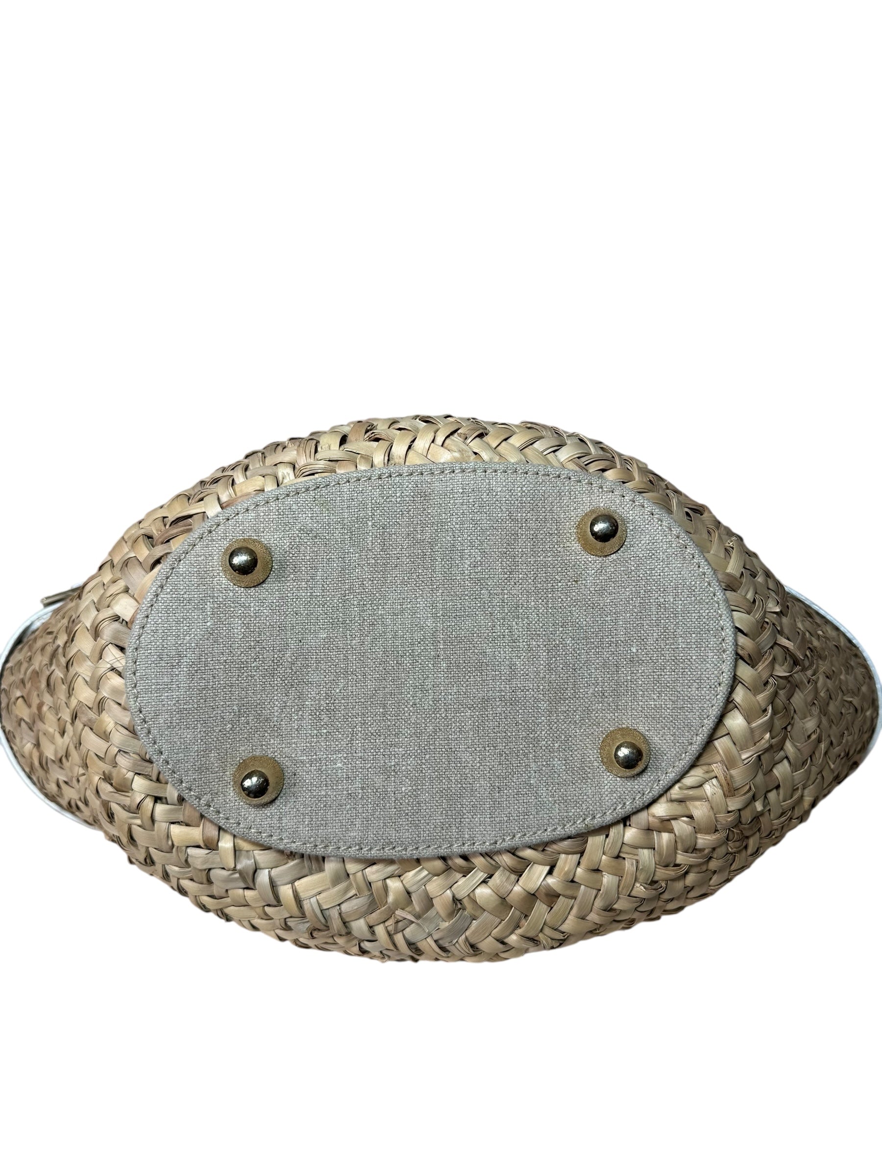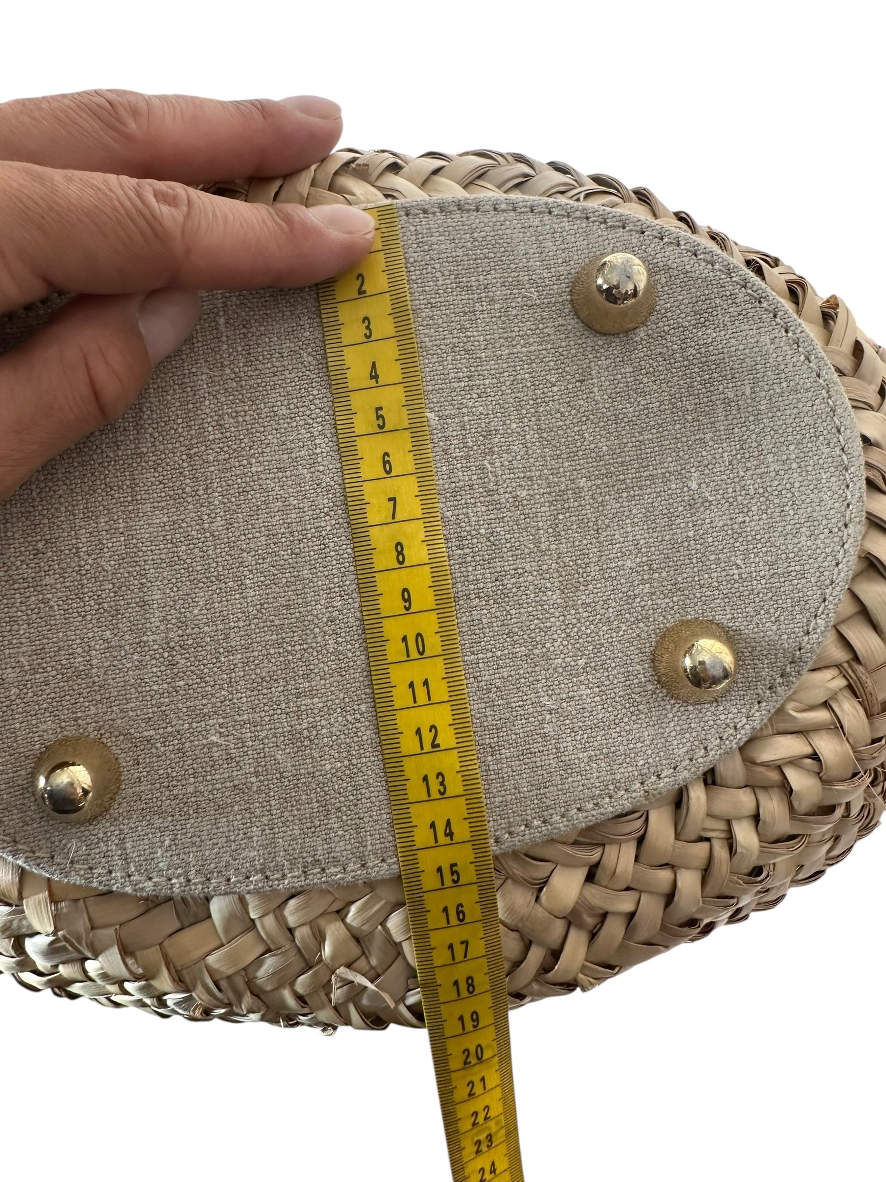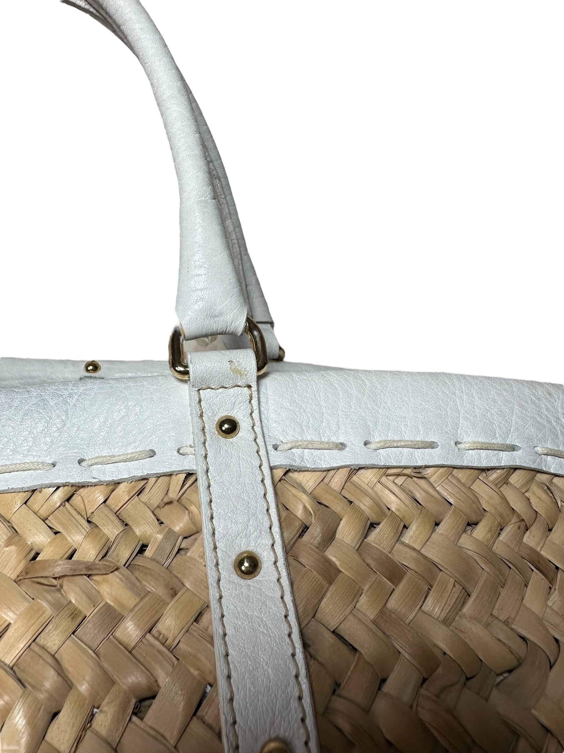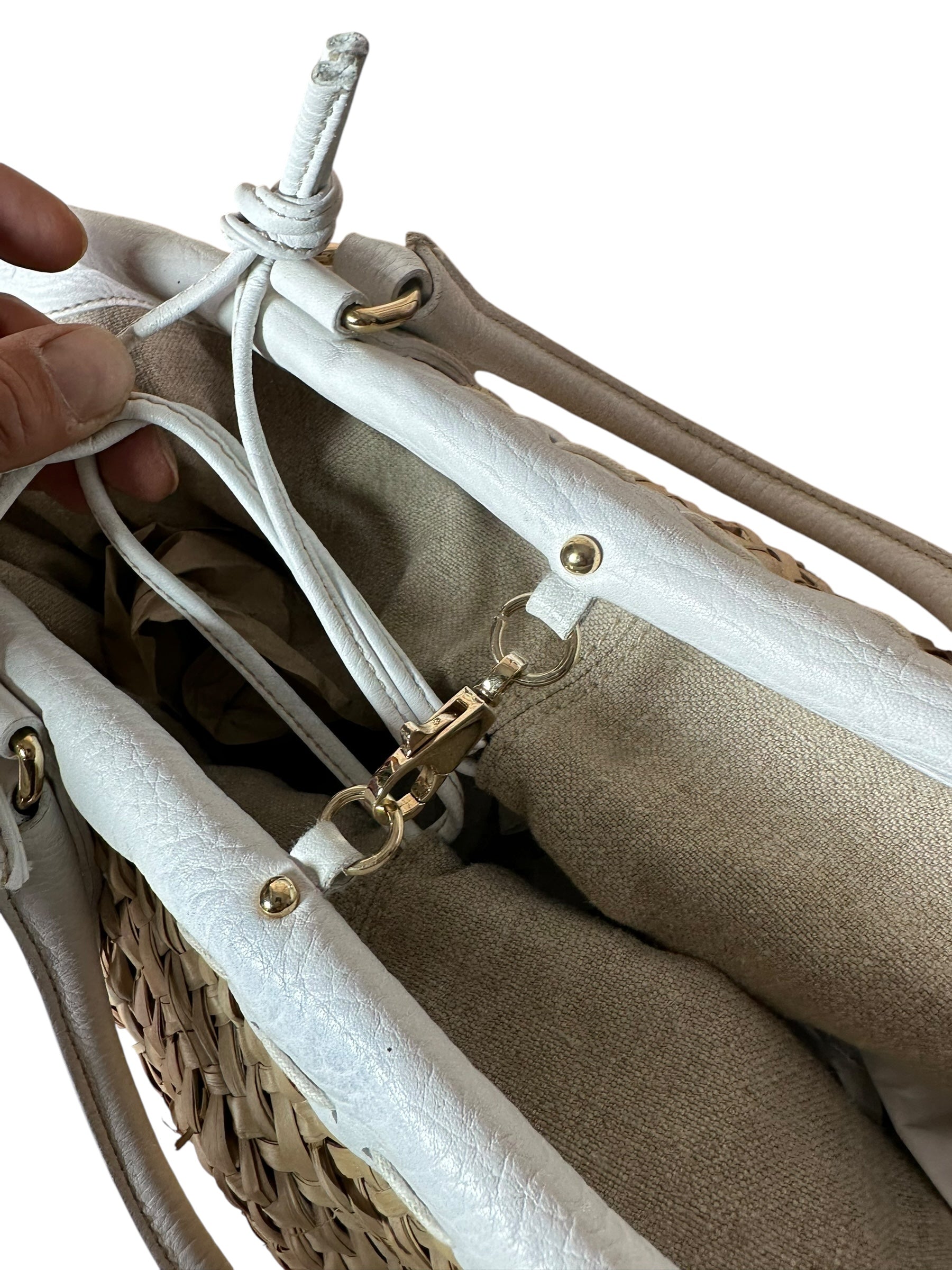 - Materiali: corpo in raffia intrecciata, inserti e manici in pelle bianca, fodera interna in tessuto stampato.